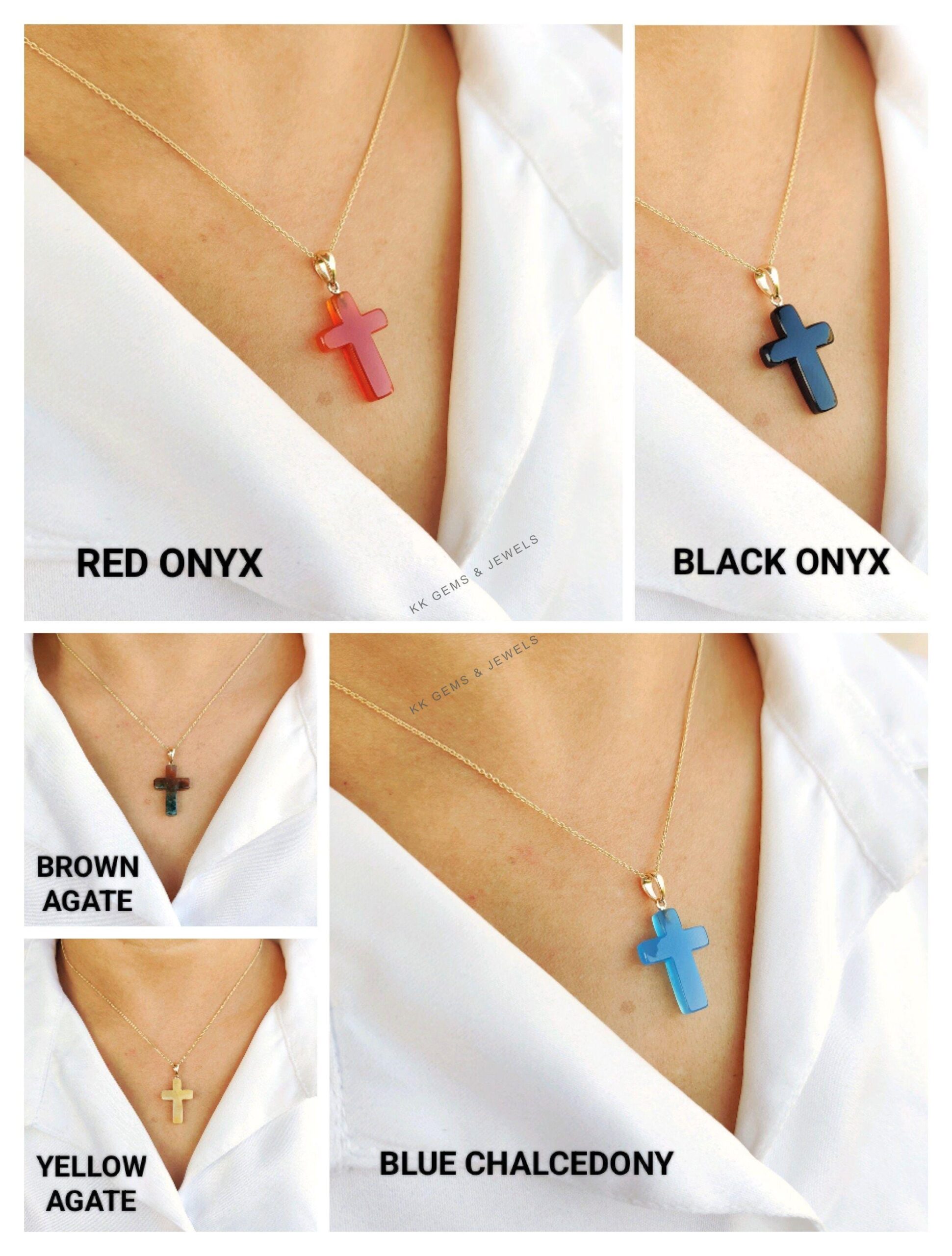 These dainty natural gemstone pendants in cross shape are a perfect addition to your necklace stack. Set in 14k Solid Yellow Gold, these charm pendants are unique and minimalist. ITEM DETAILS • GEM 1. Black Onyx: 6.55 cts 2. Red…
