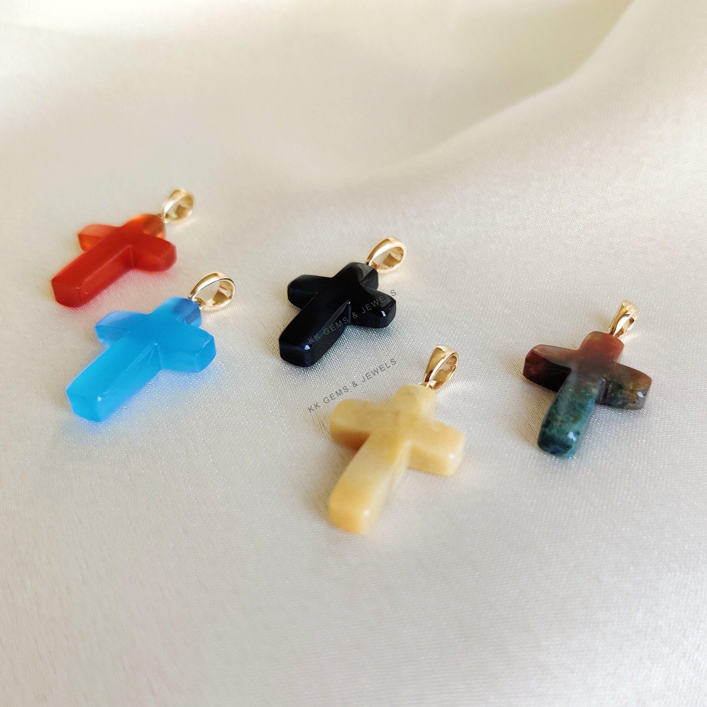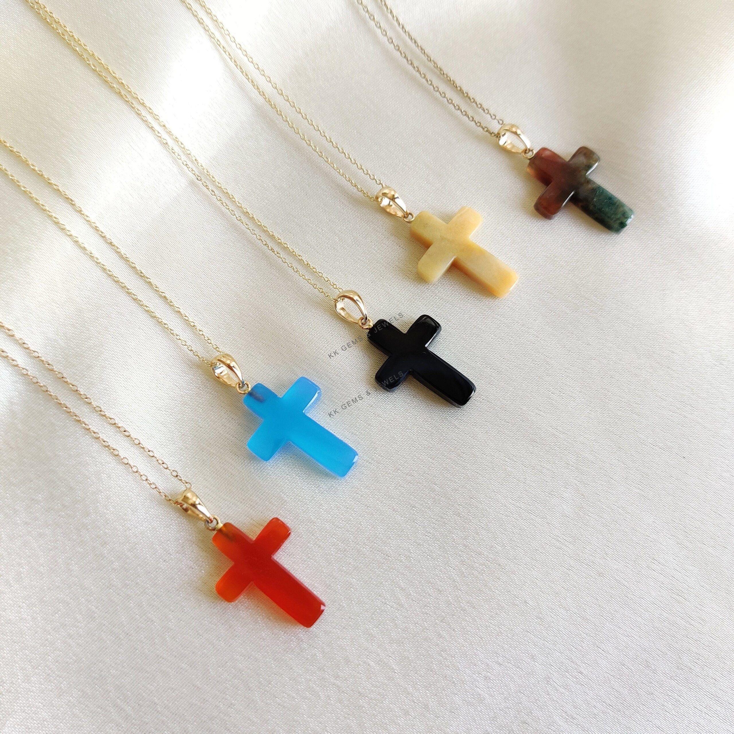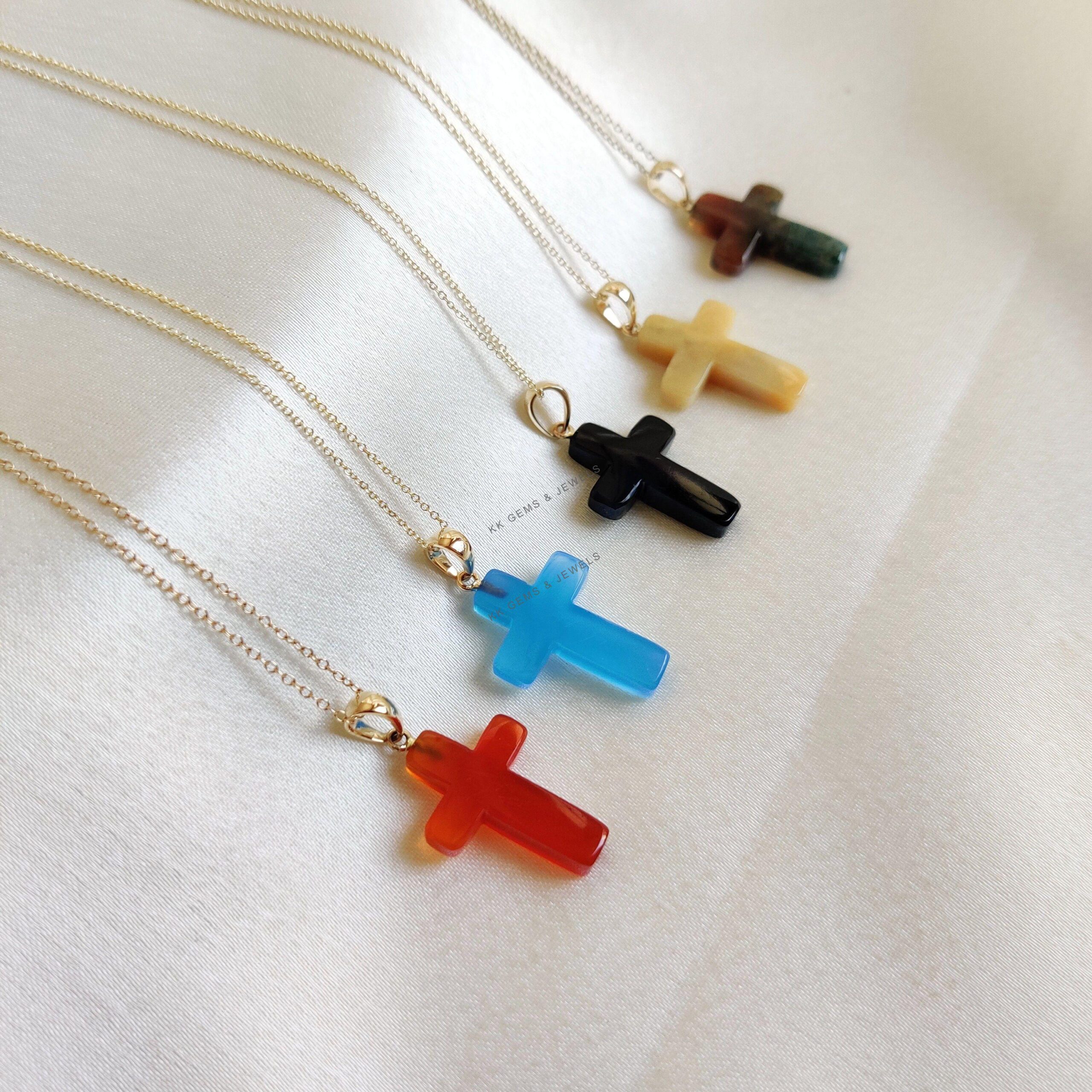 These dainty natural gemstone pendants in cross shape are a perfect addition to your necklace stack. Set in 14k Solid Yellow Gold, these charm pendants are unique and minimalist.