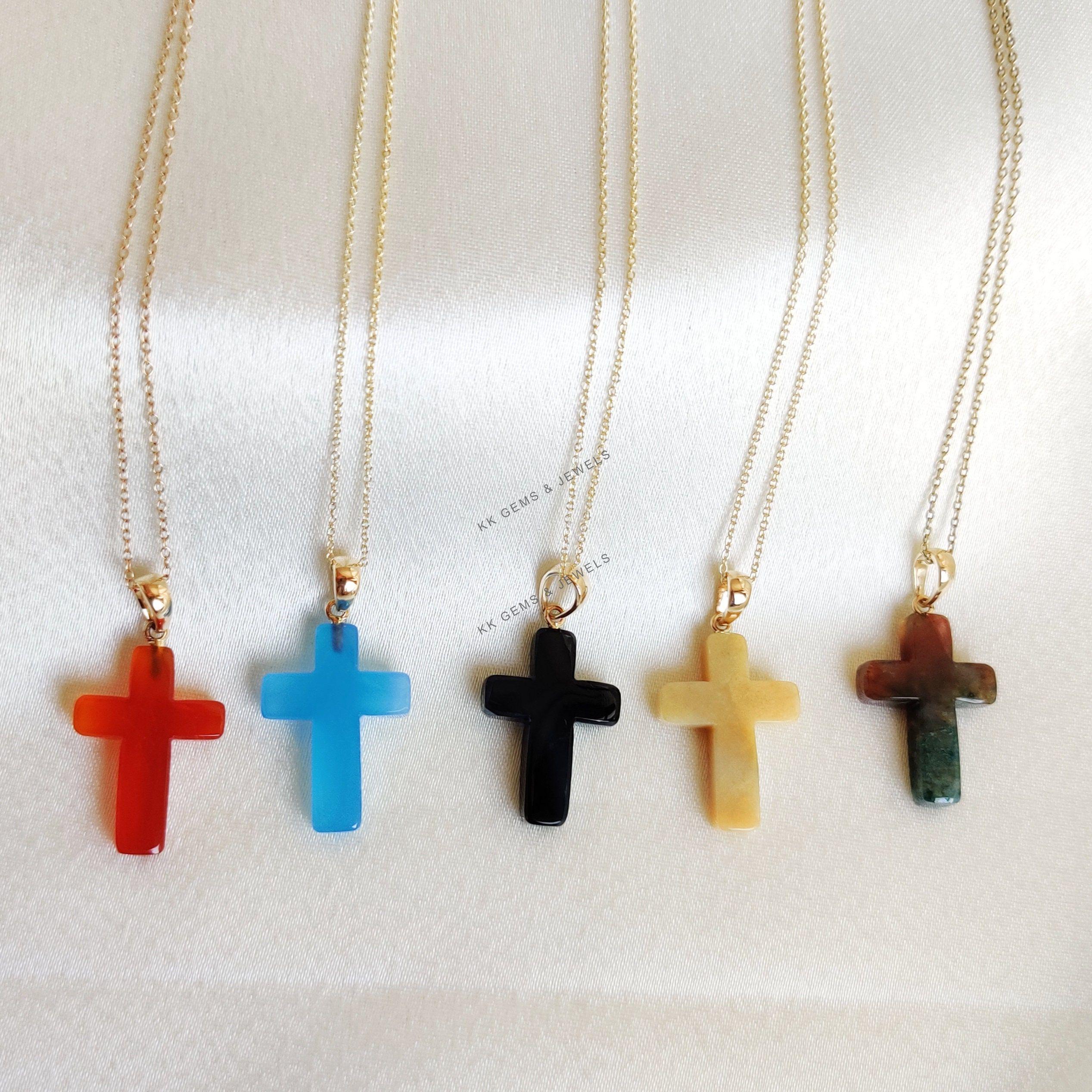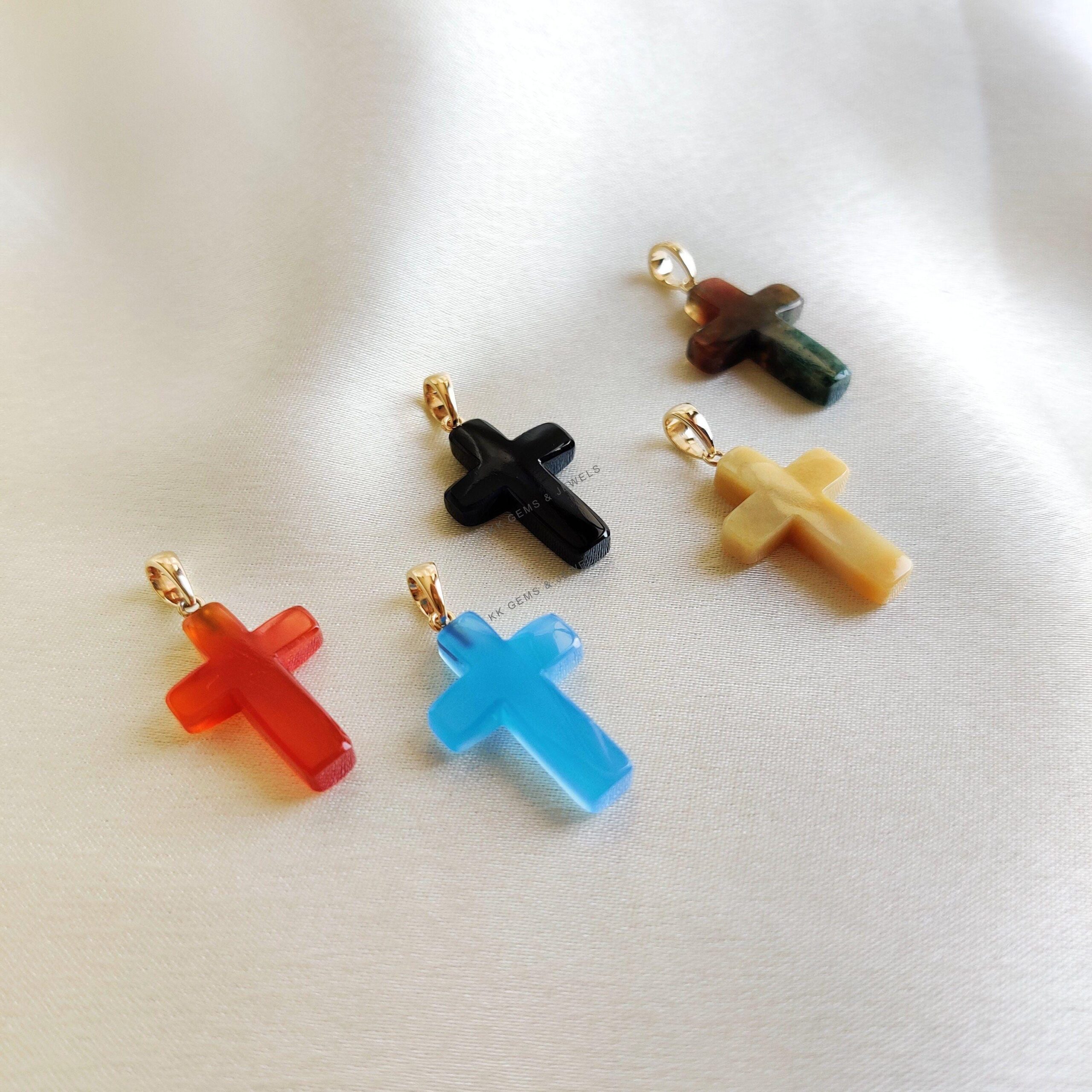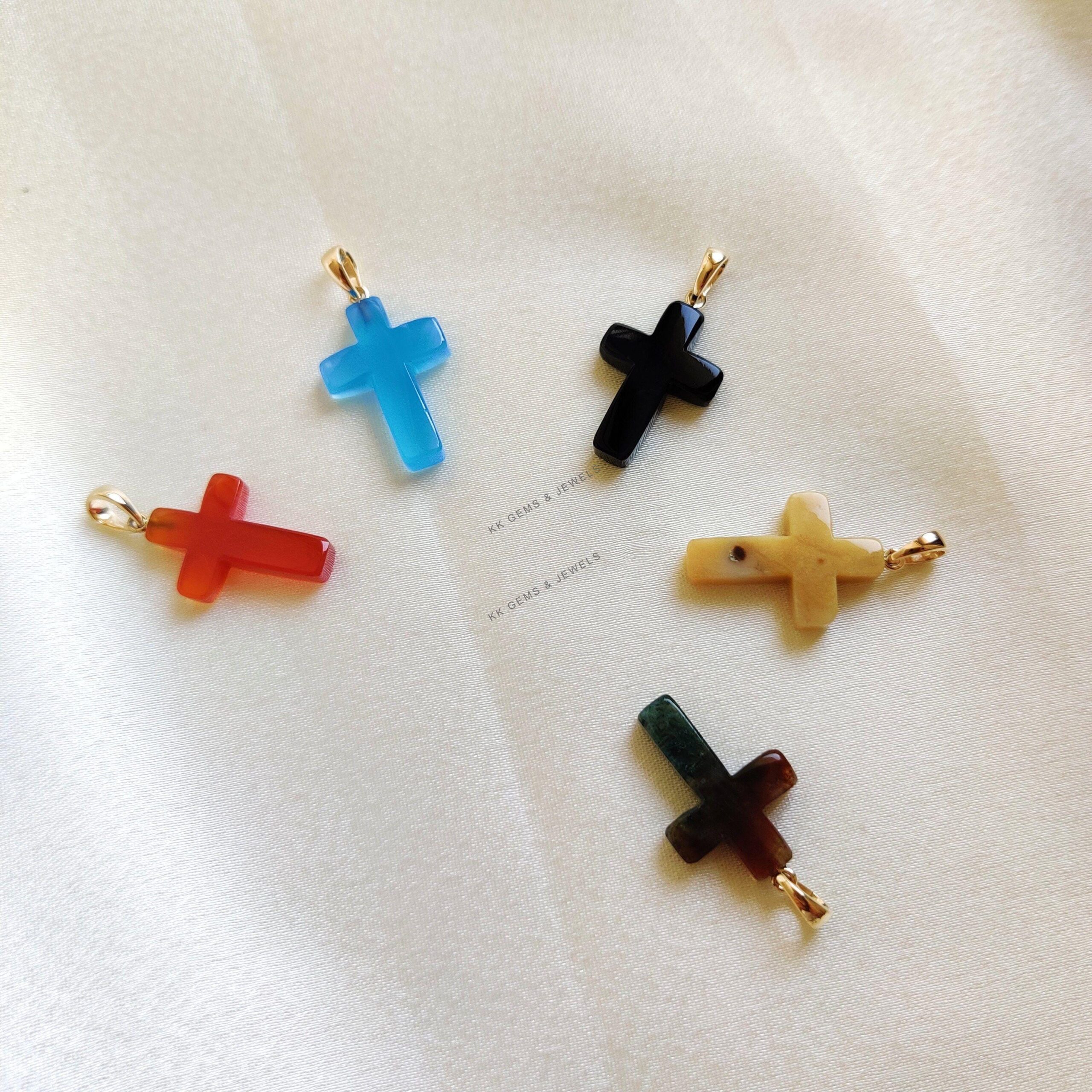 These dainty natural gemstone pendants in cross shape are a perfect addition to your necklace stack. Set in 14k Solid Yellow Gold, these charm pendants are unique and minimalist.