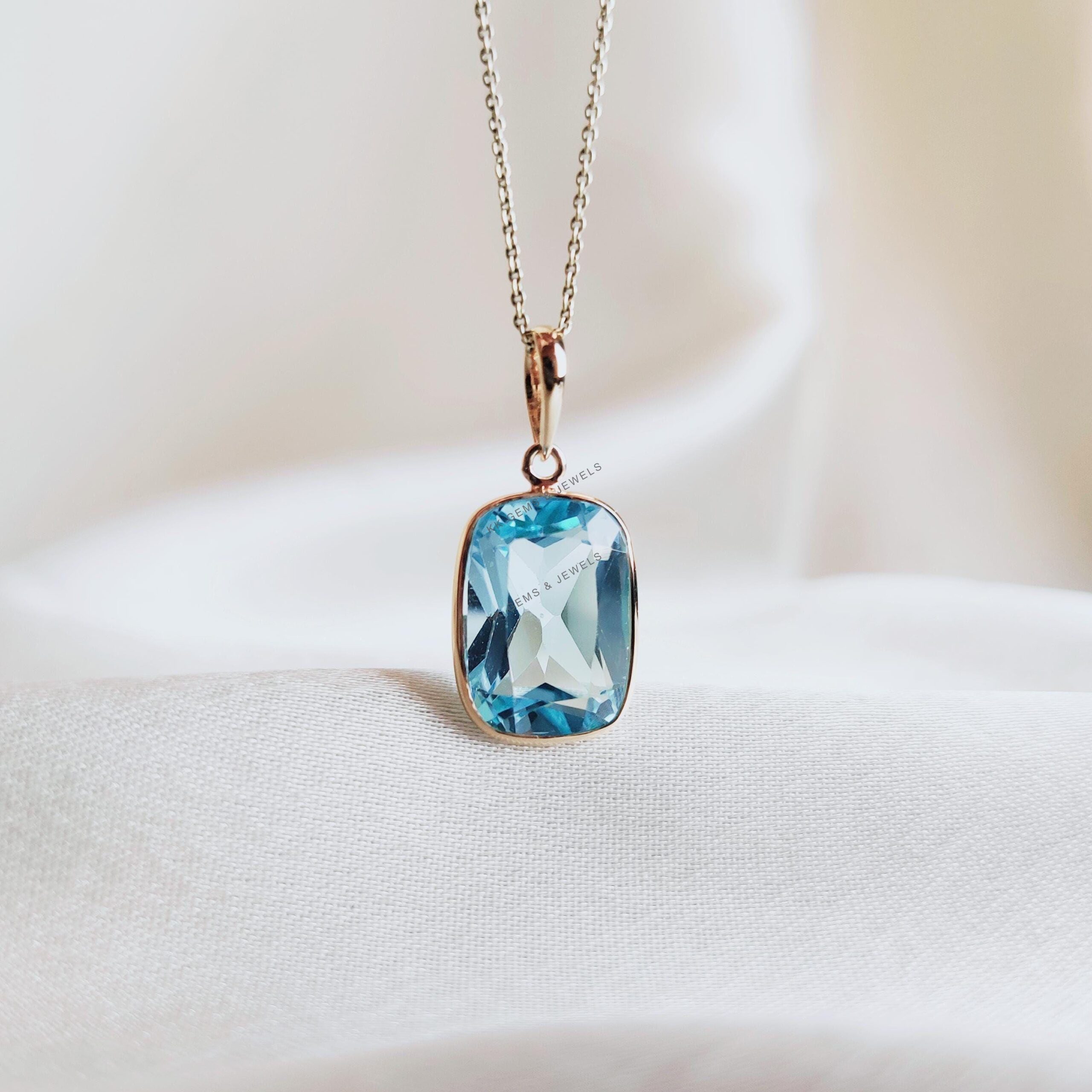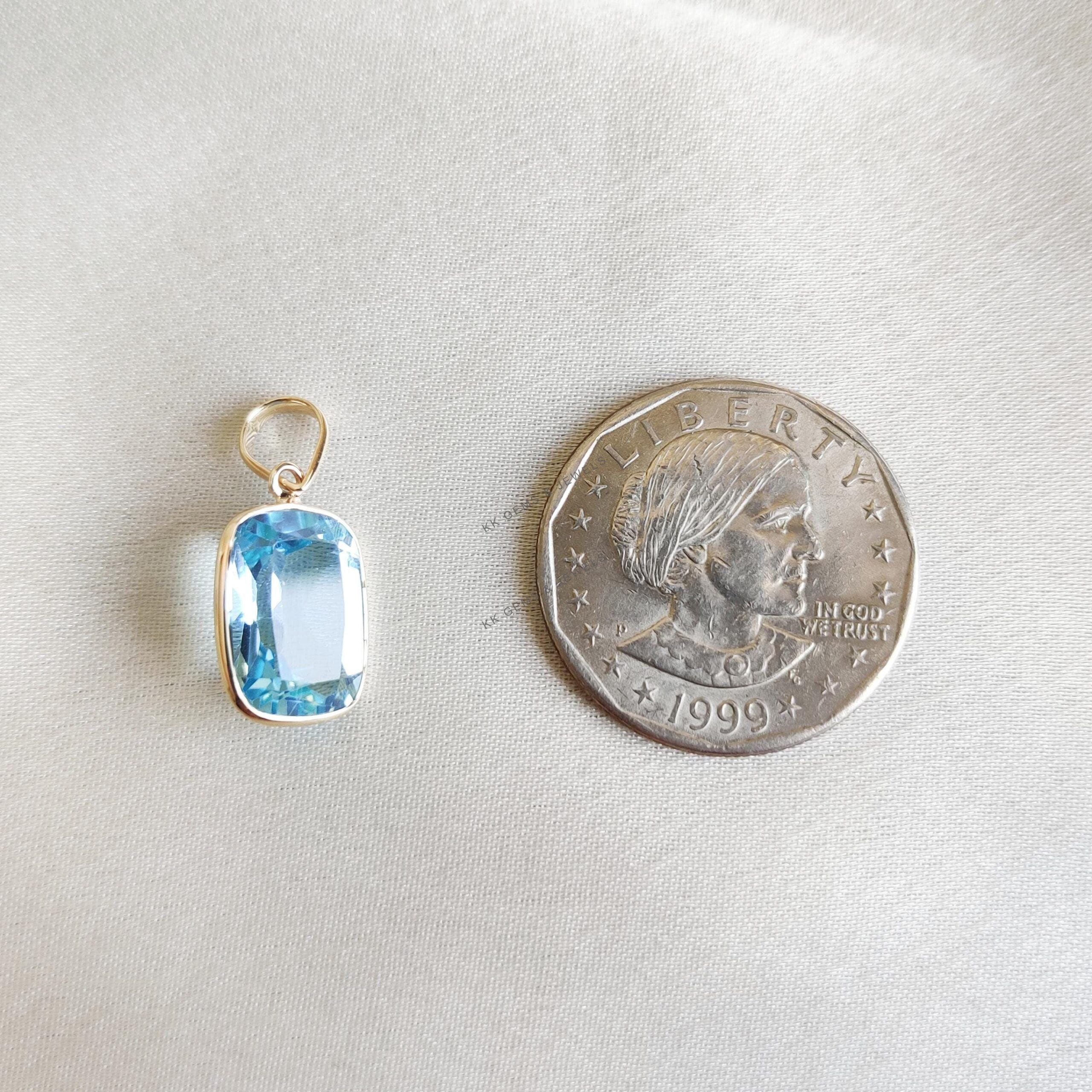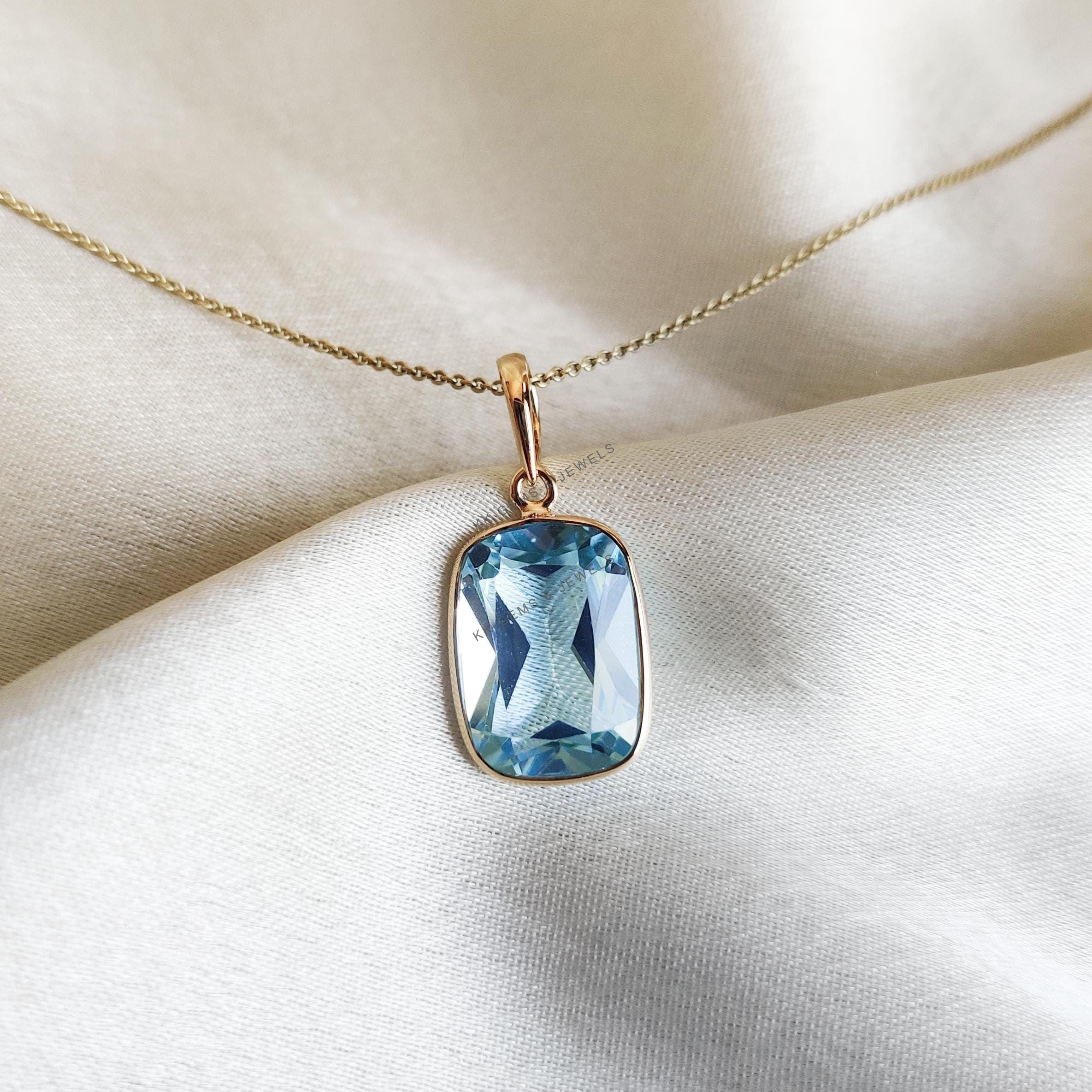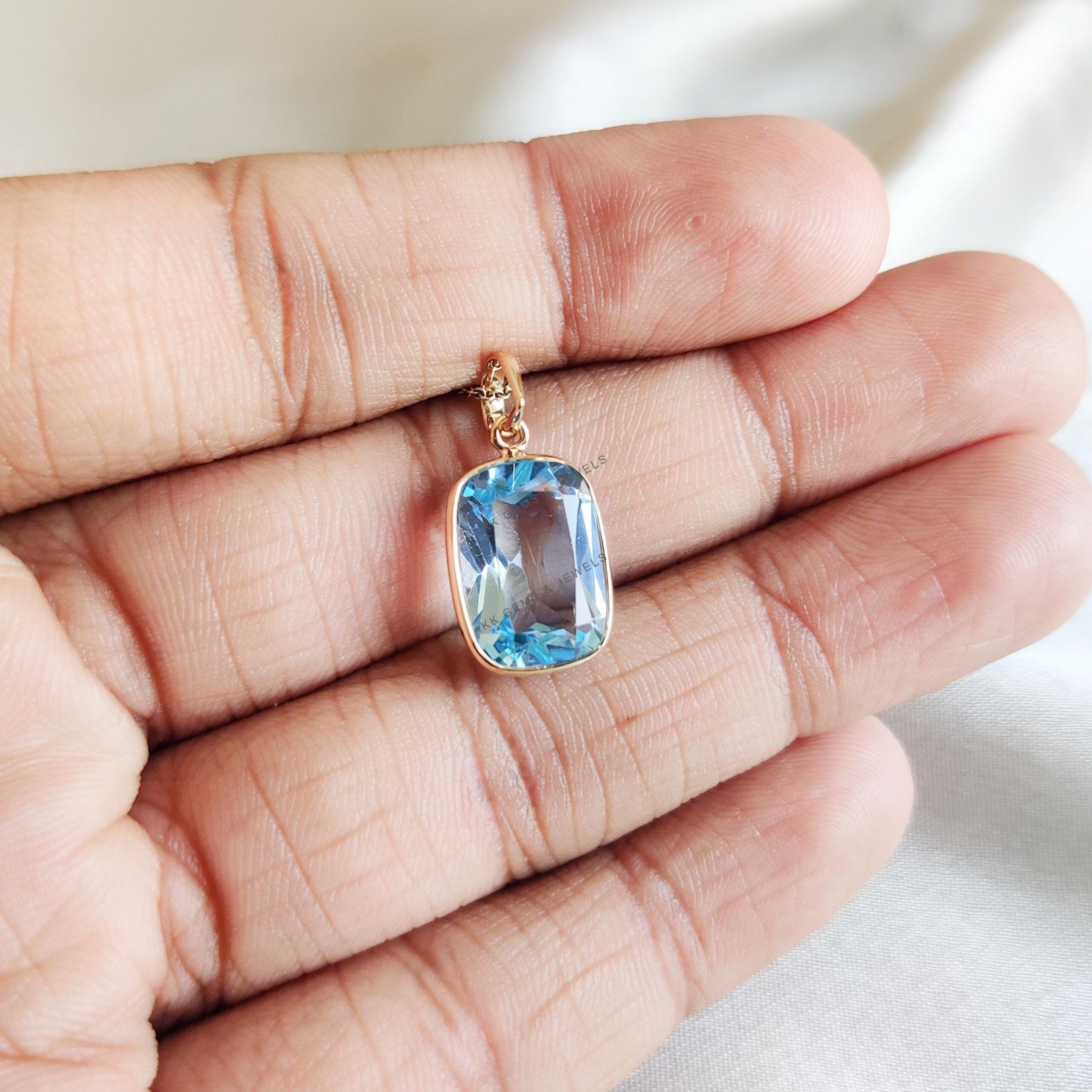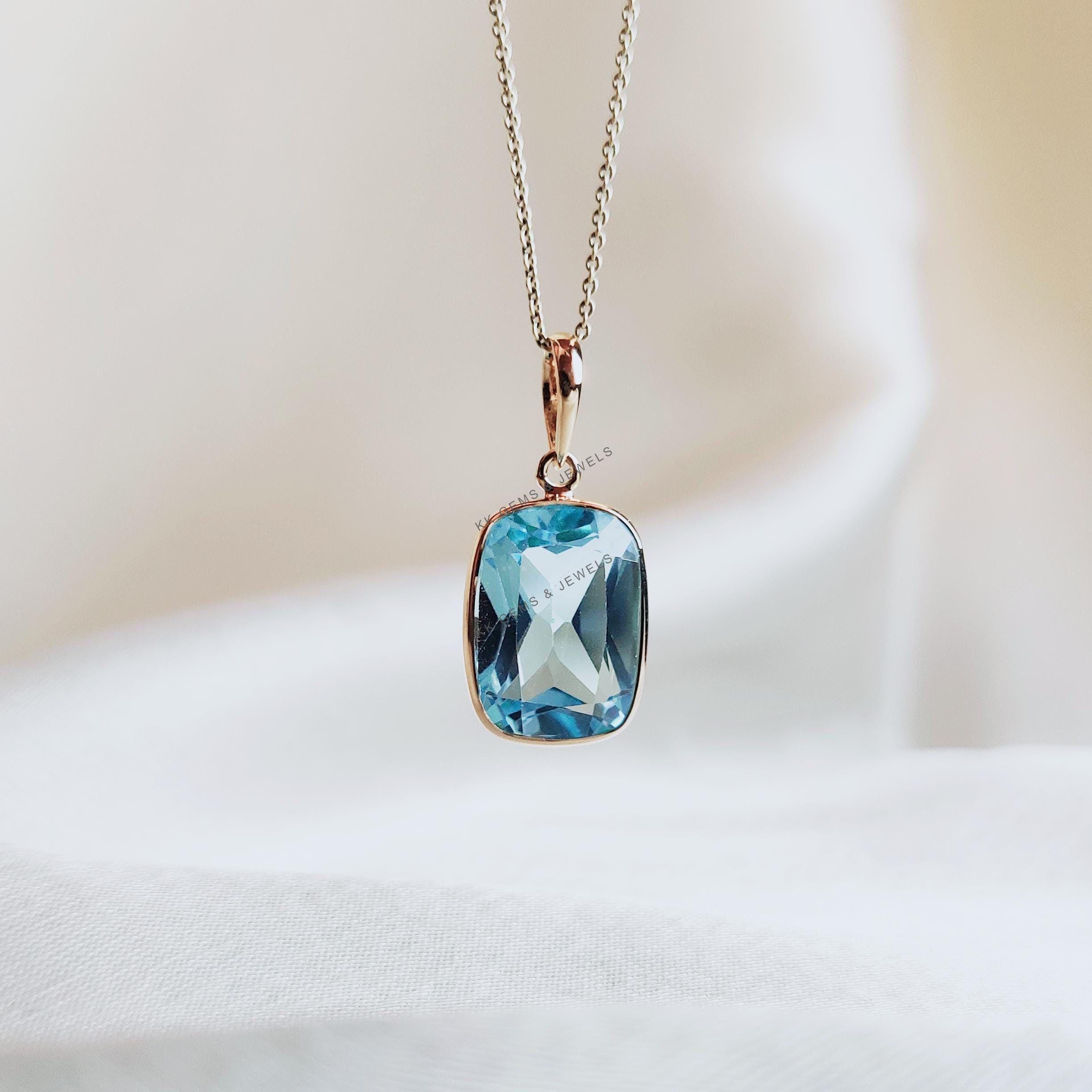 Cushion Cut Natural Sky Blue Topaz Birthstone Pendant Set in 14K Solid Gold