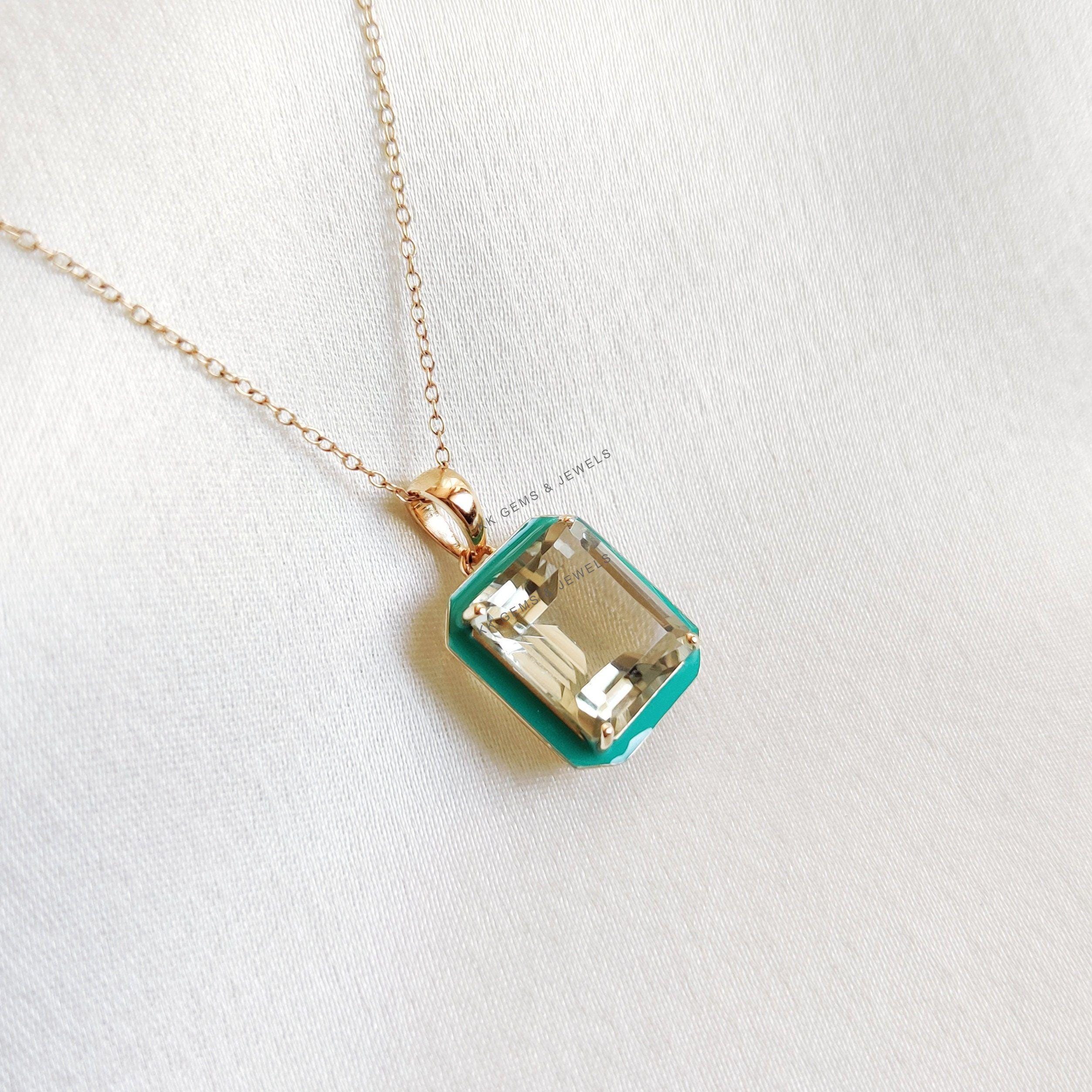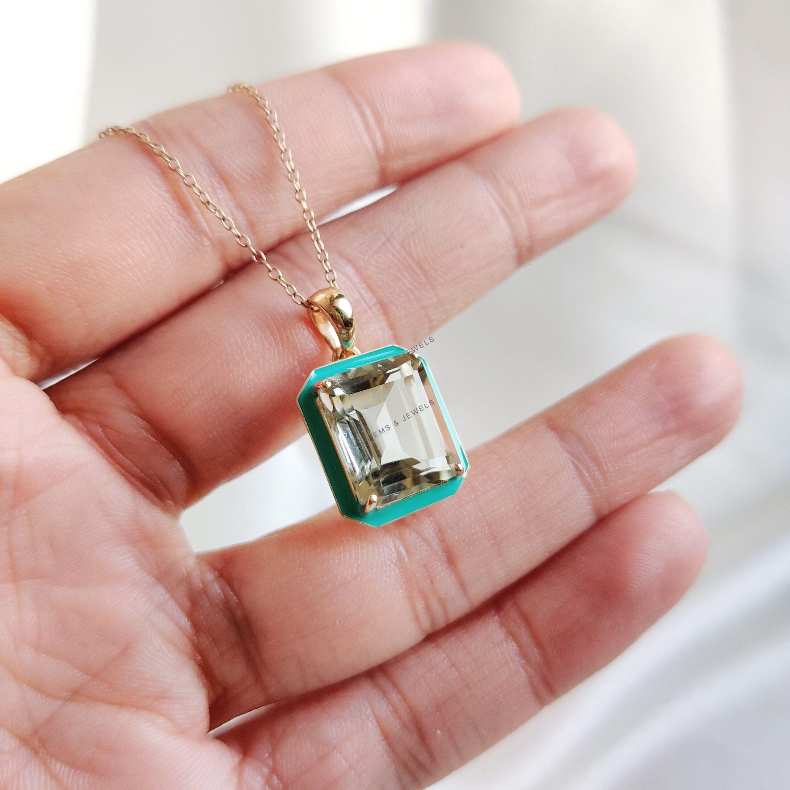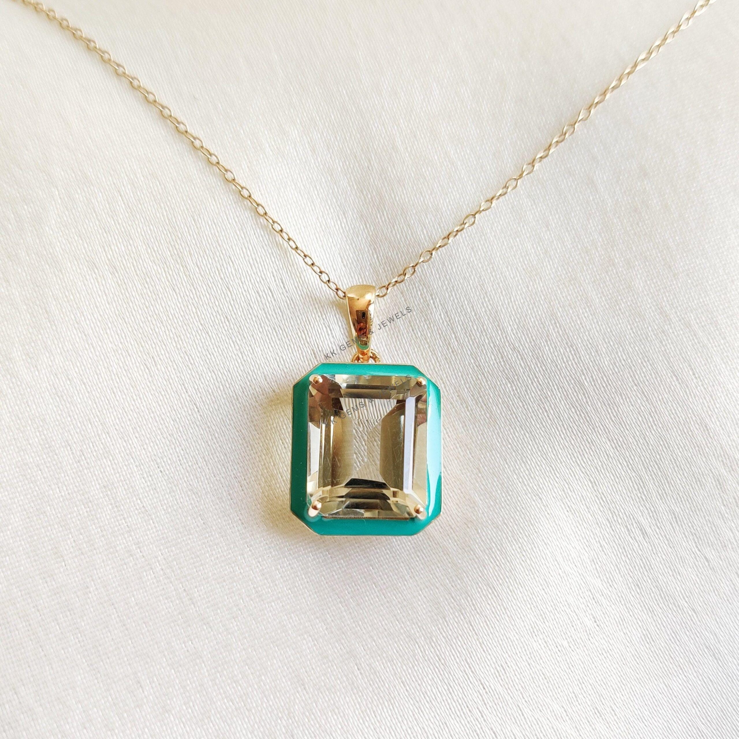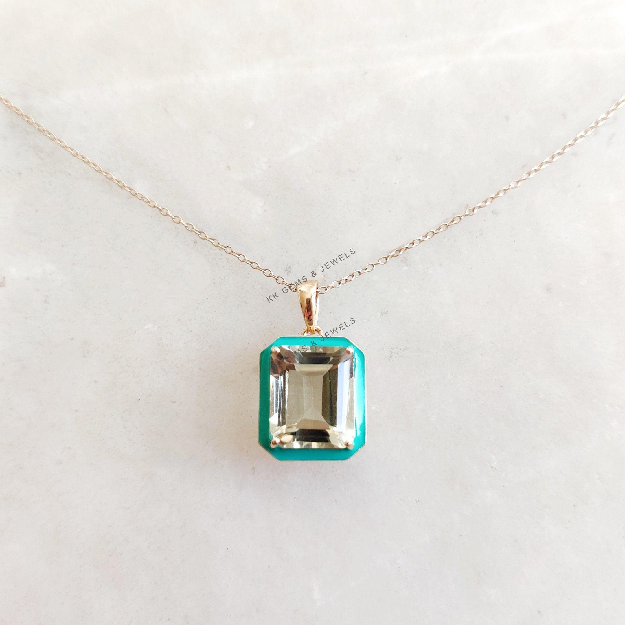 This stunning pendant is set in 14K Solid Yellow Gold with Natural Green Amethyst along with beautiful Green Enamel. It is an unique gemstone pendant for nearly every occasion and is completely hassle-free jewelry. ✓ ABOUT GEMSTONE: Green amethyst, also…