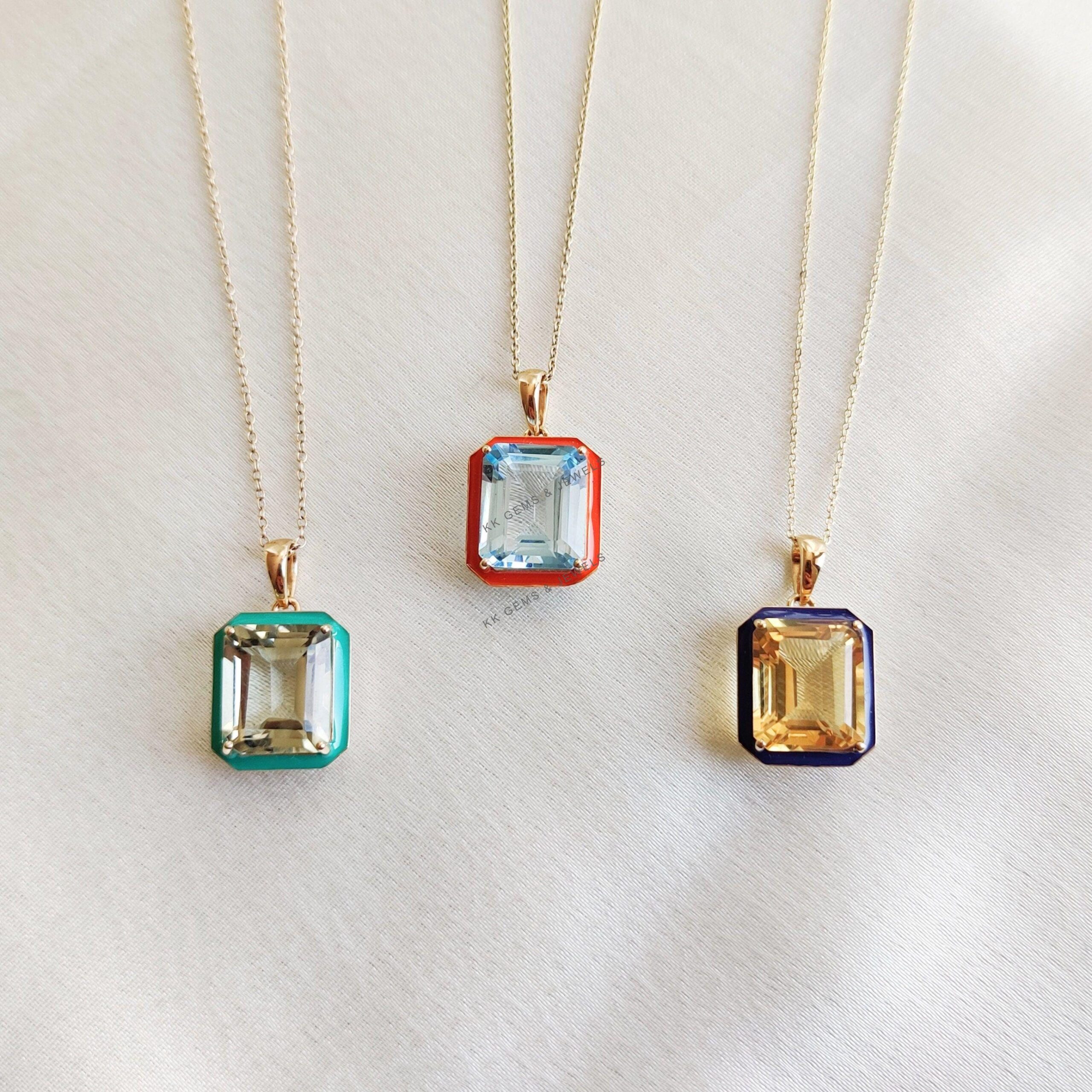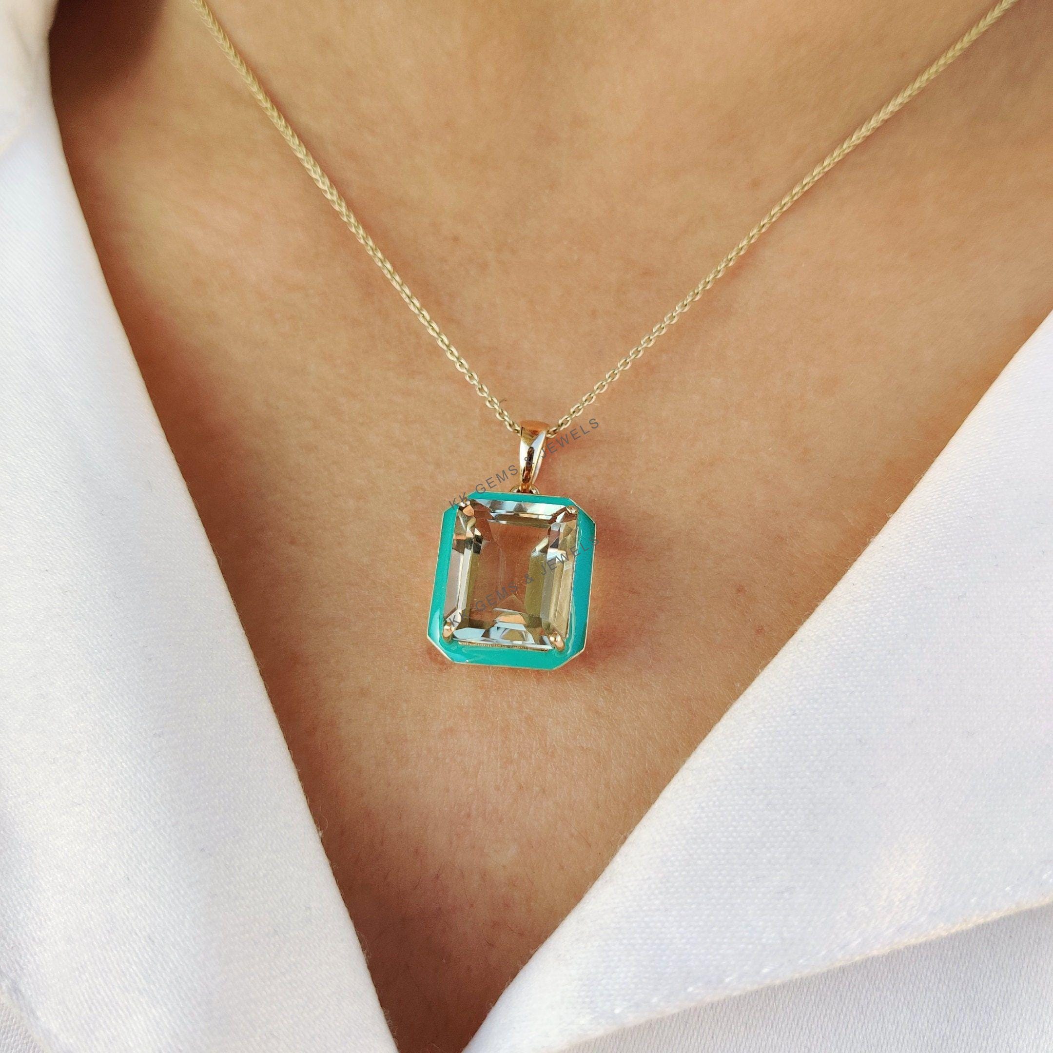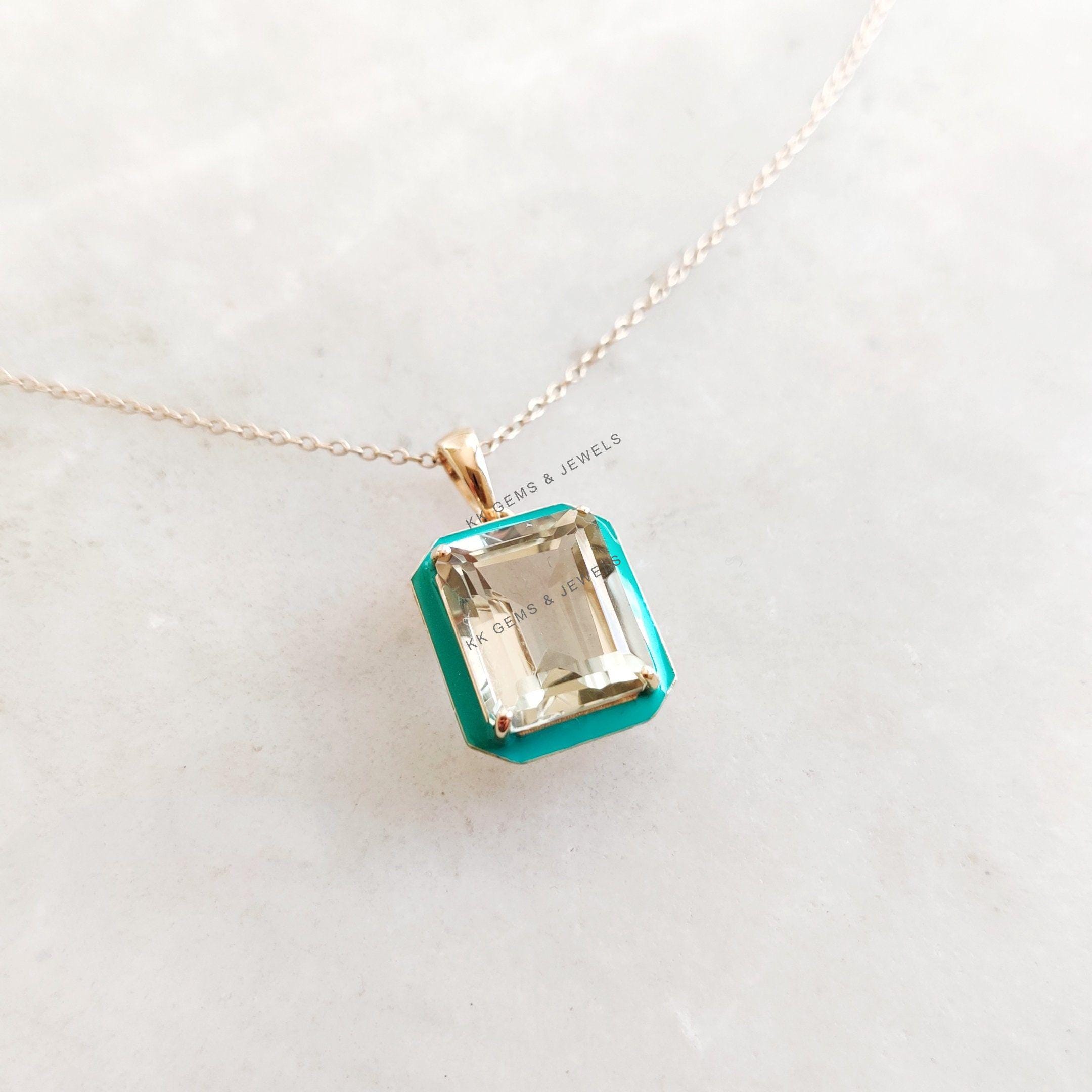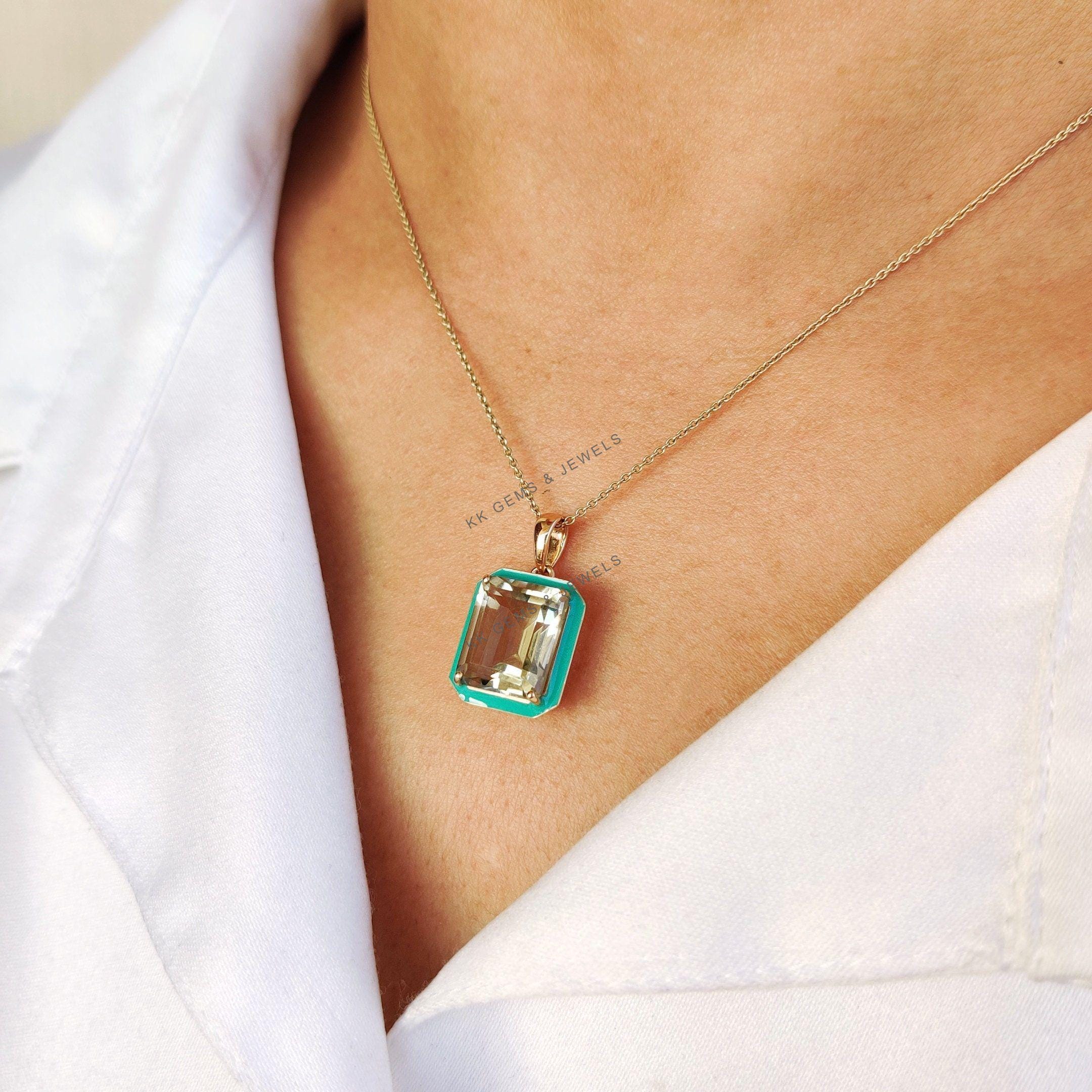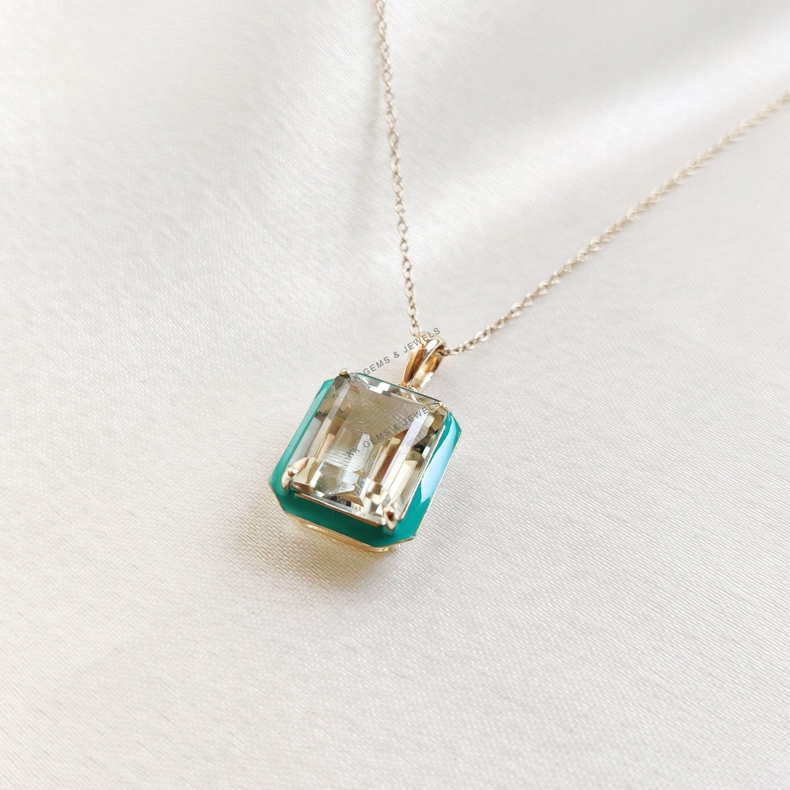 This stunning pendant is set in 14K Solid Yellow Gold with Natural Green Amethyst along with beautiful Green Enamel. It is an unique gemstone pendant for nearly every occasion and is completely hassle-free jewelry. ✓ ABOUT GEMSTONE: Green amethyst, also…