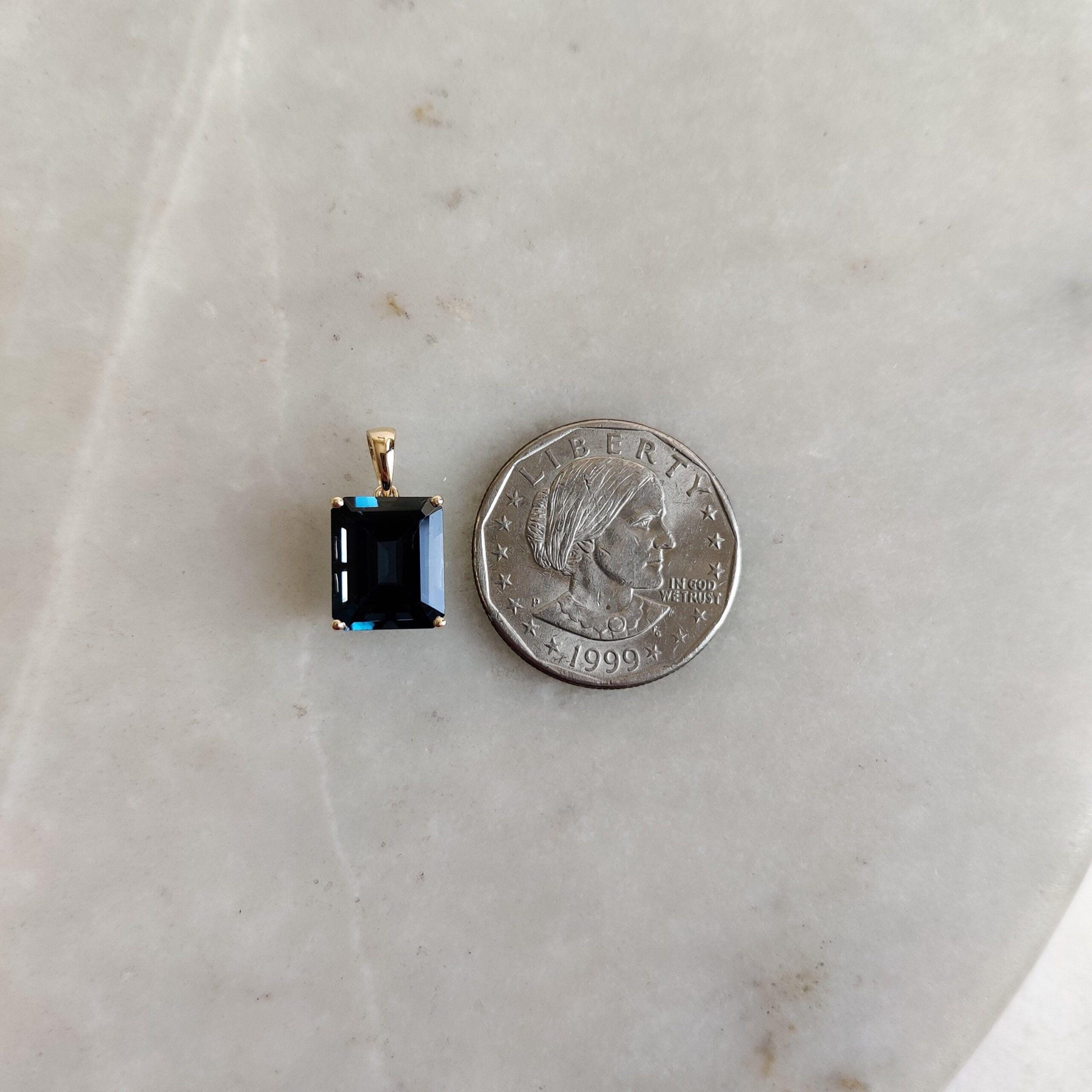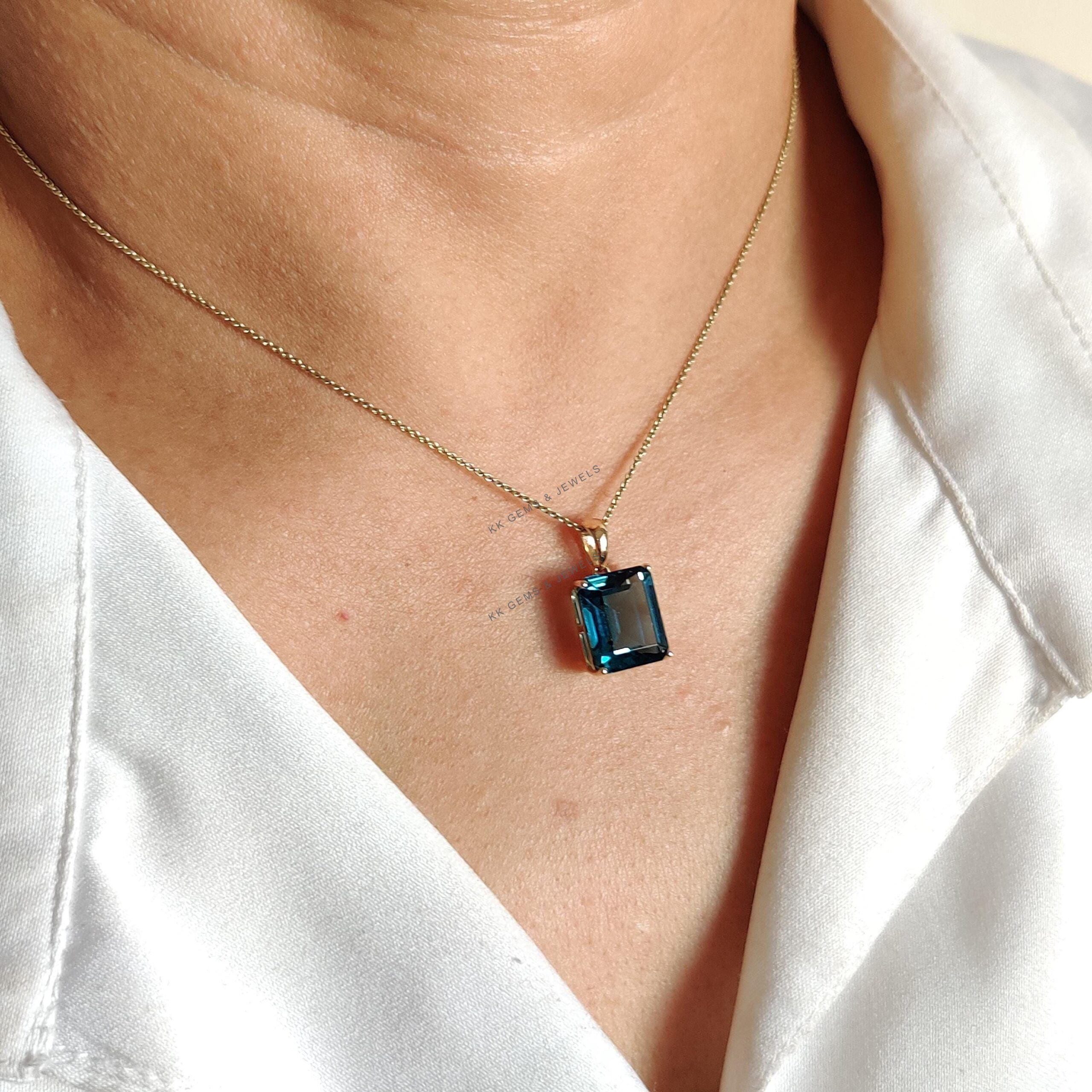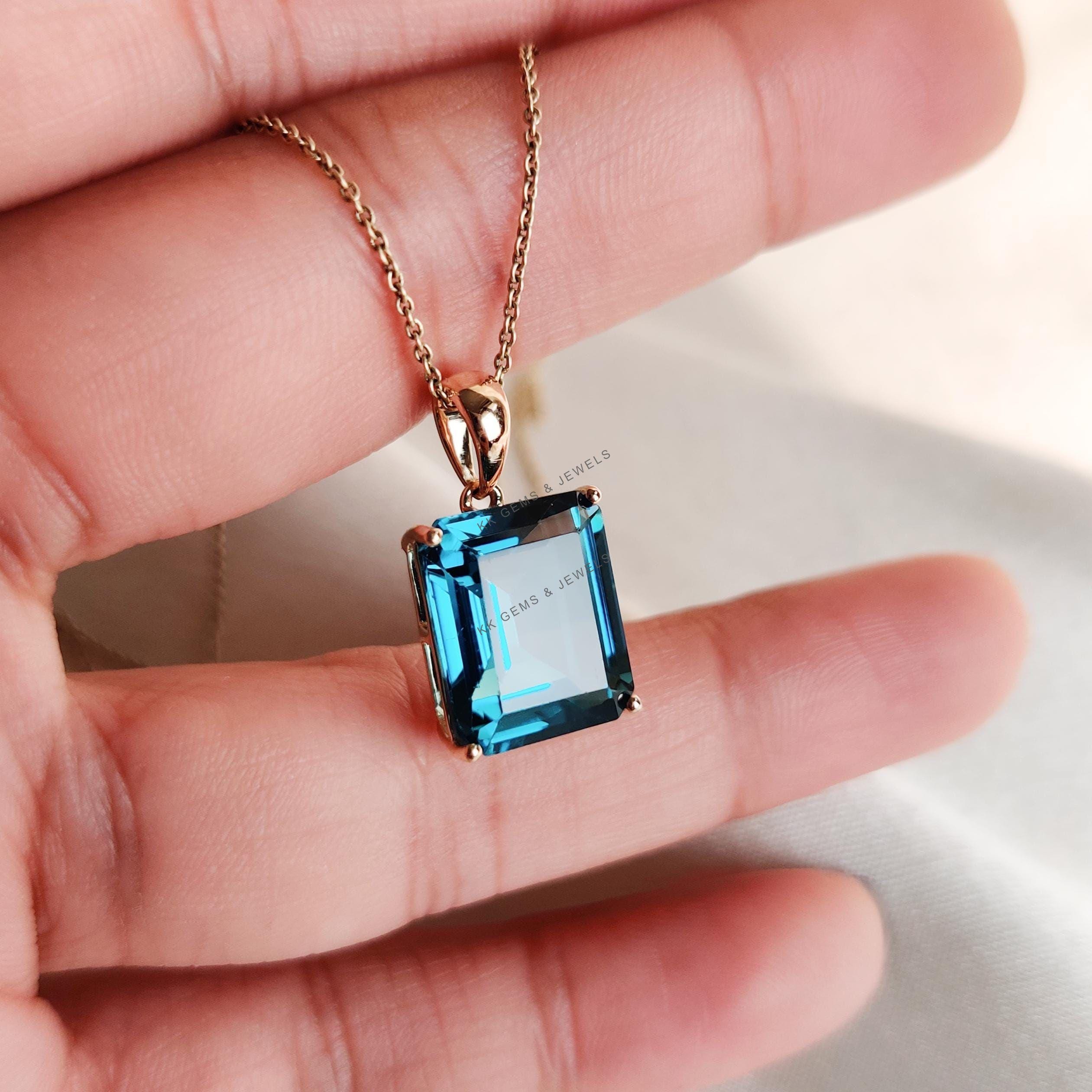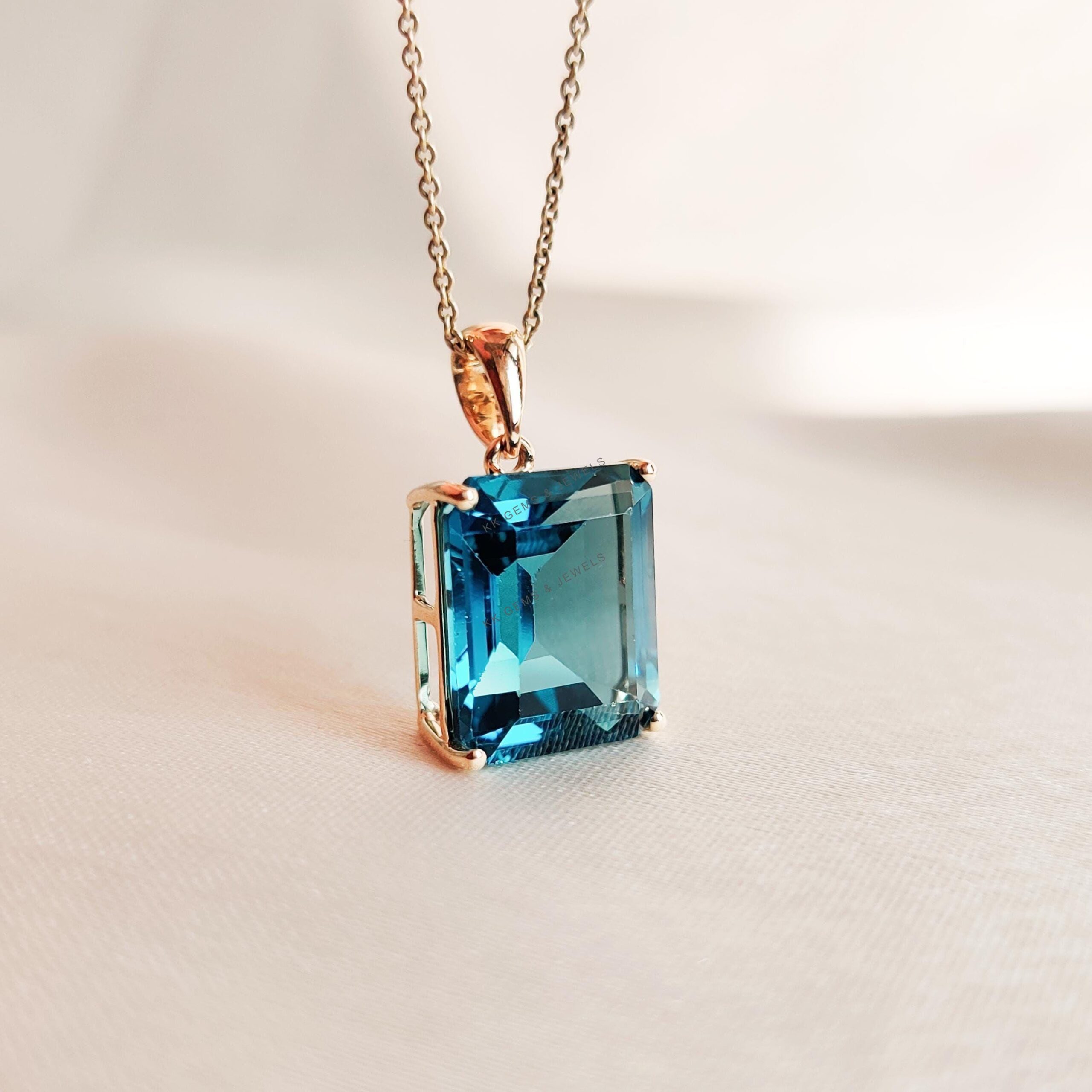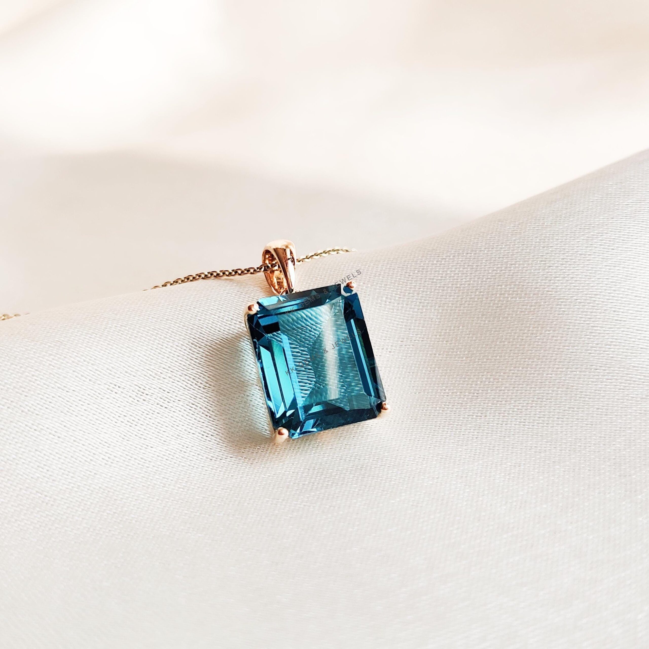 Emerald Cut Natural London Blue Topaz Birthstone Pendant Set in 14K Solid Gold