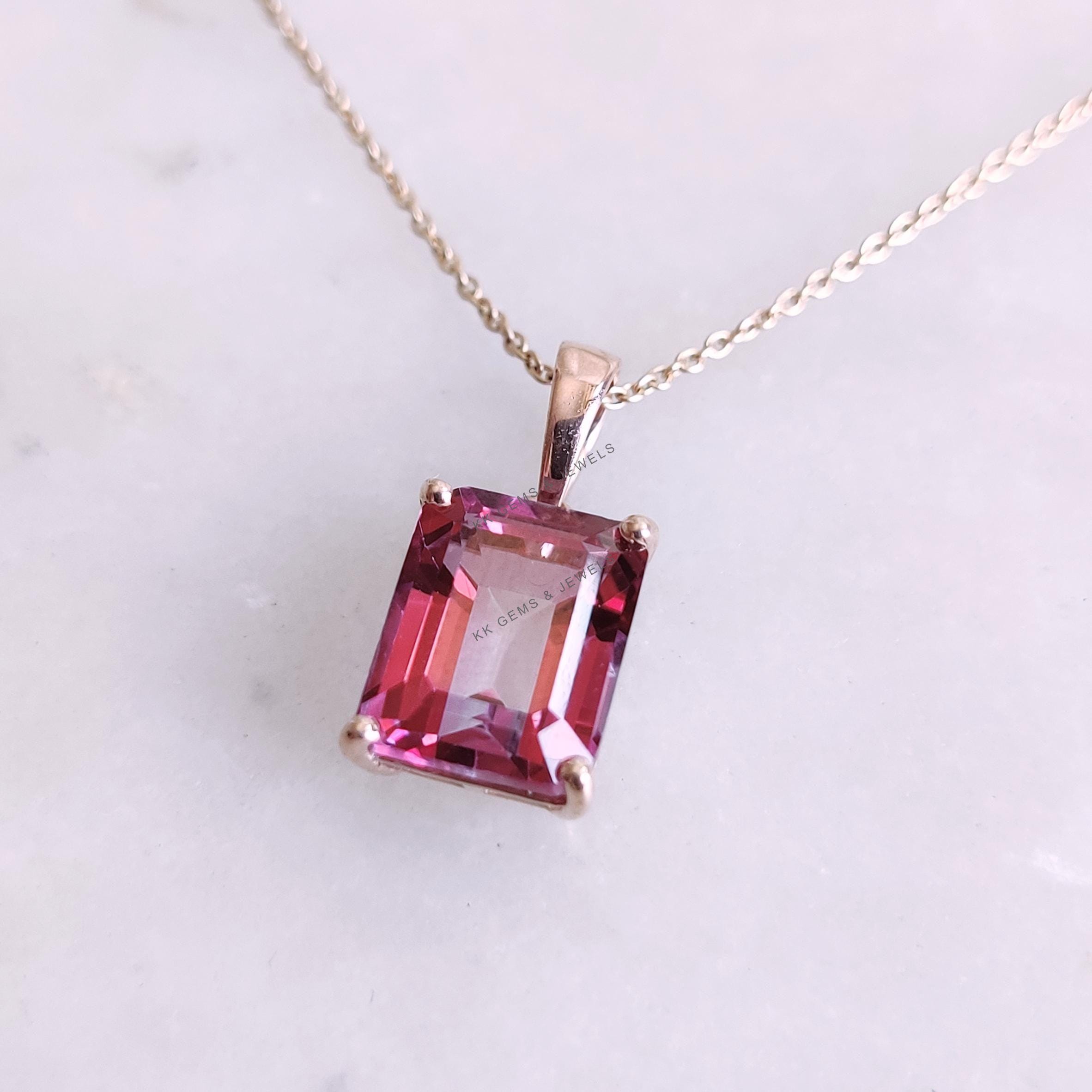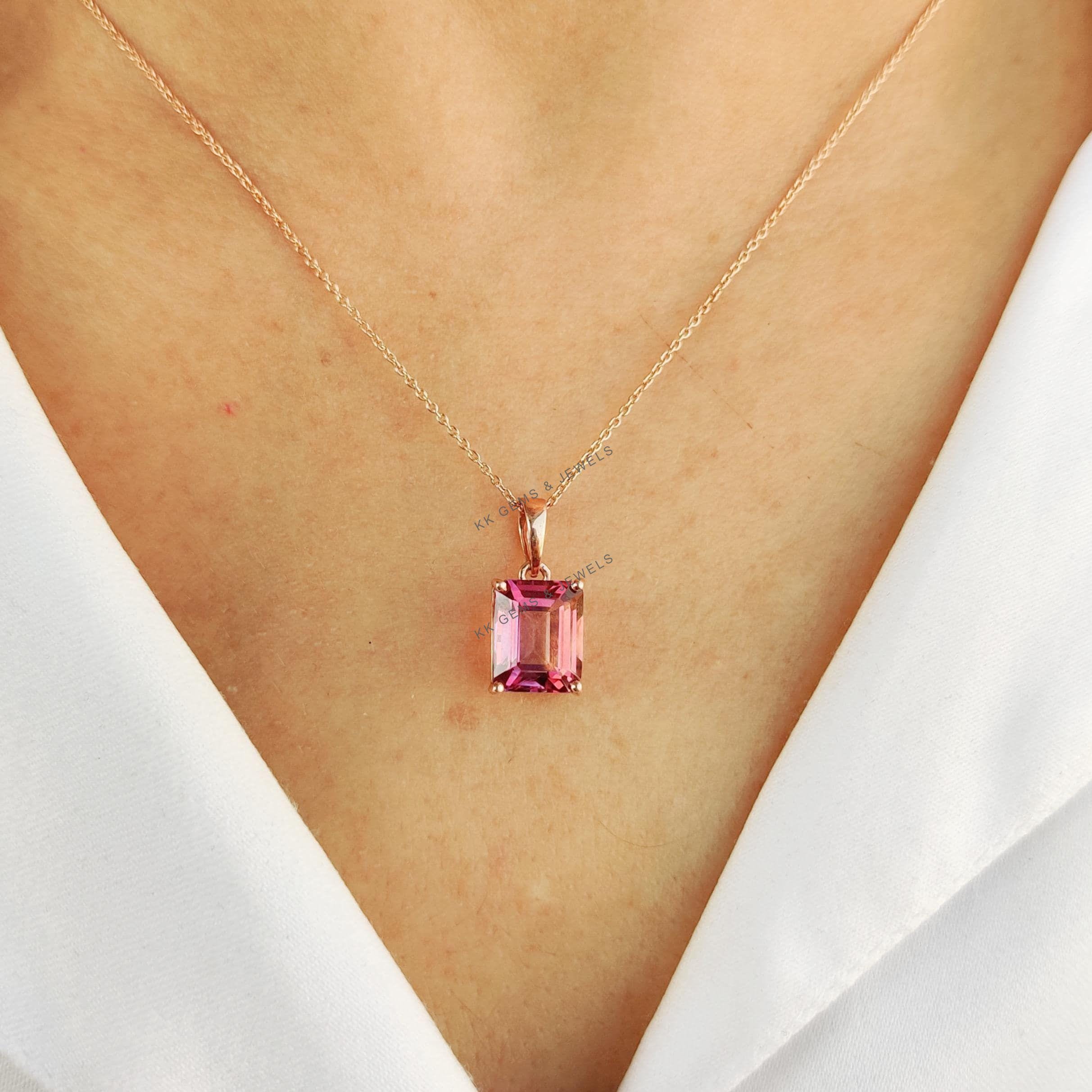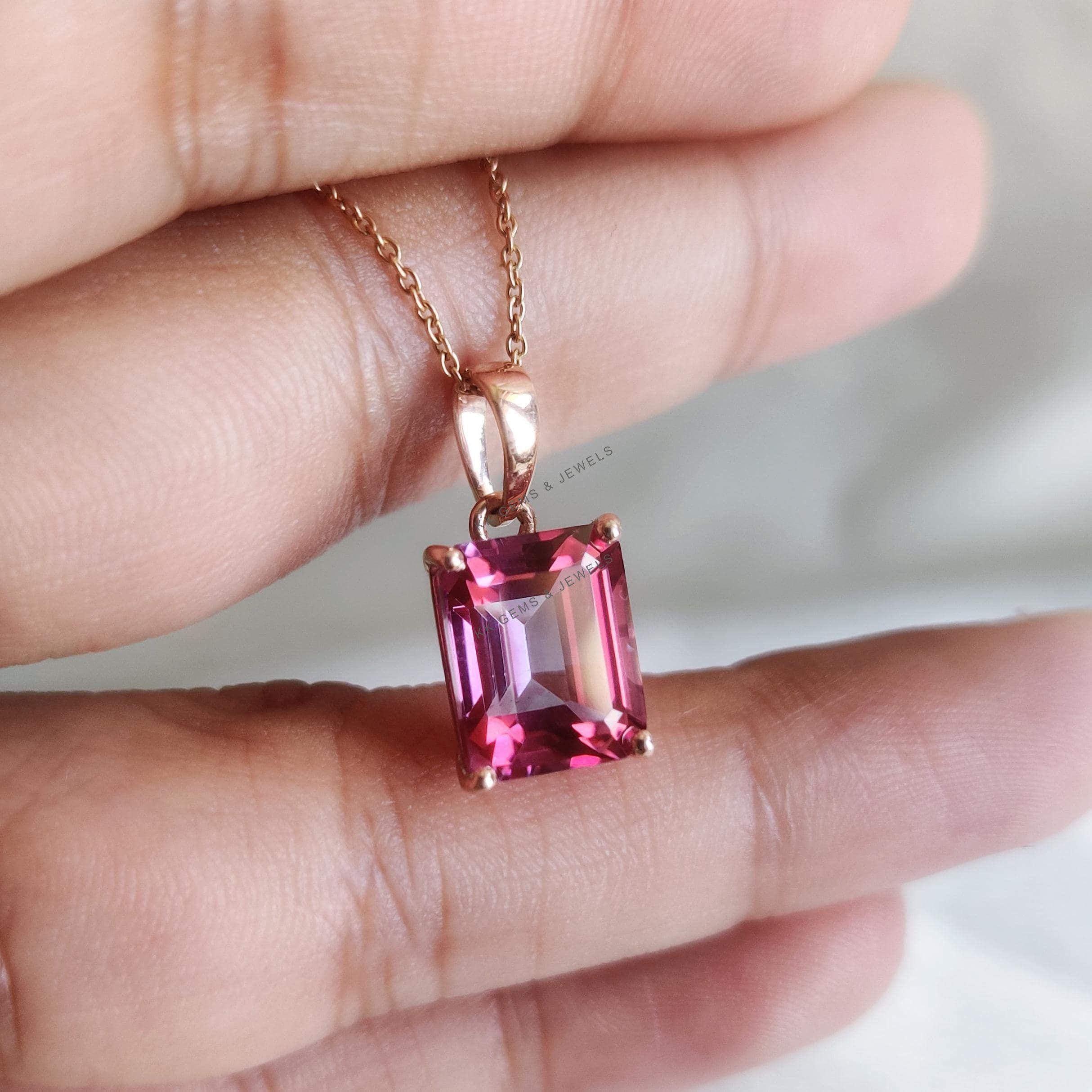 Emerald Cut, Natural Pink Topaz Birthstone Pendant, Set in 14K Solid Gold