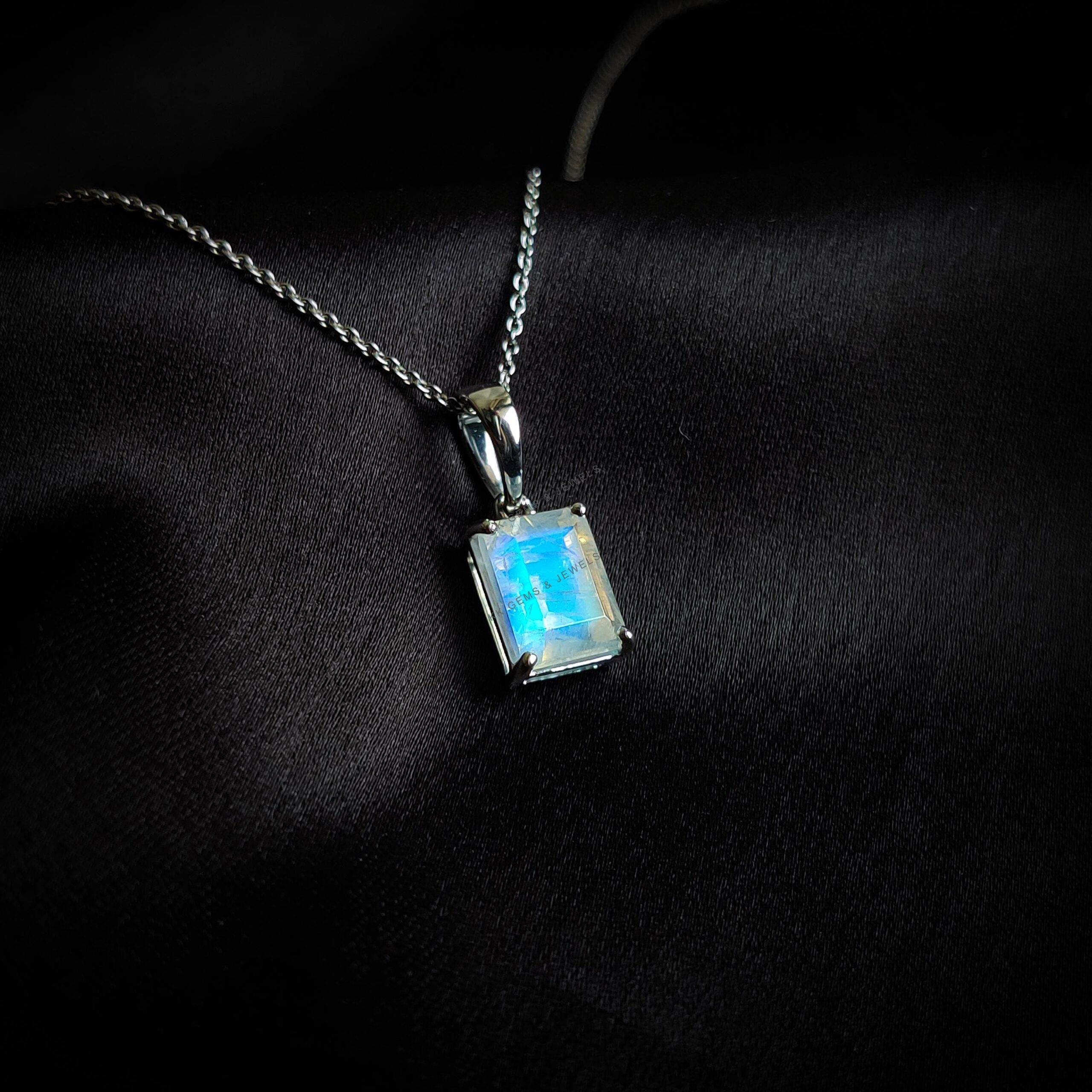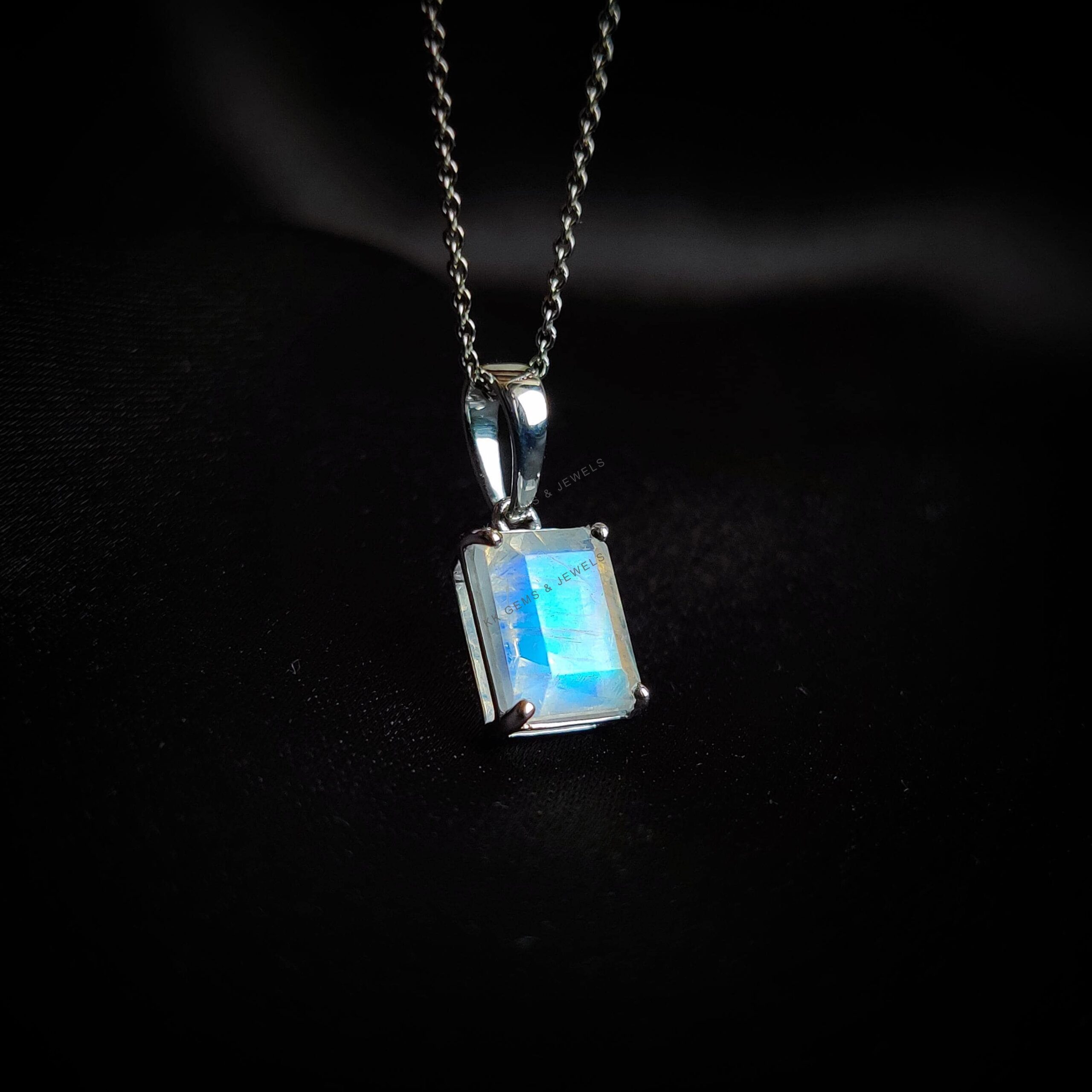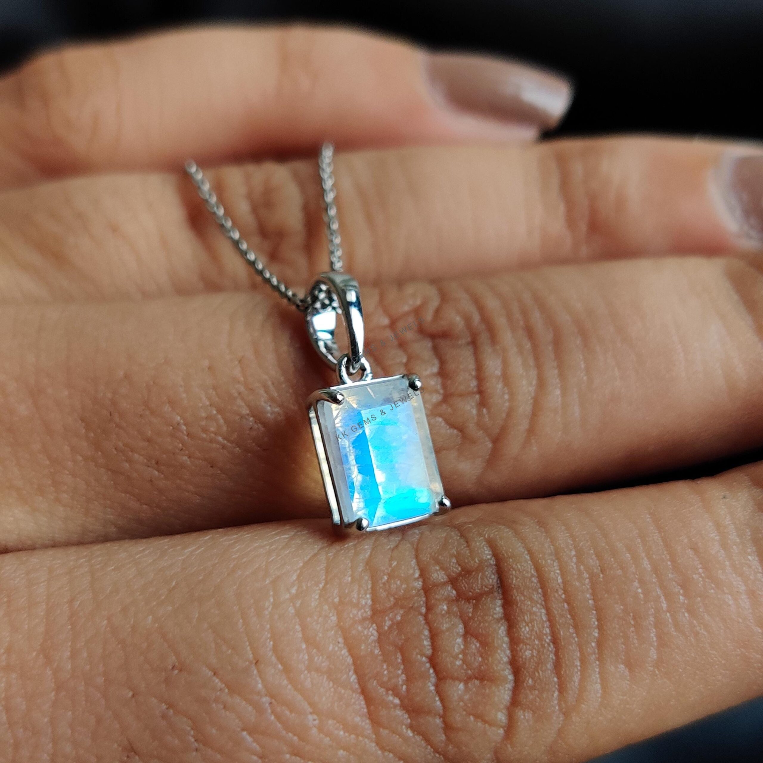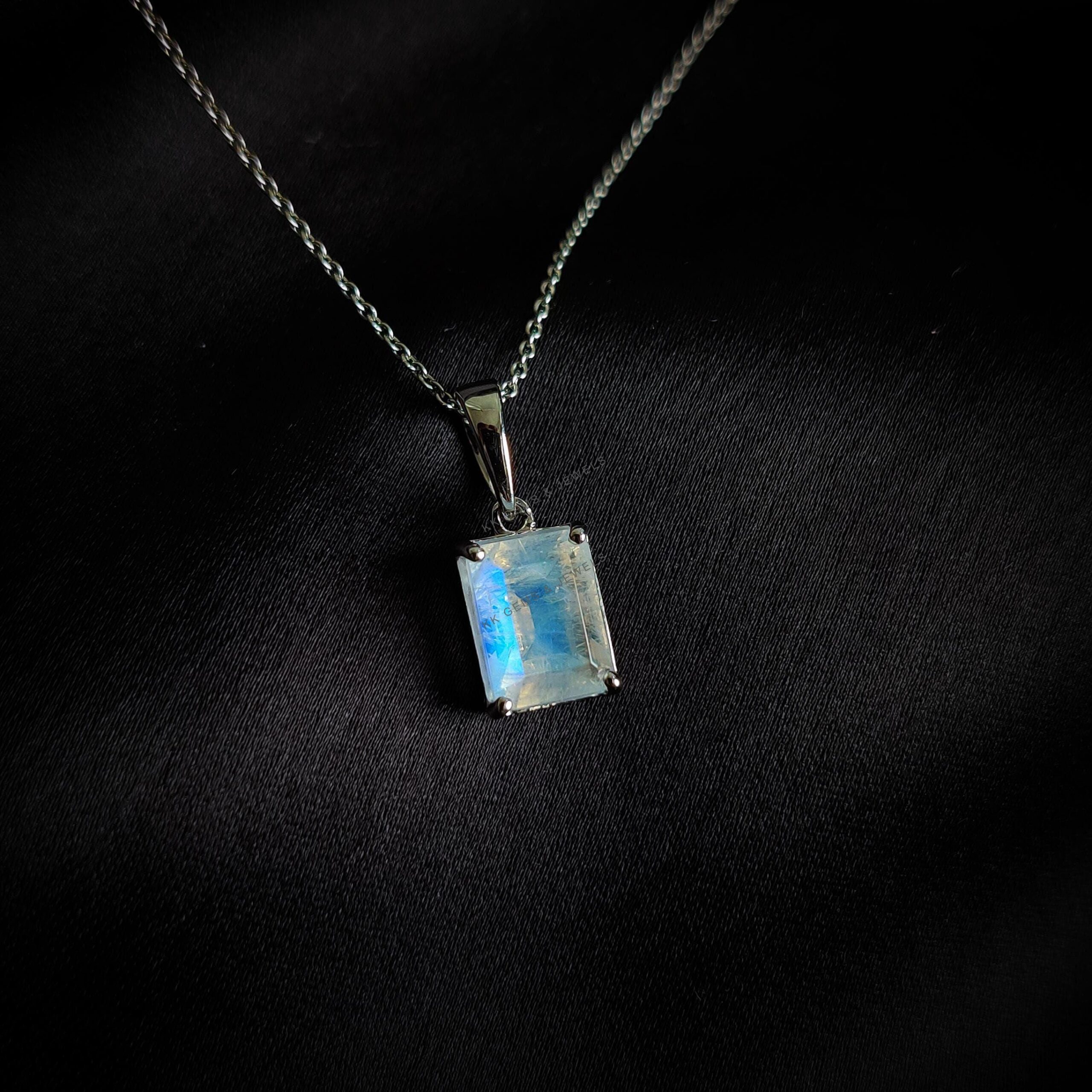 Emerald Cut Natural Rainbow Moonstone Pendant, Birthstone Pendant Set in 14K Solid White Gold