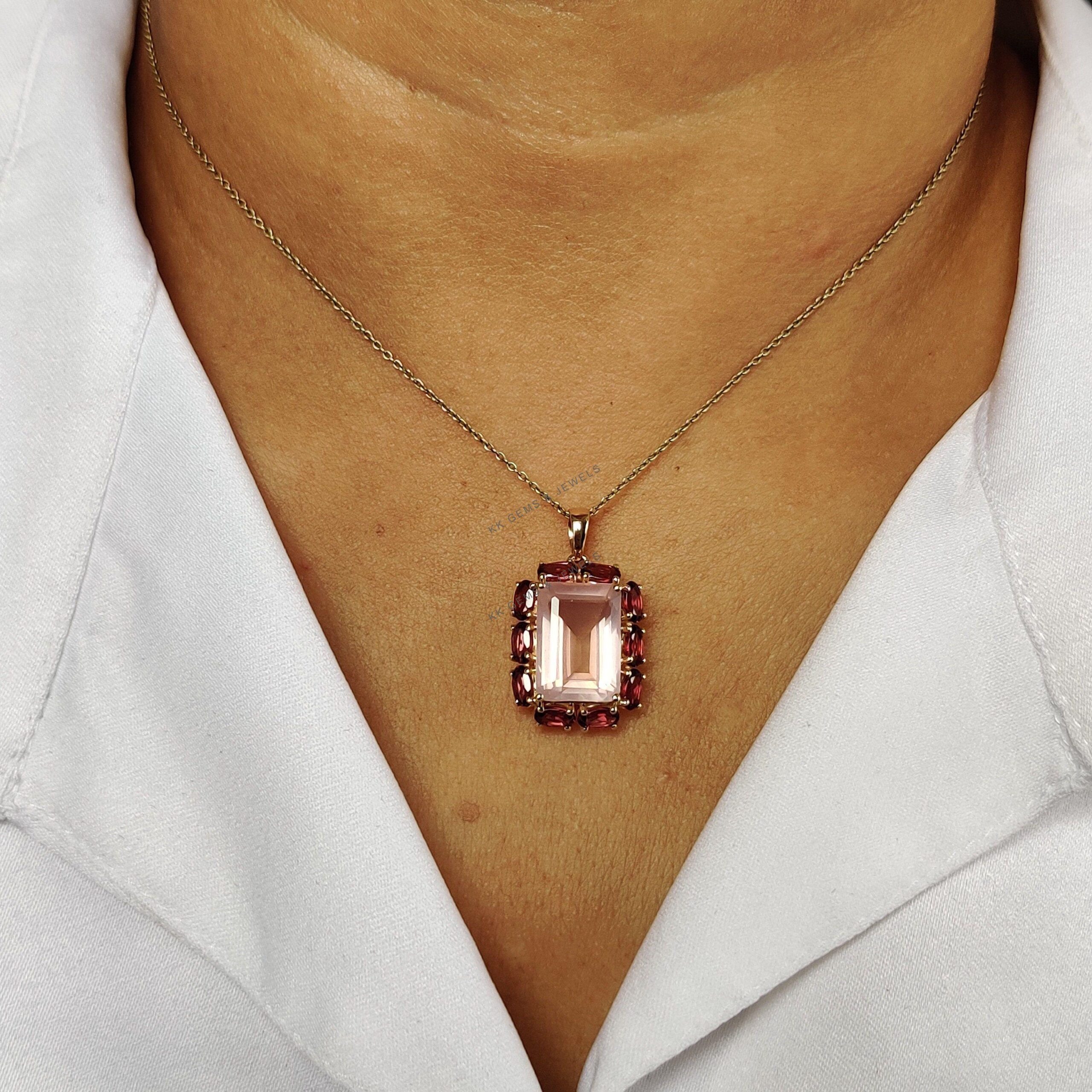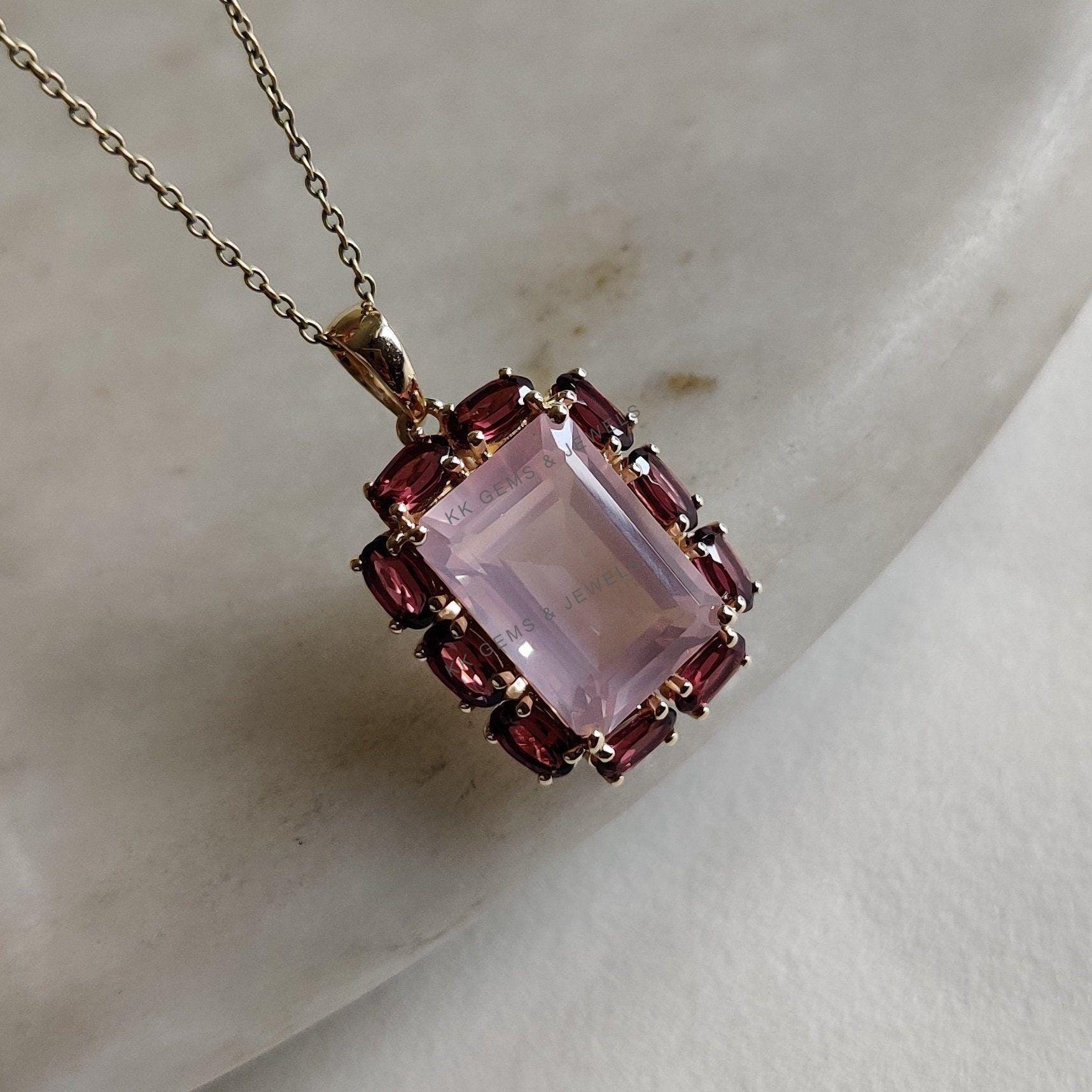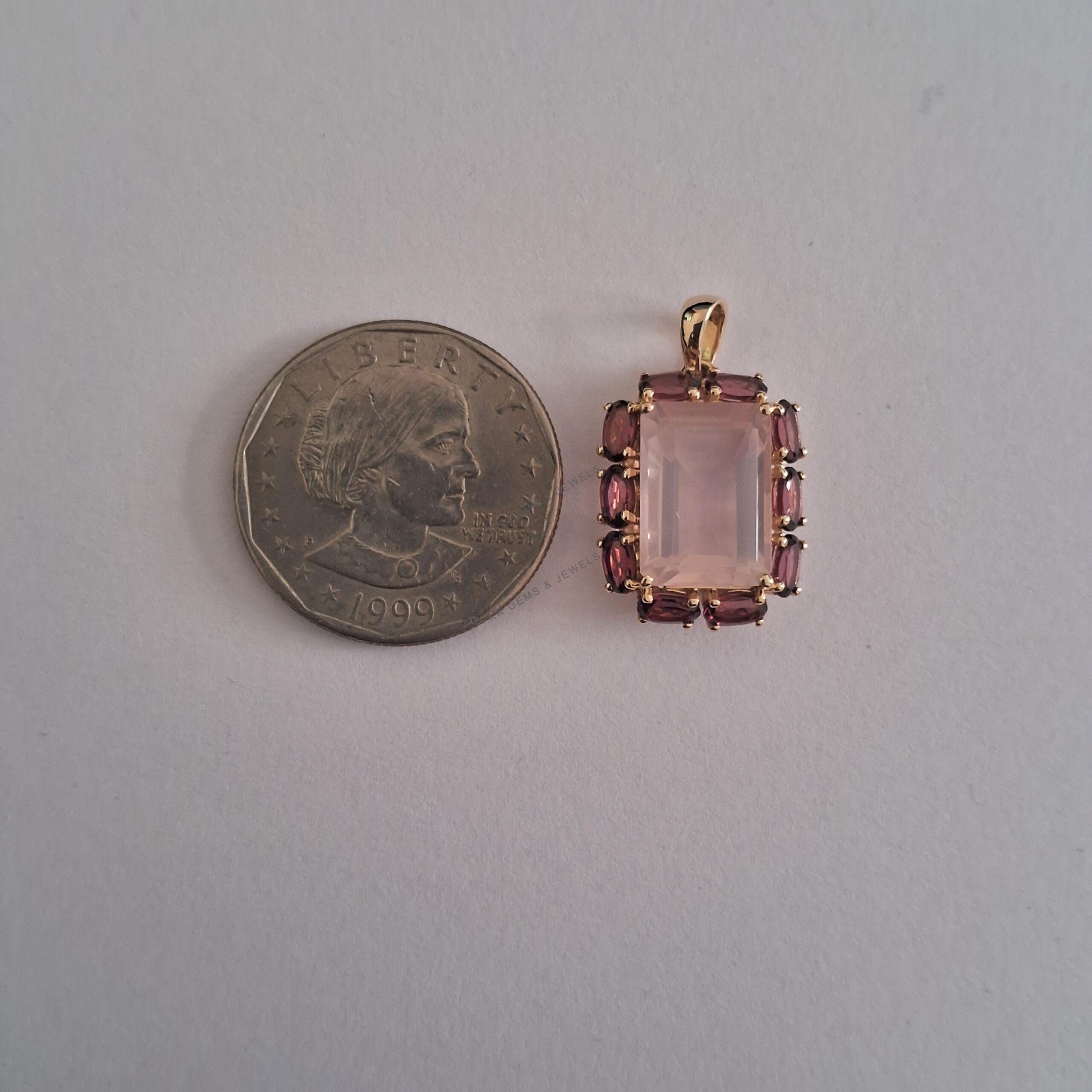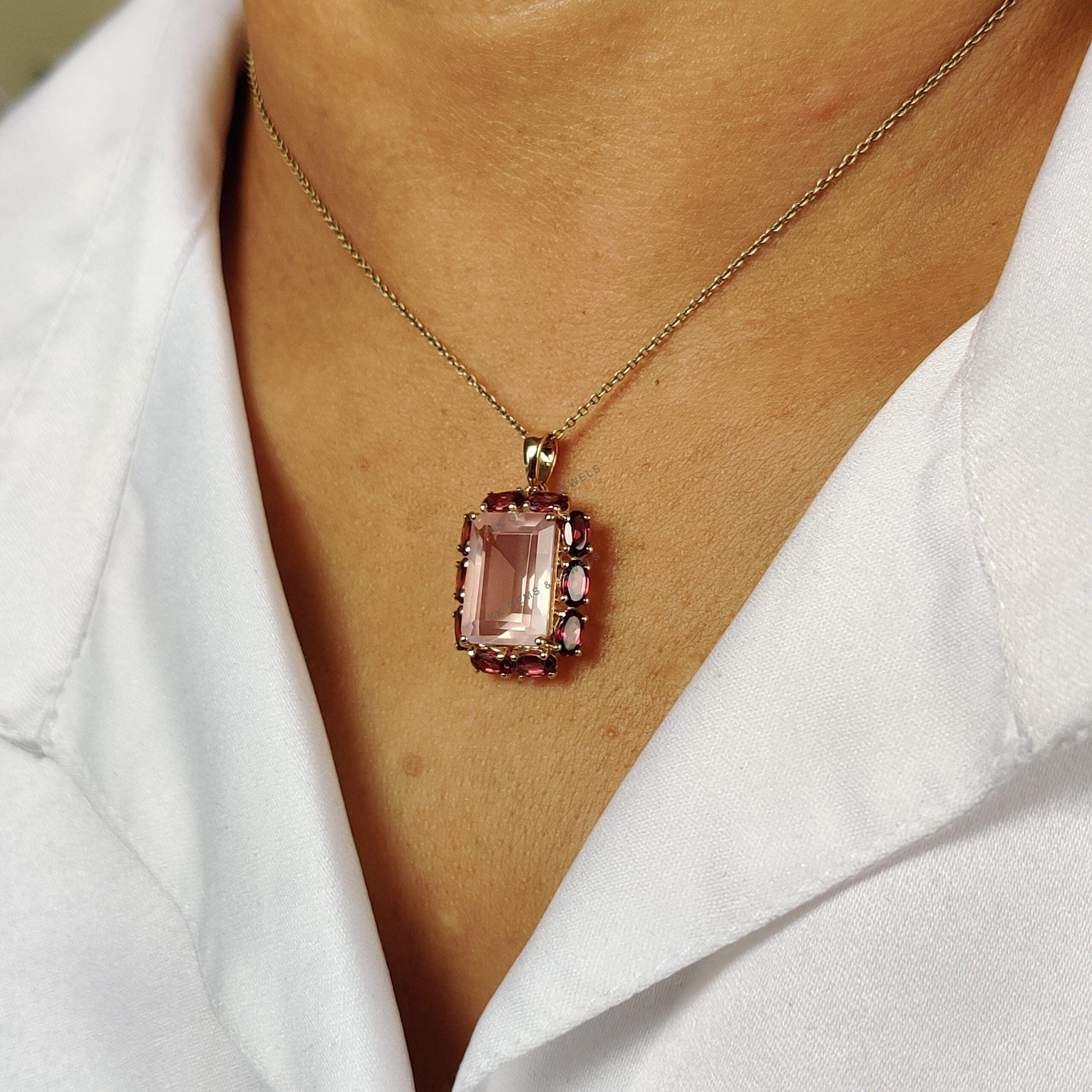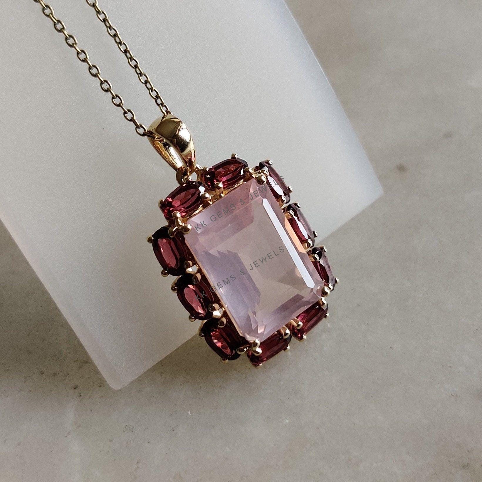 This stunning pendant is set in 14K Solid Yellow Gold with Natural Rose Quartz and Rhodolite Garnet with utmost precision. It is an unique gemstone pendant for nearly every occasion and is completely hassle-free jewelry.
