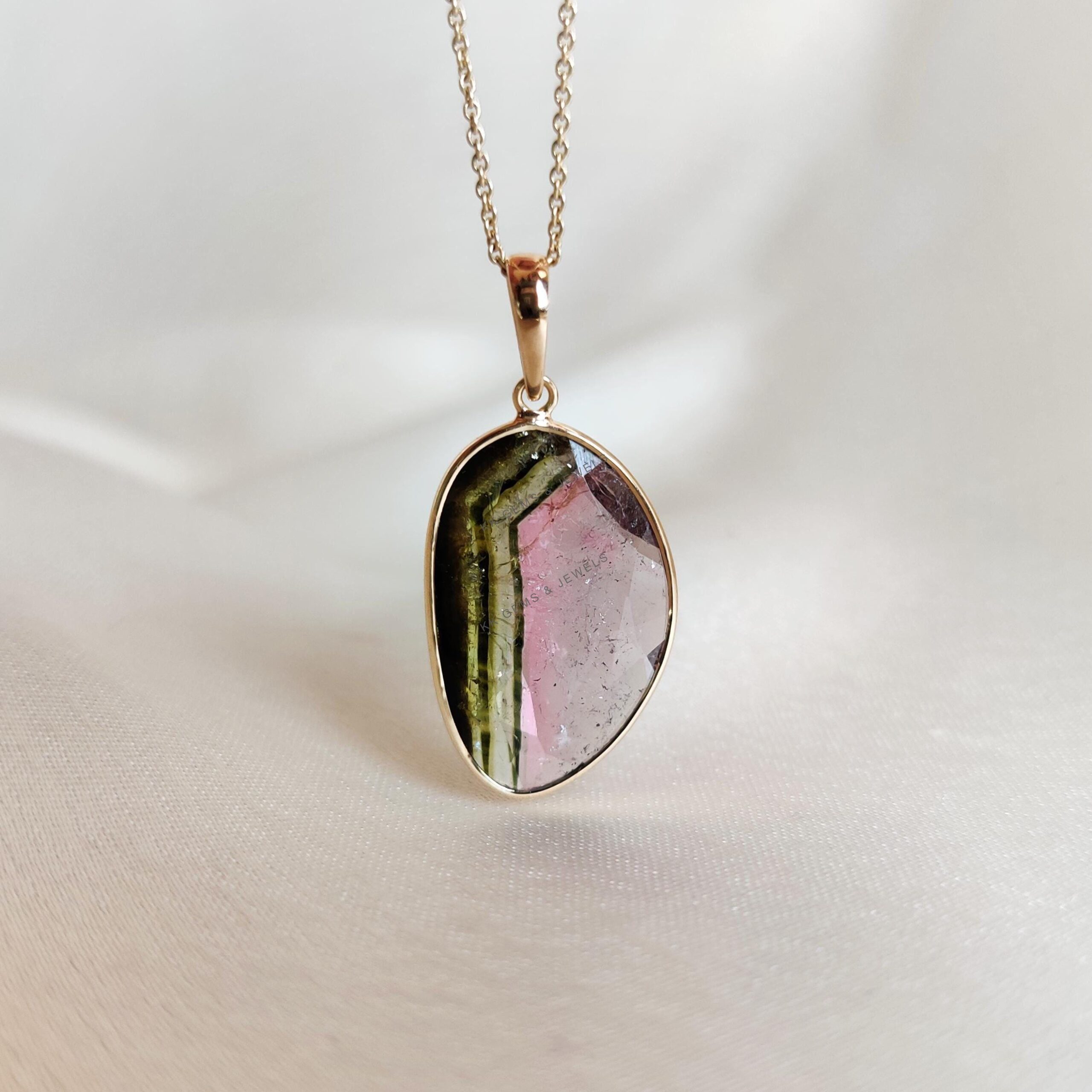 This stunning pendant is set in 14K Solid Yellow Gold with Natural Watermelon Tourmaline with utmost precision. It is an unique gemstone pendant for nearly every occasion and is completely hassle-free jewelry. ITEM DETAILS • Gem: Watermelon Tourmaline • Gem…
