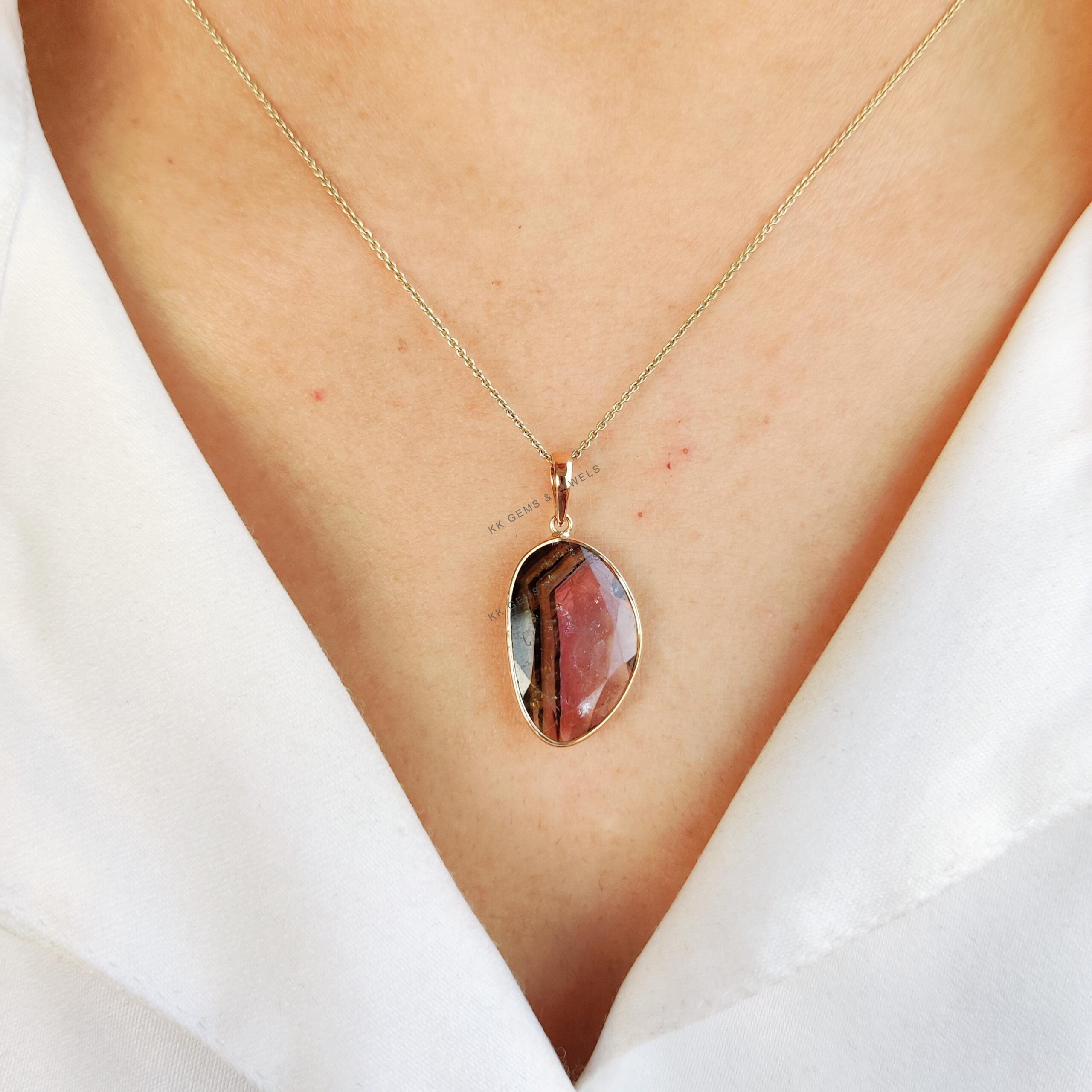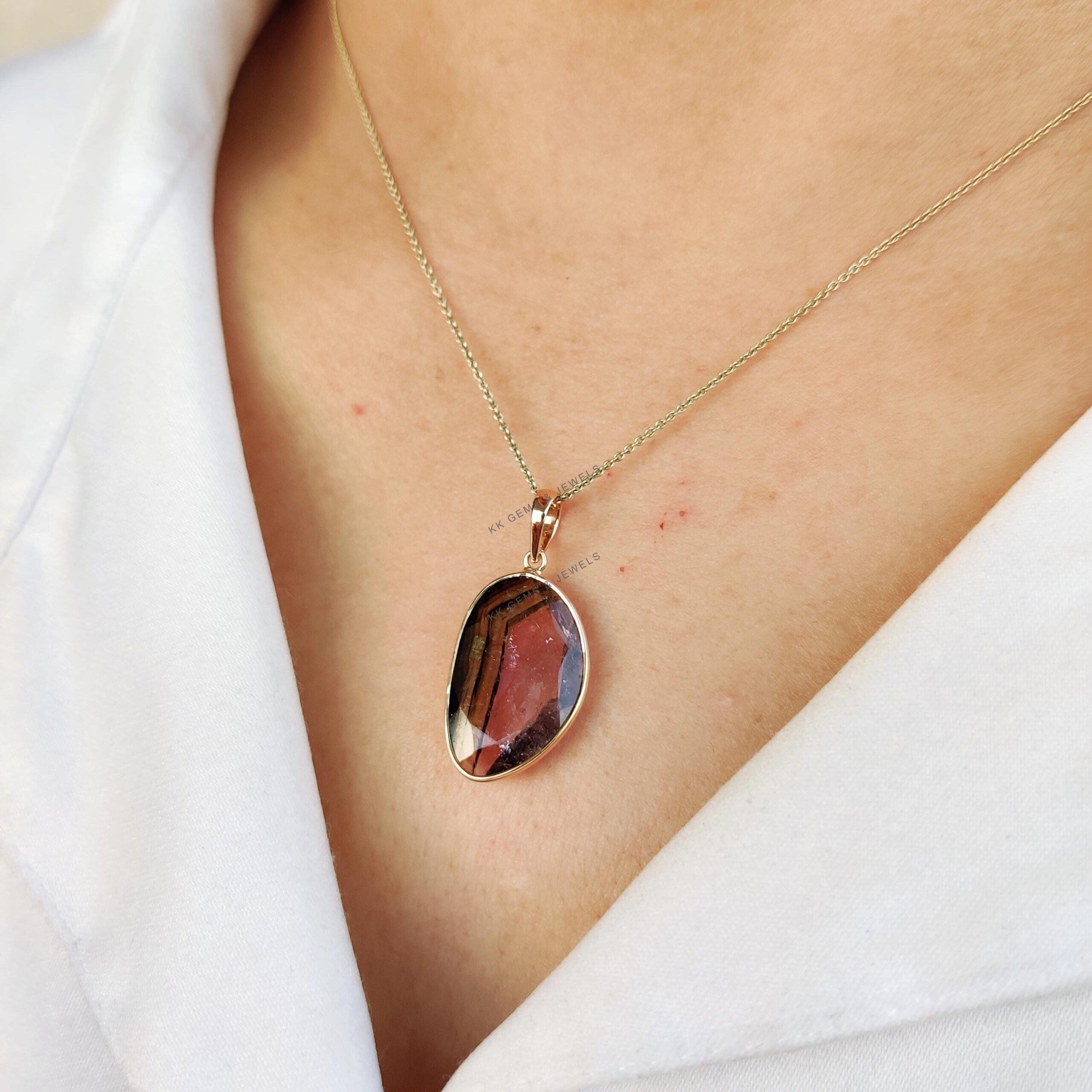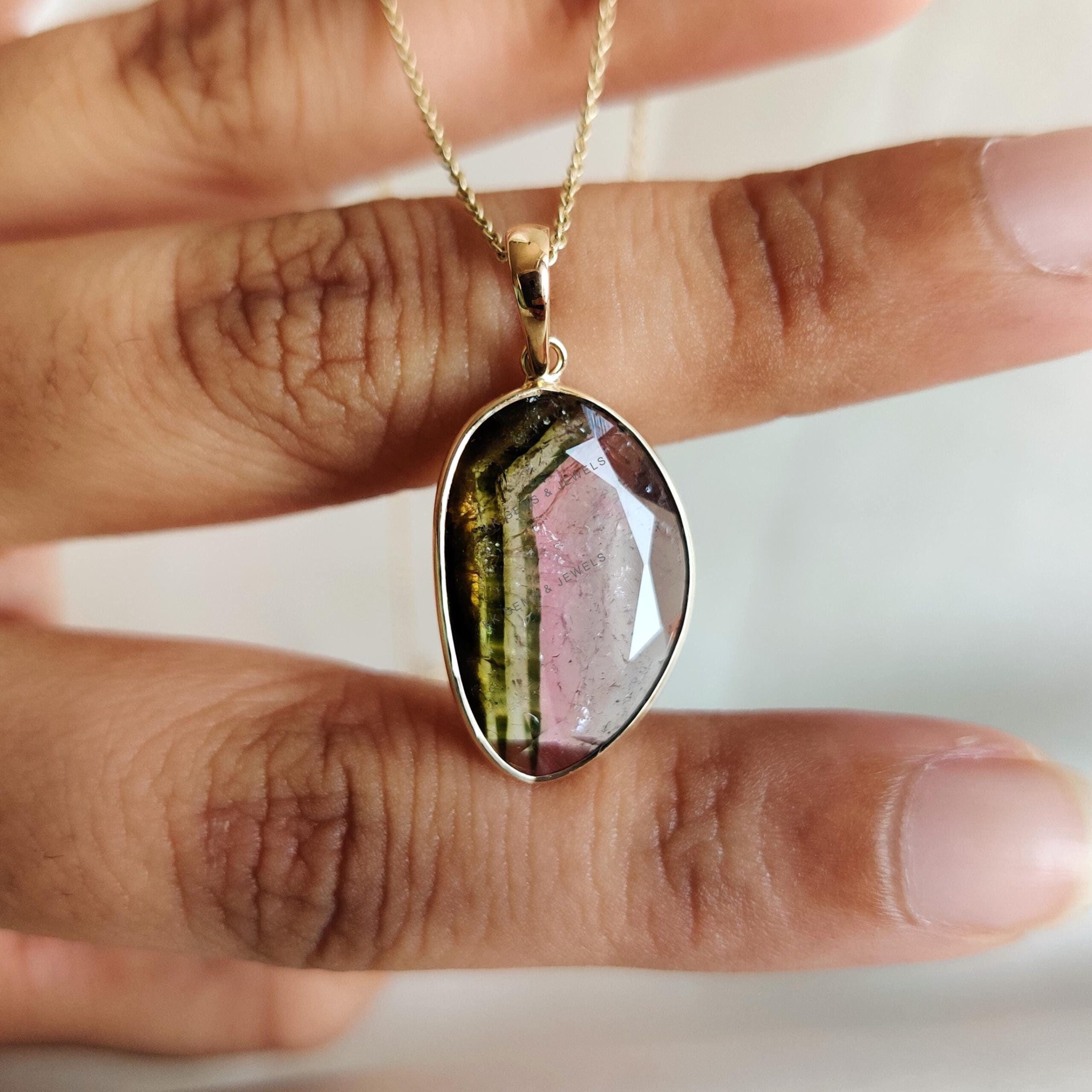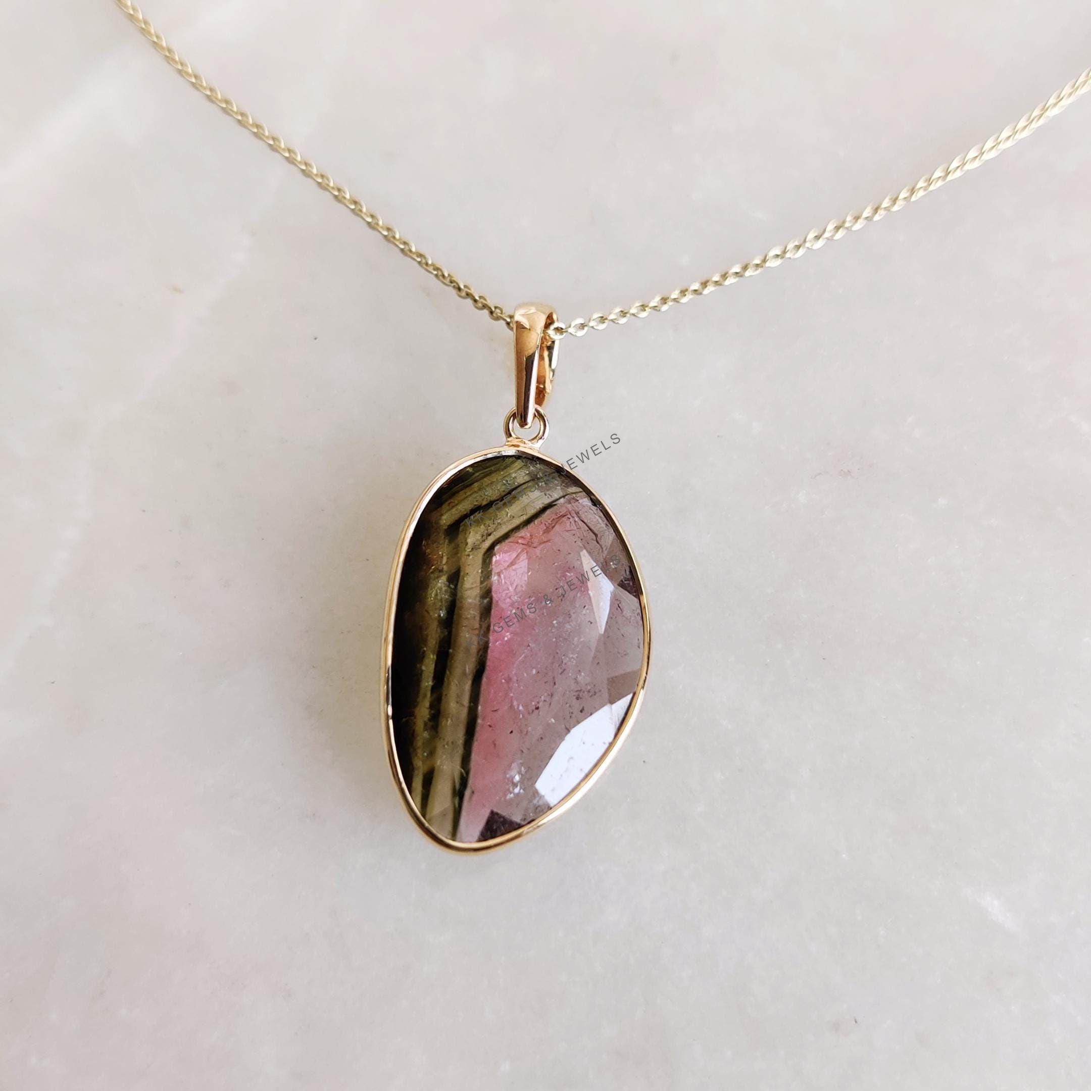 Fancy Cut Natural Watermelon Tourmaline Birthstone Pendant Set in 14K Solid Gold