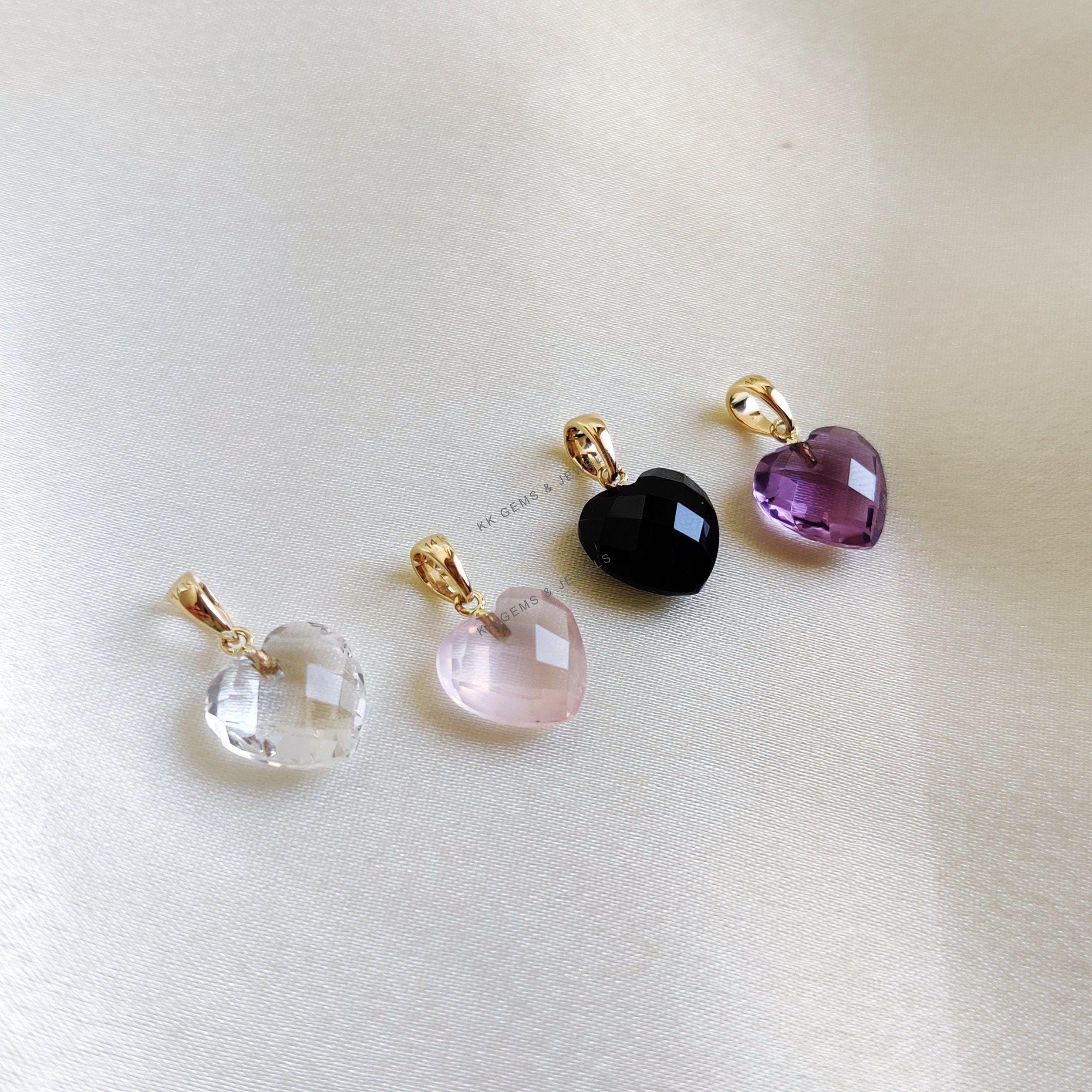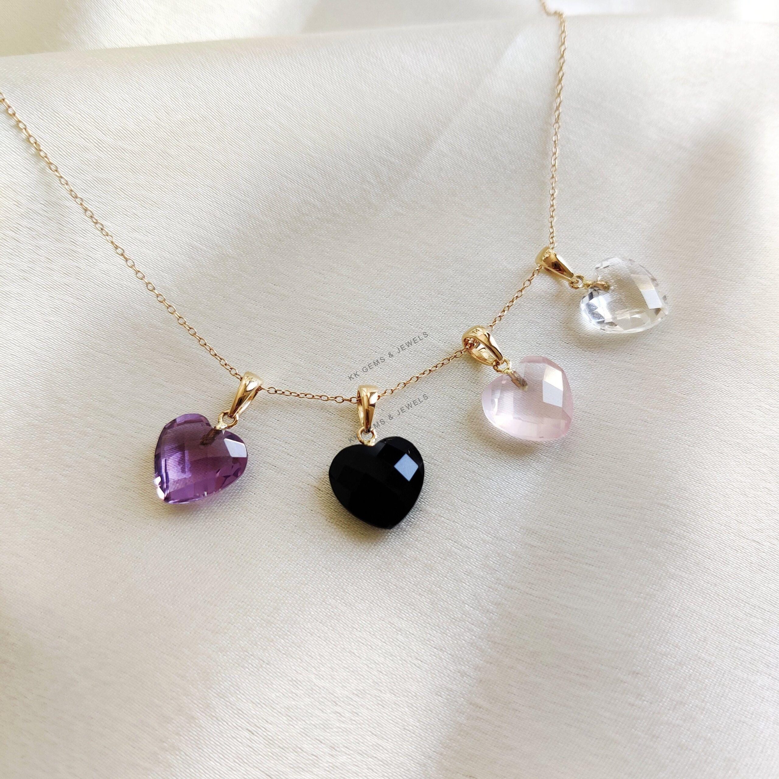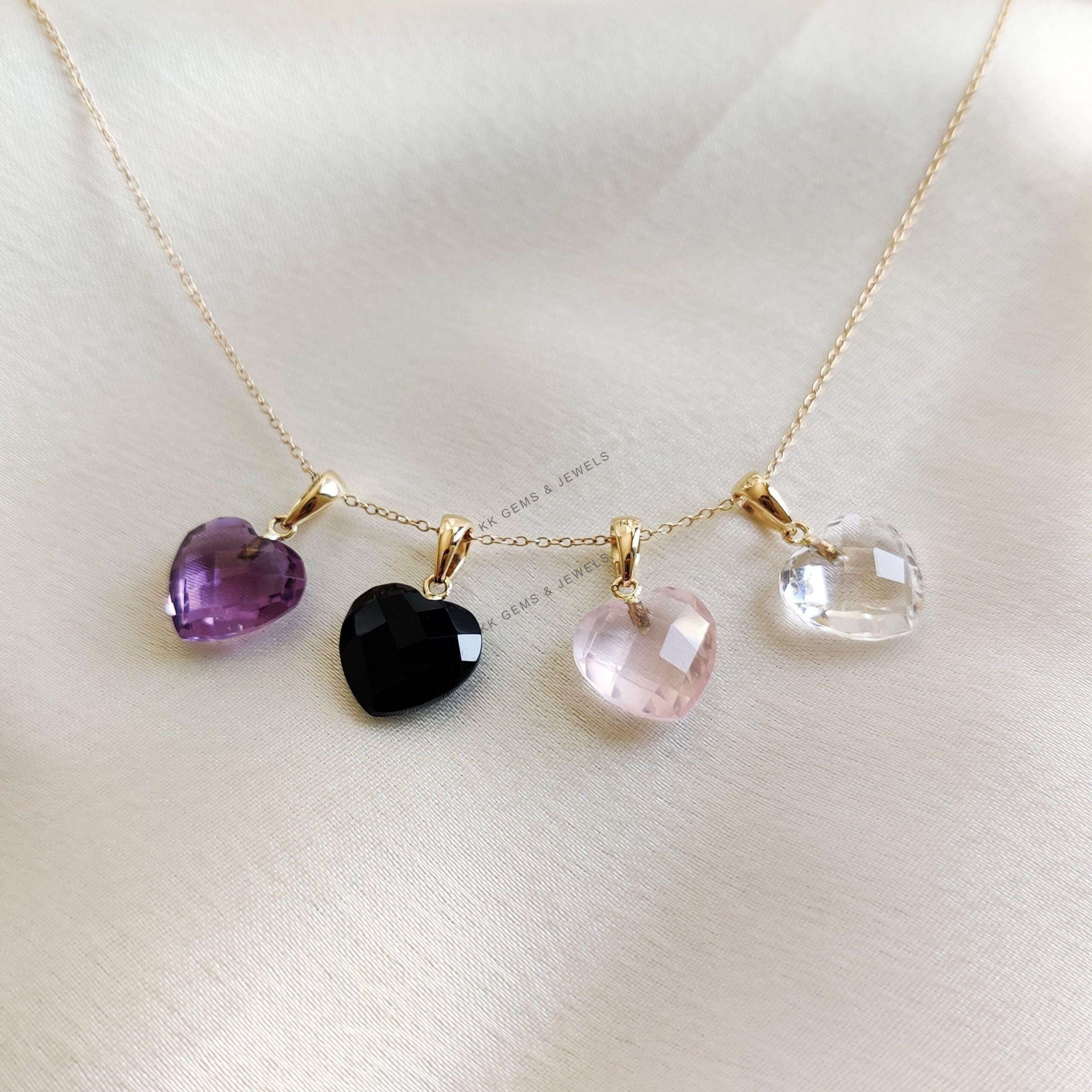 These dainty natural gemstone pendants in heart shape are a perfect addition to your necklace stack. Set in 14k Solid Yellow Gold, these charm pendants are unique and minimalist. ITEM DETAILS • GEM 1. Purple Amethyst: 4.75 cts 2. Rose…