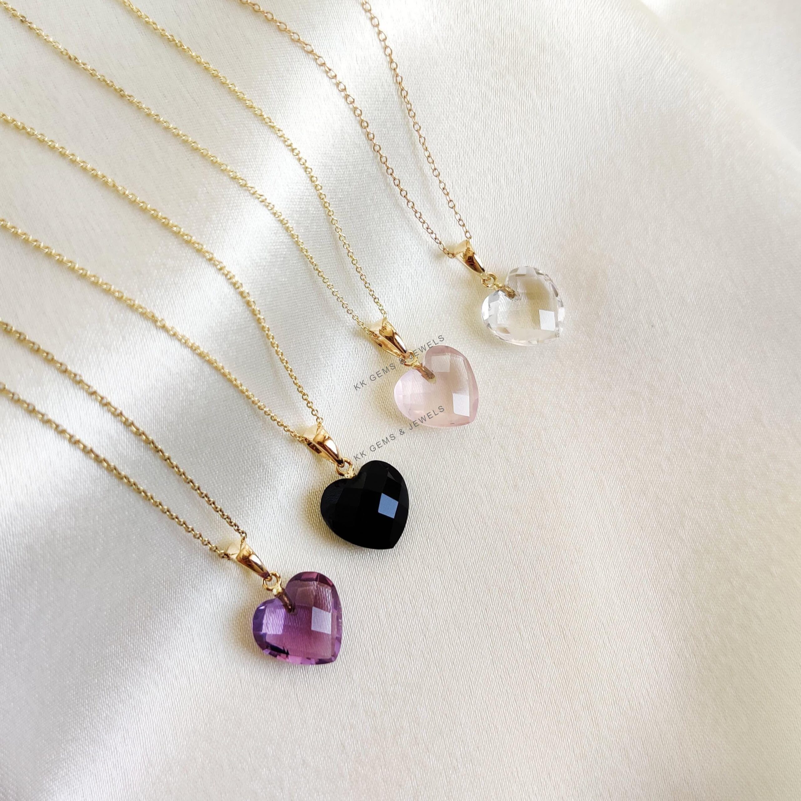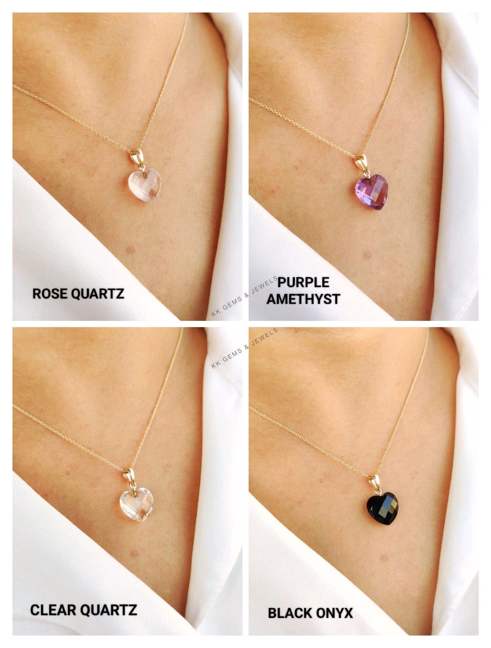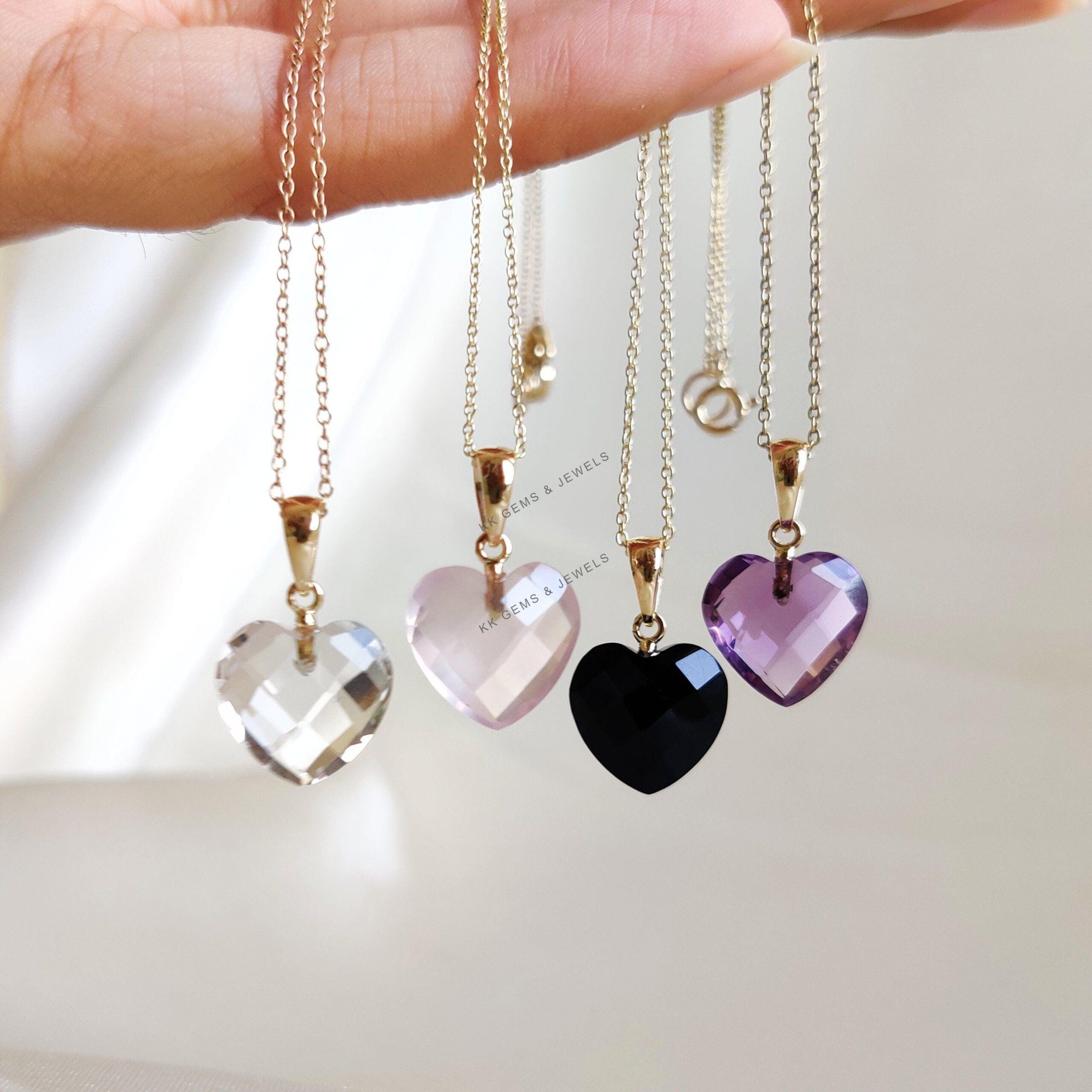 These dainty natural gemstone pendants in heart shape are a perfect addition to your necklace stack. Set in 14k Solid Yellow Gold, these charm pendants are unique and minimalist. ITEM DETAILS • GEM 1. Purple Amethyst: 4.75 cts 2. Rose…