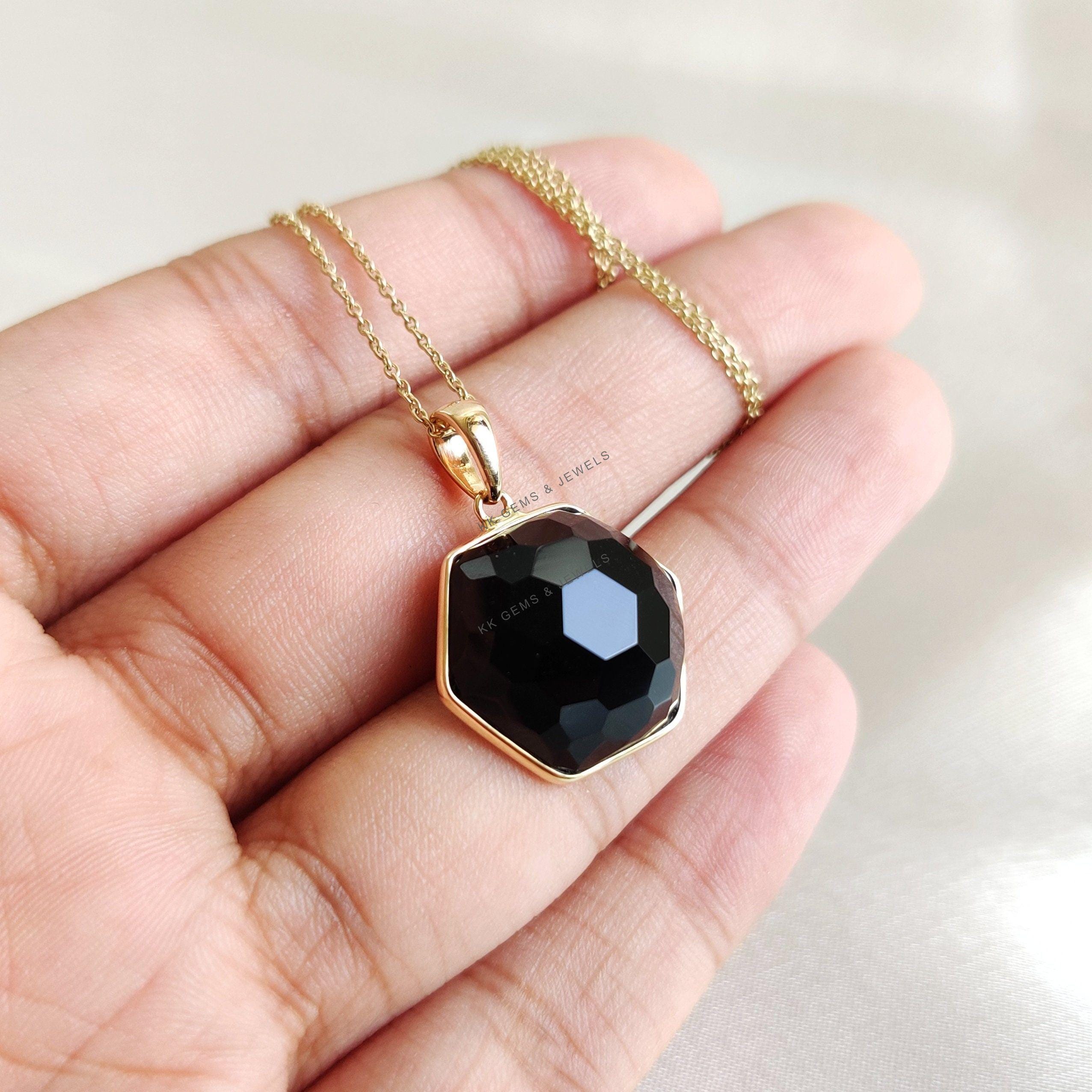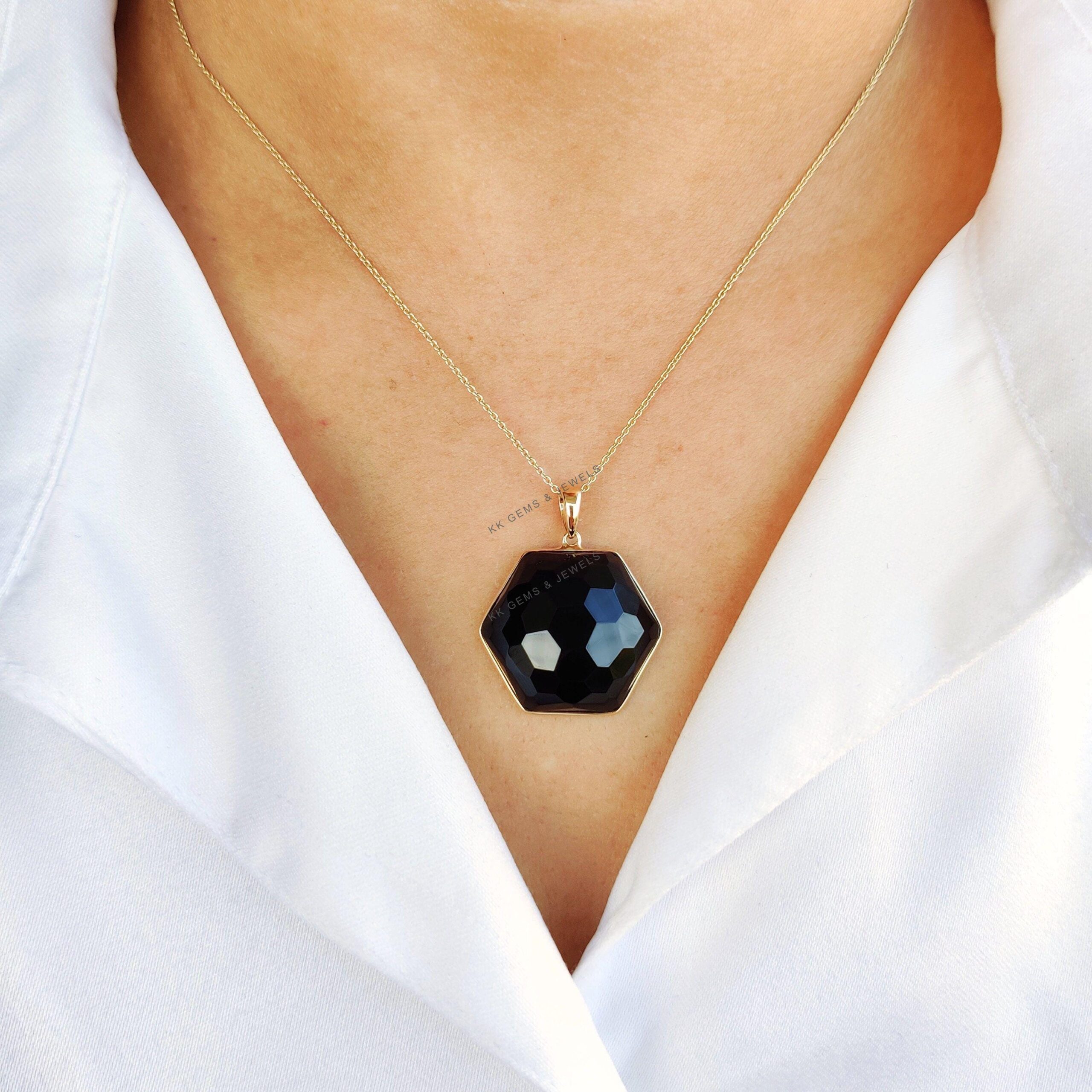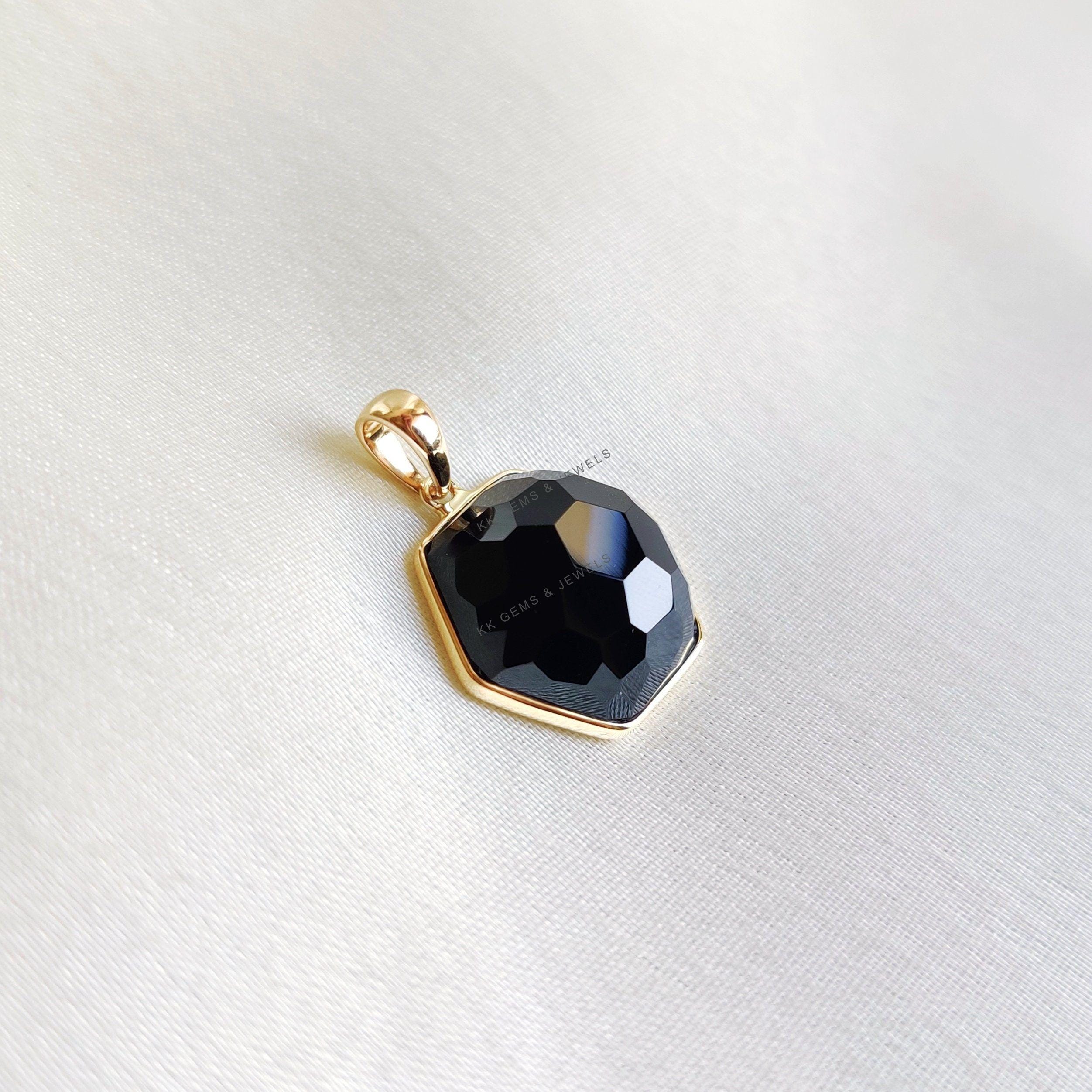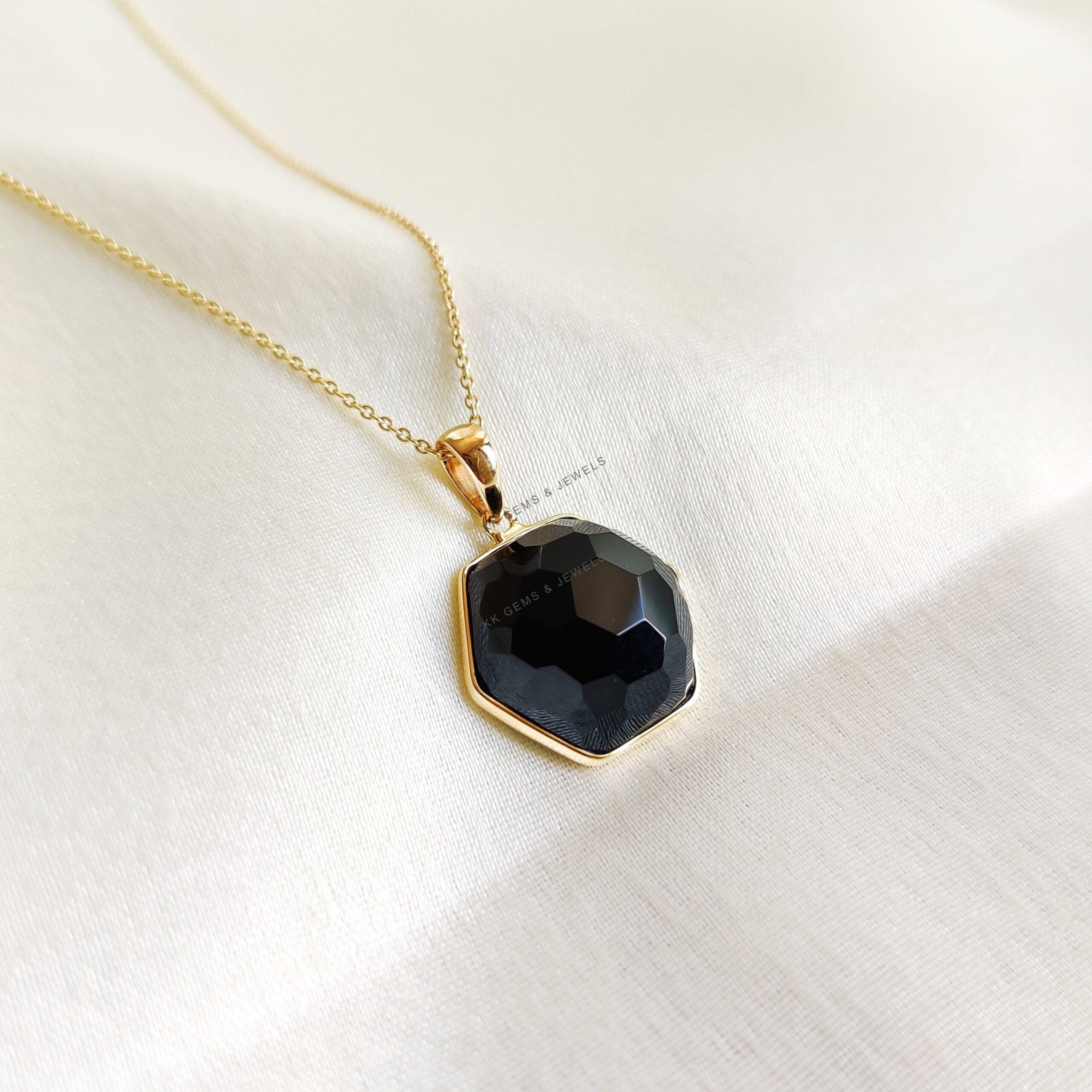 Hexagon Football Cut Natural Black Onyx Pendant Set in 14K Solid Yellow Gold, December Birthstone Jewelry