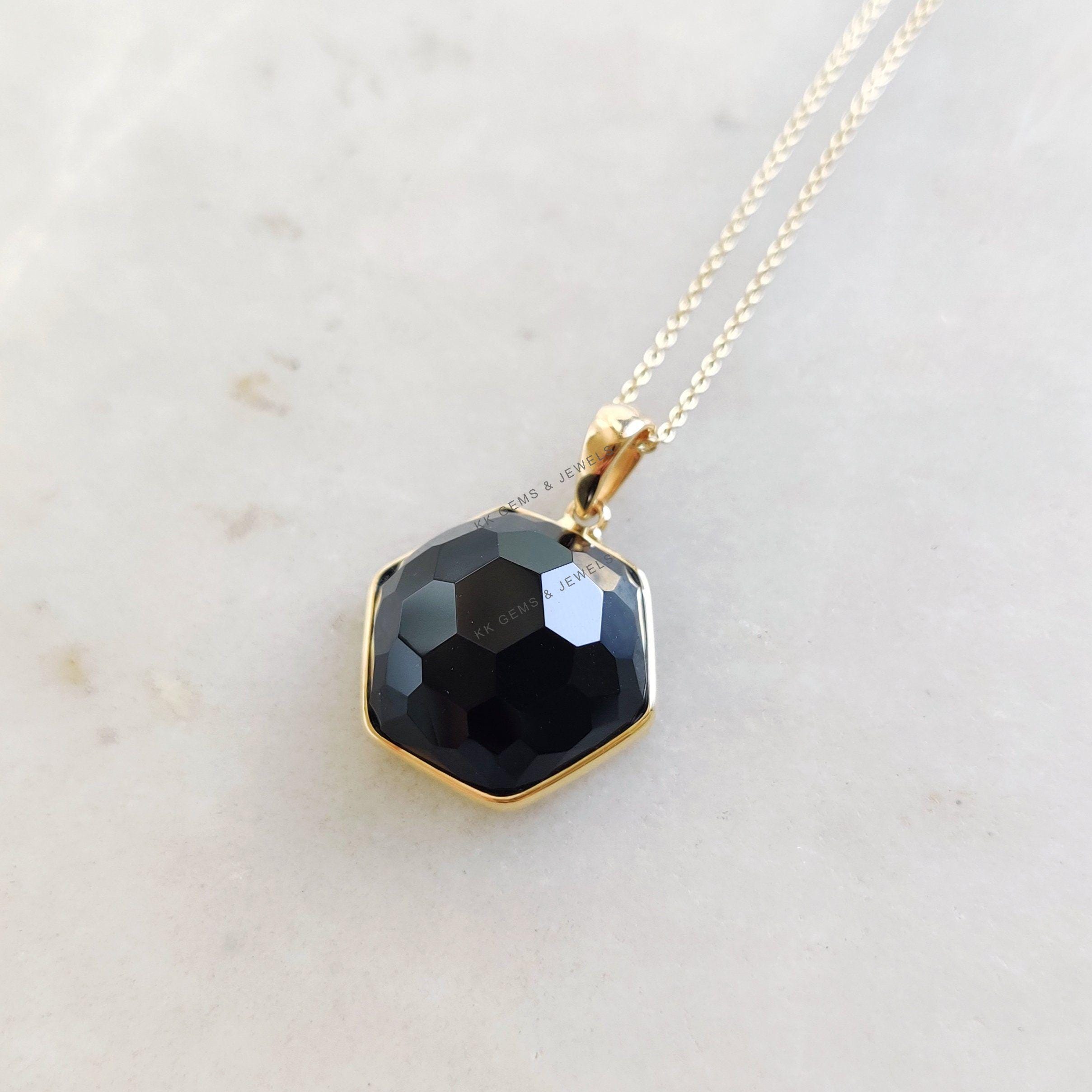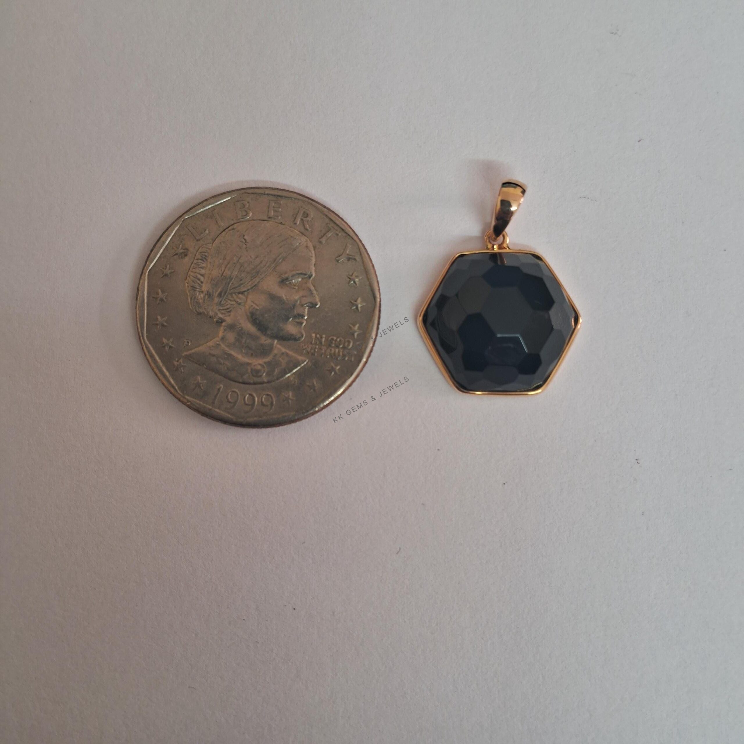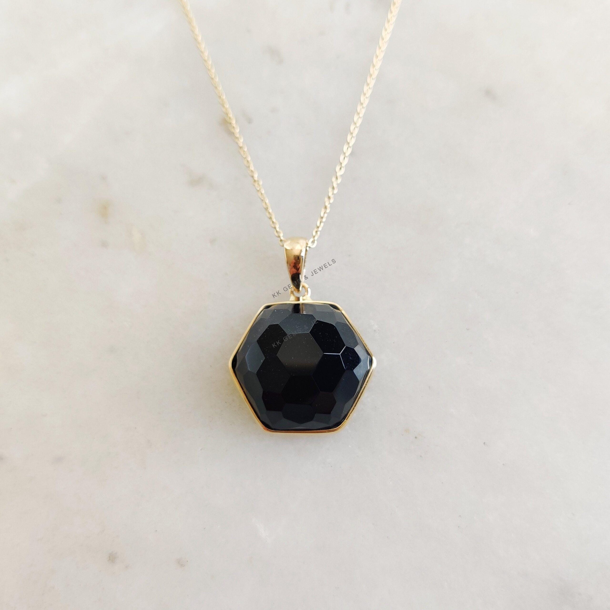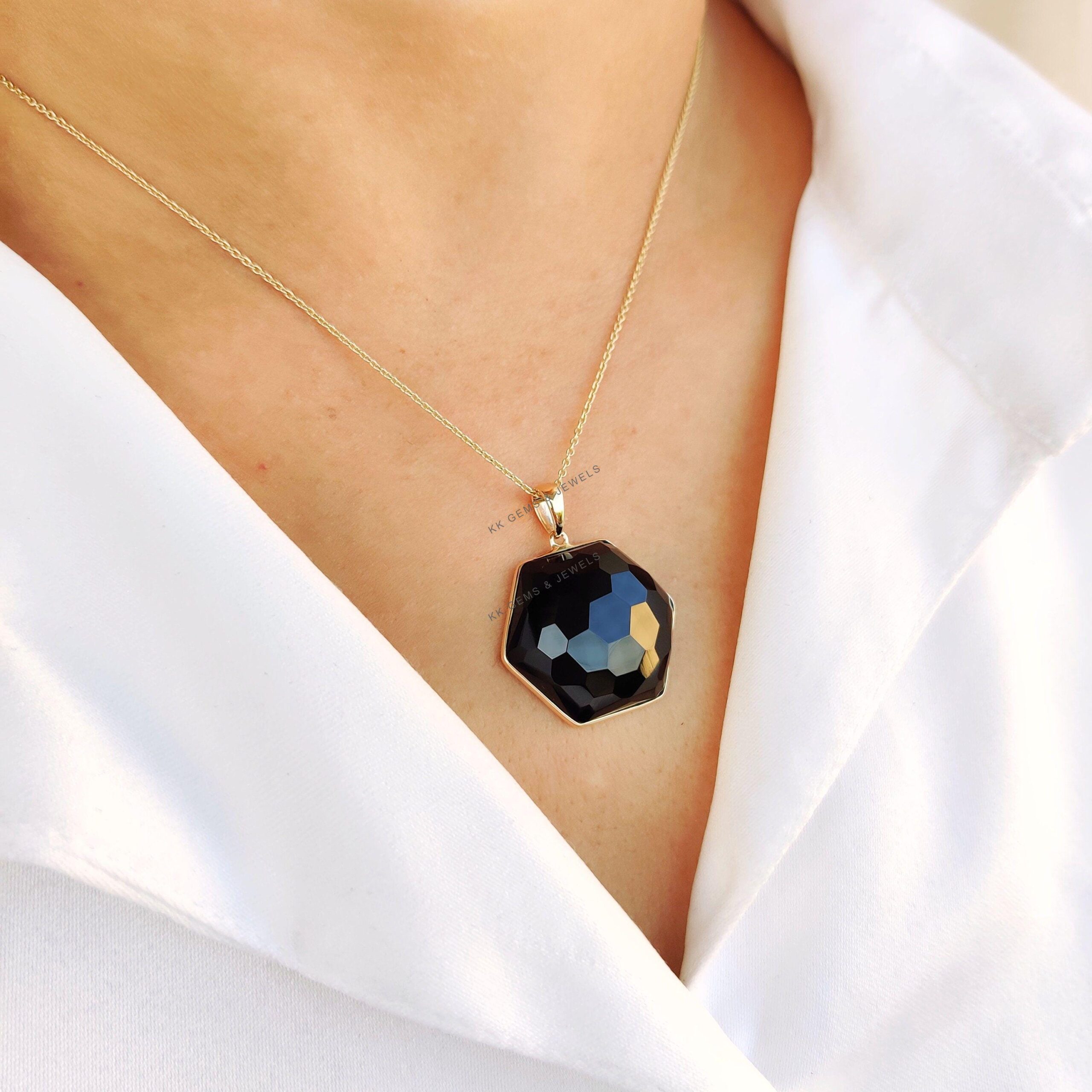 Hexagon Football Cut Natural Black Onyx Pendant Set in 14K Solid Yellow Gold, December Birthstone Jewelry