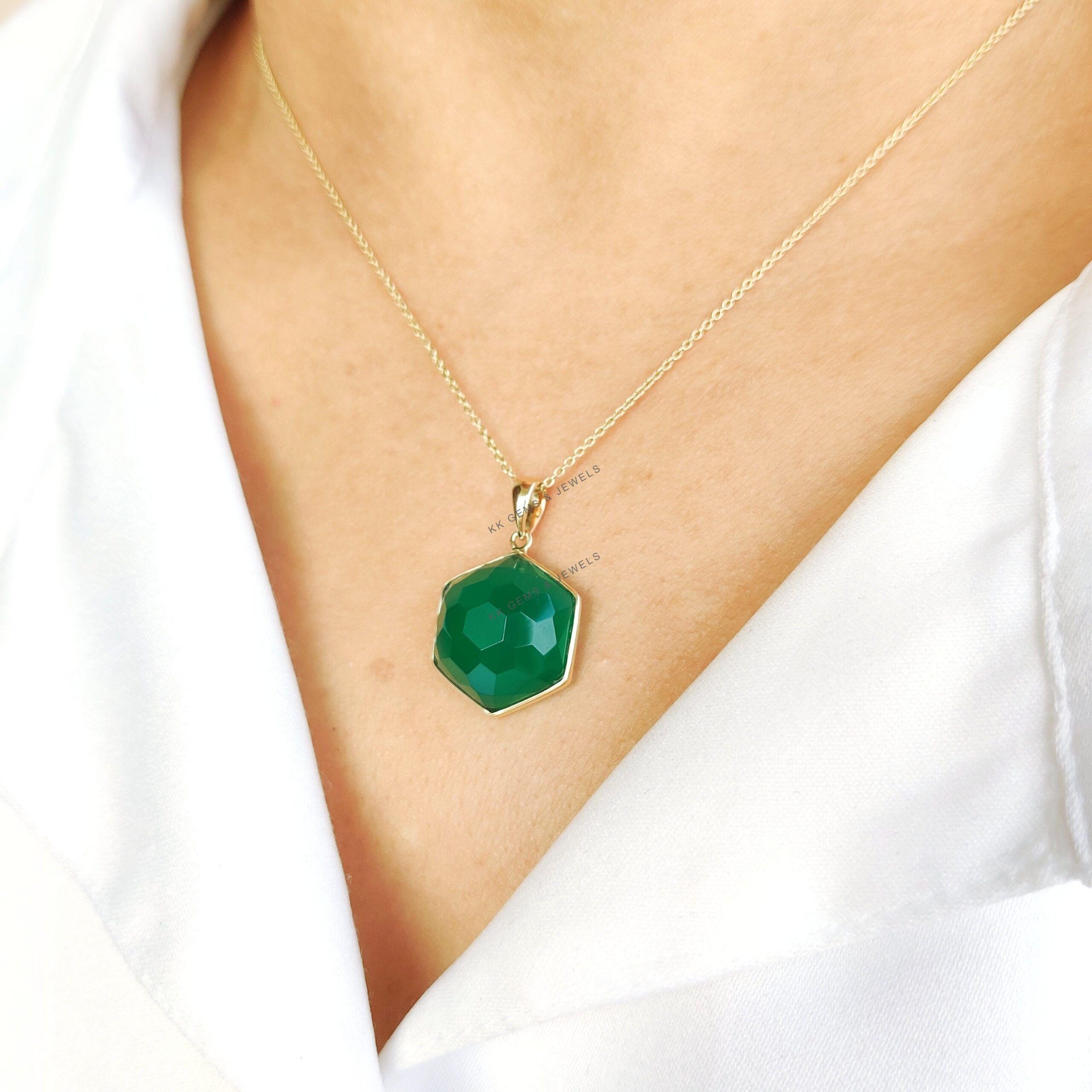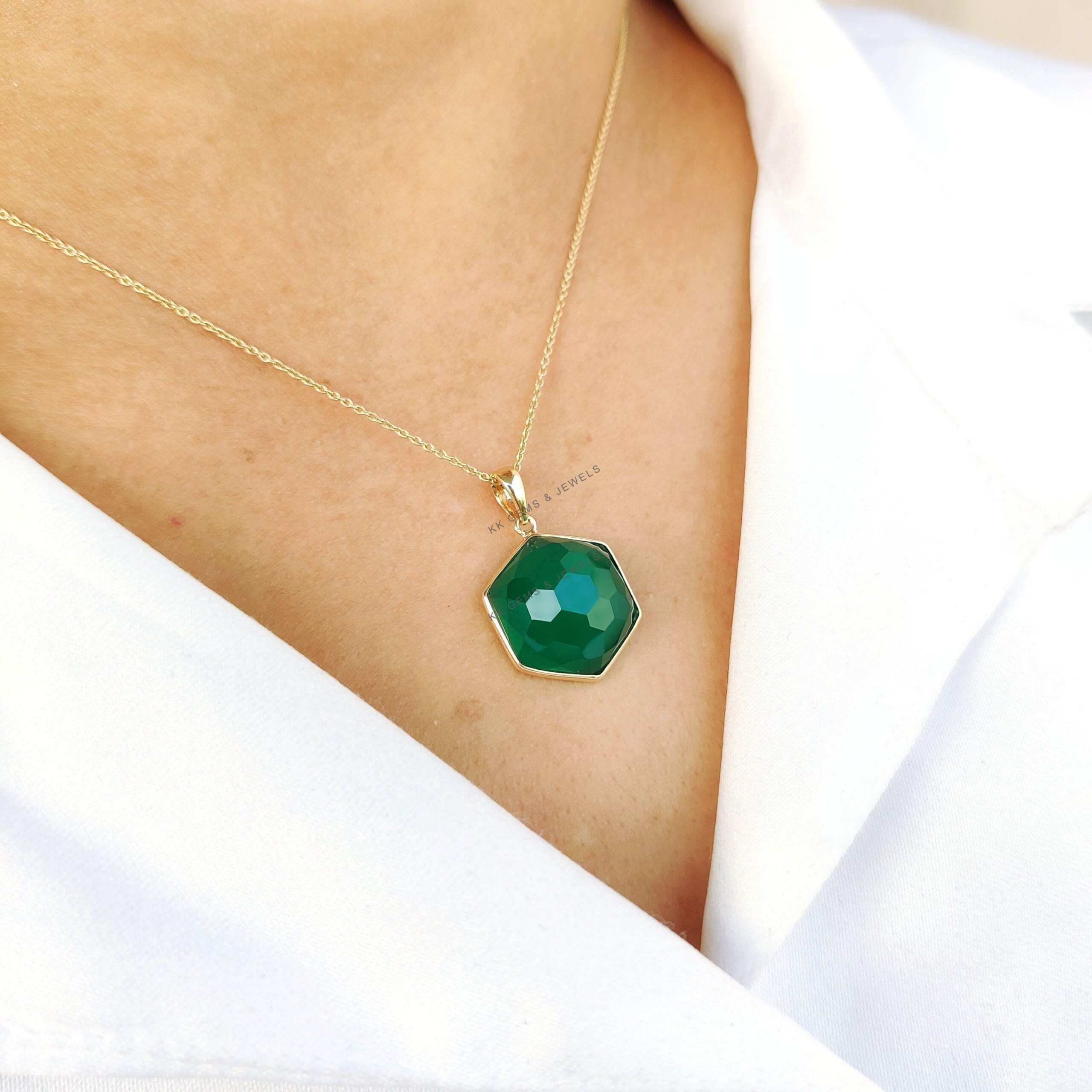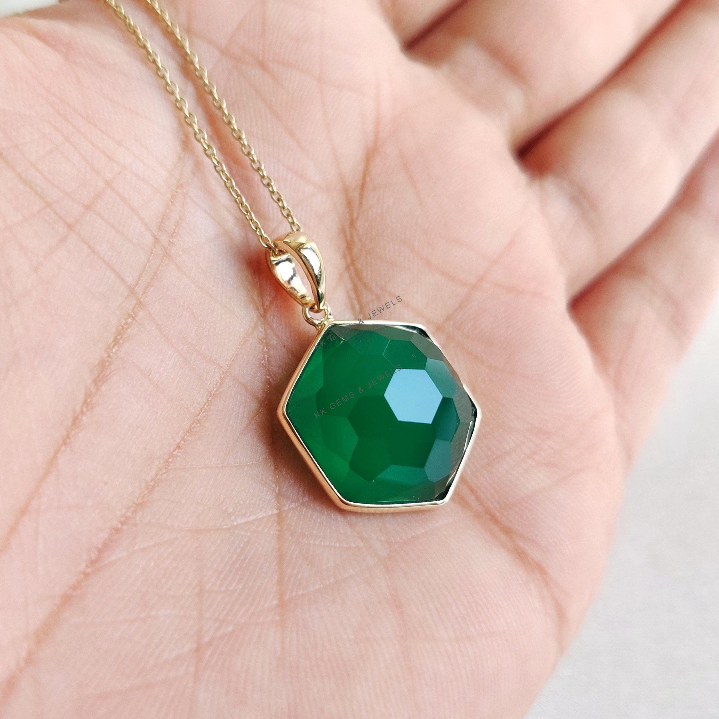 This stunning pendant is set in 14K Solid Yellow Gold with Natural Green Onyx in Drill setting with utmost precision. It is an unique gemstone pendant for nearly every occasion and is completely hassle-free jewelry. ✓ ABOUT GEMSTONE: Green onyx…