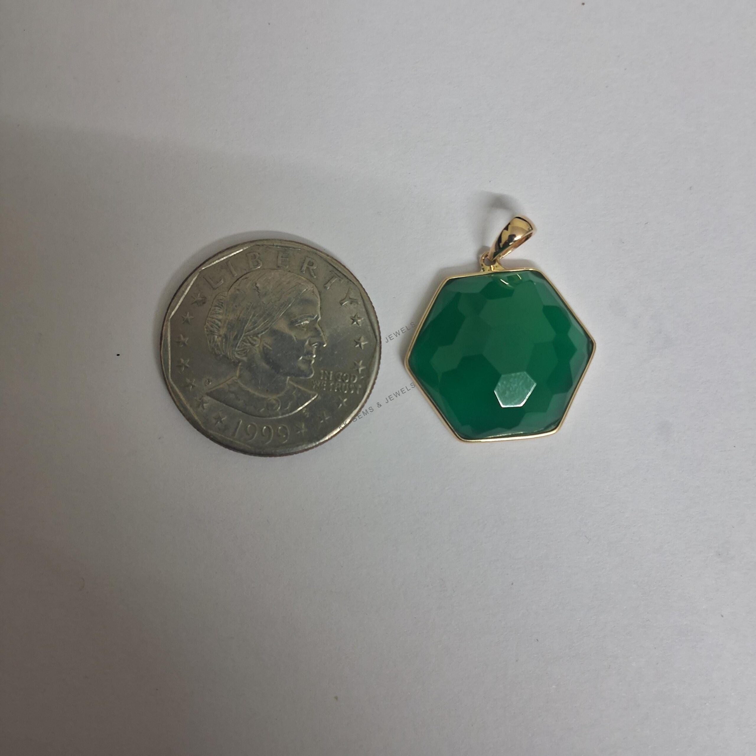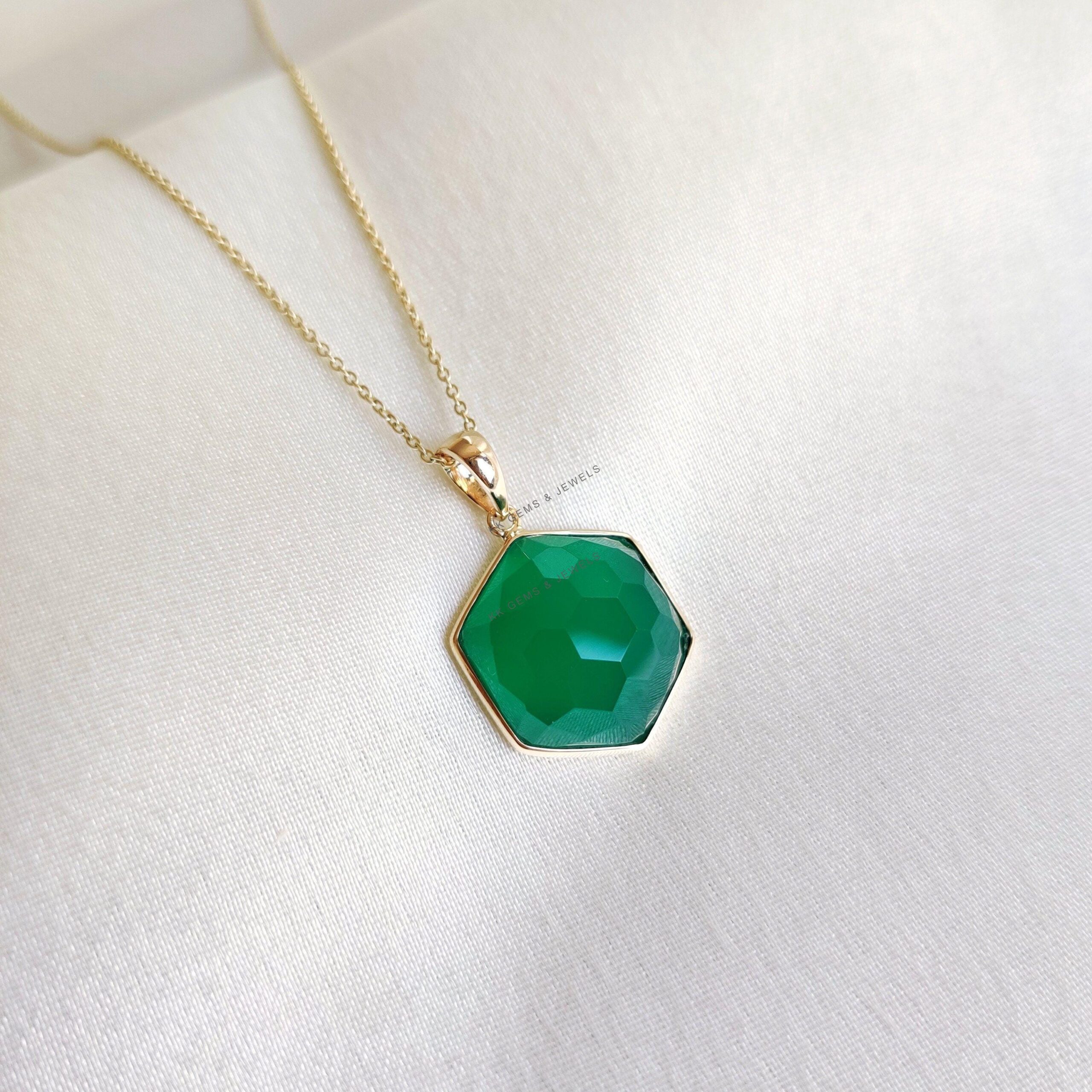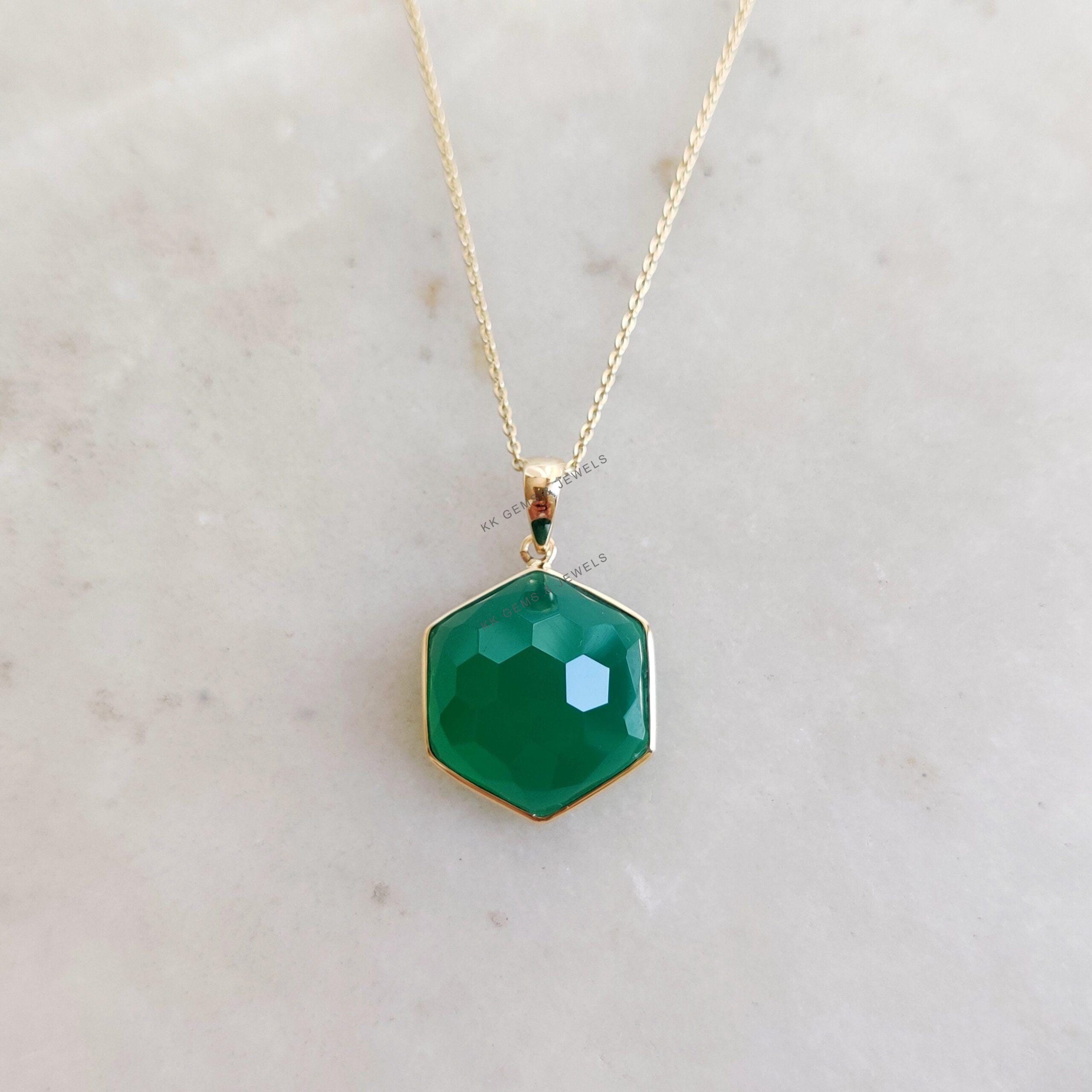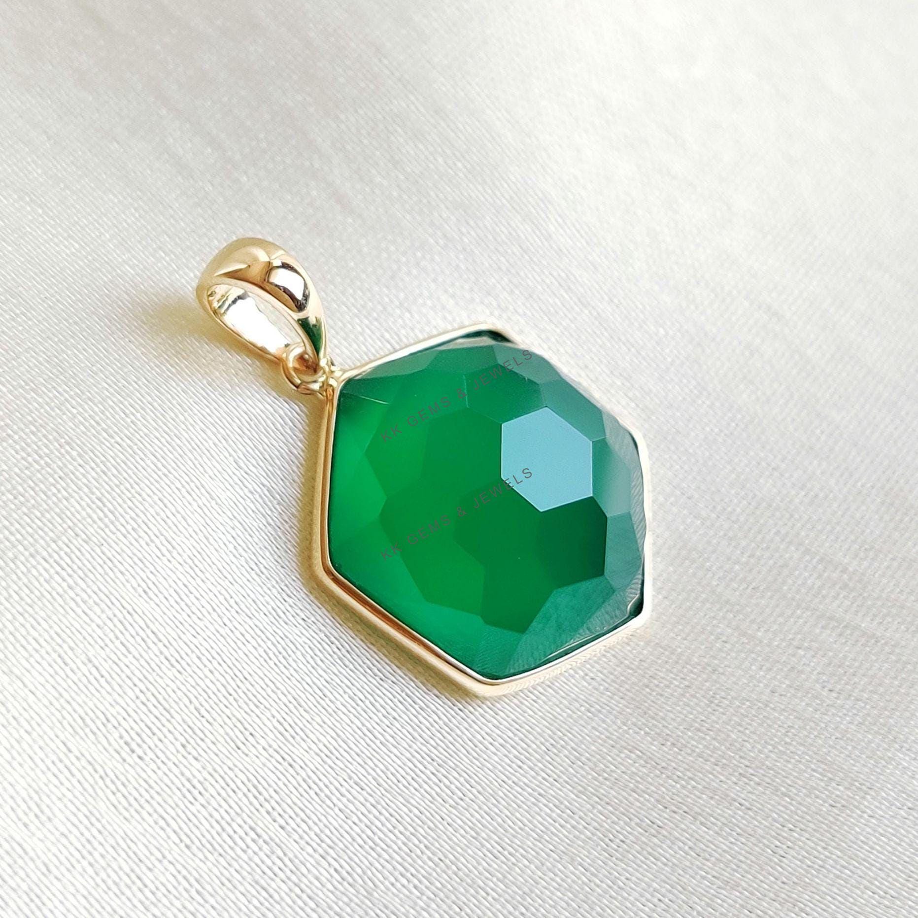 This stunning pendant is set in 14K Solid Yellow Gold with Natural Green Onyx in Drill setting with utmost precision. It is an unique gemstone pendant for nearly every occasion and is completely hassle-free jewelry. ✓ ABOUT GEMSTONE: Green onyx…