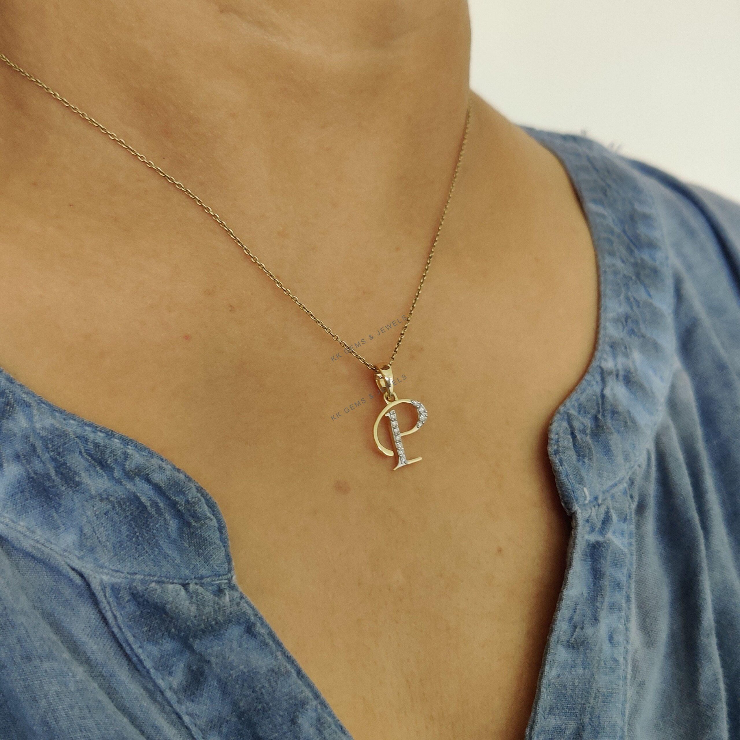 Initial P Pendant Set in 14K Solid Gold, Alphabet Charm Gemstone Pendant