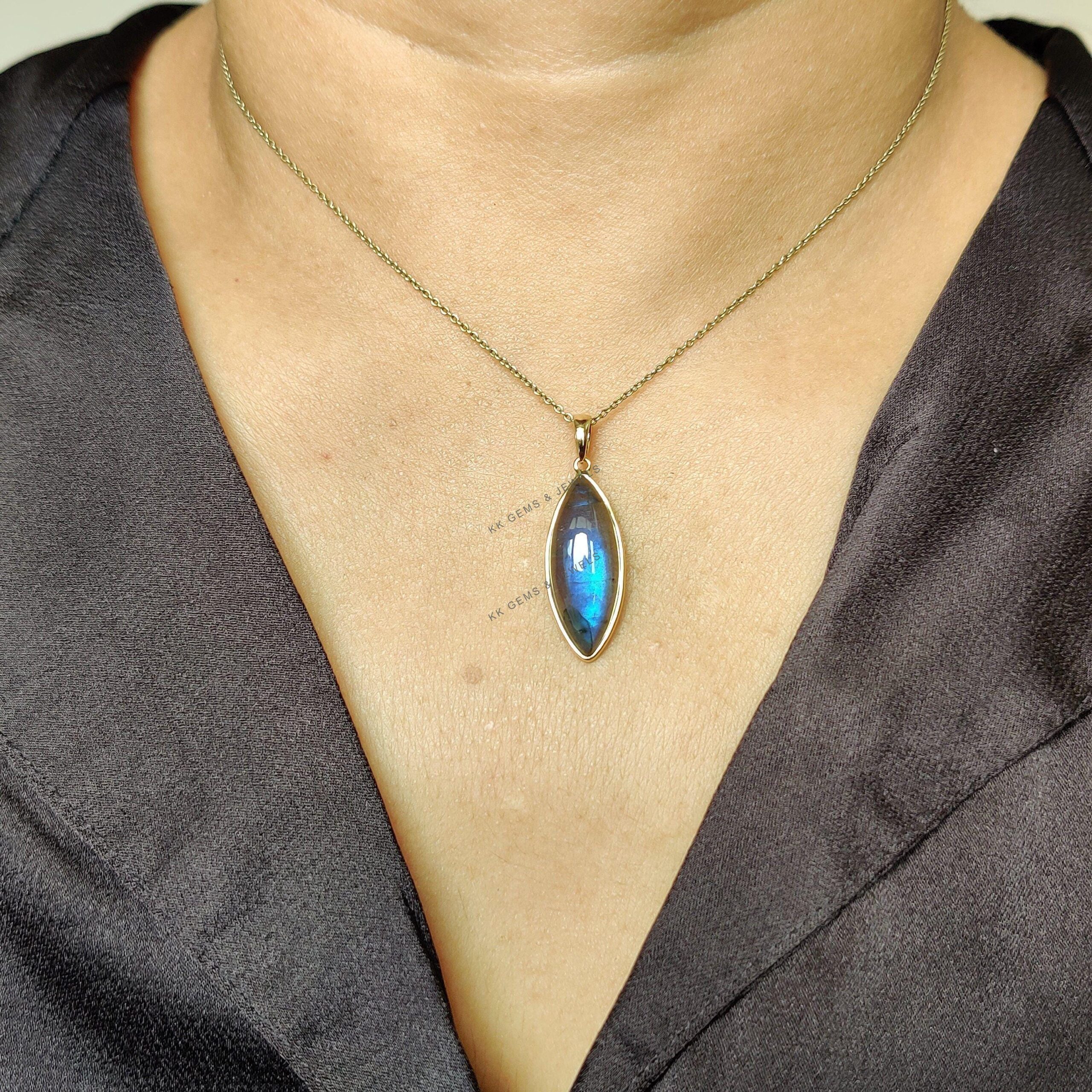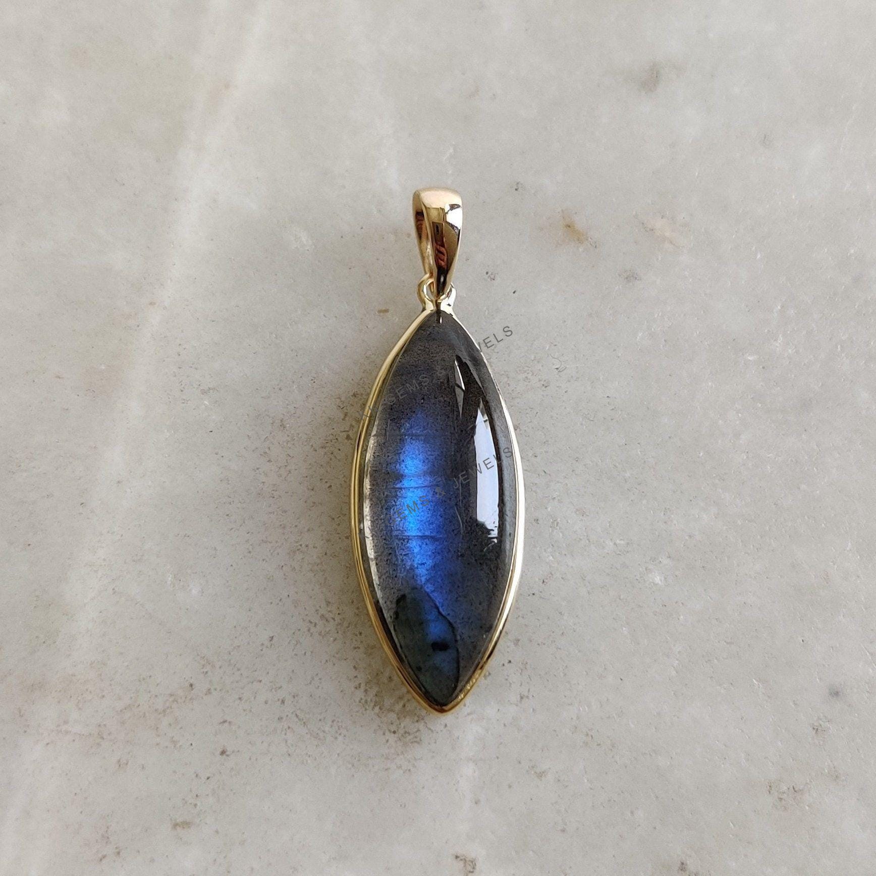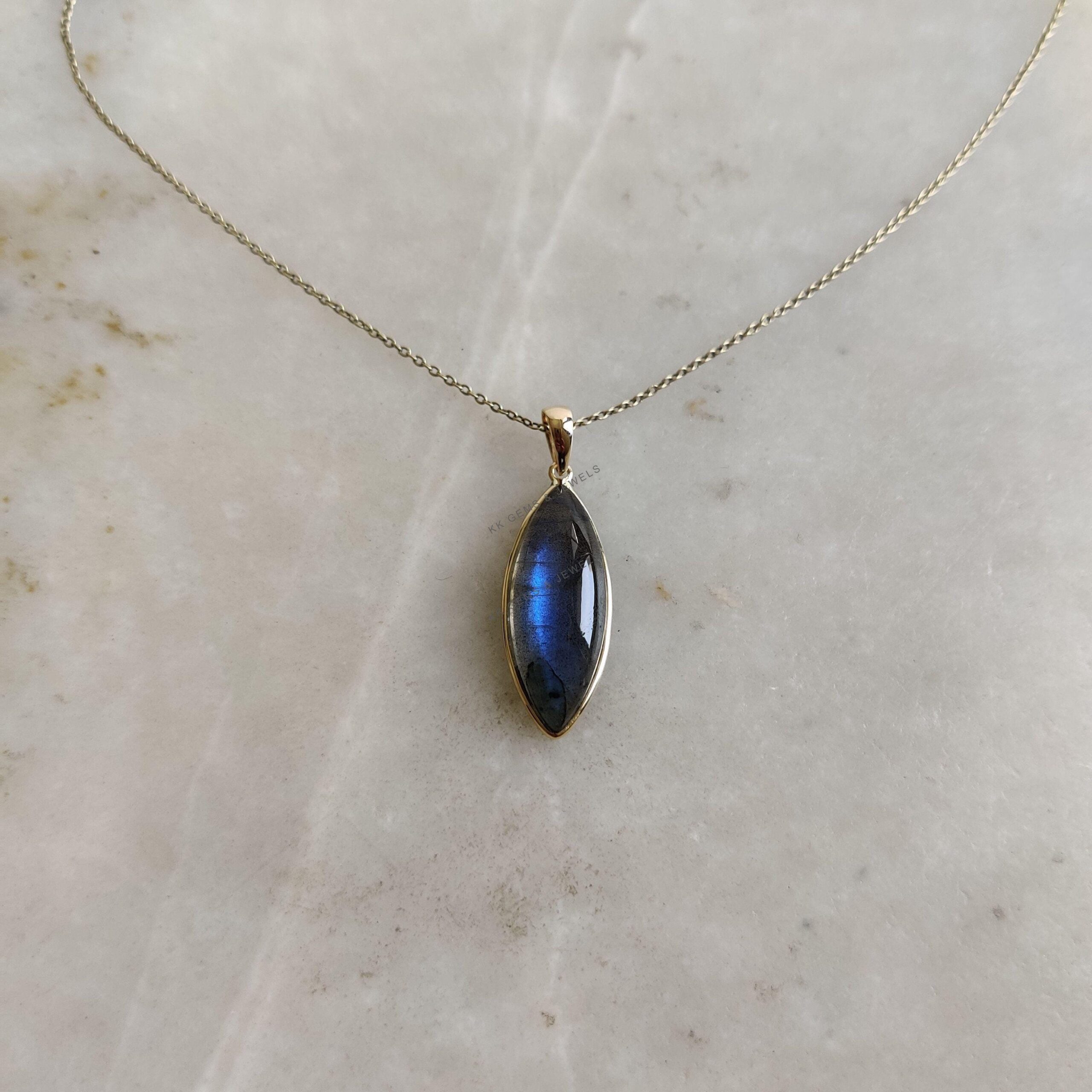 1 review for Marquise Shape Natural Labradorite Pendant, Set in 14K Solid Gold, November Birthstone Bezel