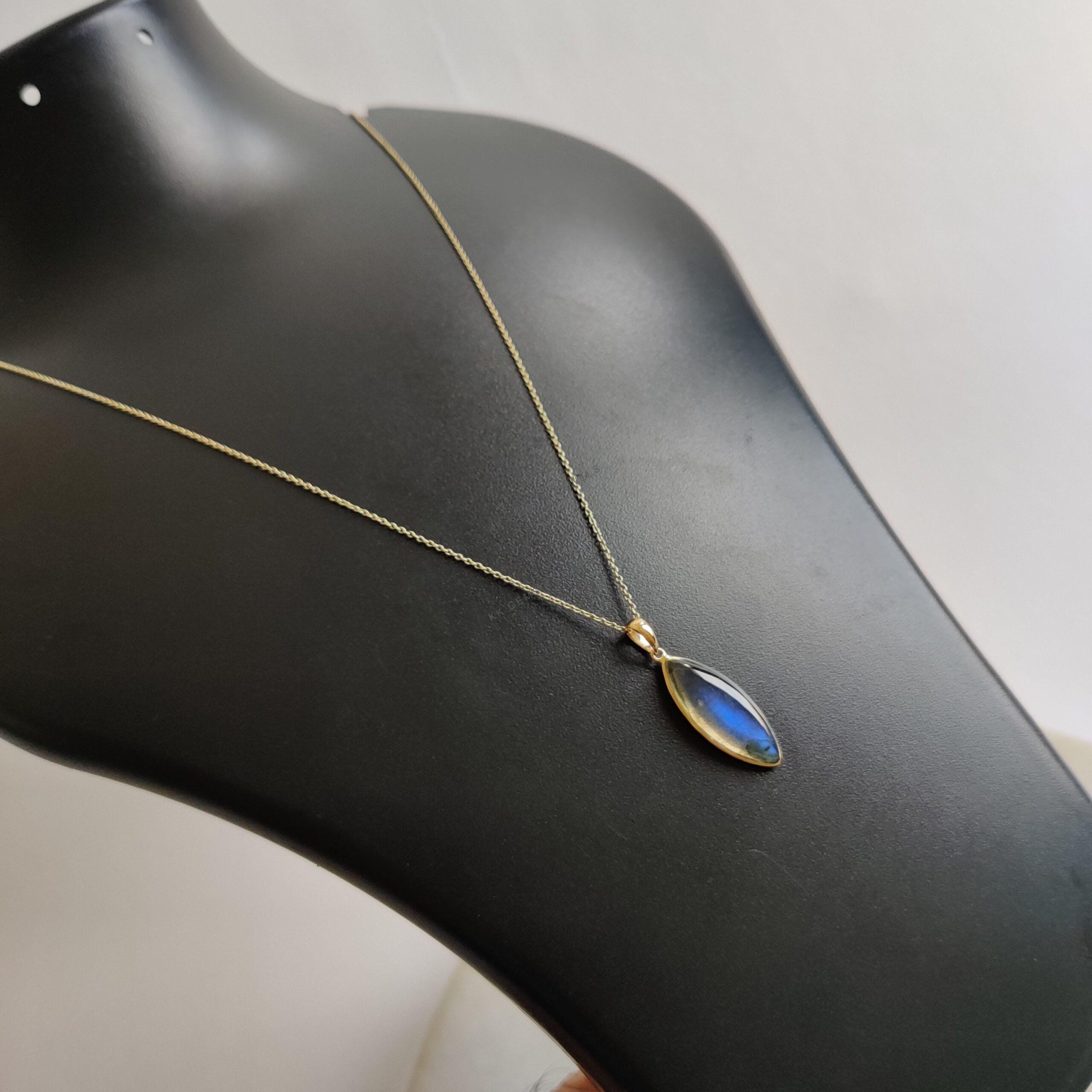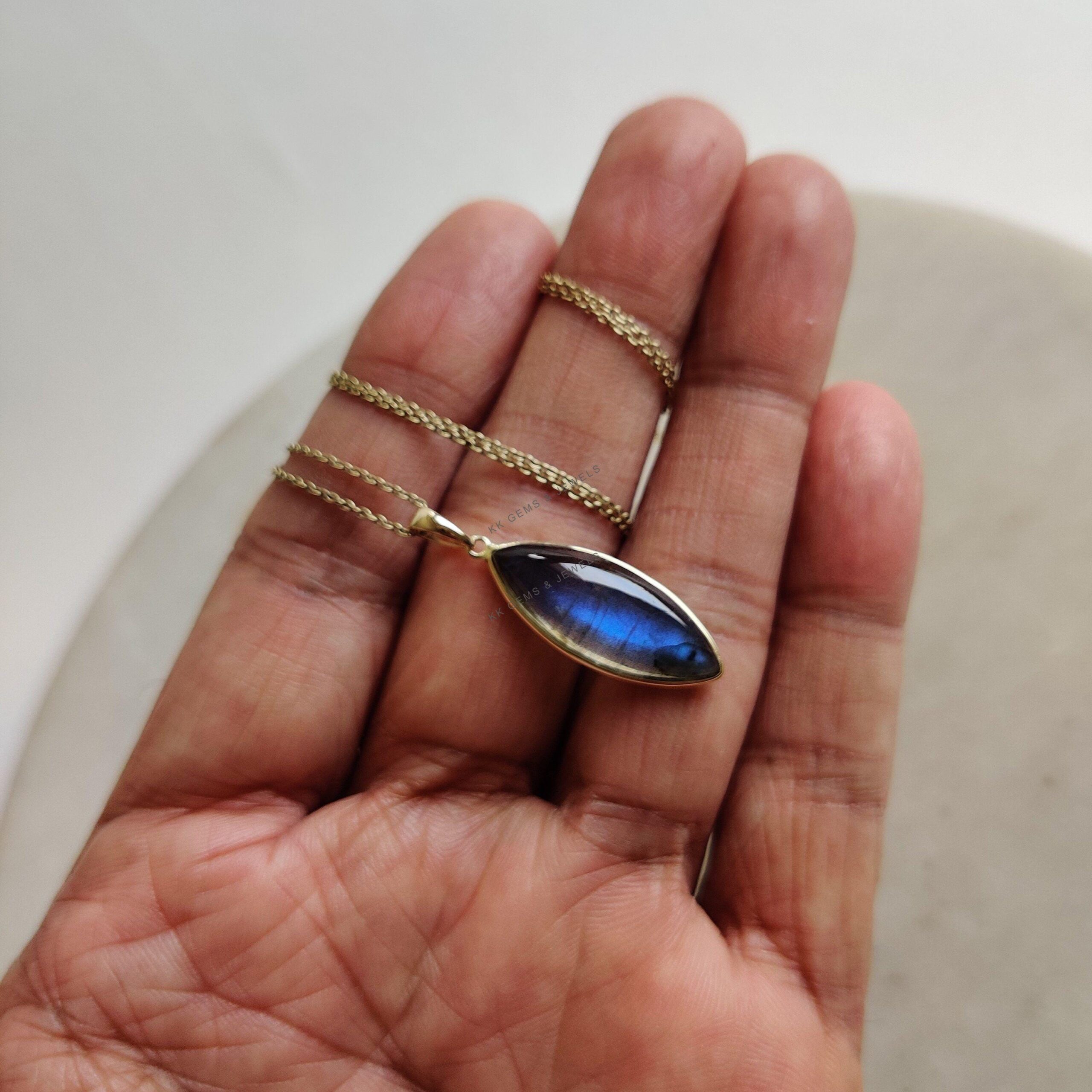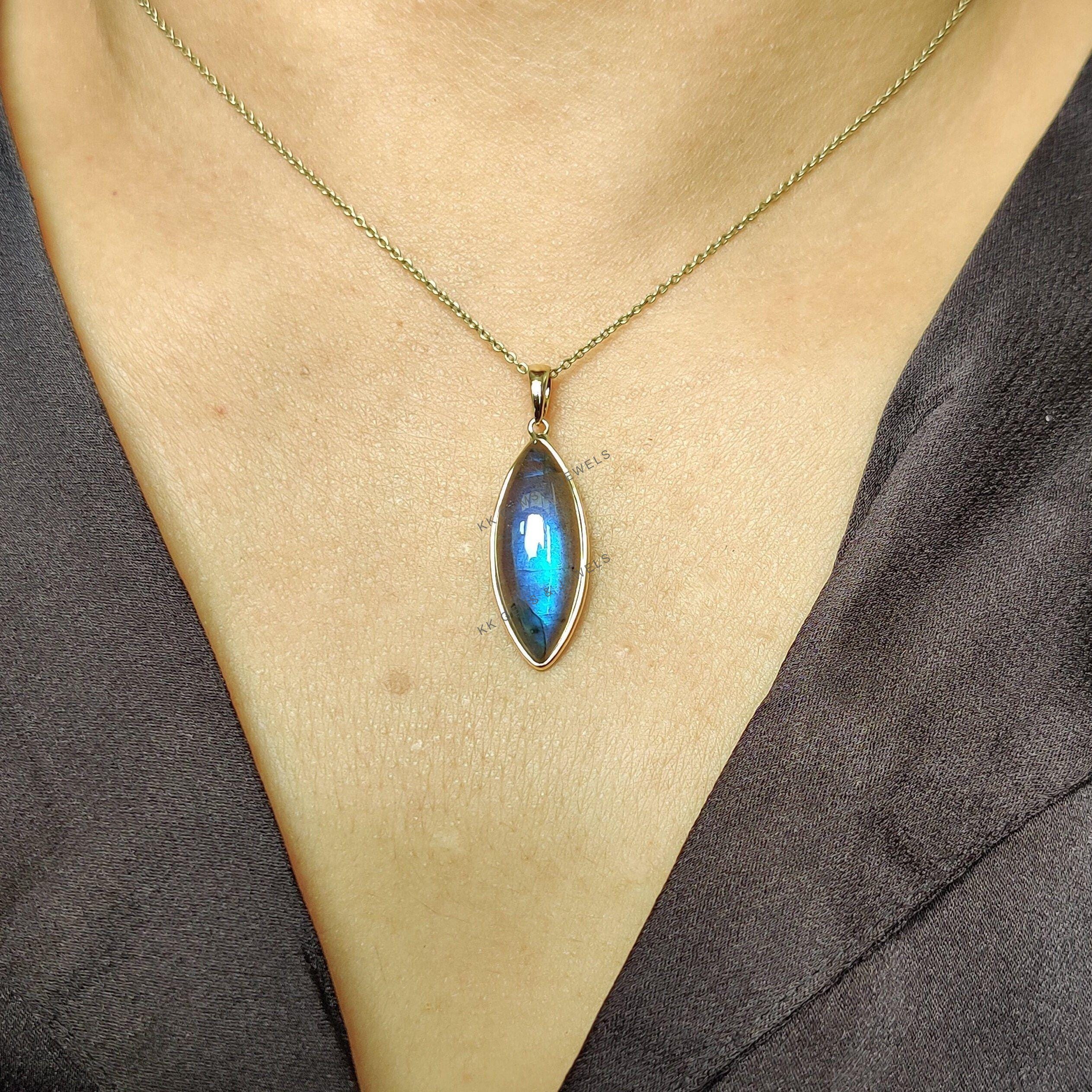 1 review for Marquise Shape Natural Labradorite Pendant, Set in 14K Solid Gold, November Birthstone Bezel