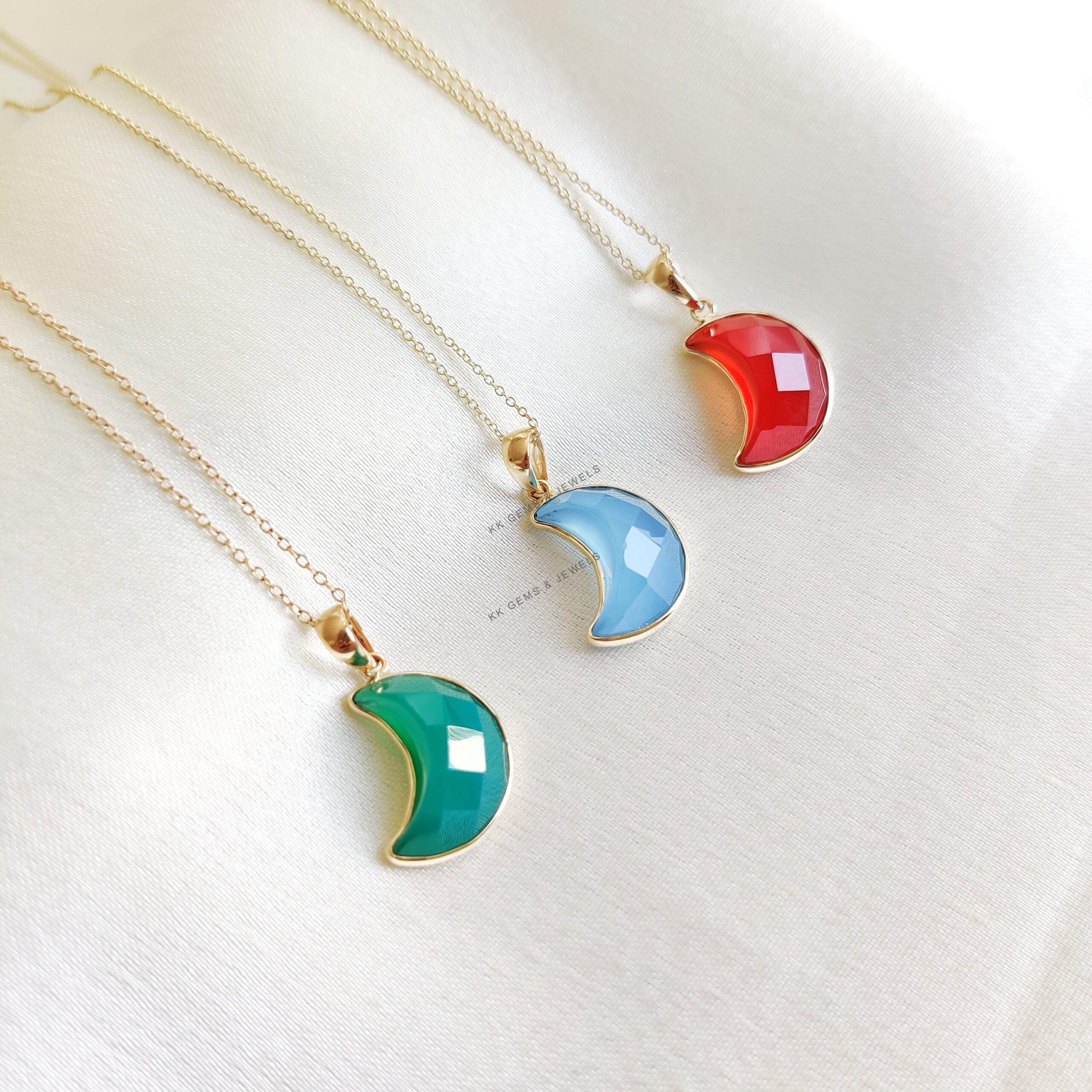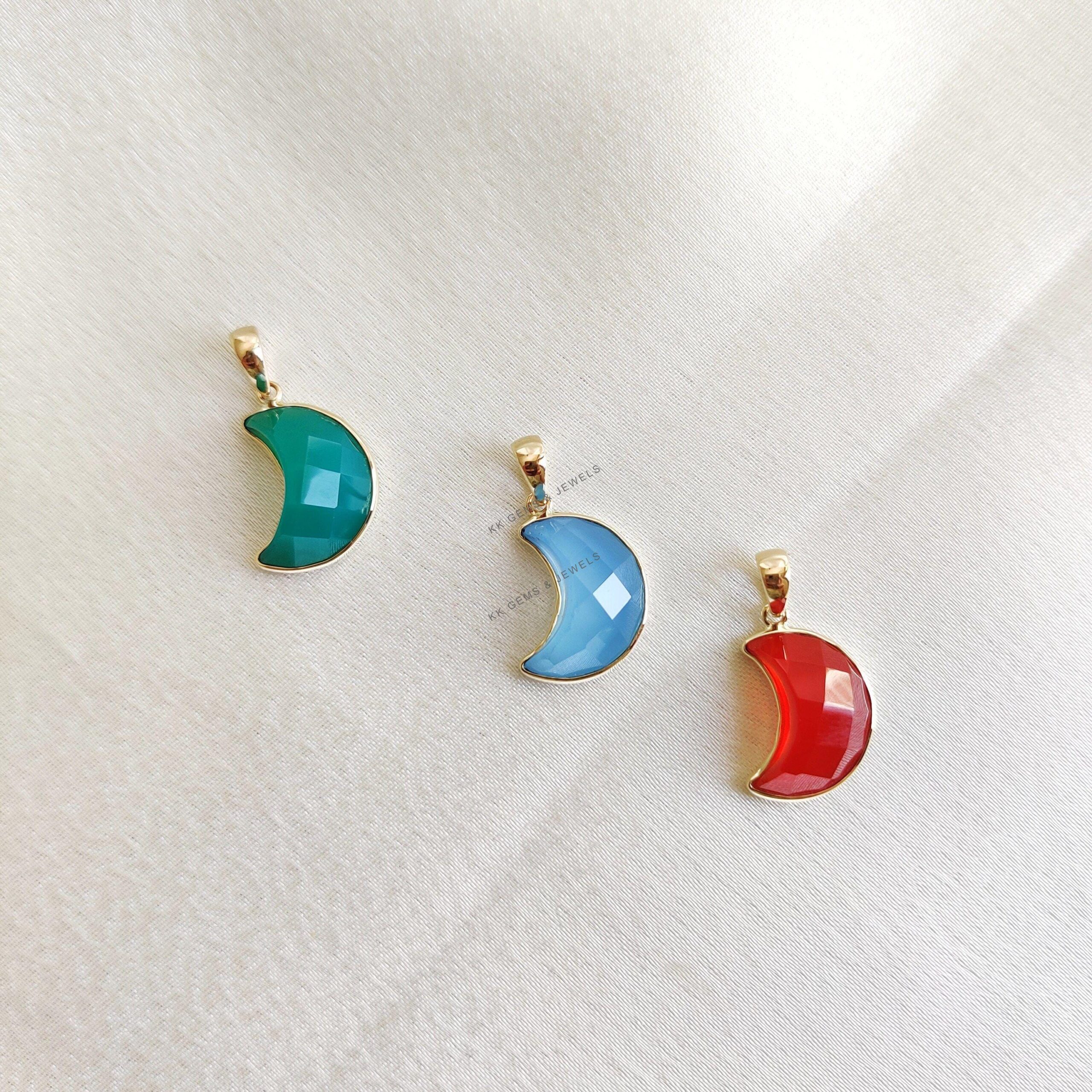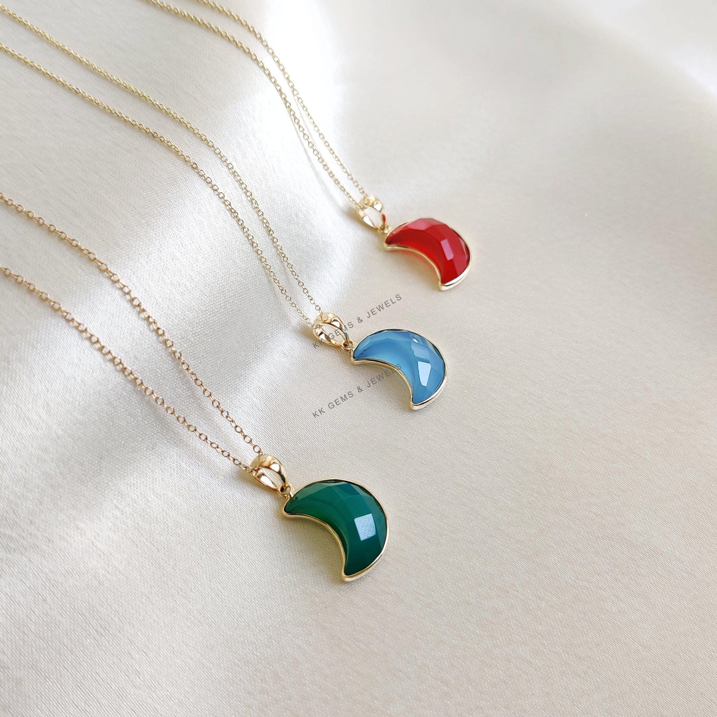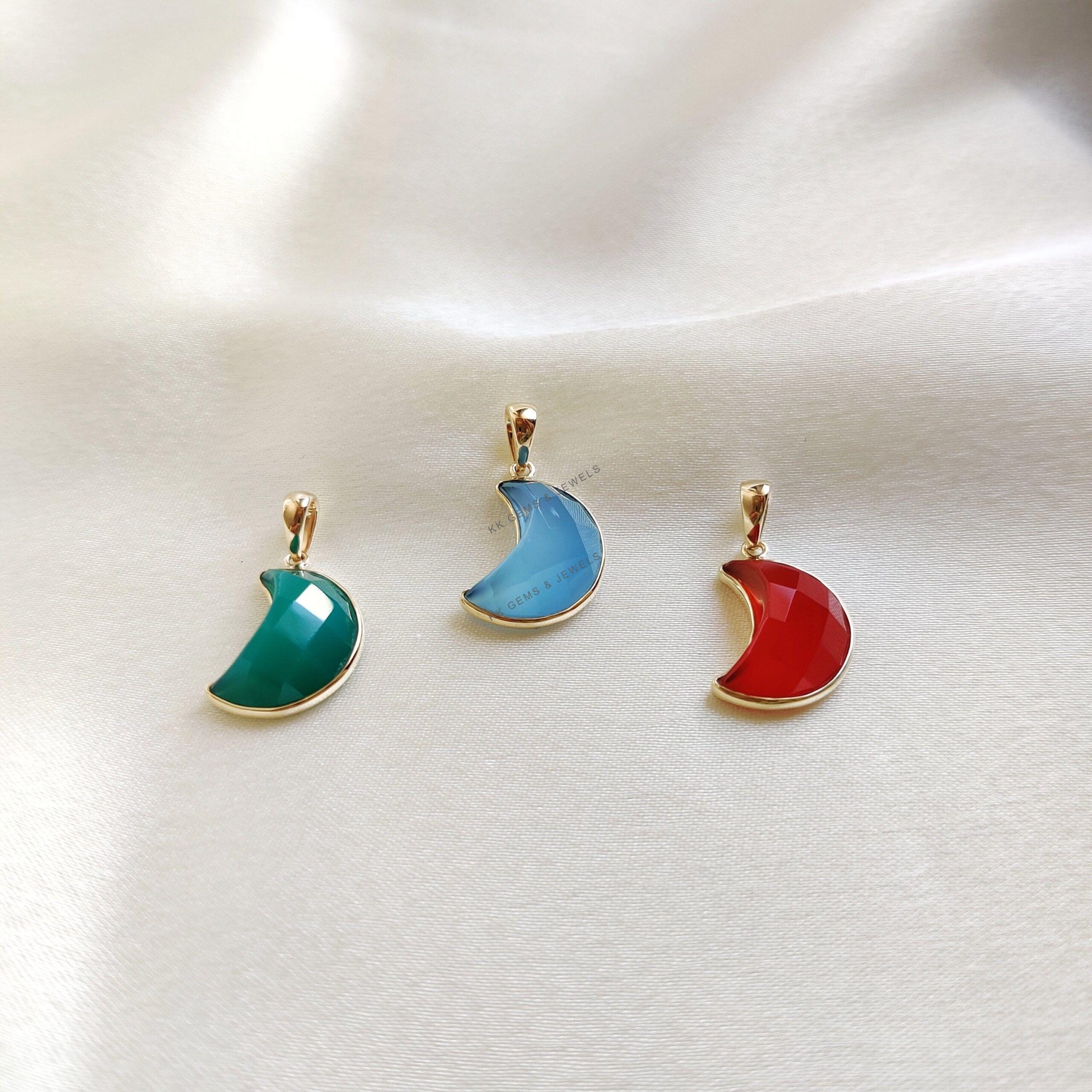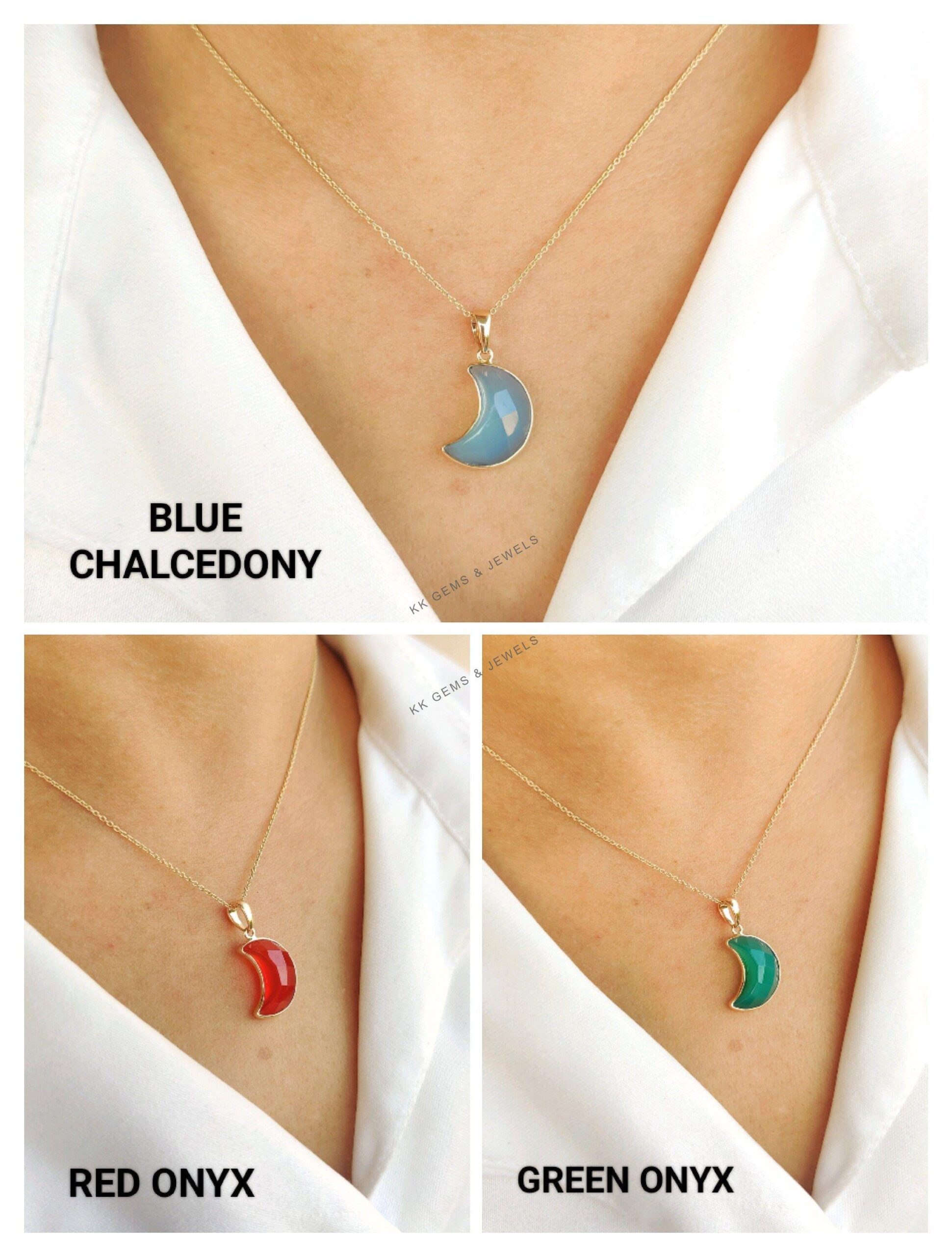These dainty natural gemstone pendants in moon shape are a perfect addition to your necklace stack. Set in 14k Solid Yellow Gold, these charm pendants are unique and minimalist. ITEM DETAILS • GEM 1. Green Onyx: 5.30 cts 2. Red…