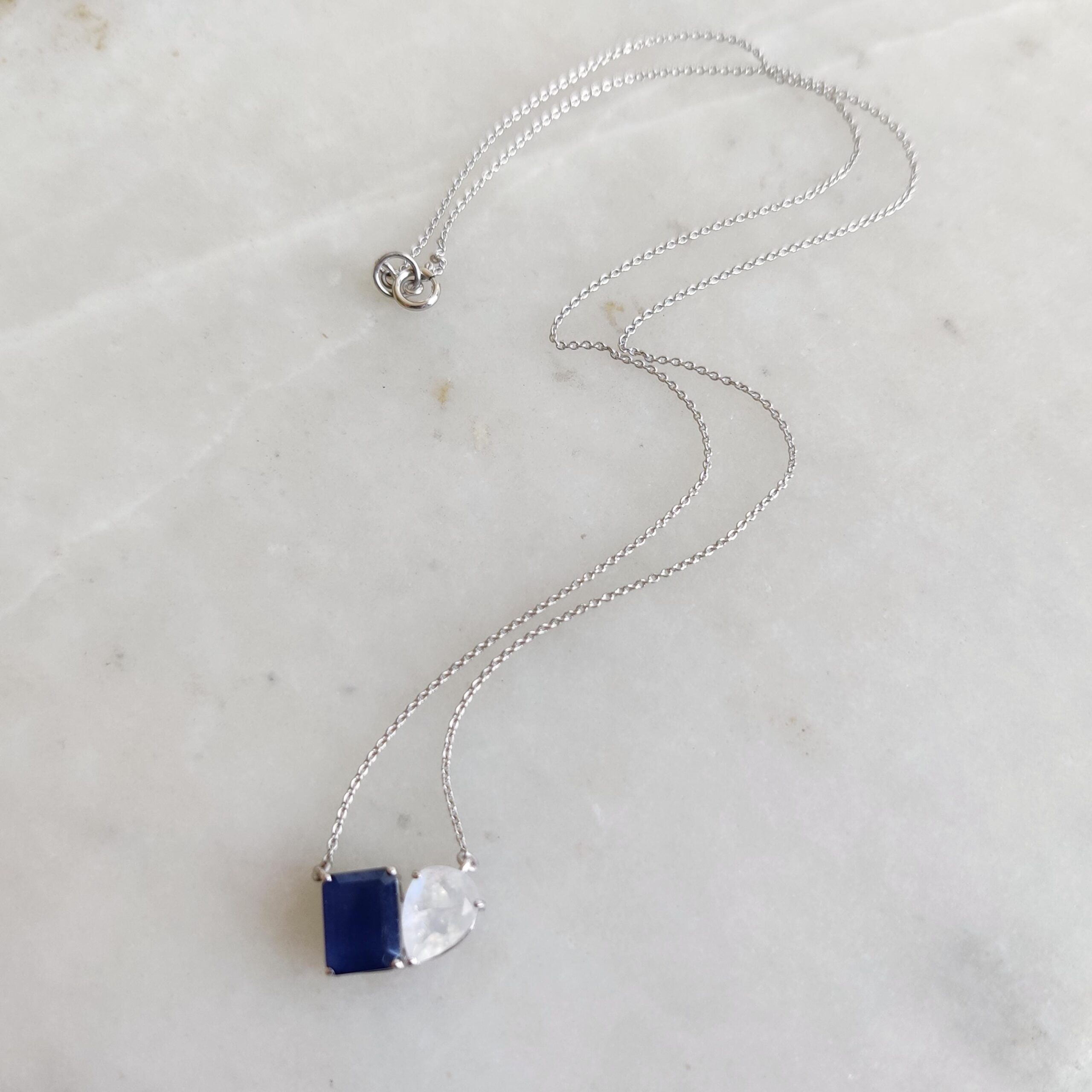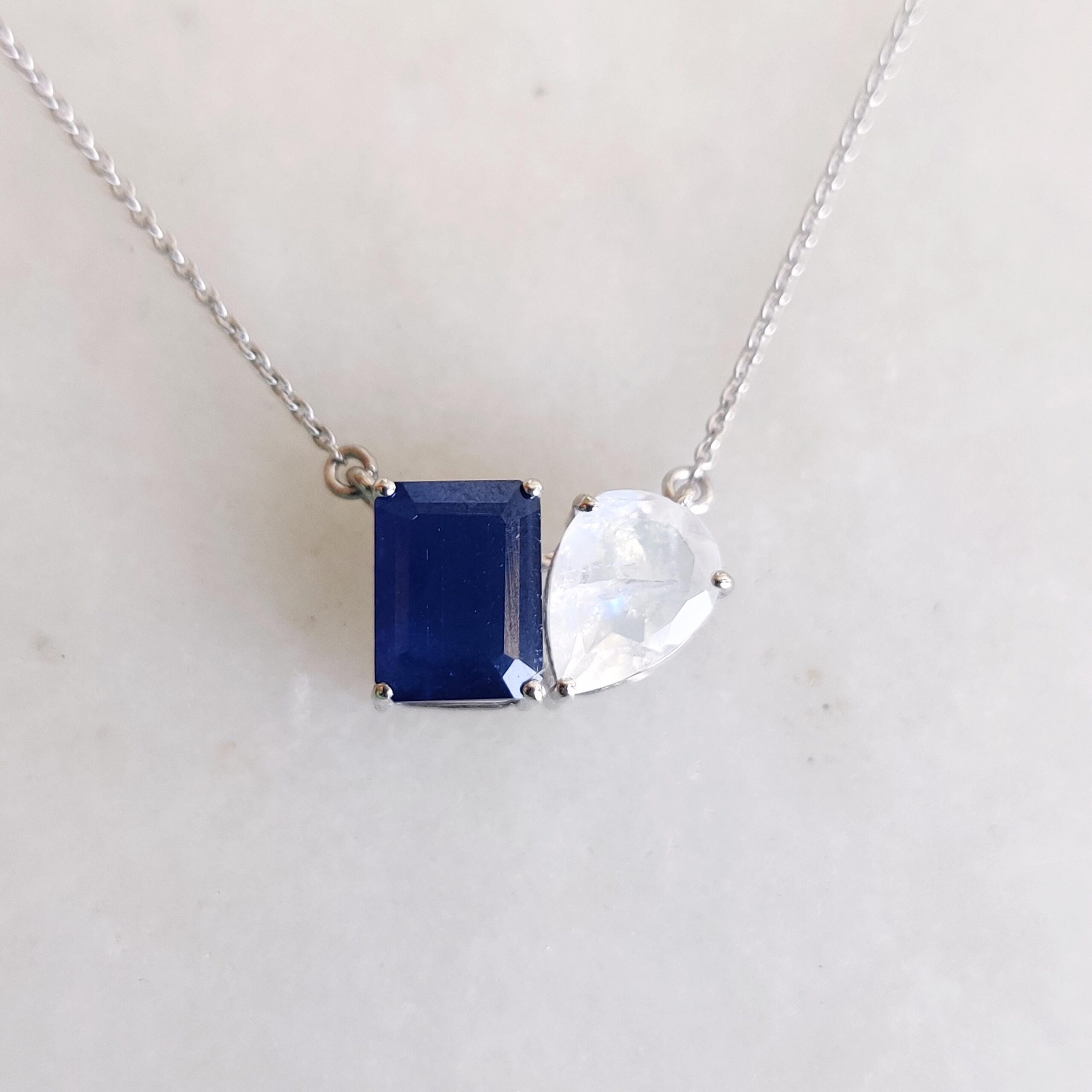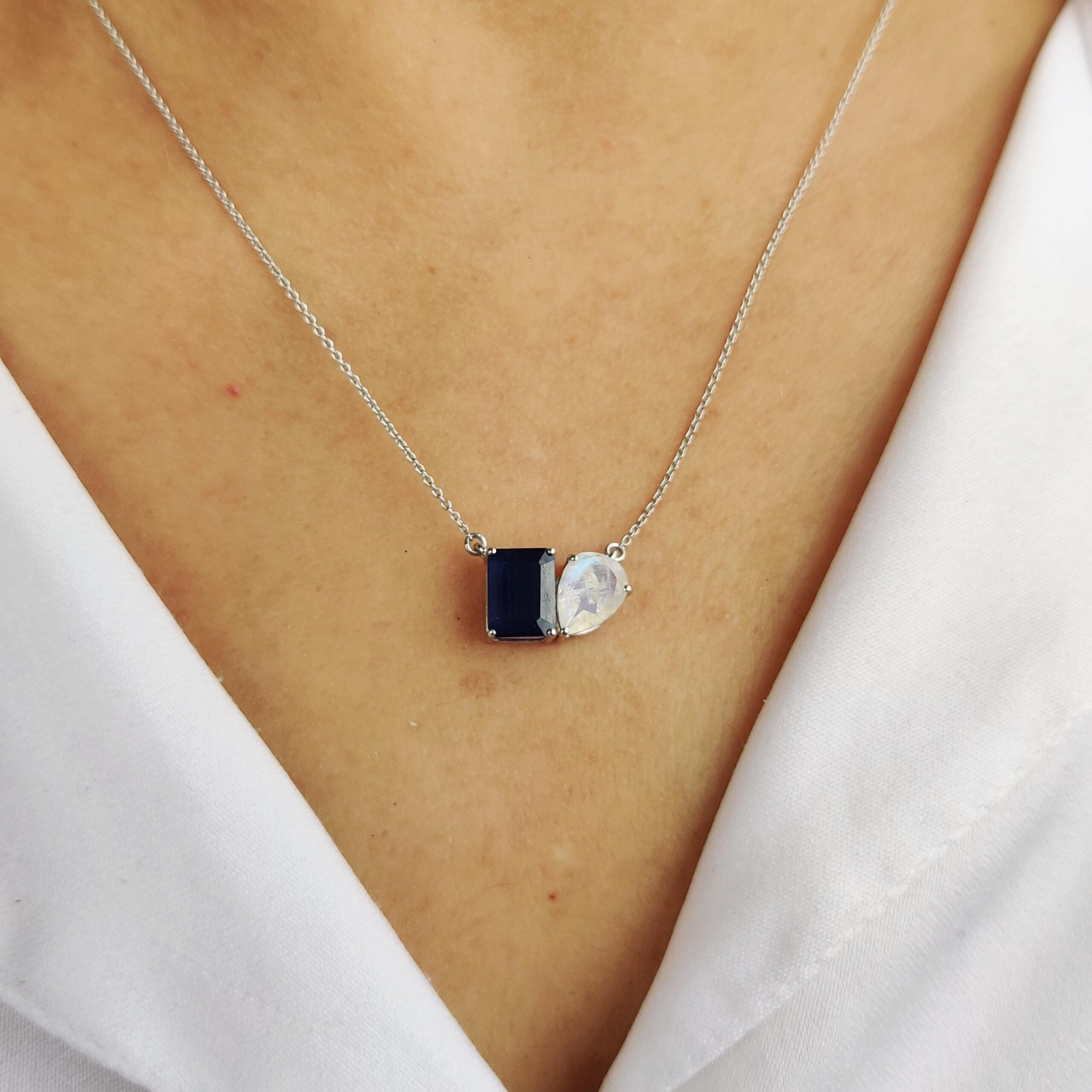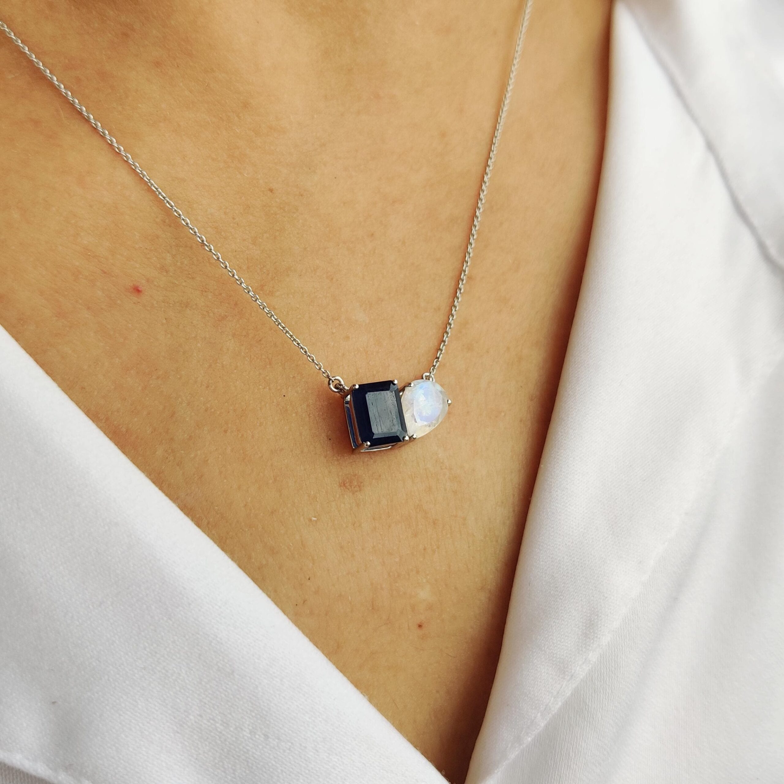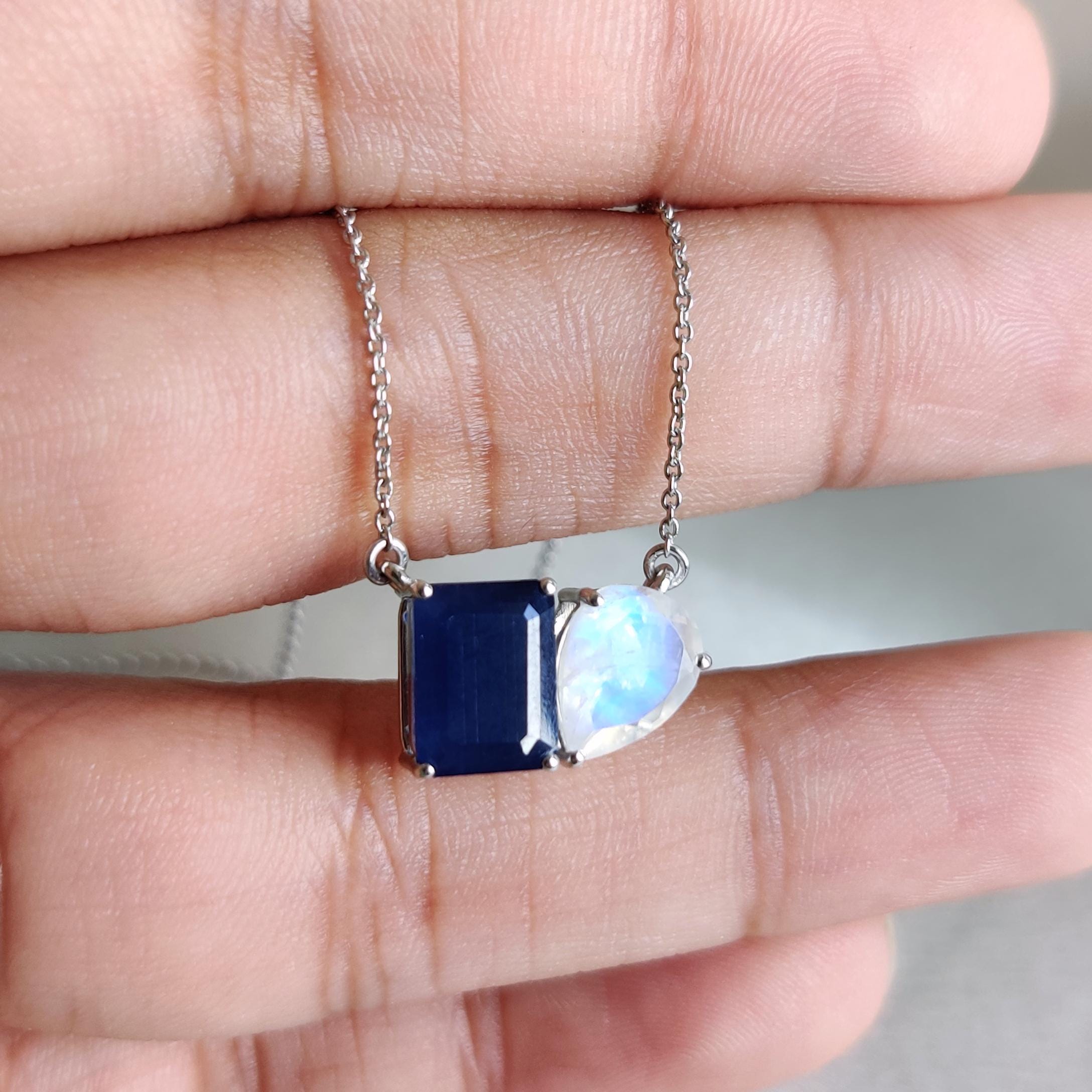 This stunning Necklace is set in 14k Solid White Gold with Natural Blue Sapphire and Natural Rainbow Moonstone with utmost precision. It is an unique gemstone pendant for nearly every occasion and is completely hassle-free jewelry.