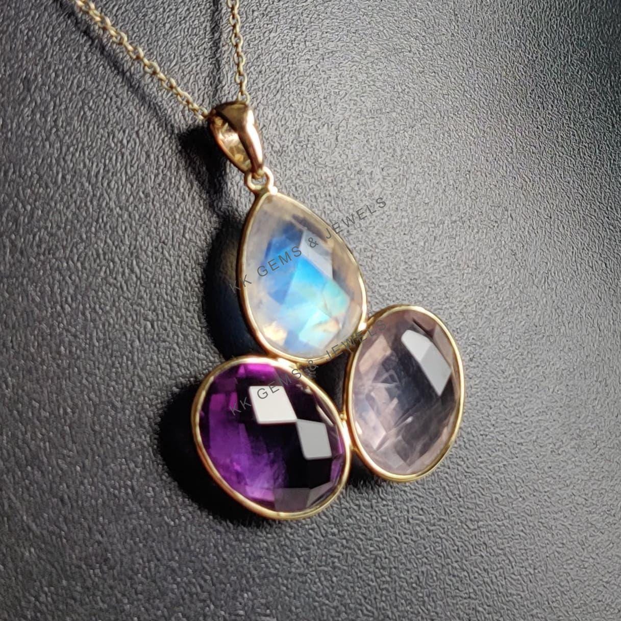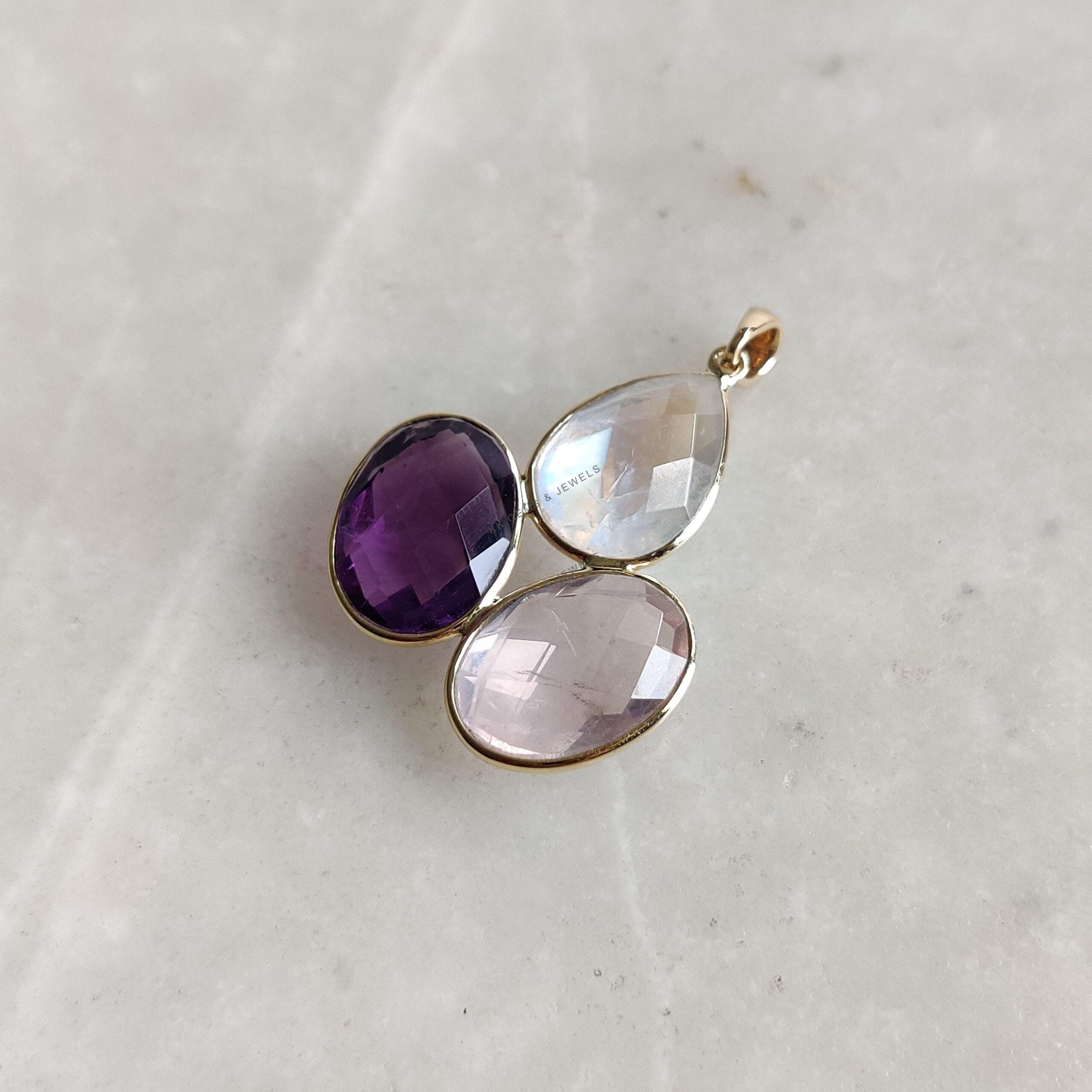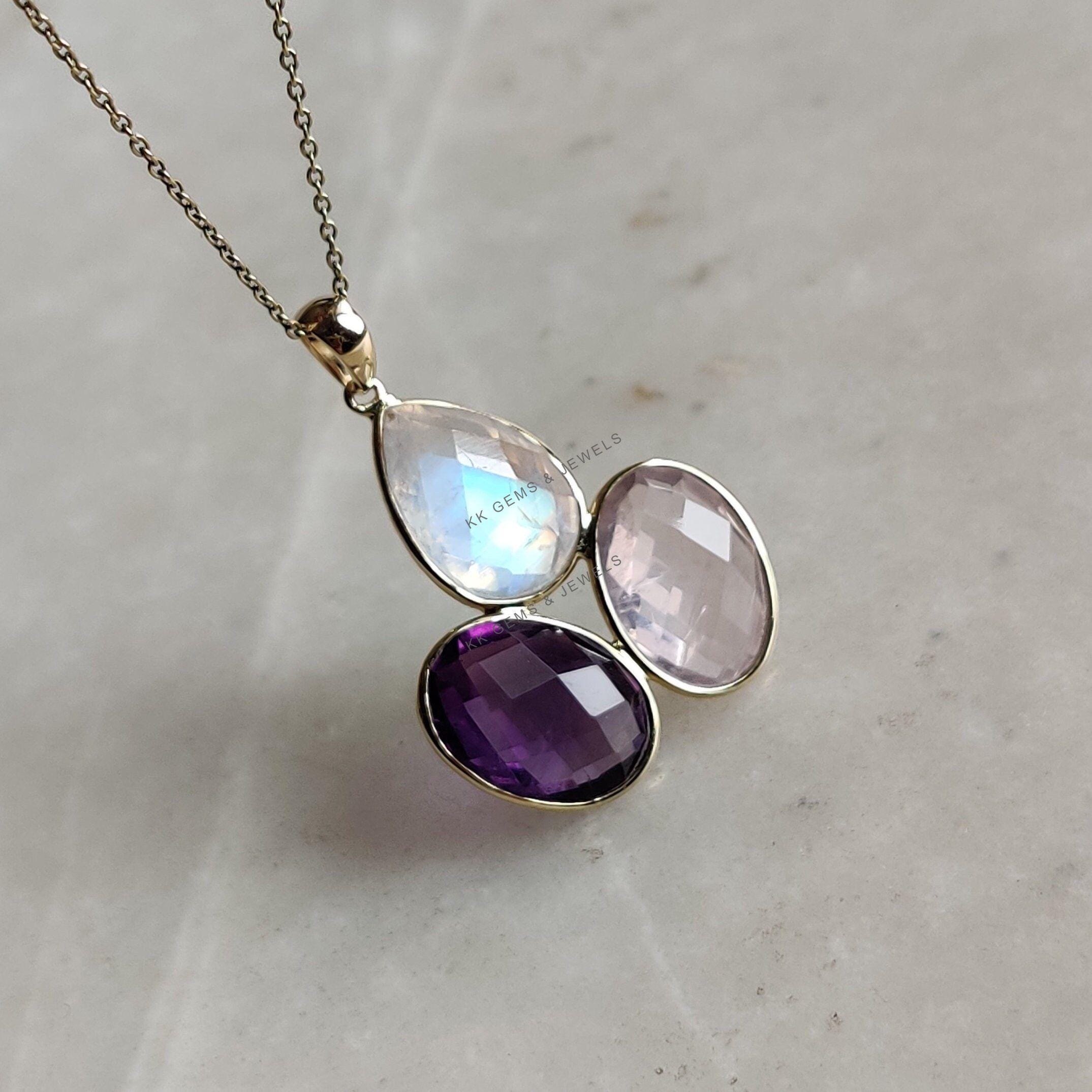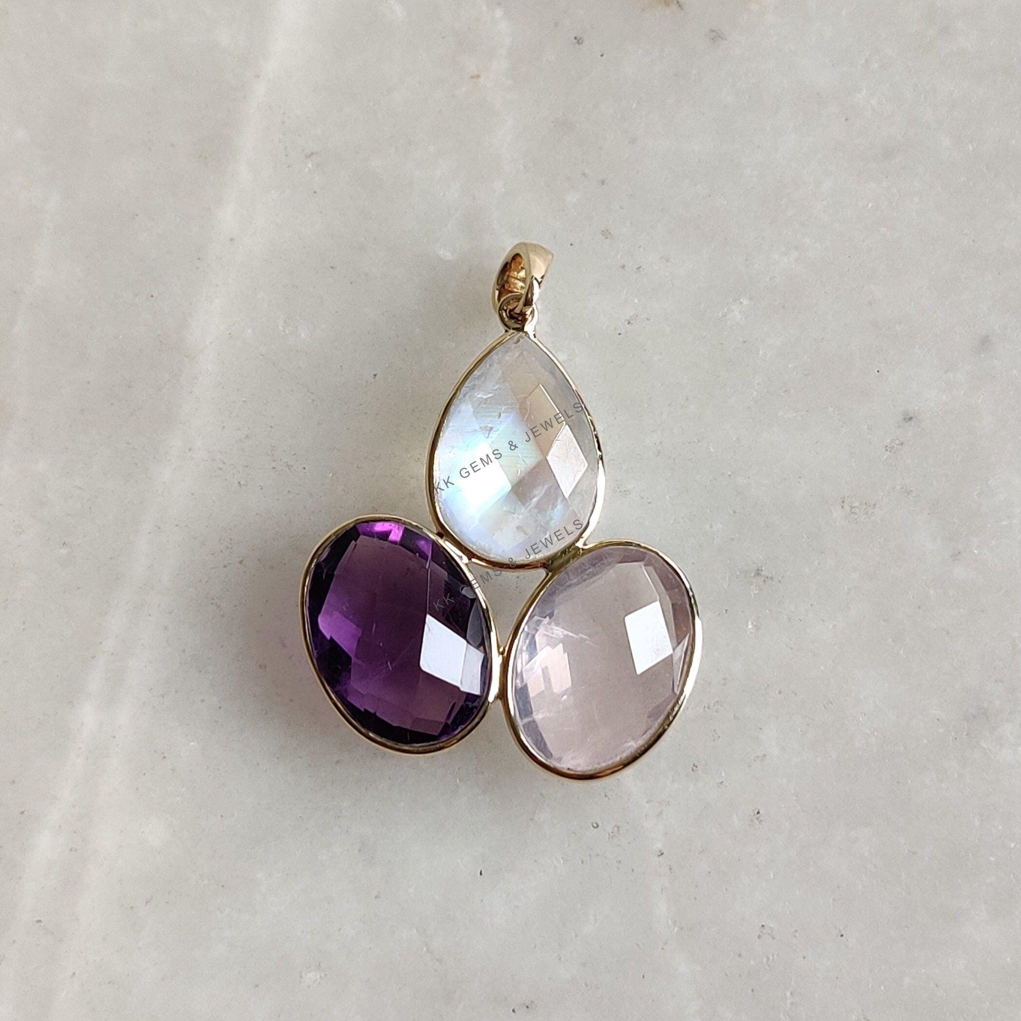 This stunning pendant is set in 14k Solid Yellow Gold with Natural Purple Amethyst Rose Quartz and Rainbow Moonstone having a beautiful blue sheen. It is an unique gemstone pendant for nearly every occasion and is completely hassle-free jewelry. ✓…