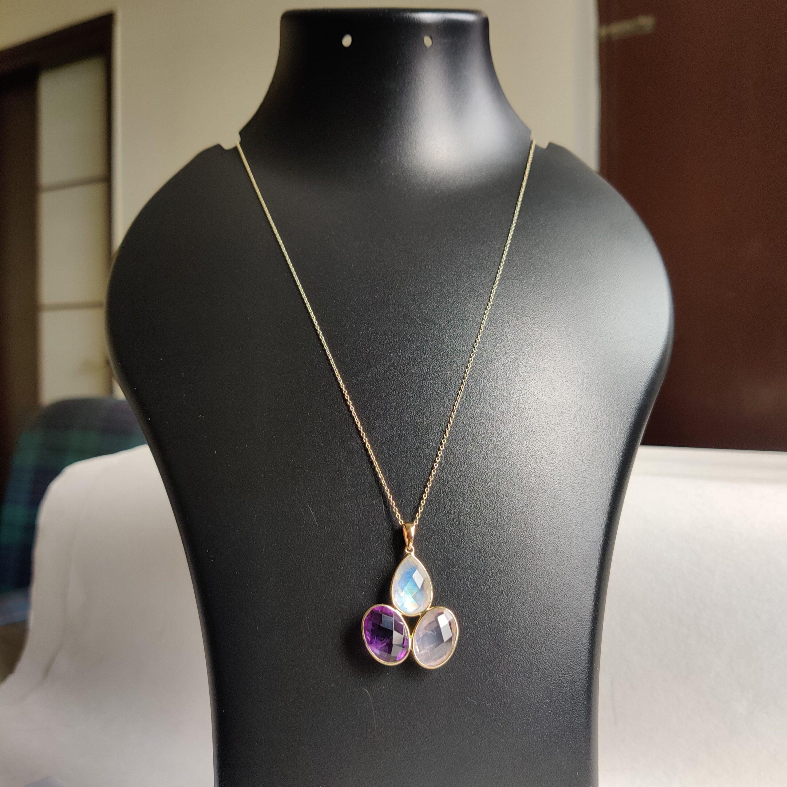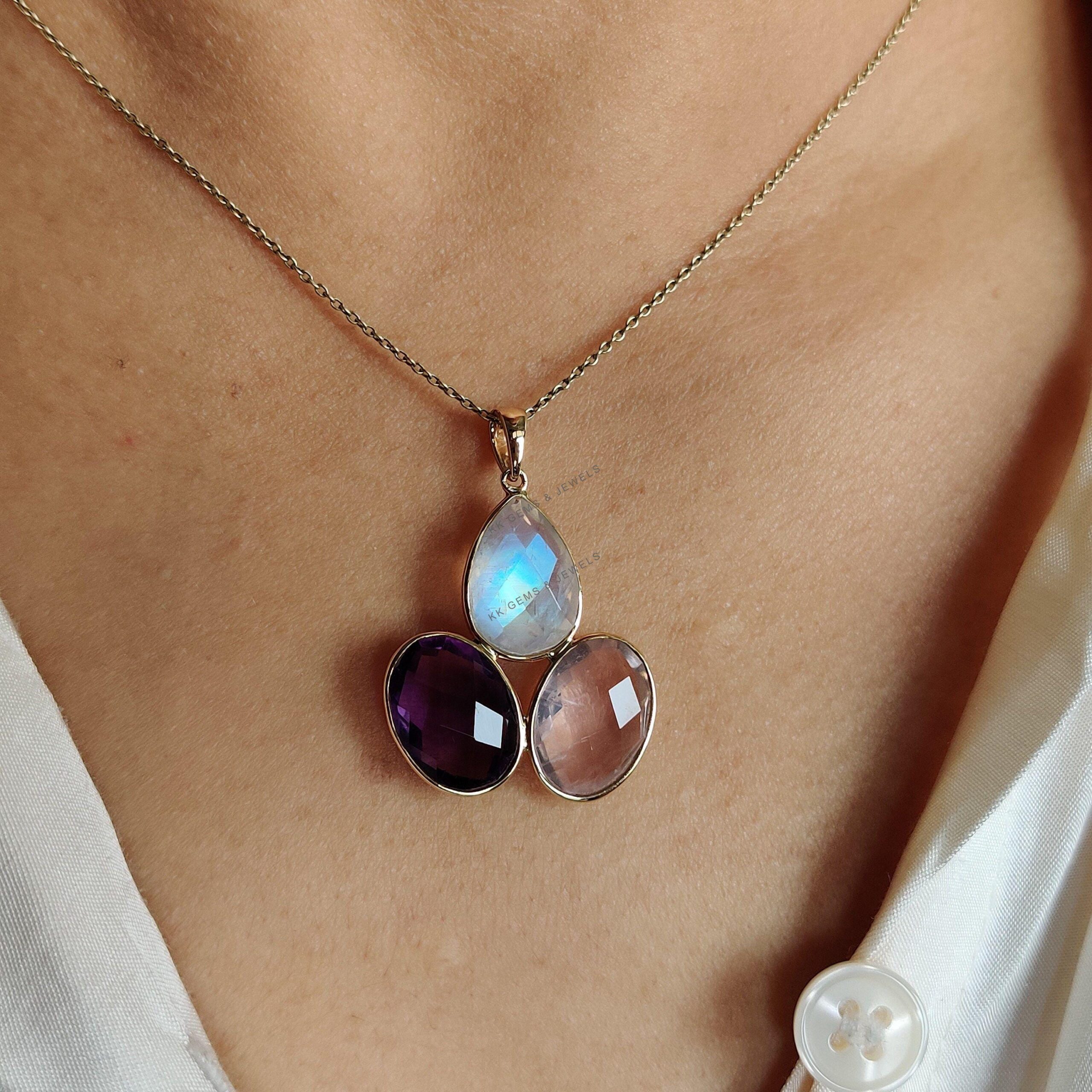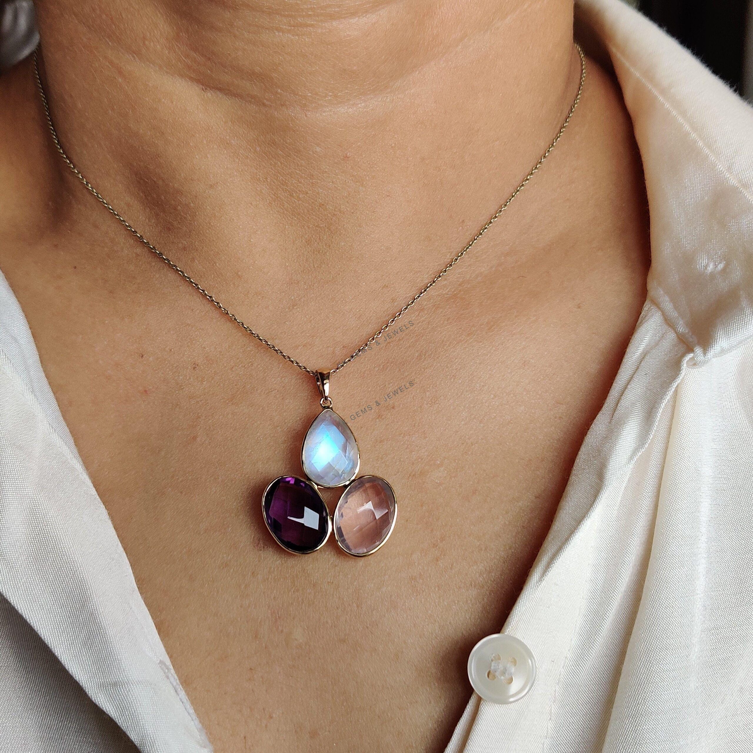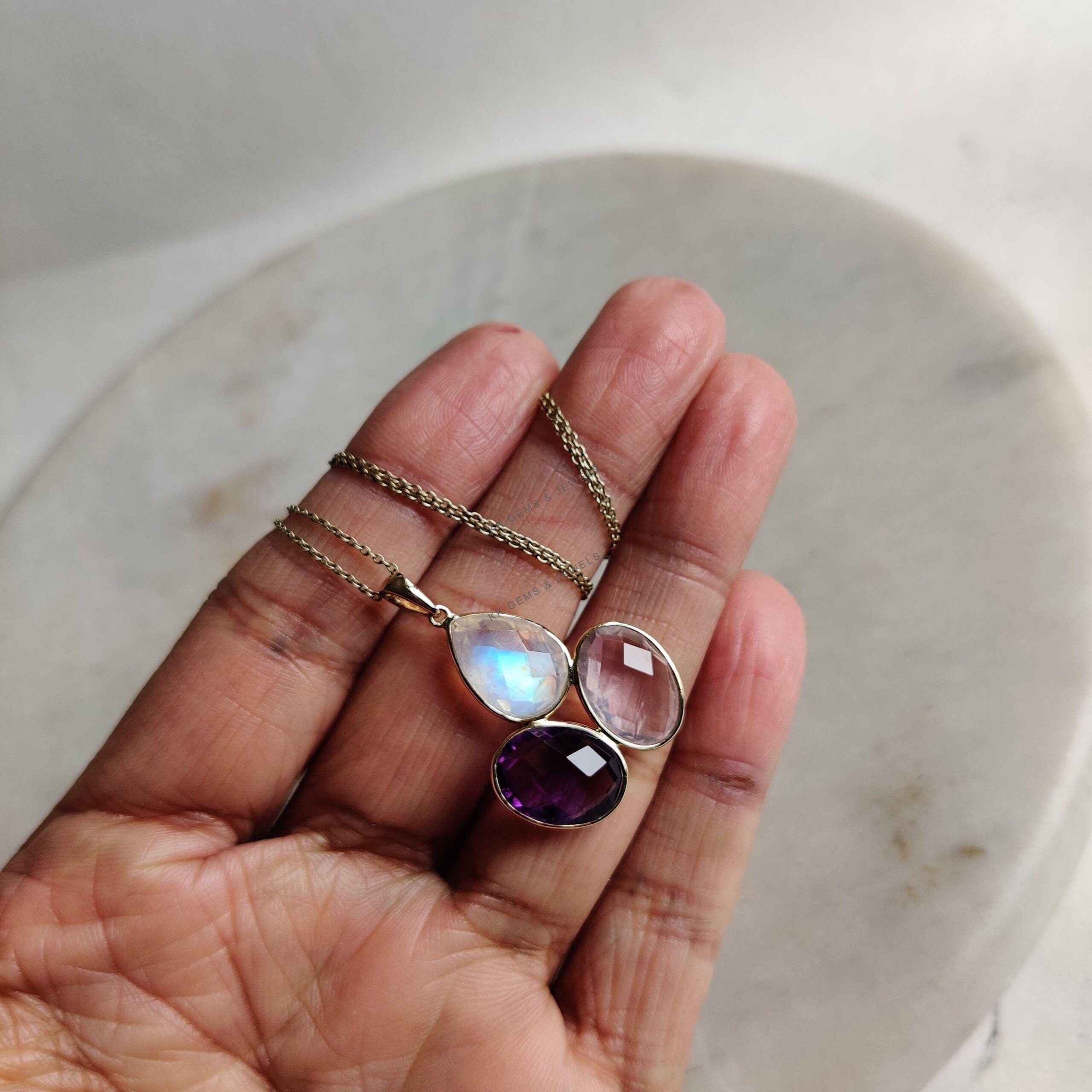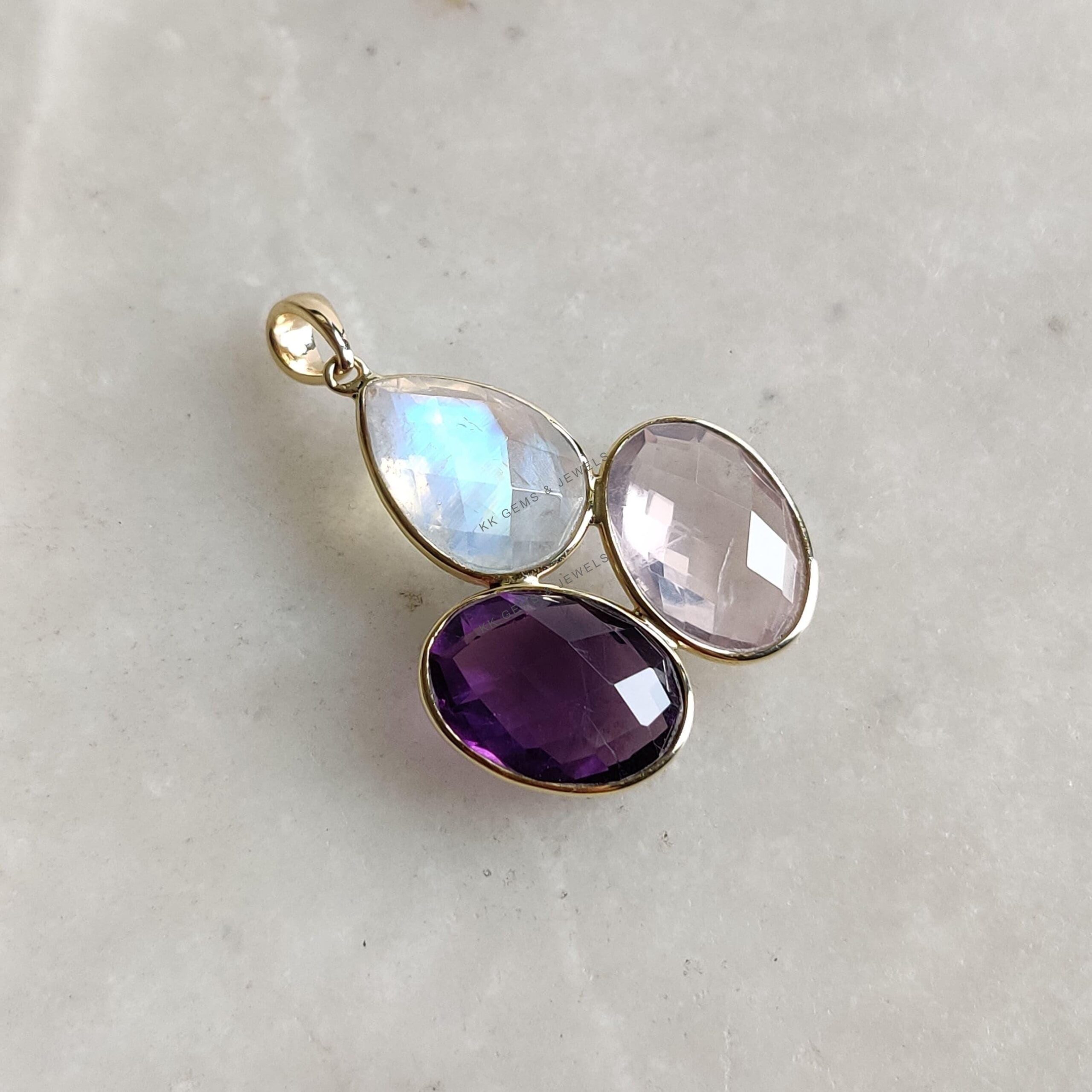 This stunning pendant is set in 14k Solid Yellow Gold with Natural Purple Amethyst Rose Quartz and Rainbow Moonstone having a beautiful blue sheen. It is an unique gemstone pendant for nearly every occasion and is completely hassle-free jewelry. ✓…