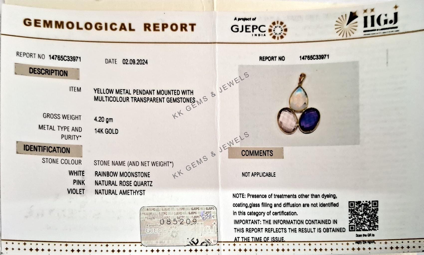 This stunning pendant is set in 14k Solid Yellow Gold with Natural Purple Amethyst Rose Quartz and Rainbow Moonstone having a beautiful blue sheen. It is an unique gemstone pendant for nearly every occasion and is completely hassle-free jewelry.