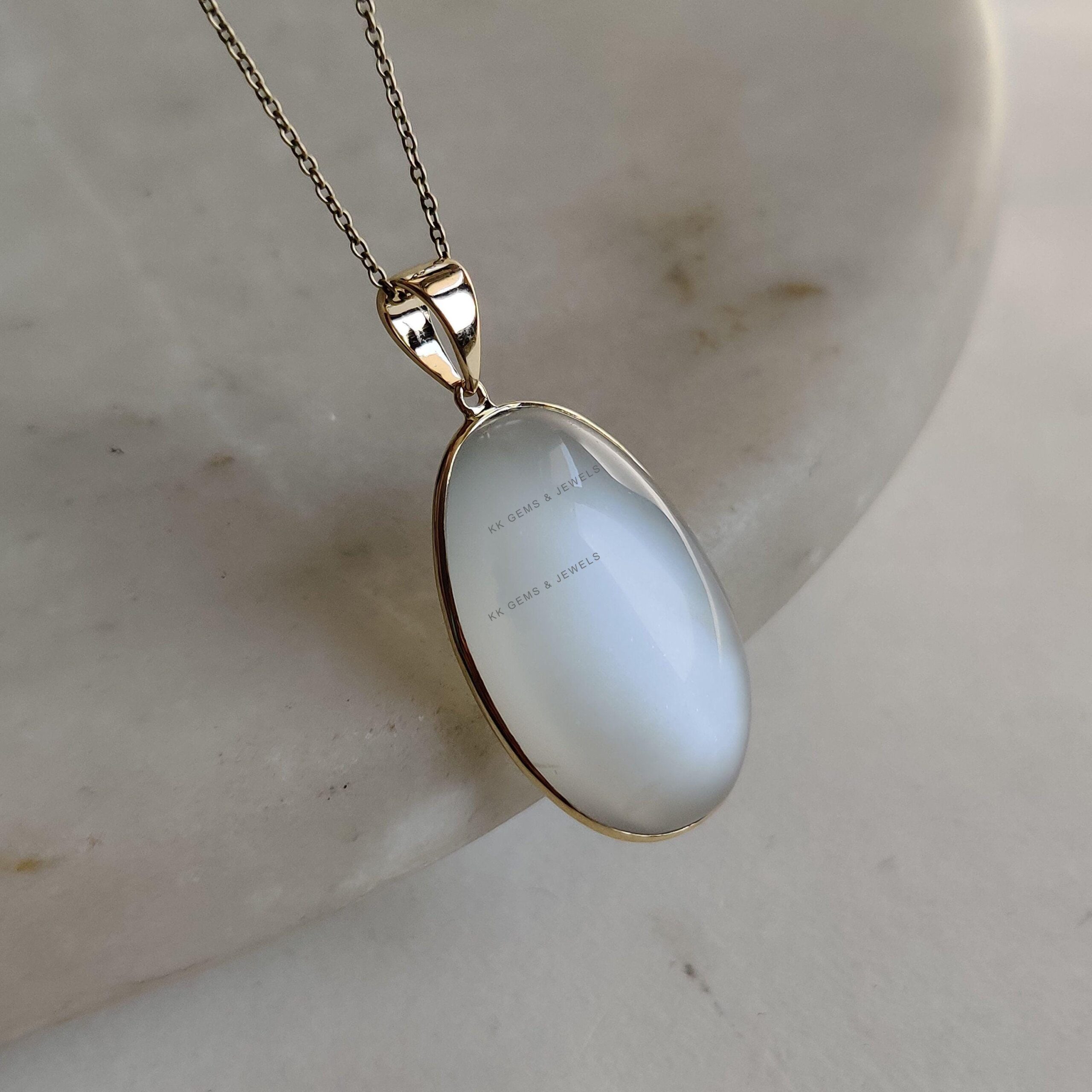 Oval Cabochon Natural White Moonstone Birthstone Pendant Set In 14K Solid Gold
