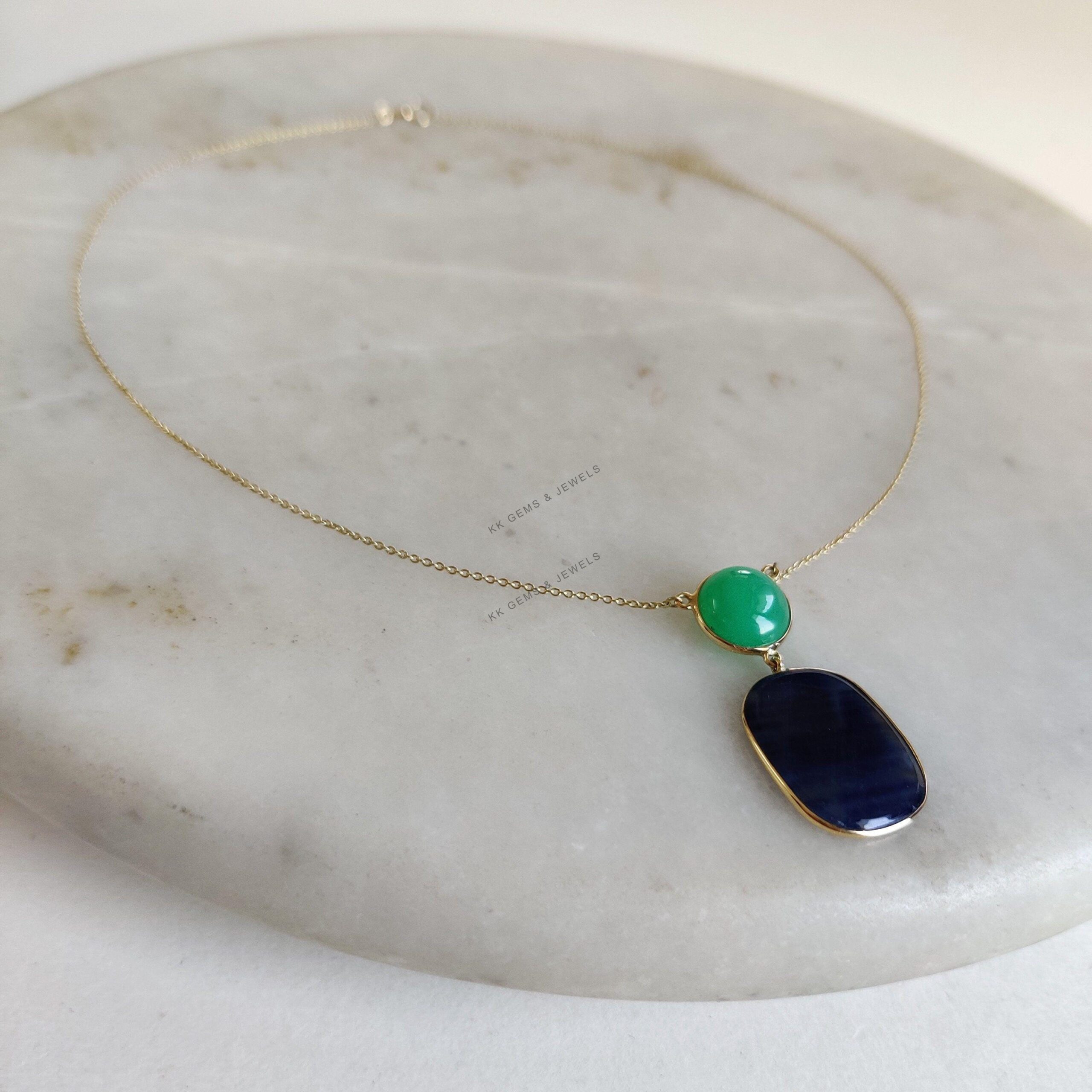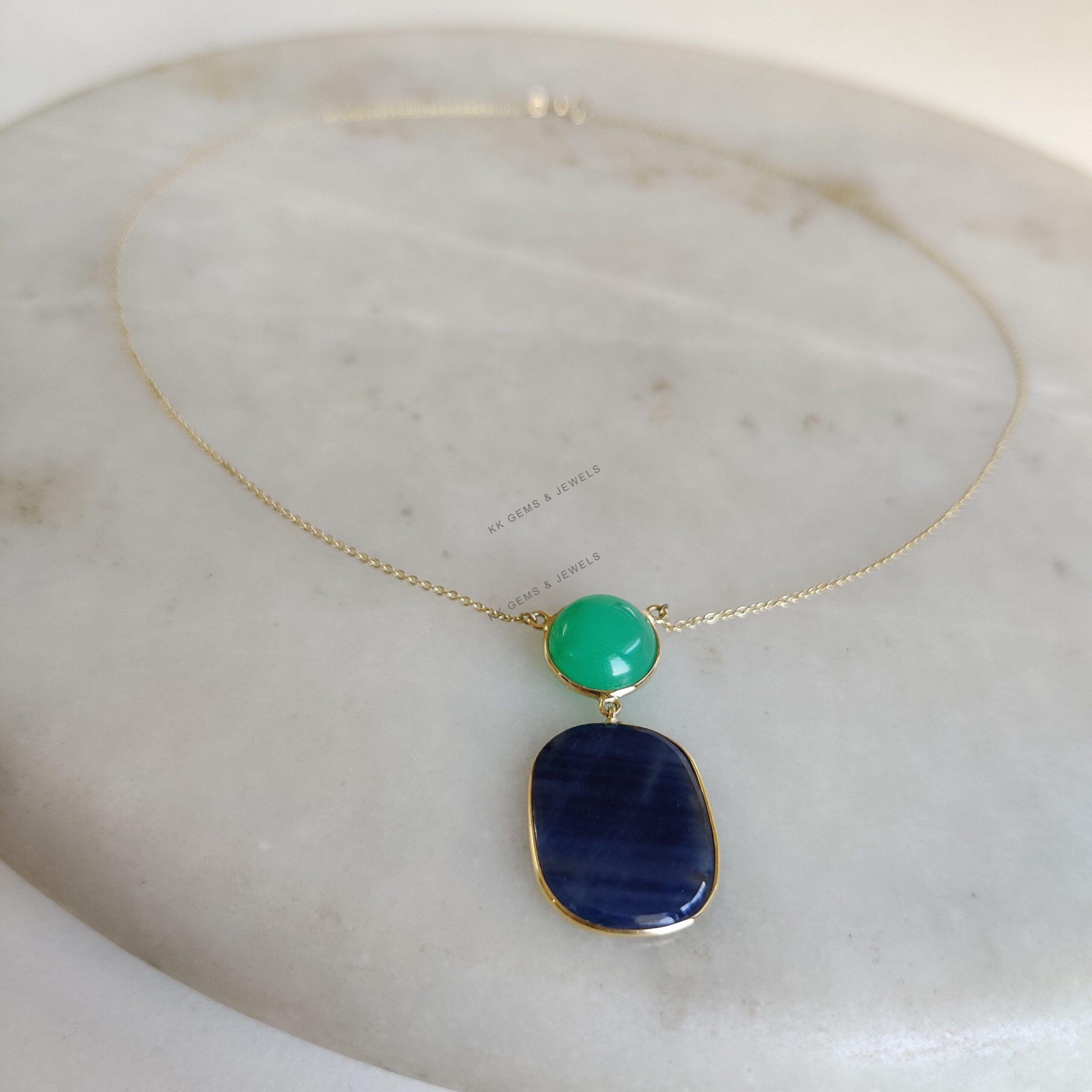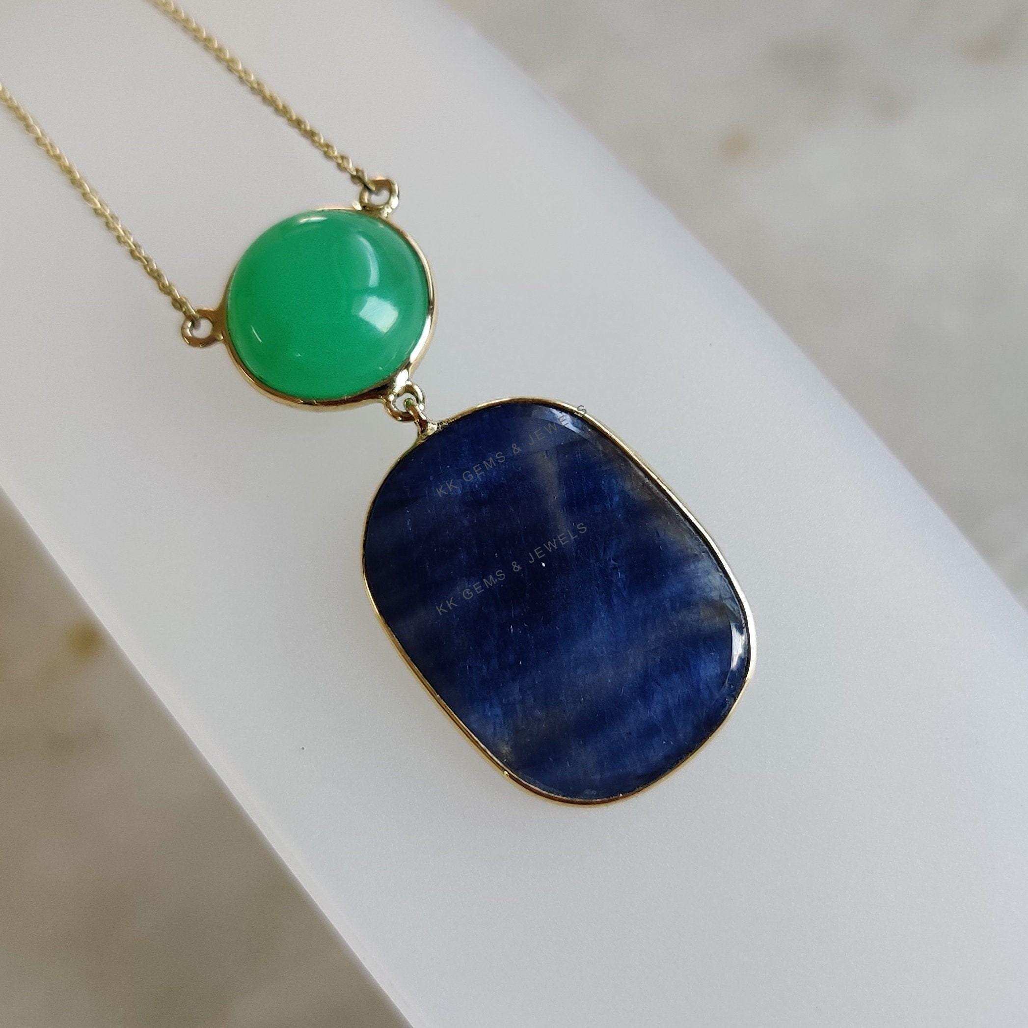 Oval Cut Natural Blue Sapphire & Chrysoprase Pendant Set in 14K Solid Gold