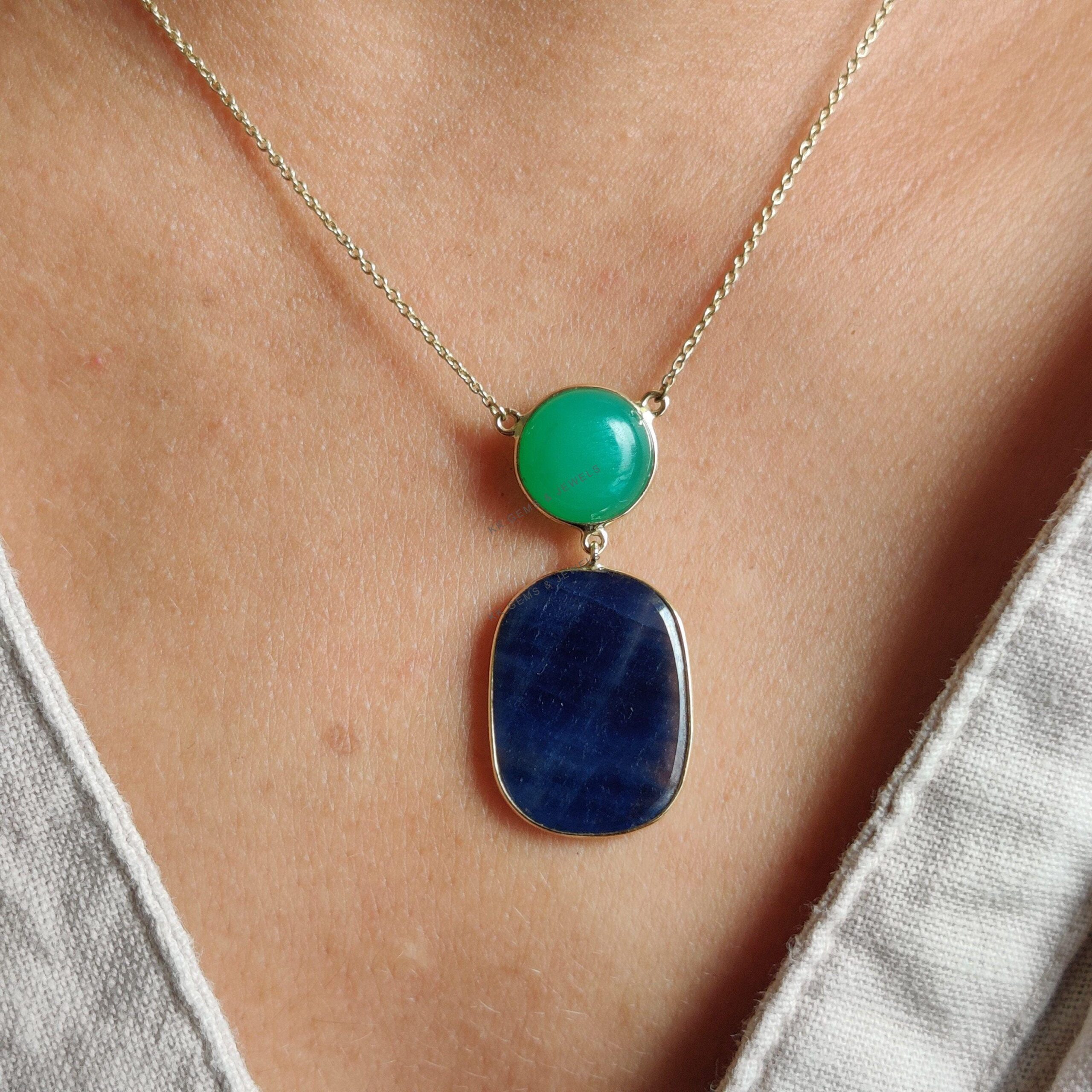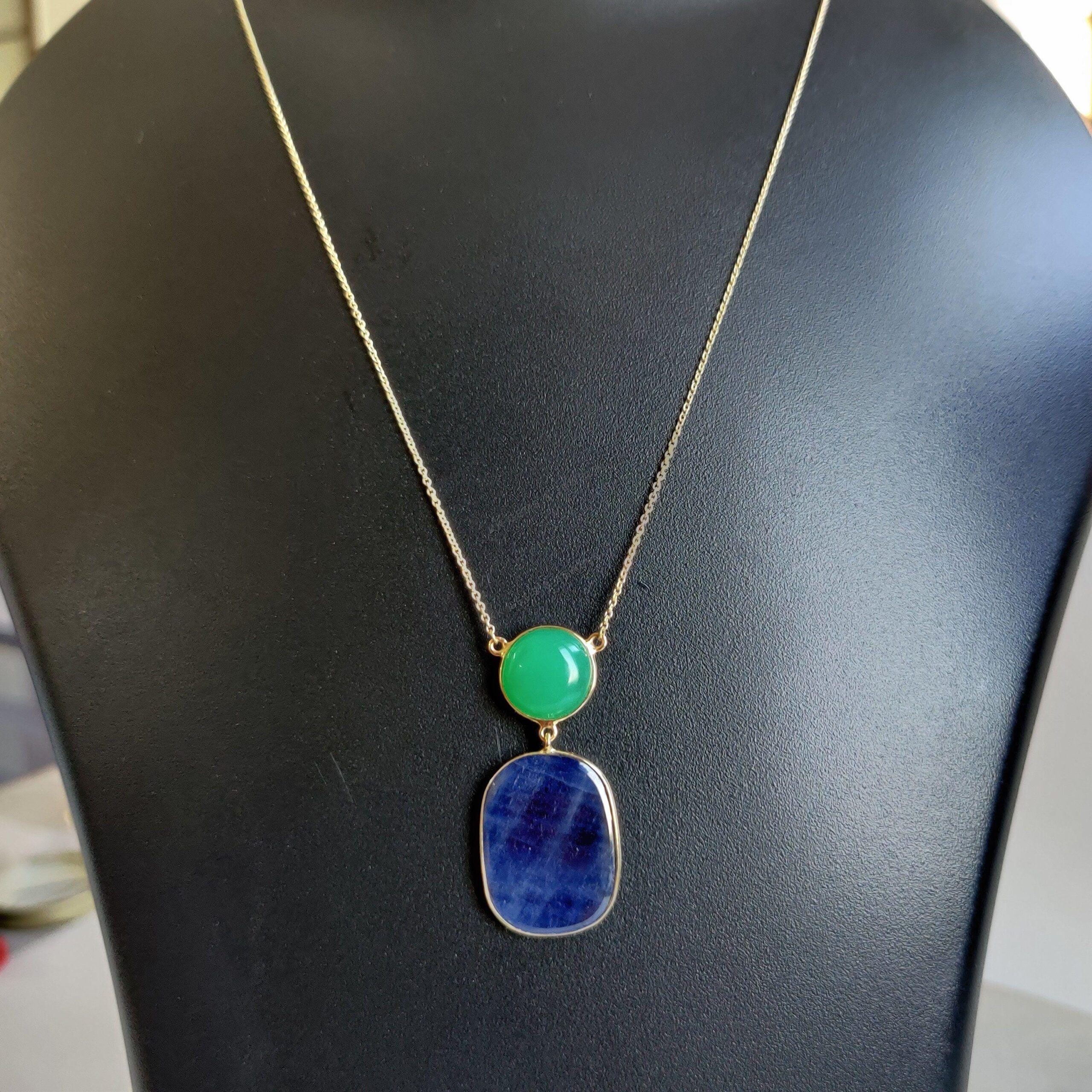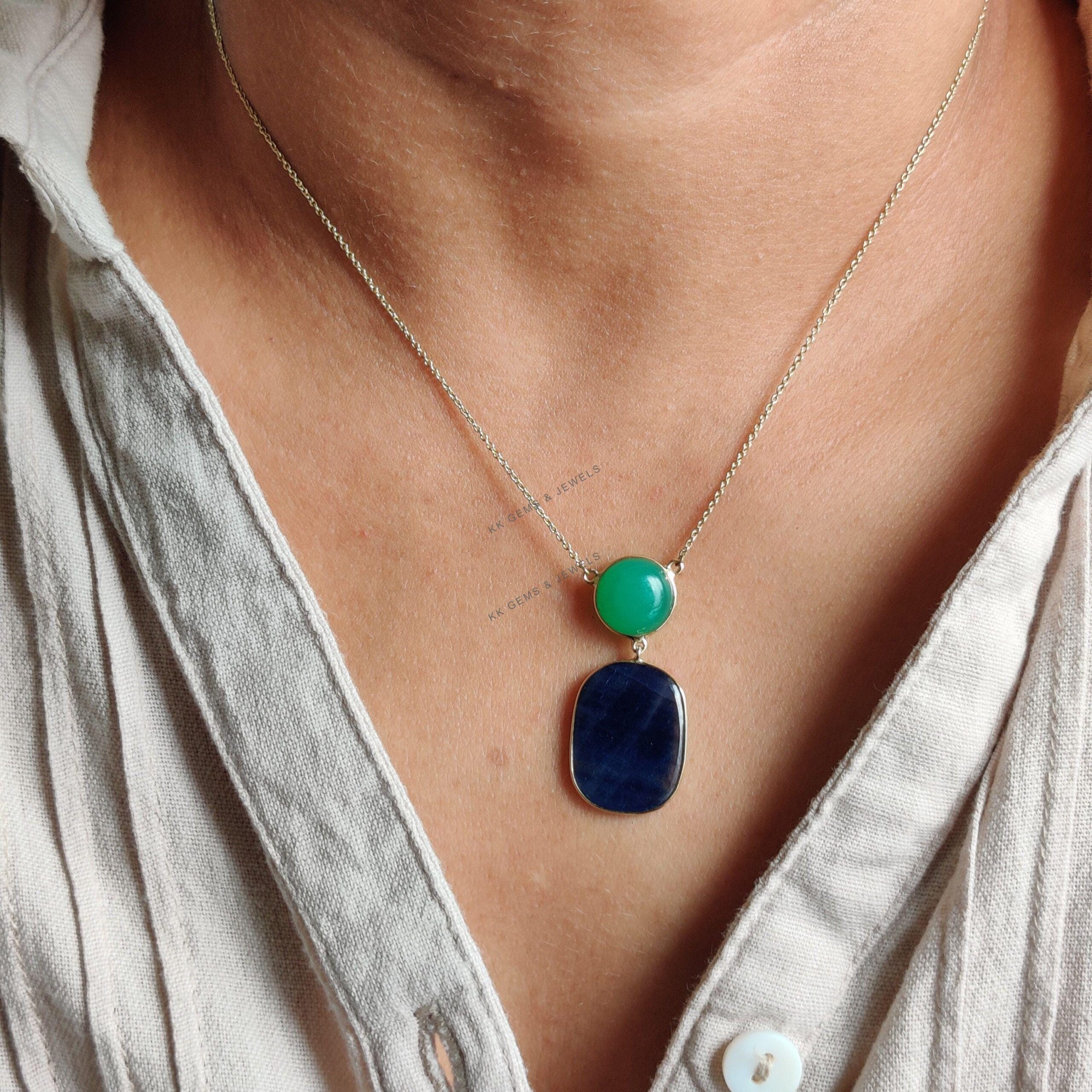 Oval Cut Natural Blue Sapphire & Chrysoprase Pendant Set in 14K Solid Gold