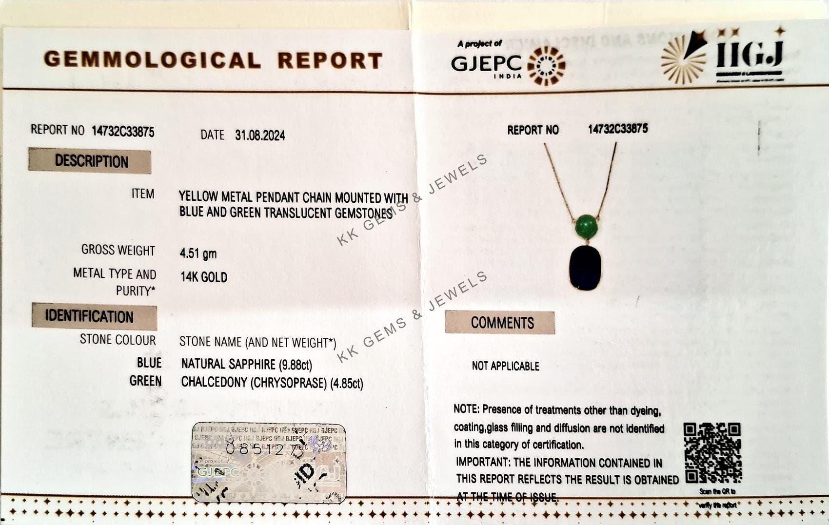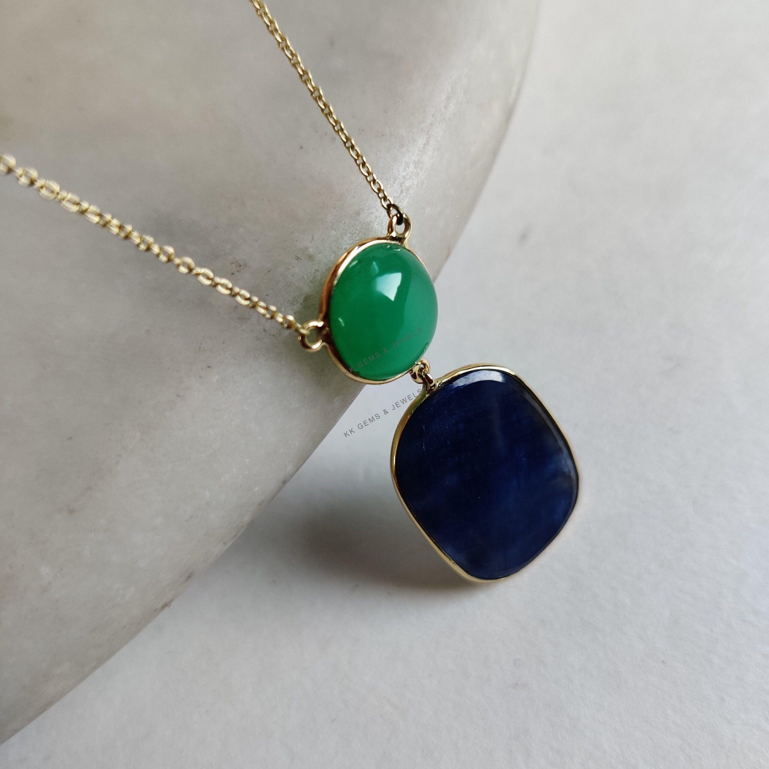 This stunning pendant is set in 14K Solid Yellow Gold with Natural Blue Sapphire and Chrysoprase with utmost precision. It is an unique gemstone pendant for nearly every occasion and is completely hassle-free jewelry. ✓ ABOUT GEMSTONE: Blue Sapphire is…