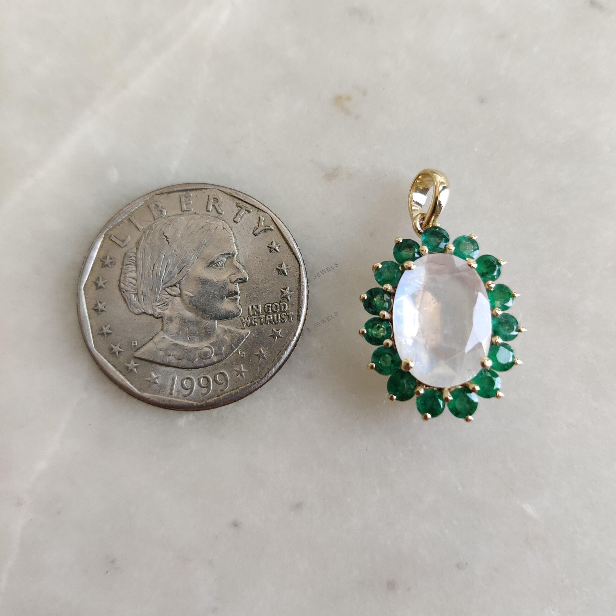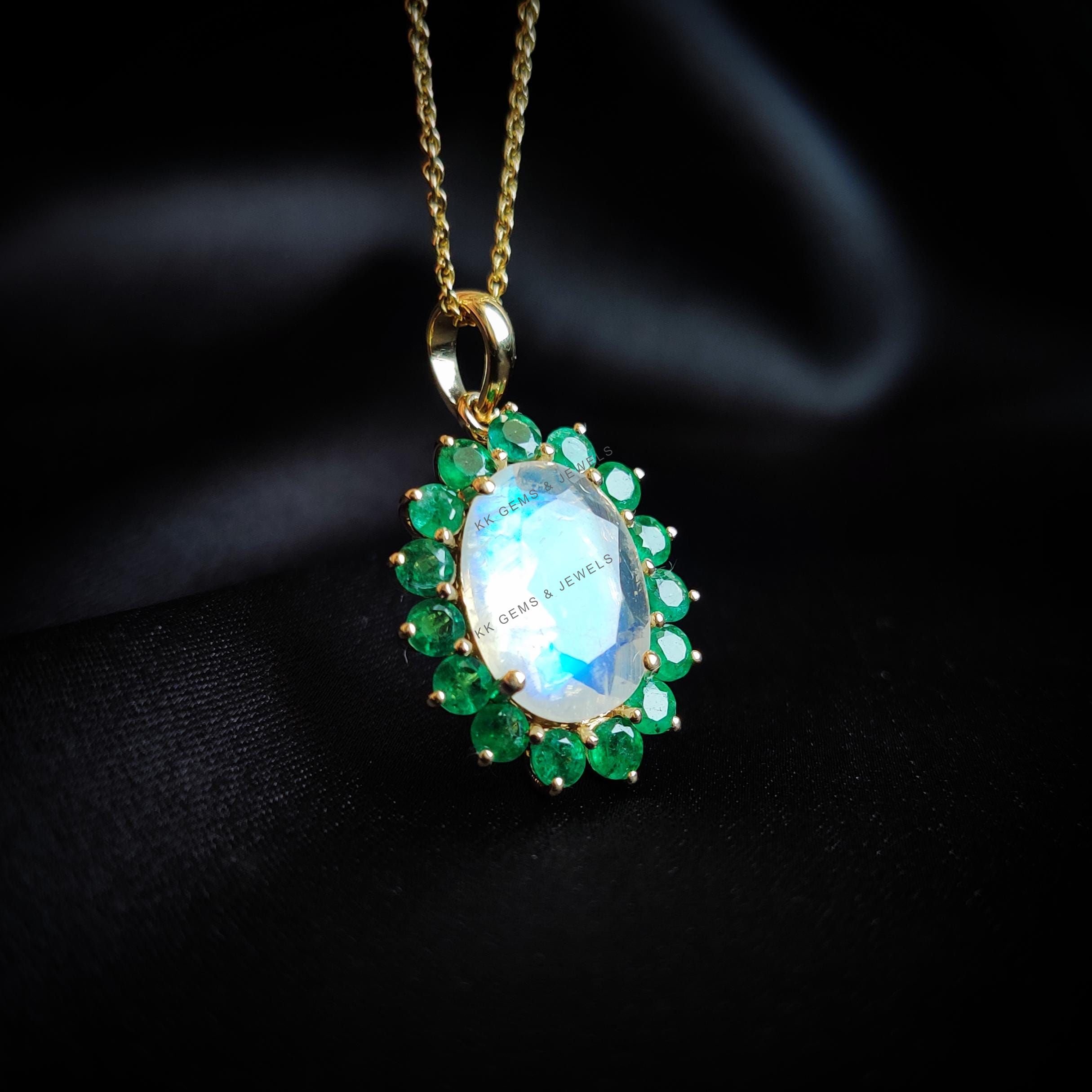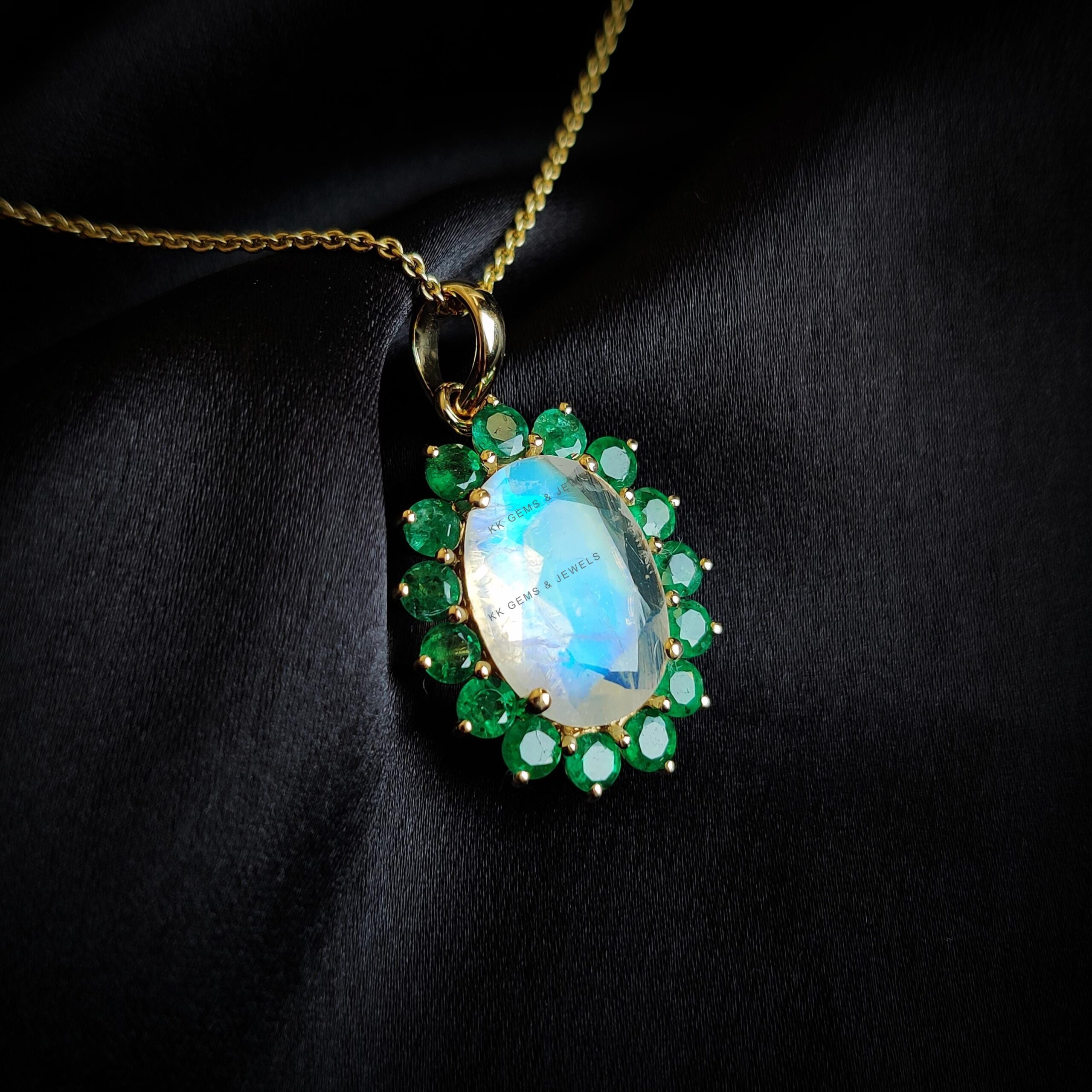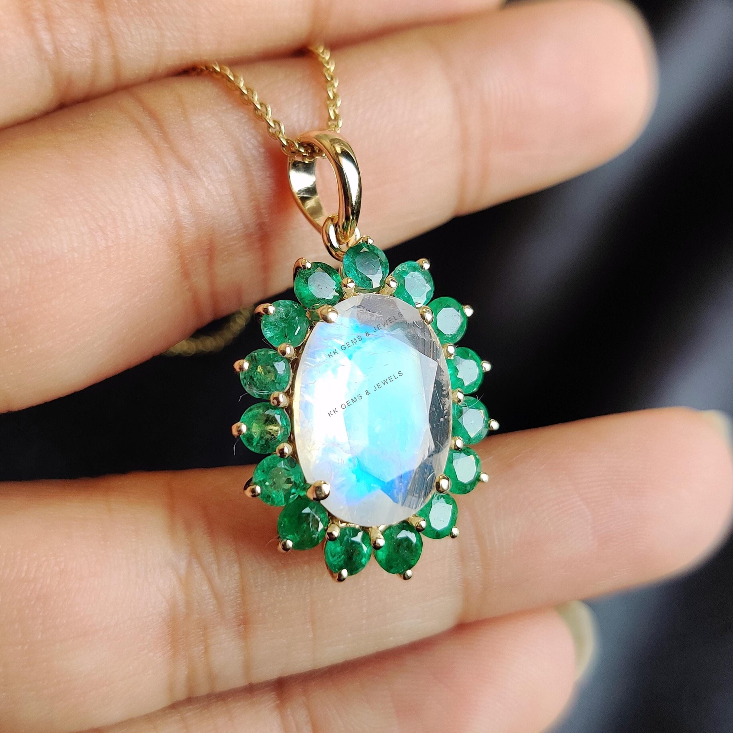 This stunning pendant is set in 14k Solid Yellow Gold with Natural Rainbow Moonstone and Natural Emerald with utmost precision. It is an unique gemstone pendant for nearly every occasion and is completely hassle-free jewelry.