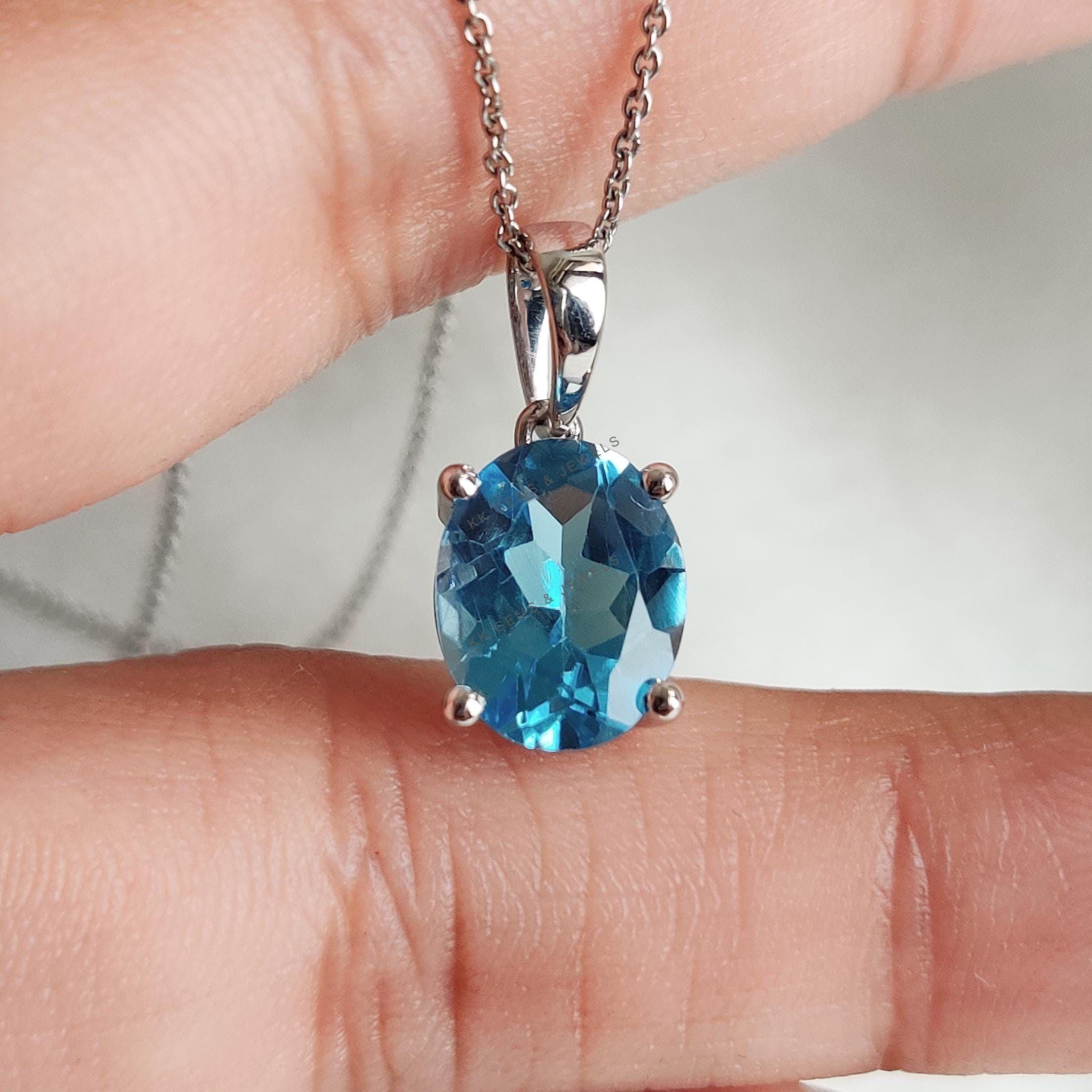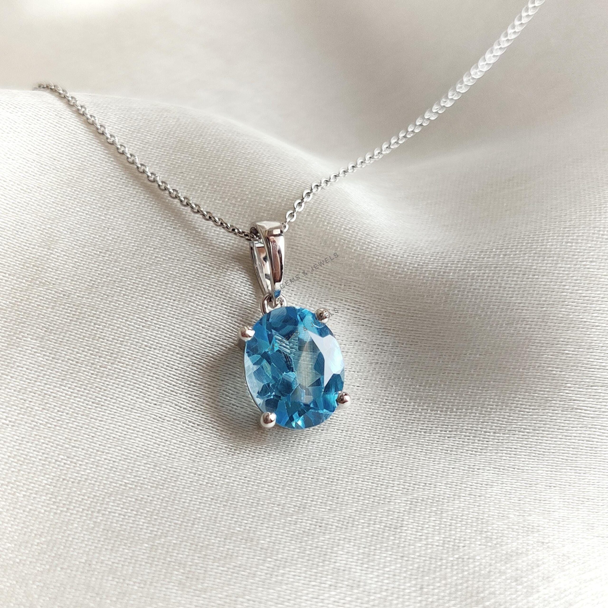 Oval Cut Natural Swiss Blue Topaz Birthstone Pendant Set in 14K Solid White Gold