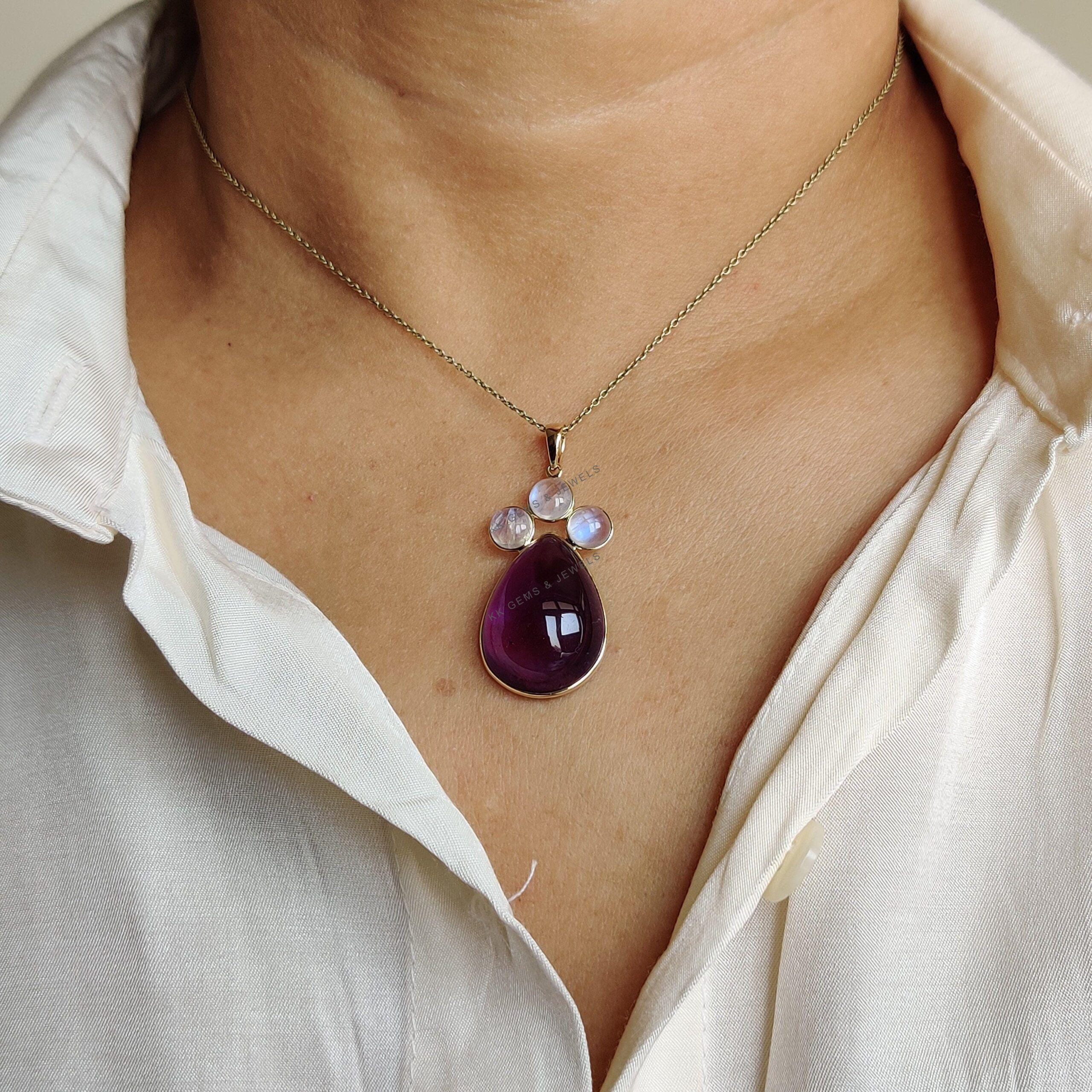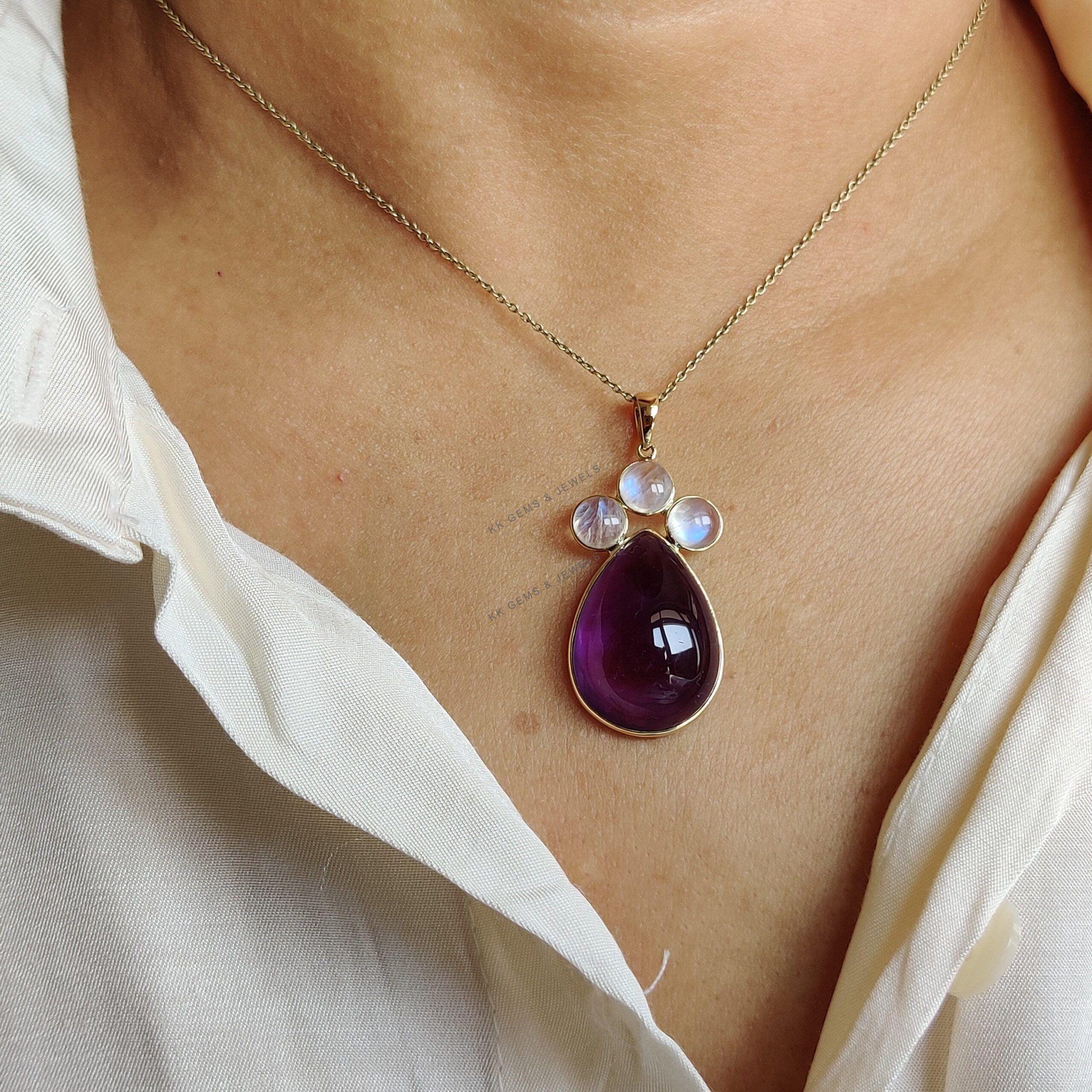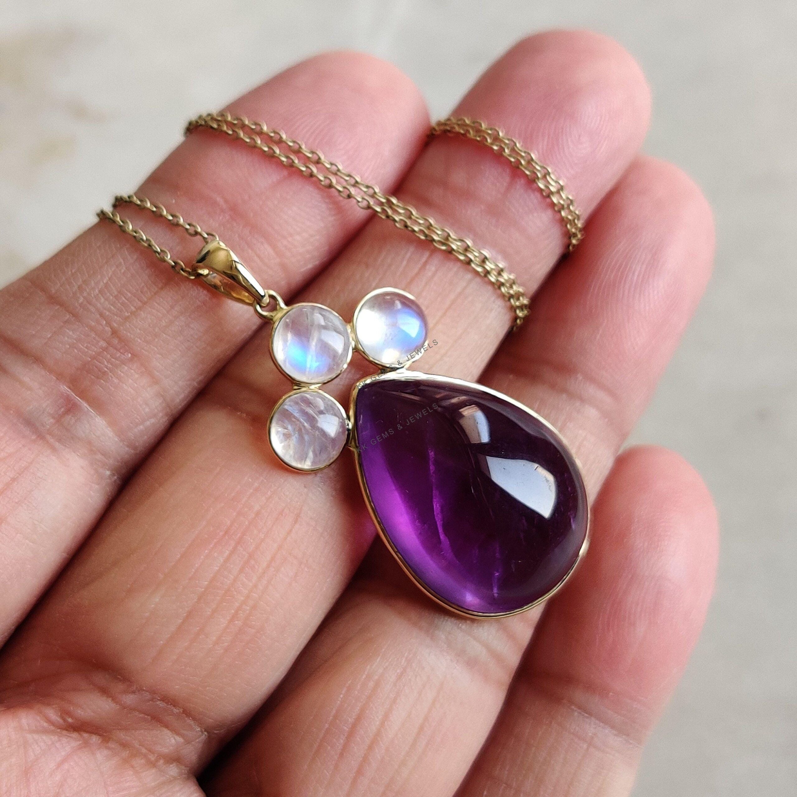 This stunning pendant is set in 14K Solid Yellow Gold with Natural Purple Amethyst with Rainbow Moonstone with utmost precision. It is an unique gemstone pendant for nearly every occasion and is completely hassle-free jewelry. ✓ ABOUT GEMSTONE: Amethyst is…