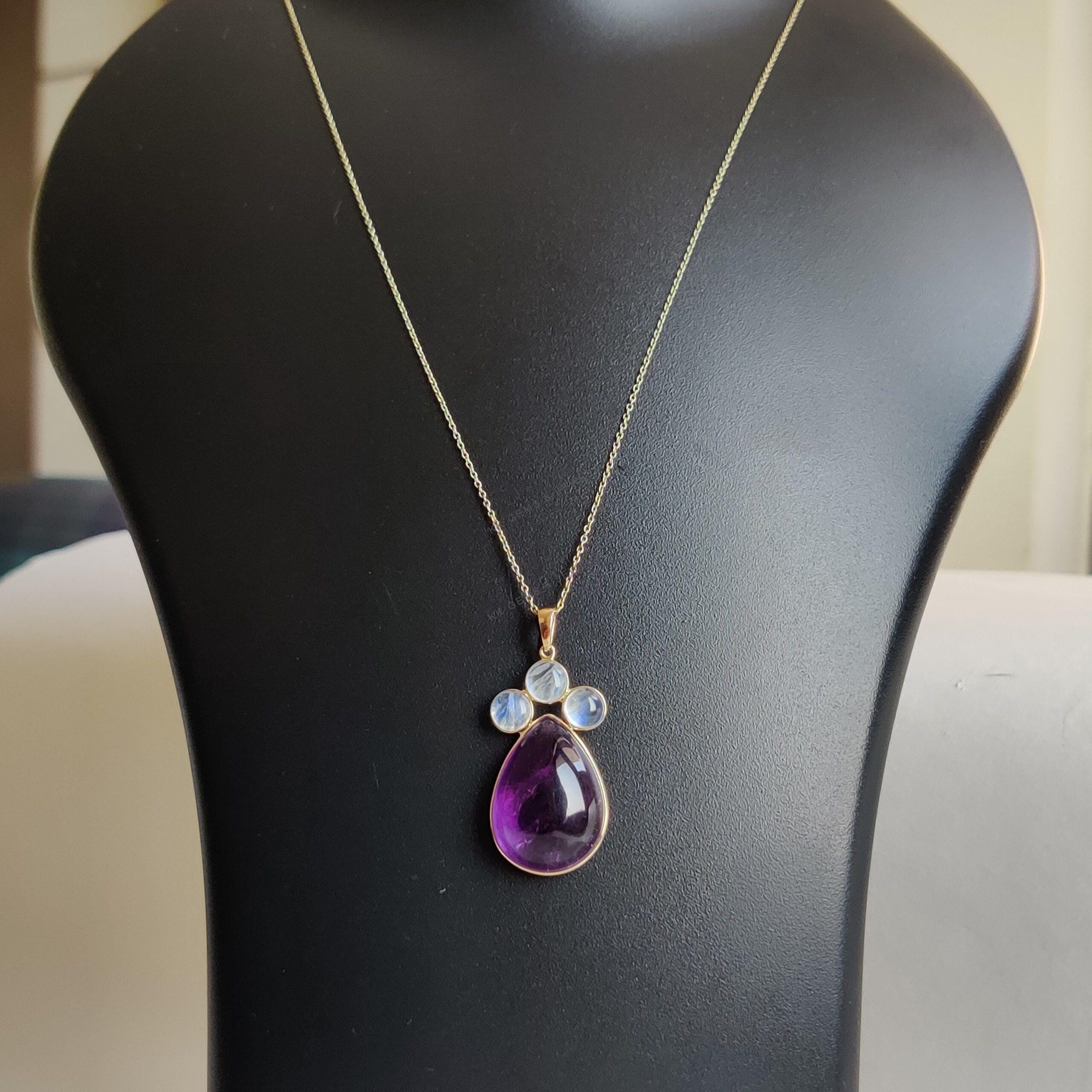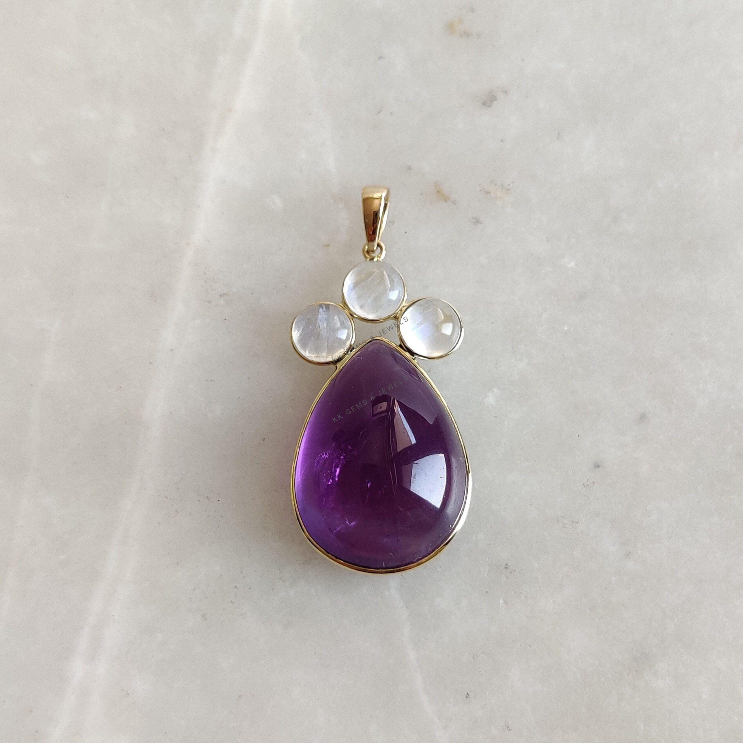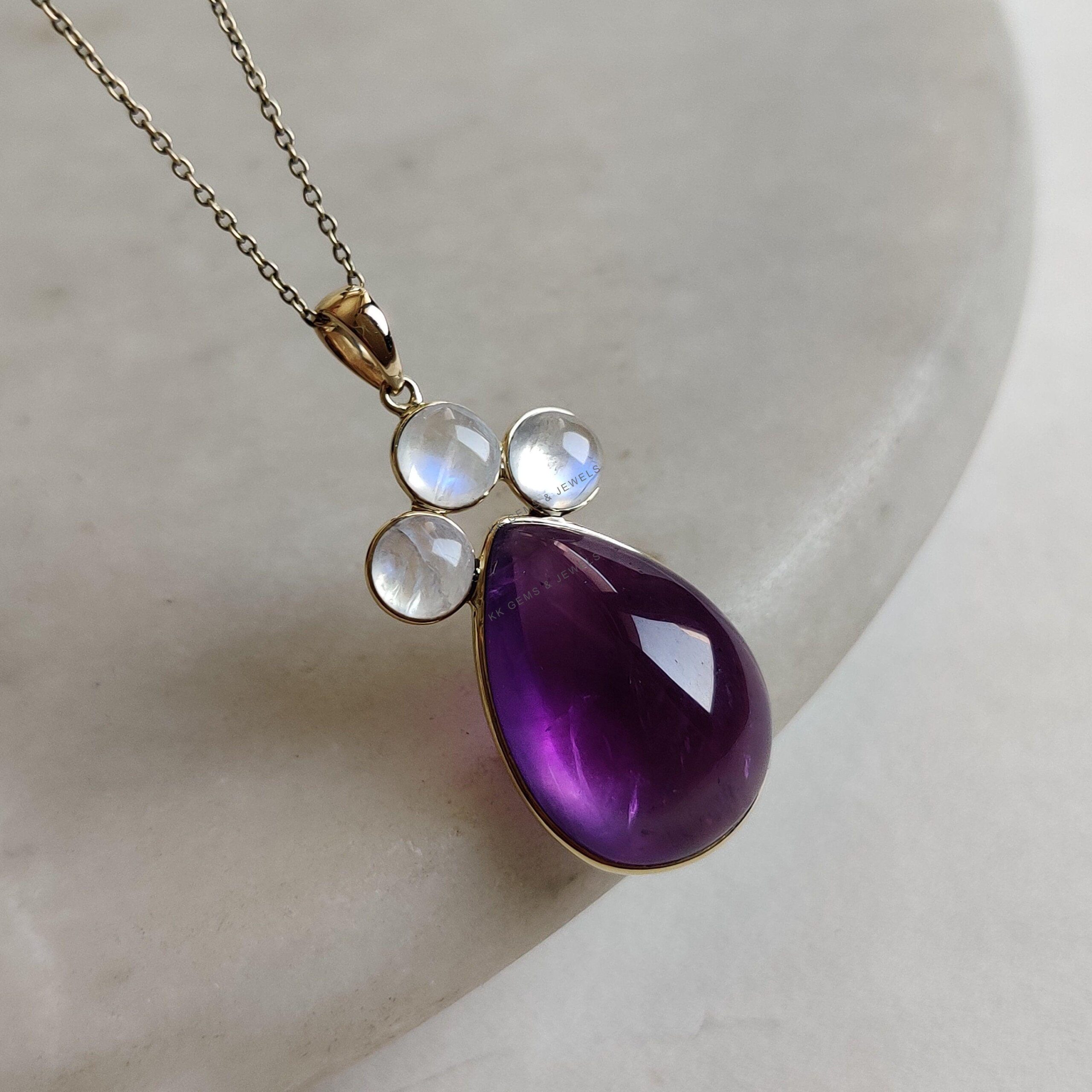 This stunning pendant is set in 14K Solid Yellow Gold with Natural Purple Amethyst with Rainbow Moonstone with utmost precision. It is an unique gemstone pendant for nearly every occasion and is completely hassle-free jewelry.