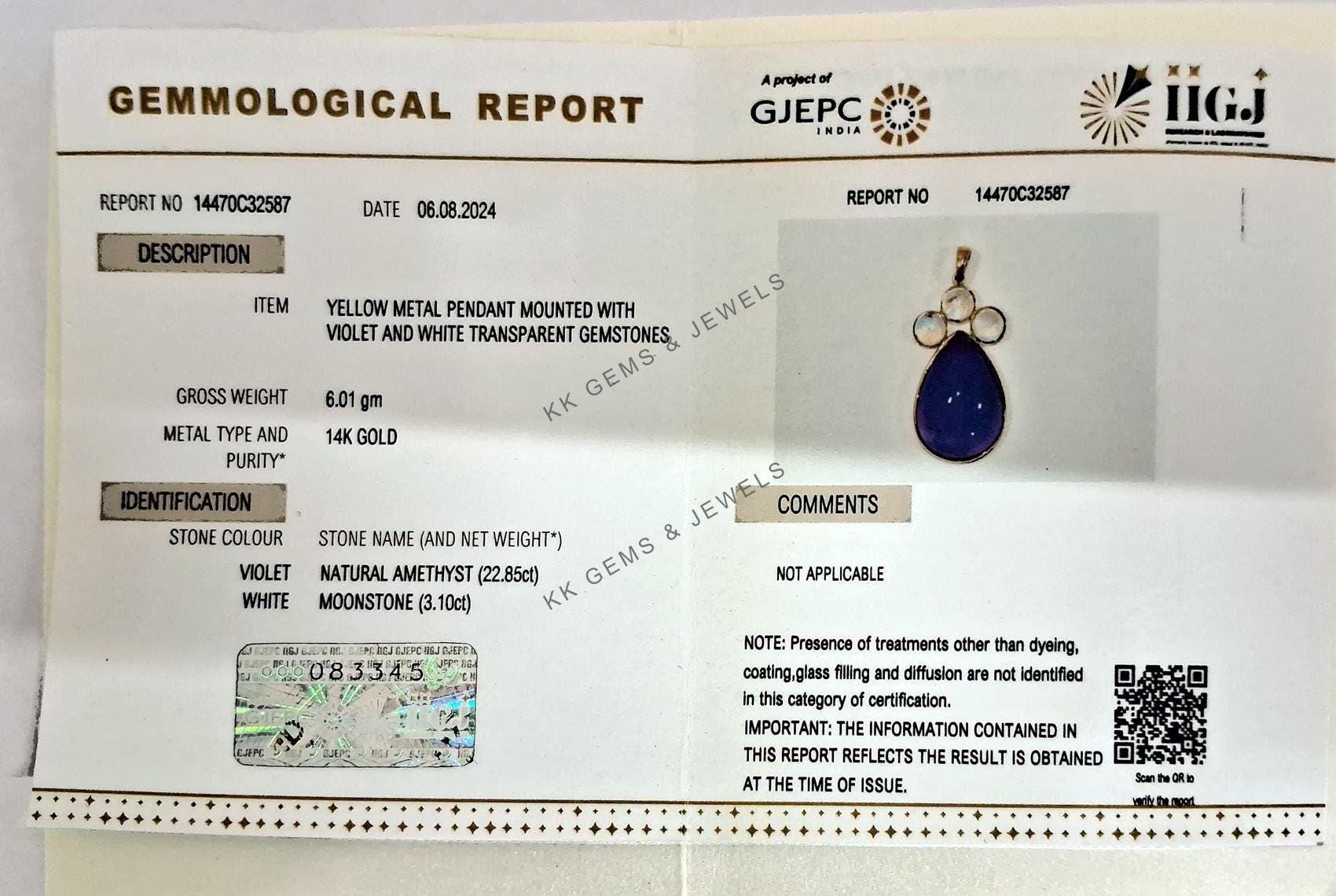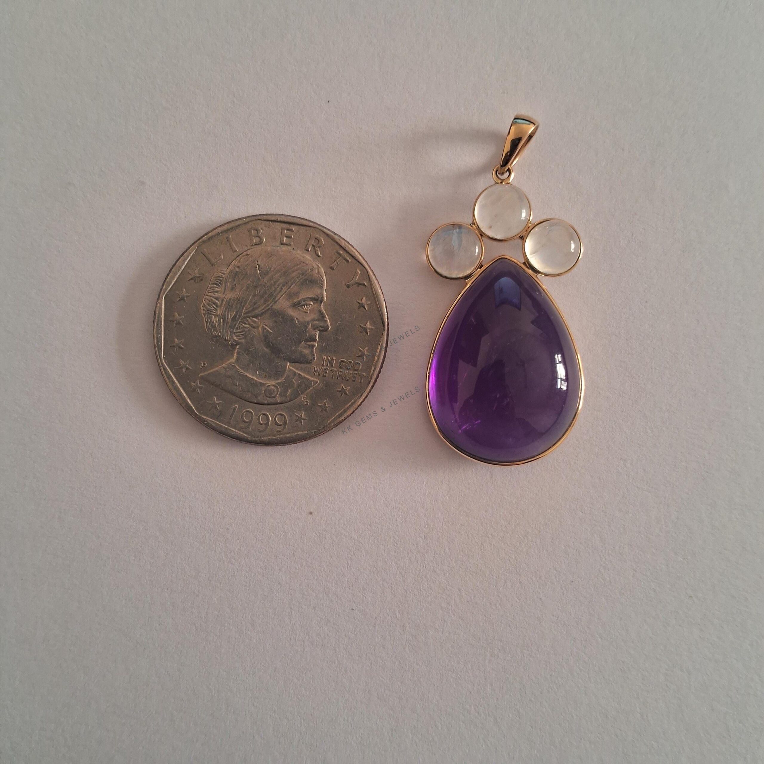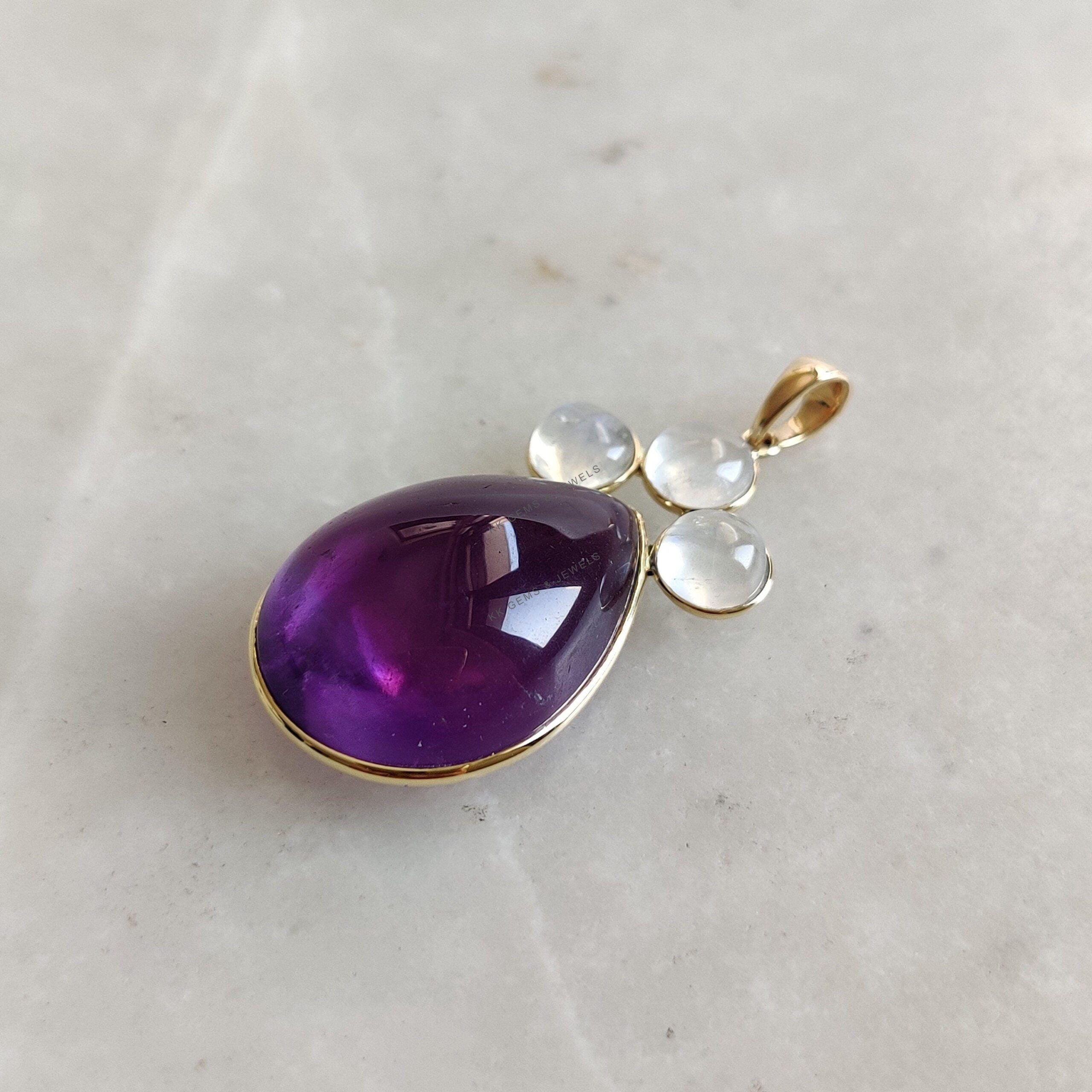 This stunning pendant is set in 14K Solid Yellow Gold with Natural Purple Amethyst with Rainbow Moonstone with utmost precision. It is an unique gemstone pendant for nearly every occasion and is completely hassle-free jewelry.