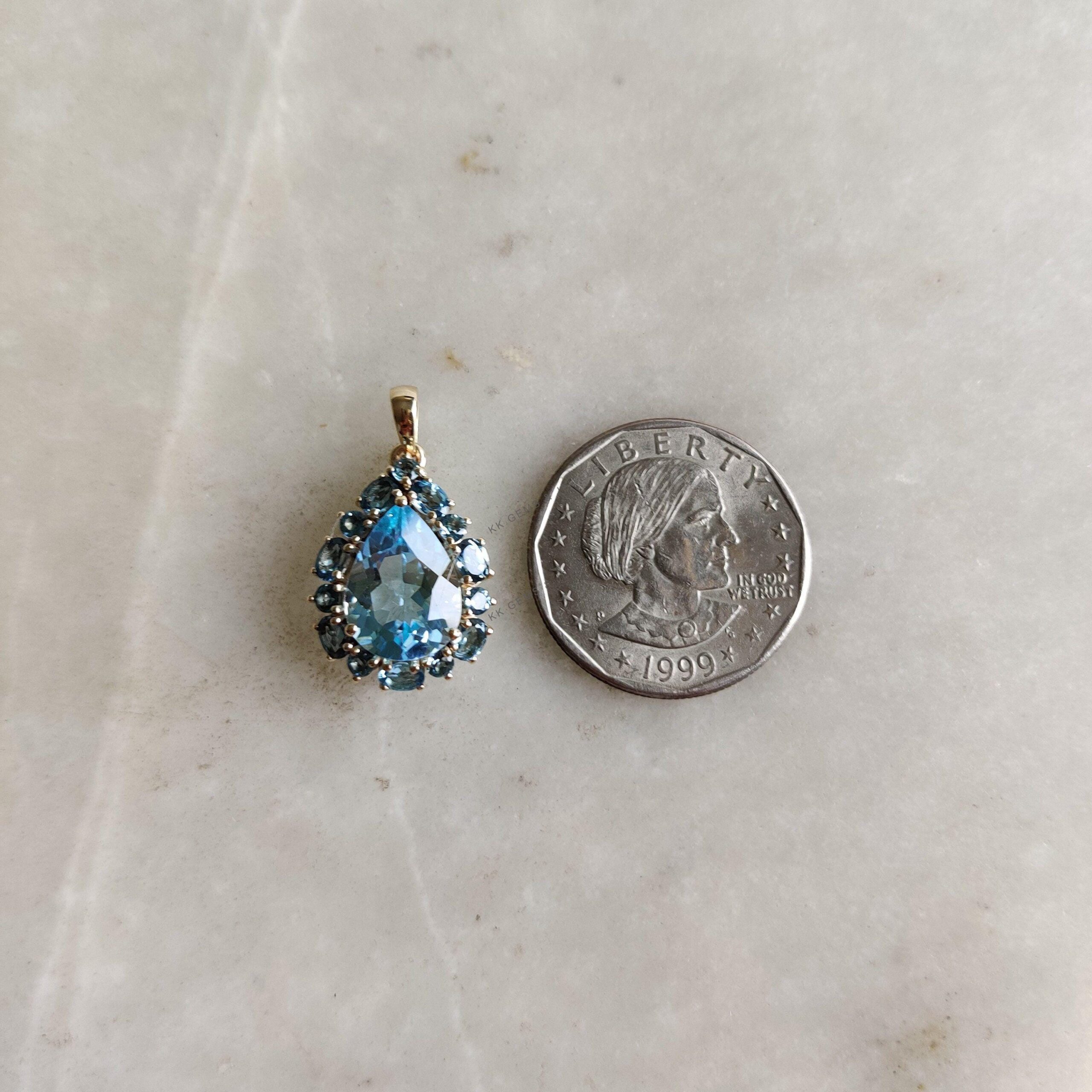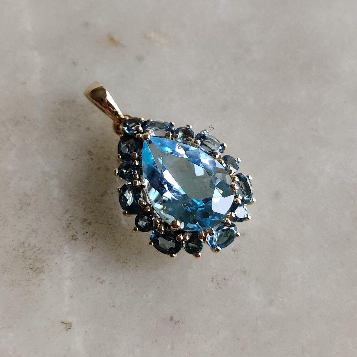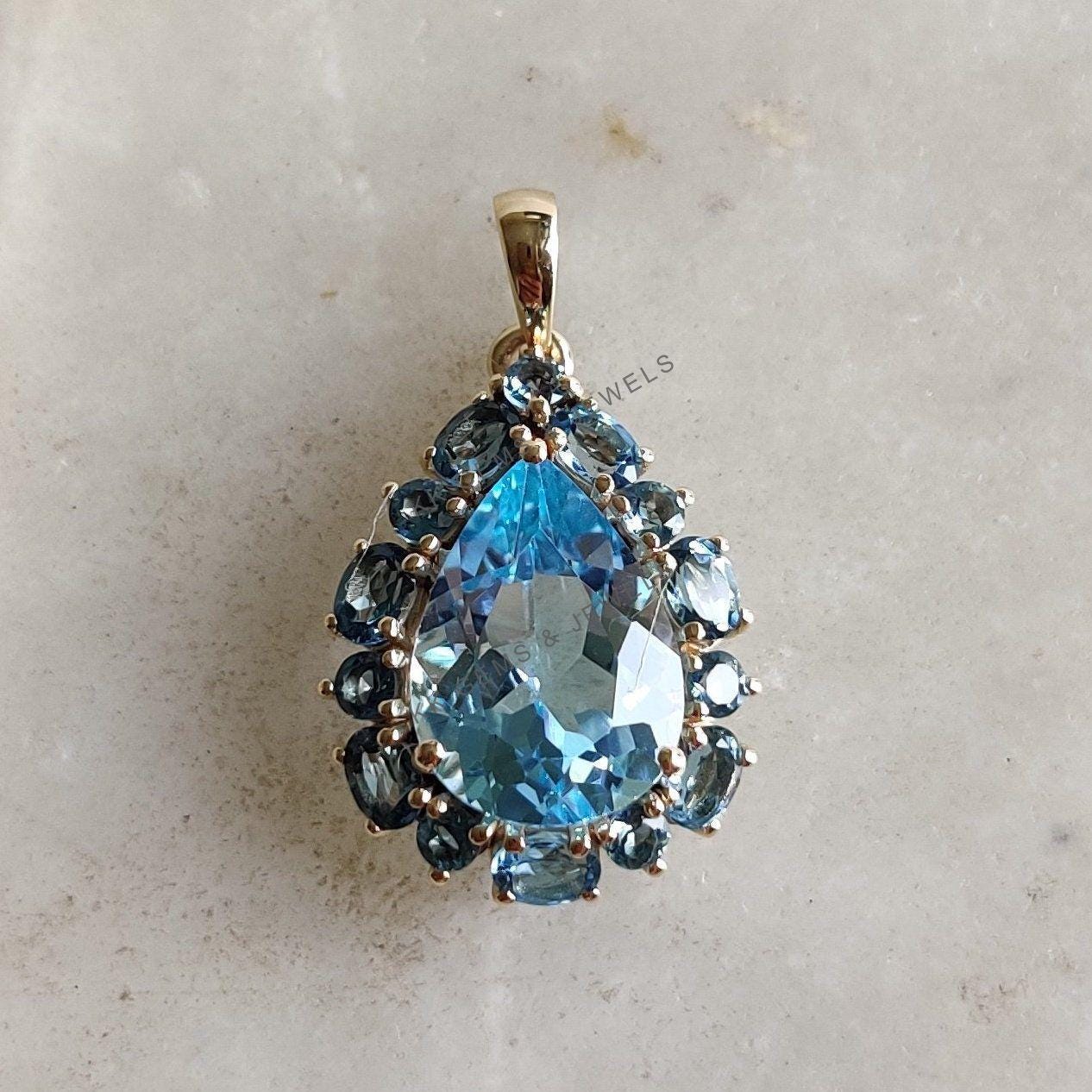 Pear Cut Natural Blue Topaz Multi Stone Pendant Set in 14K Solid Gold