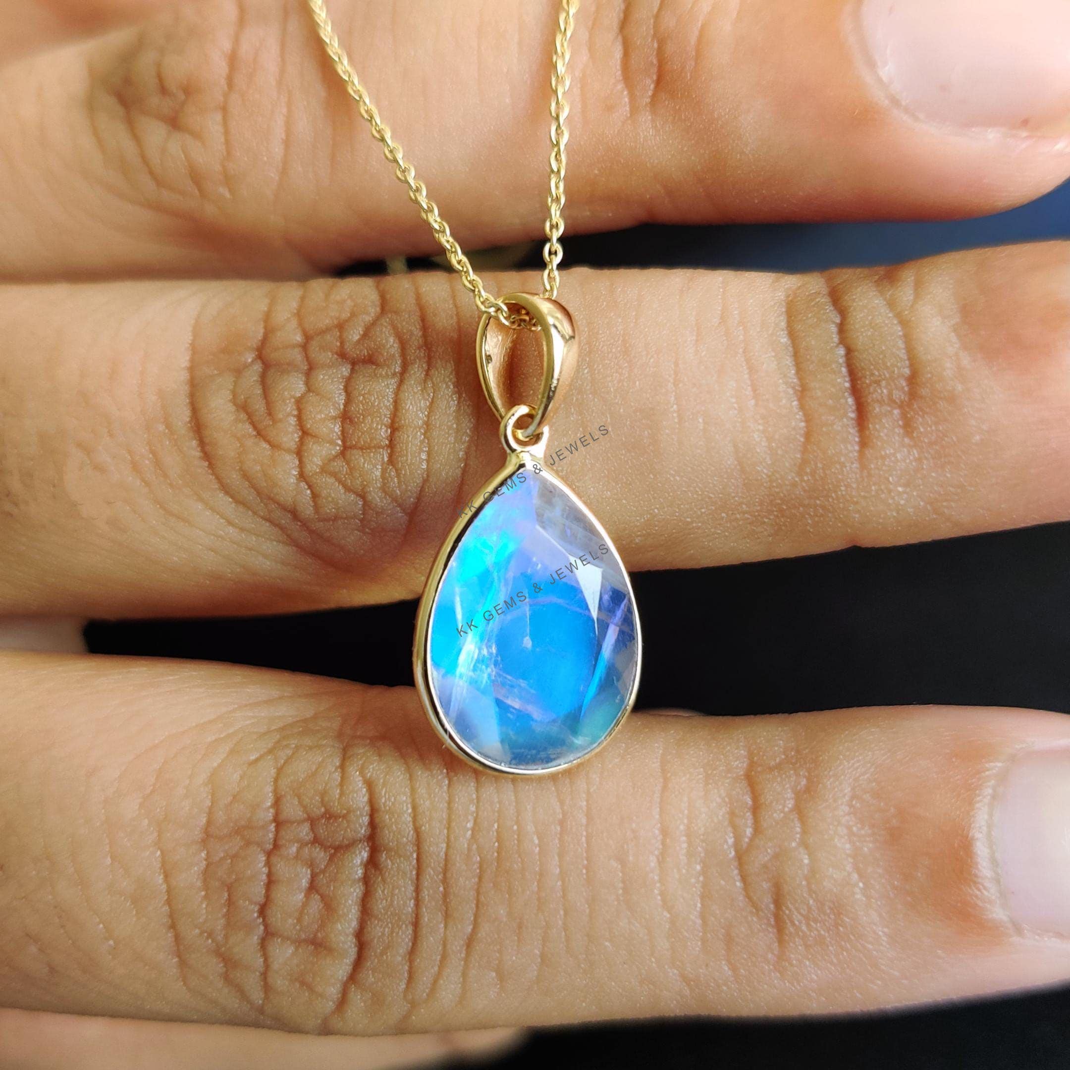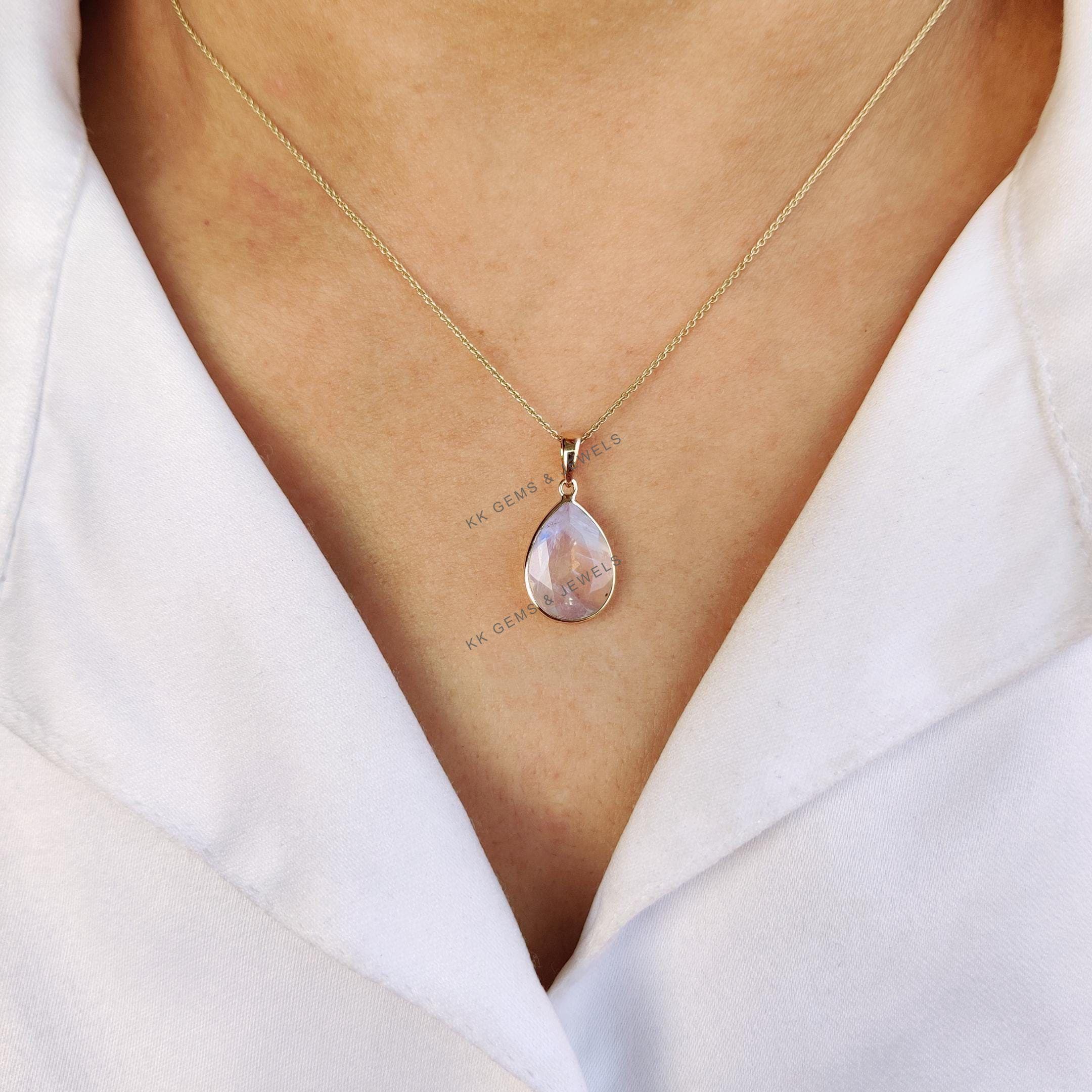 Pear Cut Natural Rainbow Moonstone Birthstone Pendant Set in 14K Solid Gold