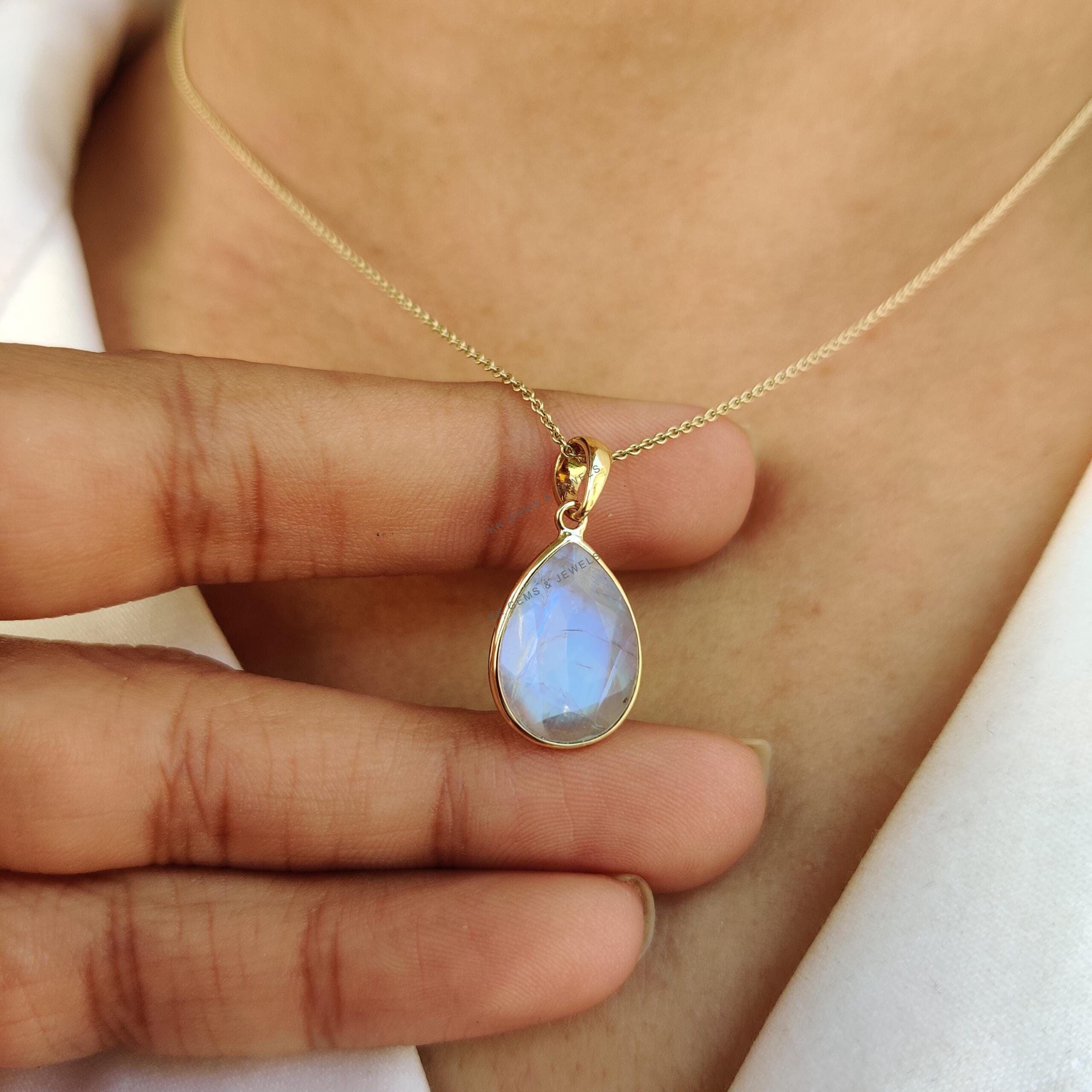 1 review for Pear Cut Natural Rainbow Moonstone Birthstone Pendant Set in 14K Solid Gold