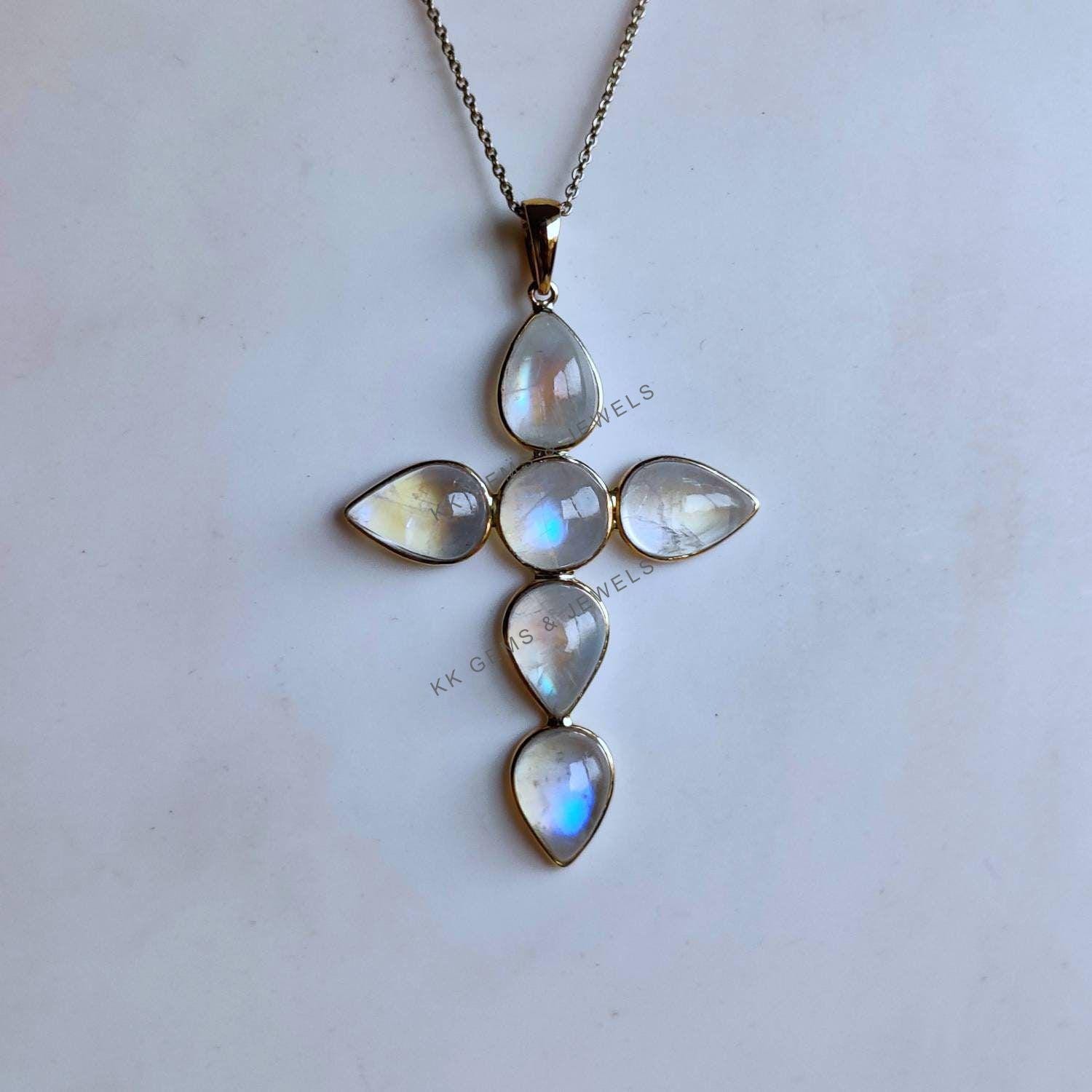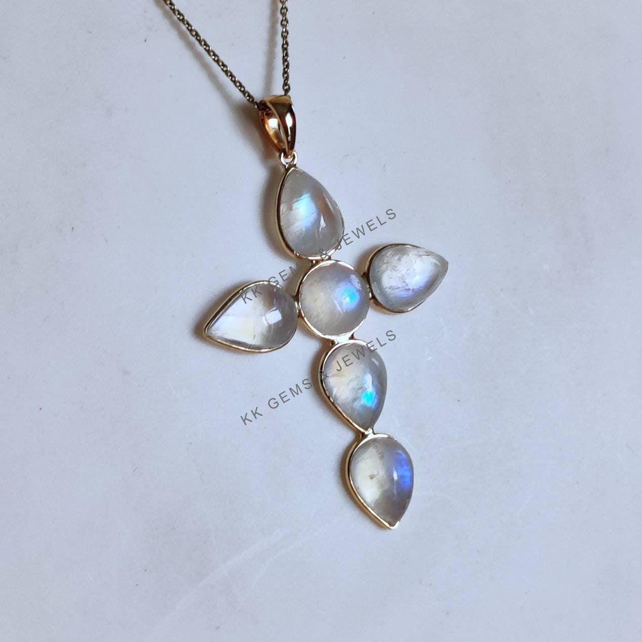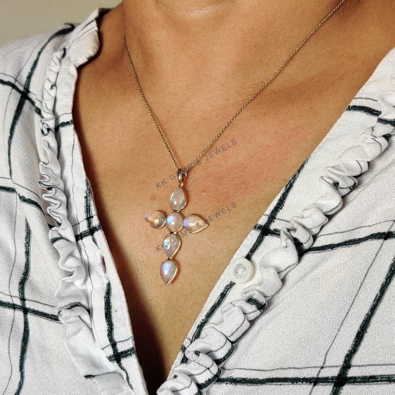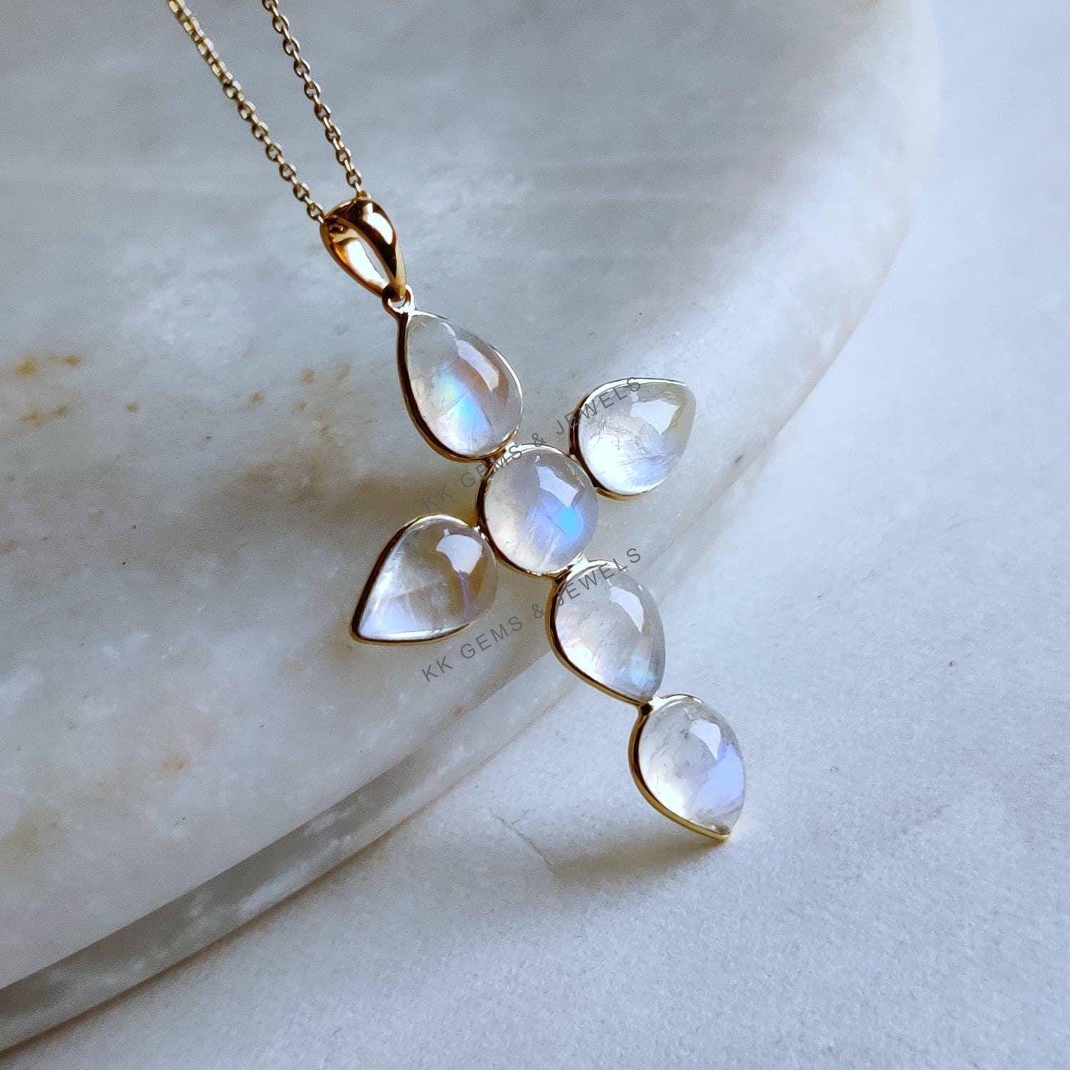 3 reviews for Natural Rainbow Moonstone Cross Pendant, Set in 14K Solid Gold, June Birthstone Pendant