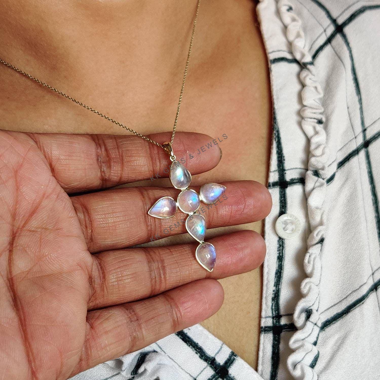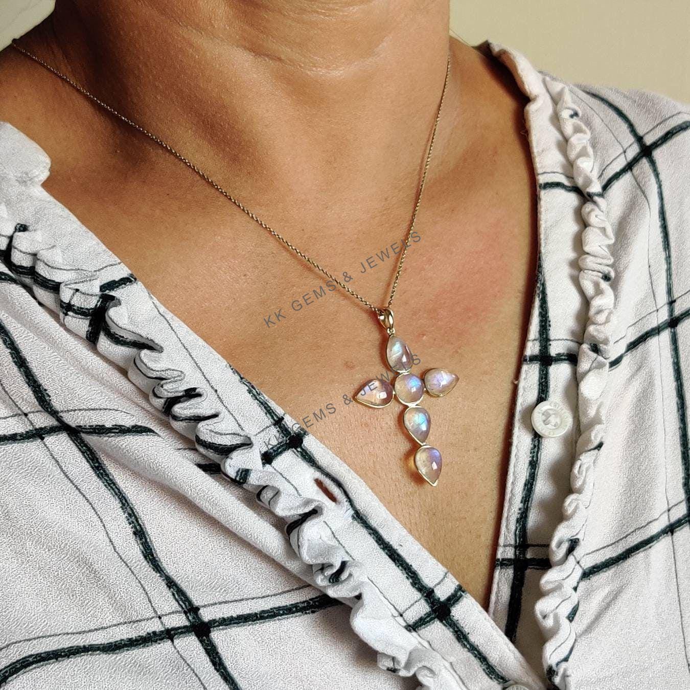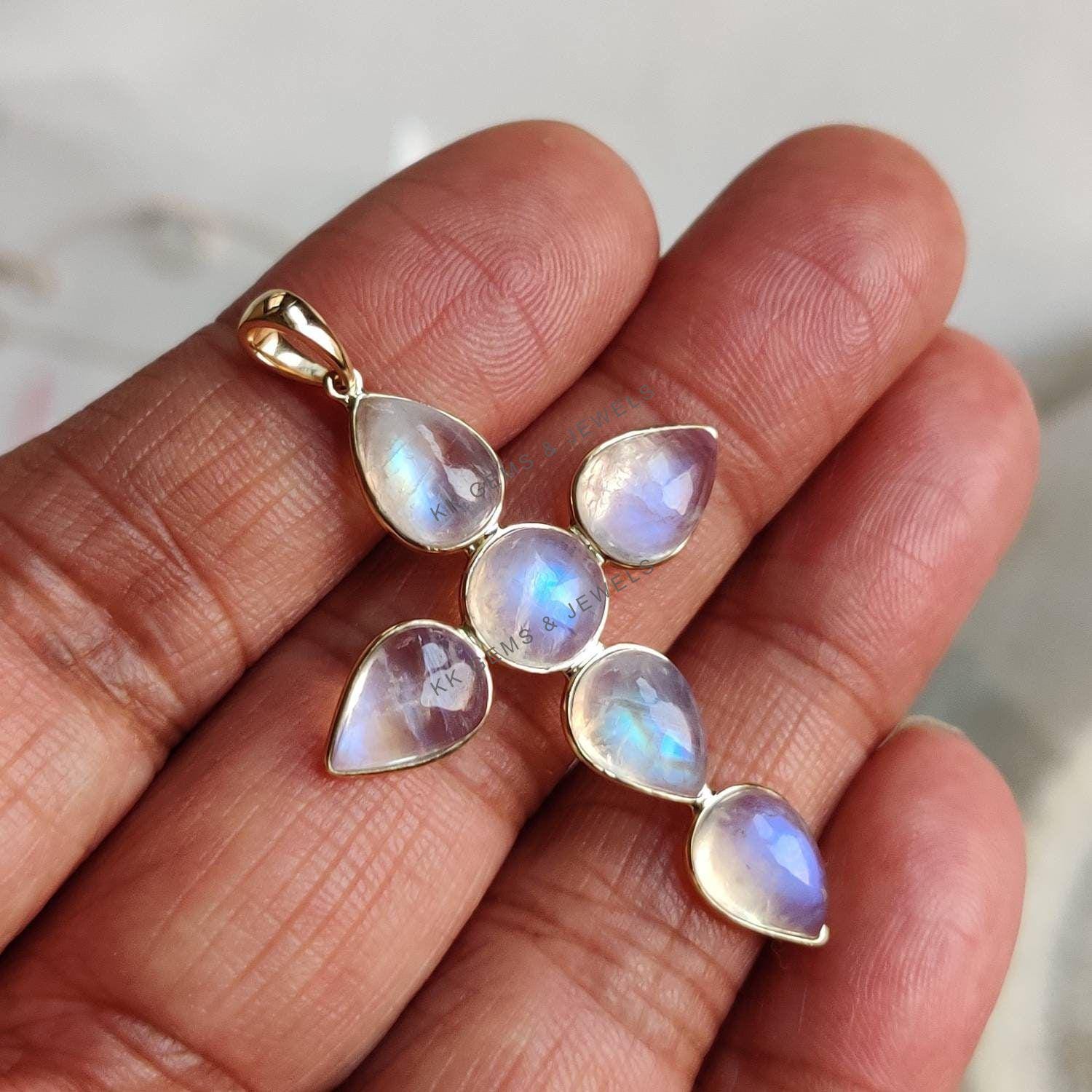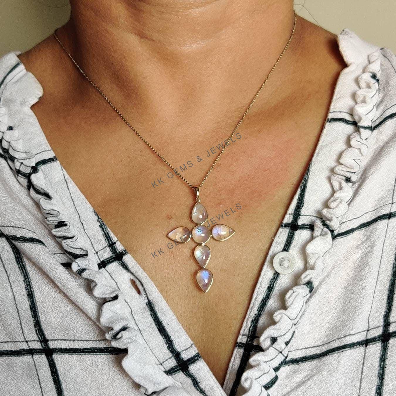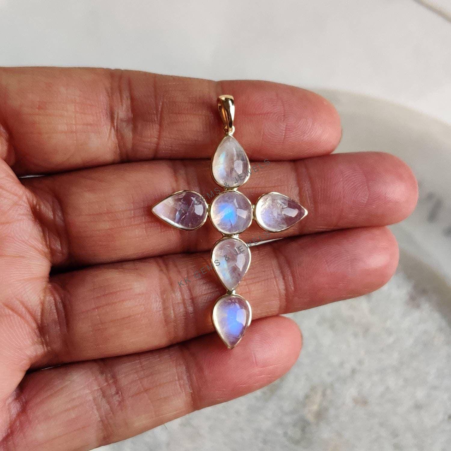 3 reviews for Natural Rainbow Moonstone Cross Pendant, Set in 14K Solid Gold, June Birthstone Pendant