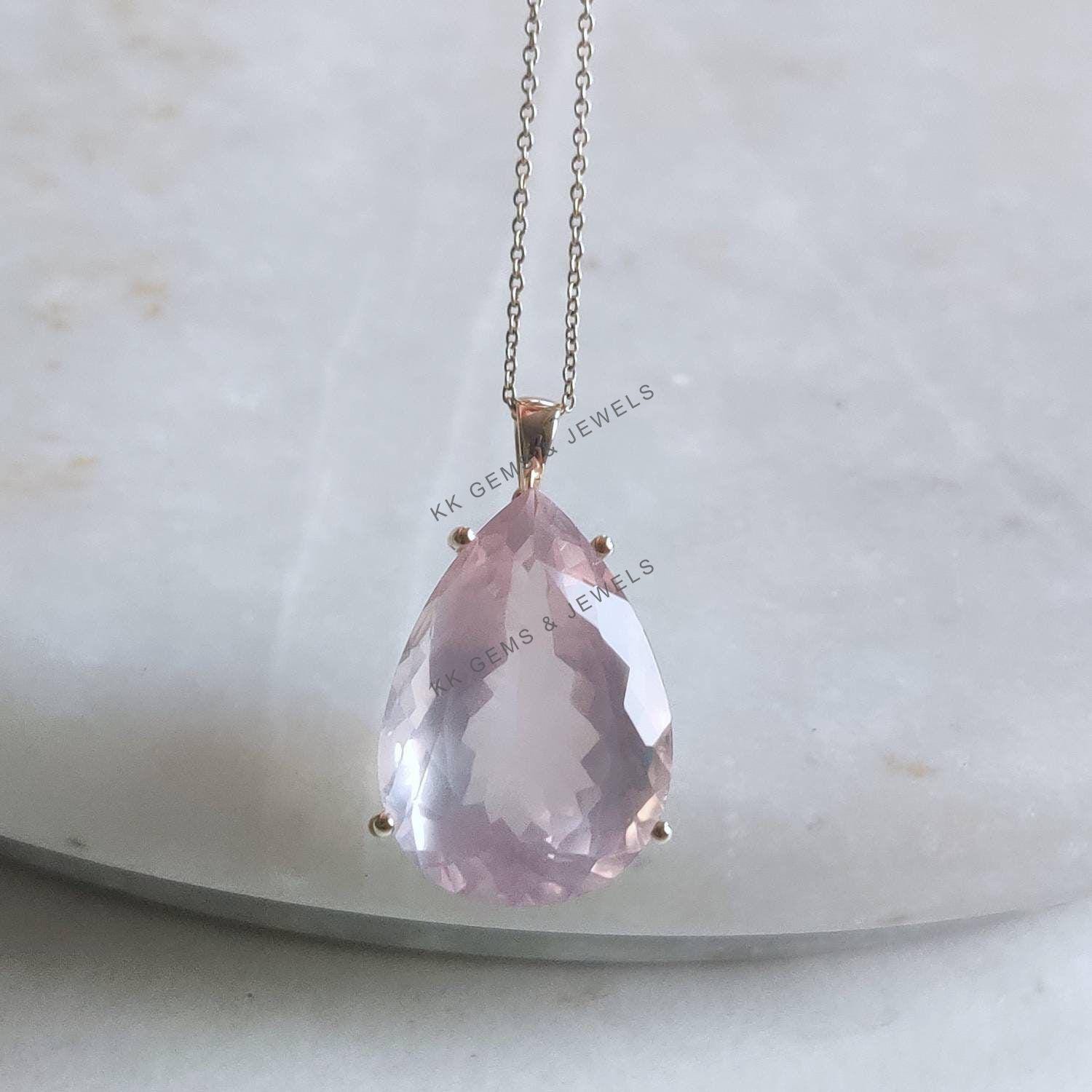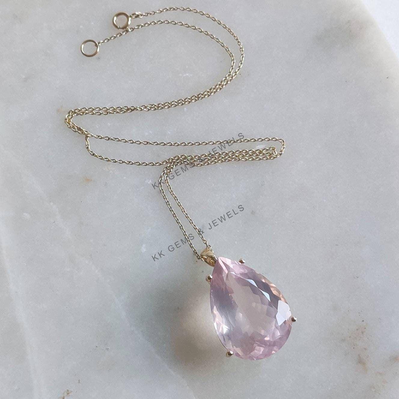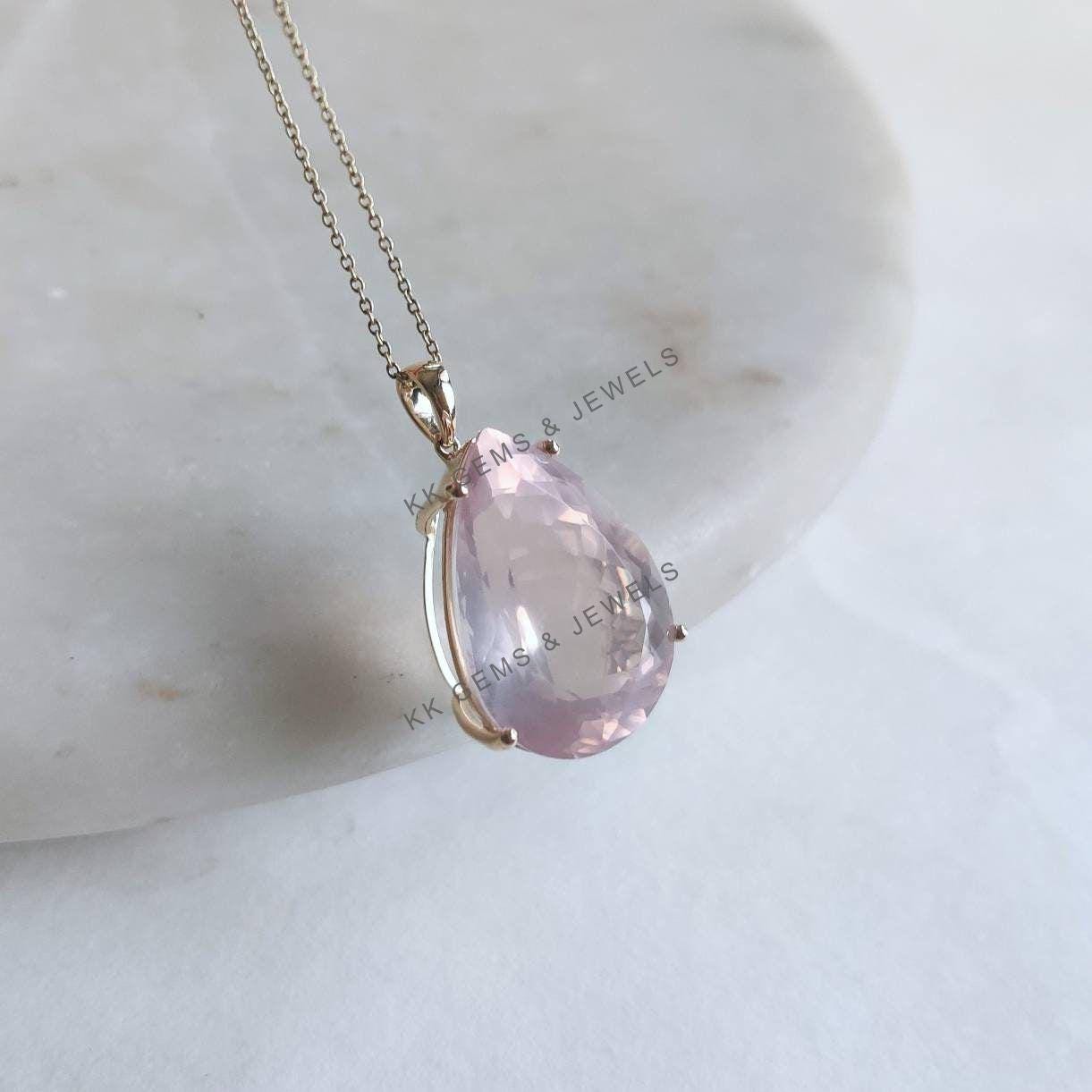 Pear Cut Natural Rose Quartz Birthstone Pendant, Set in 14K Solid Gold