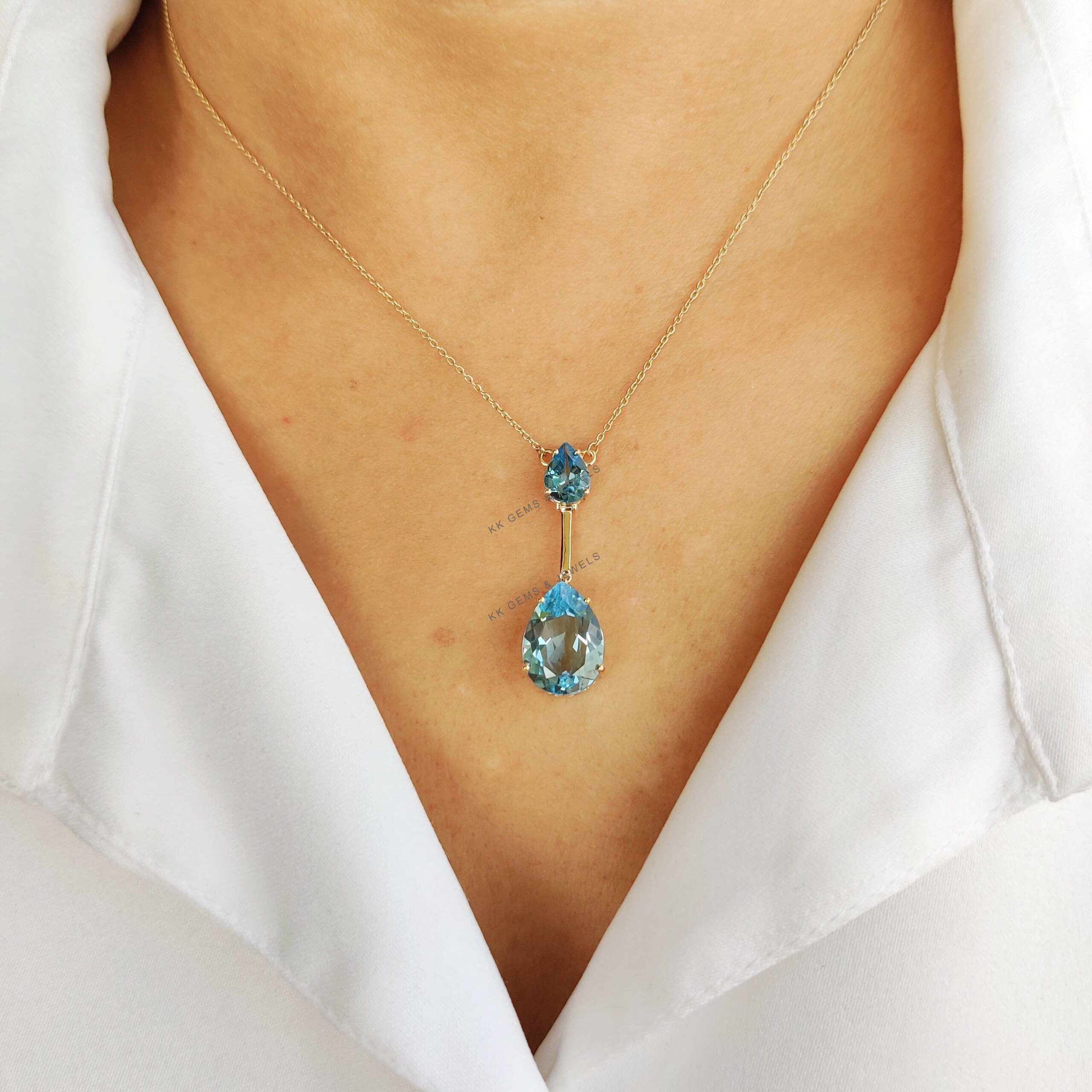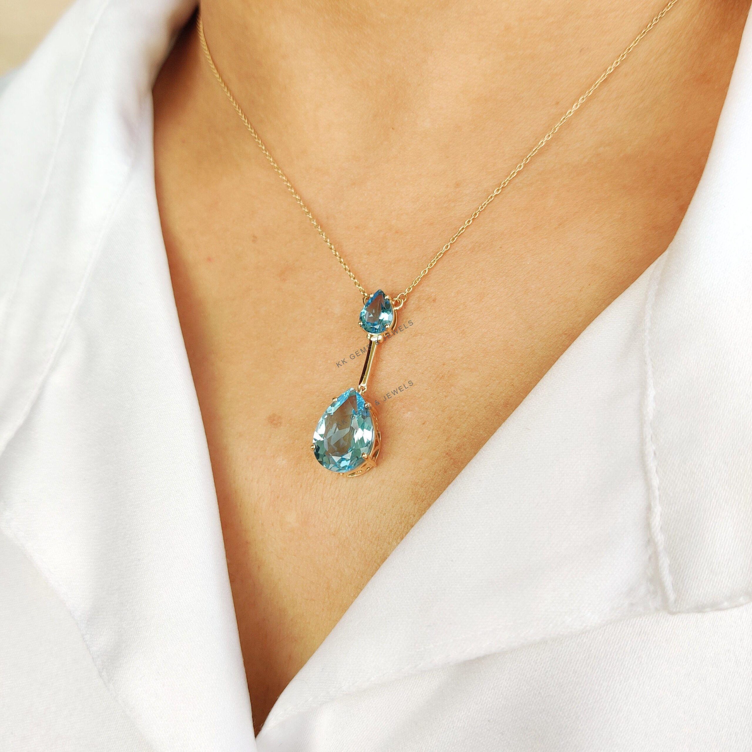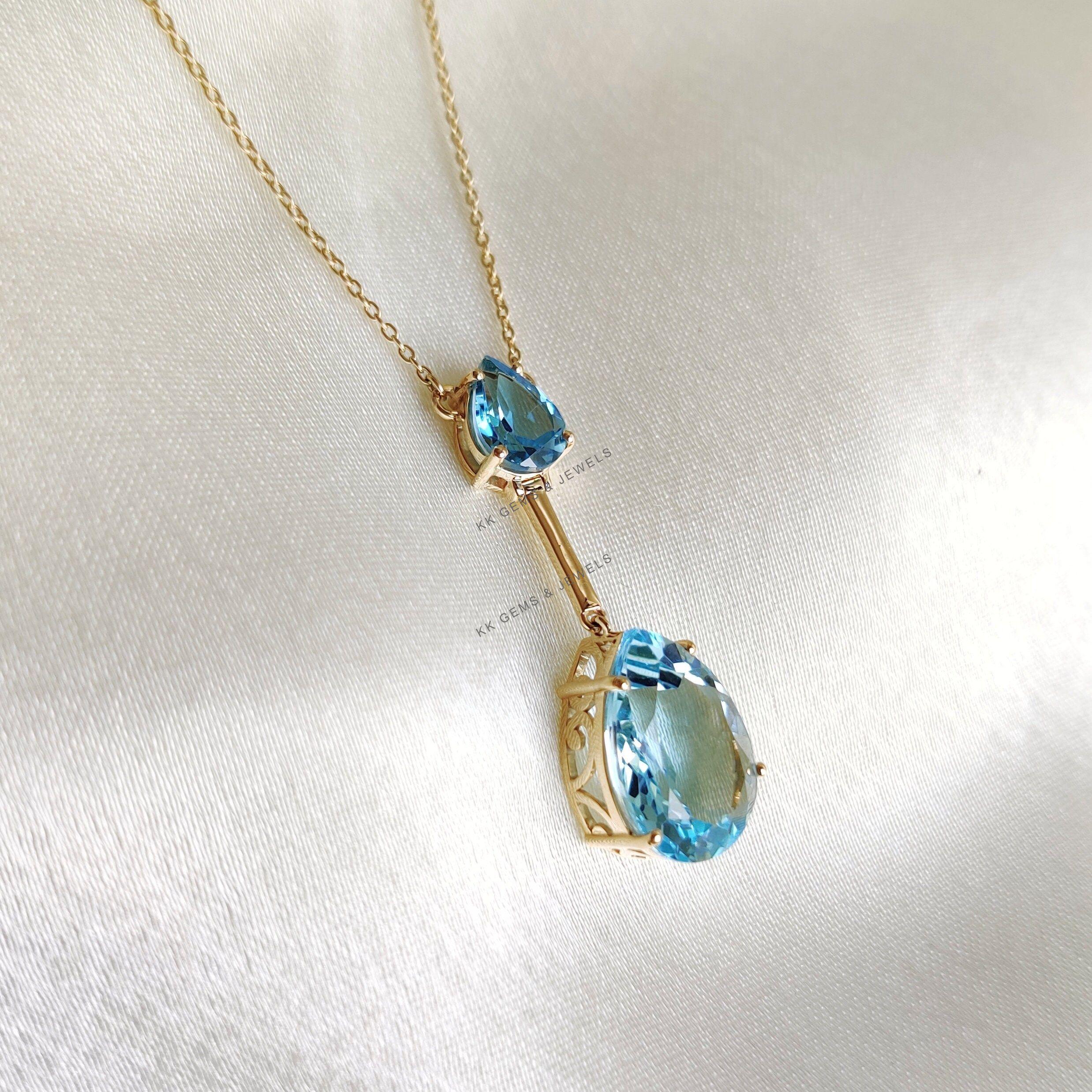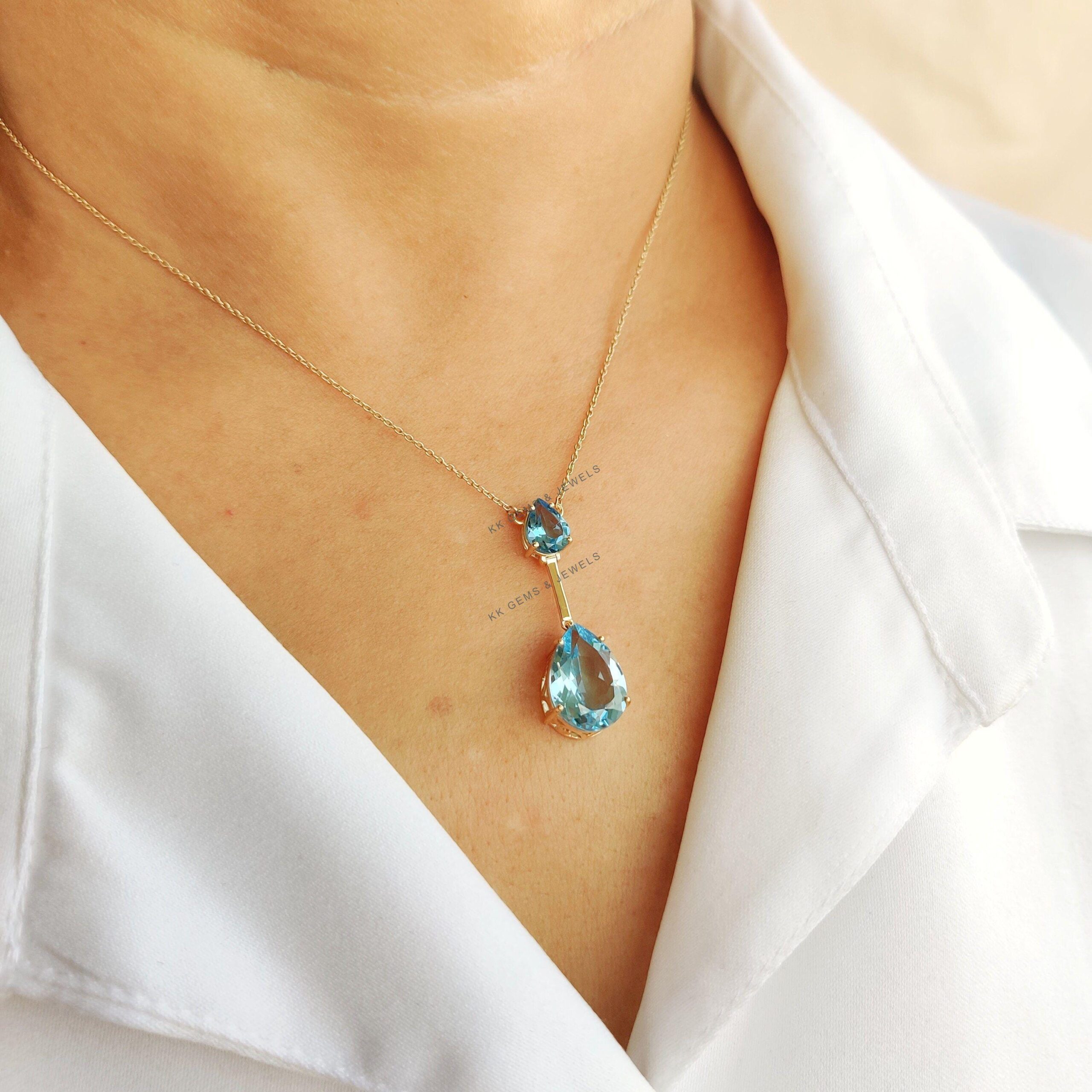 This stunning necklace is set in 14K Solid Yellow Gold with Natural Sky Blue Topaz gemstones. It is an unique minimalist necklace and is therefore completely hassle-free jewelry. ✓ ABOUT GEMSTONE Sky Blue Topaz is a mesmerizing gemstone admired for…