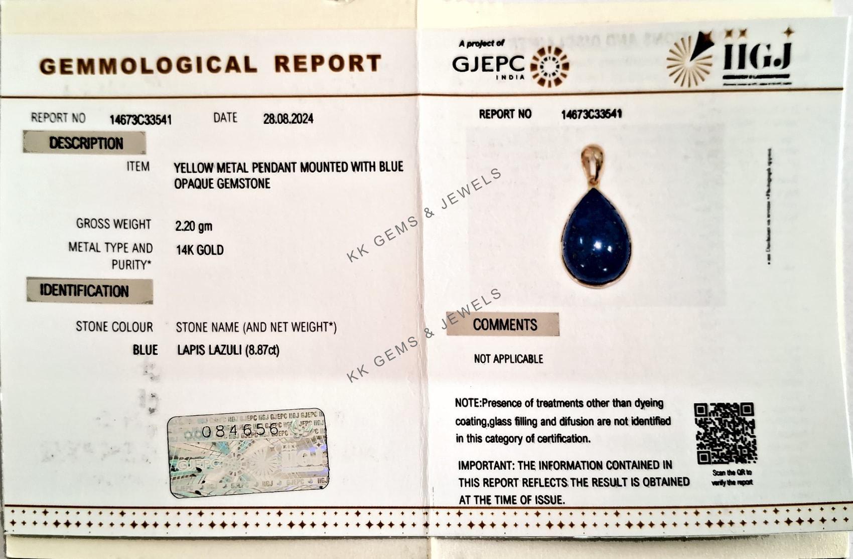 This stunning pendant is set in 14K Solid Yellow Gold with Natural Lapis Lazuli with utmost precision. It is an unique gemstone pendant for nearly every occasion and is completely hassle-free jewelry.