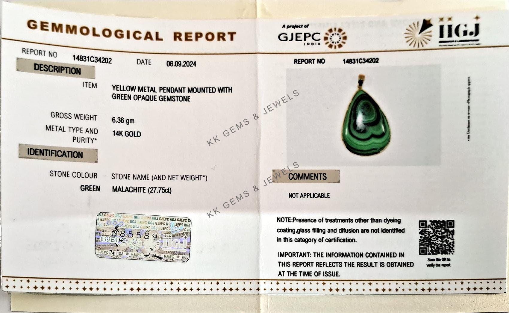 This stunning pendant is set in 14k Solid Yellow Gold with Natural Malachite with utmost precision. It is an unique gemstone pendant for nearly every occasion and is completely hassle-free jewelry.