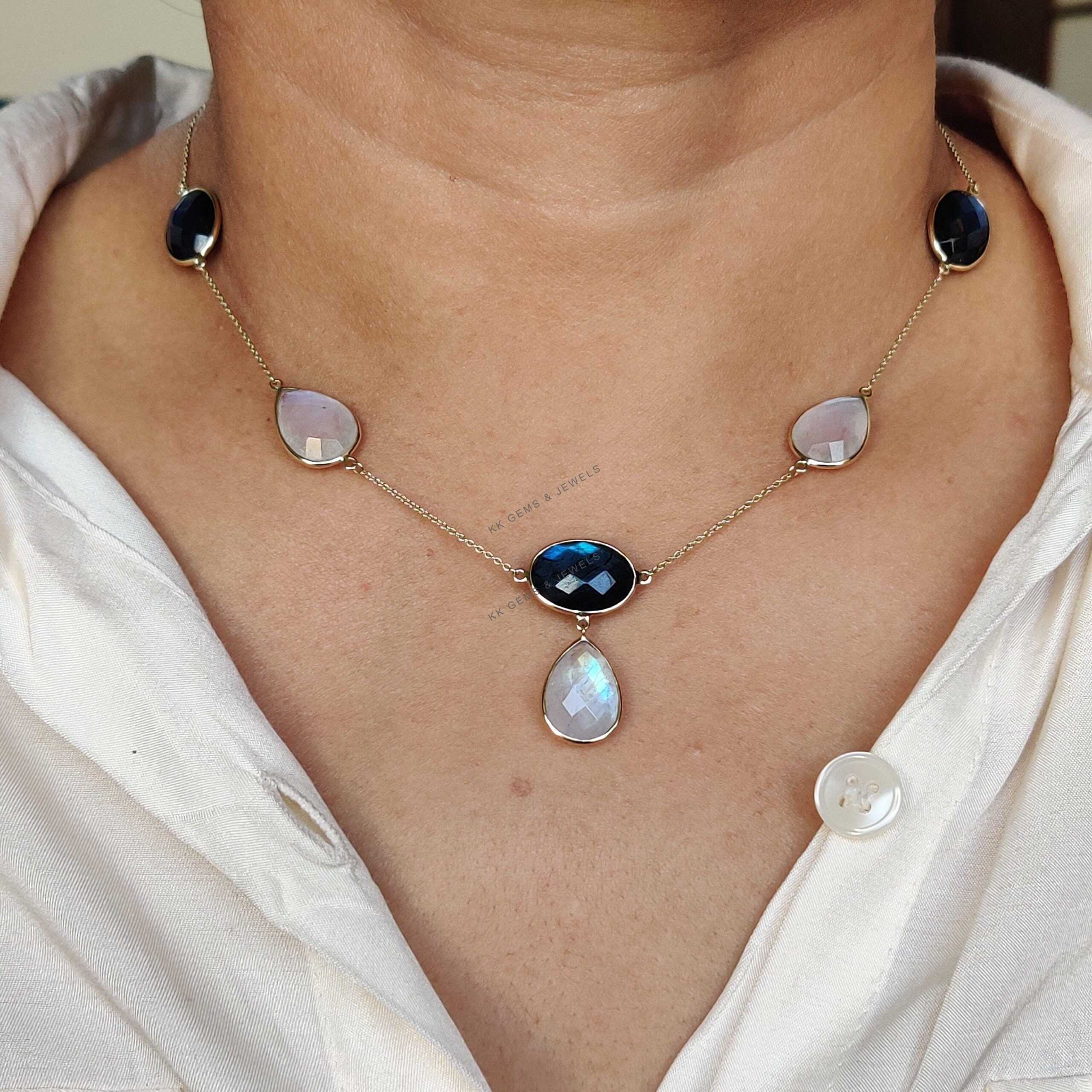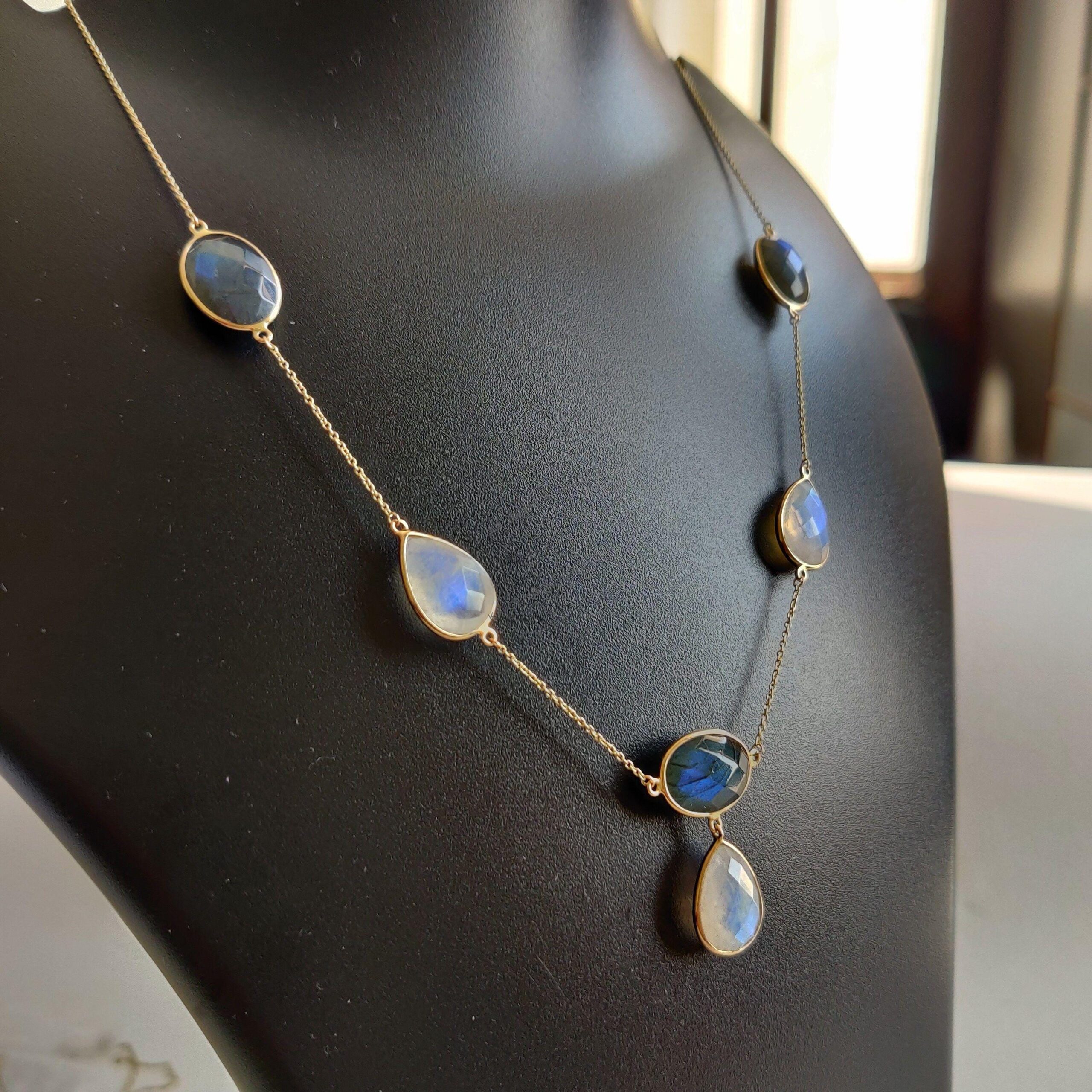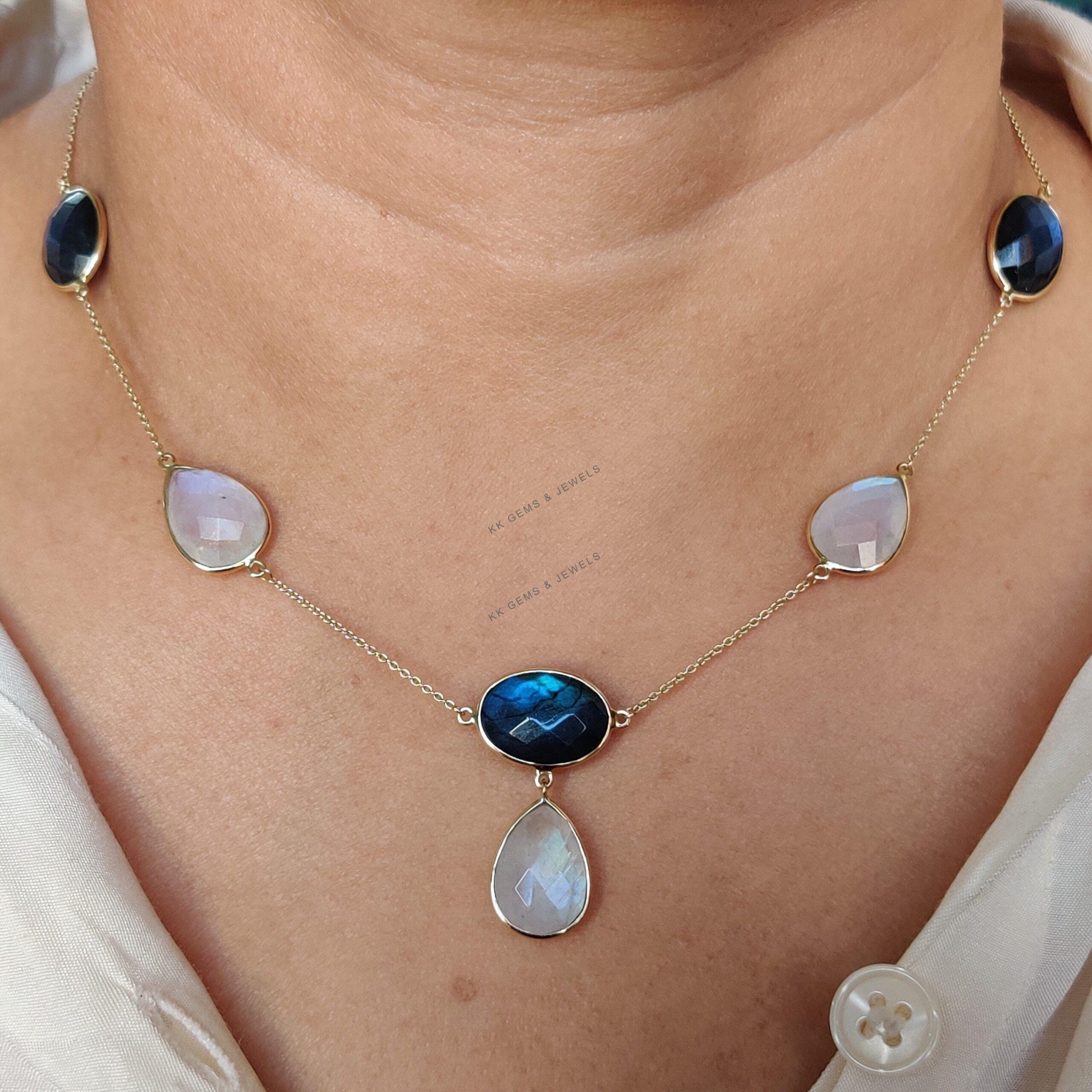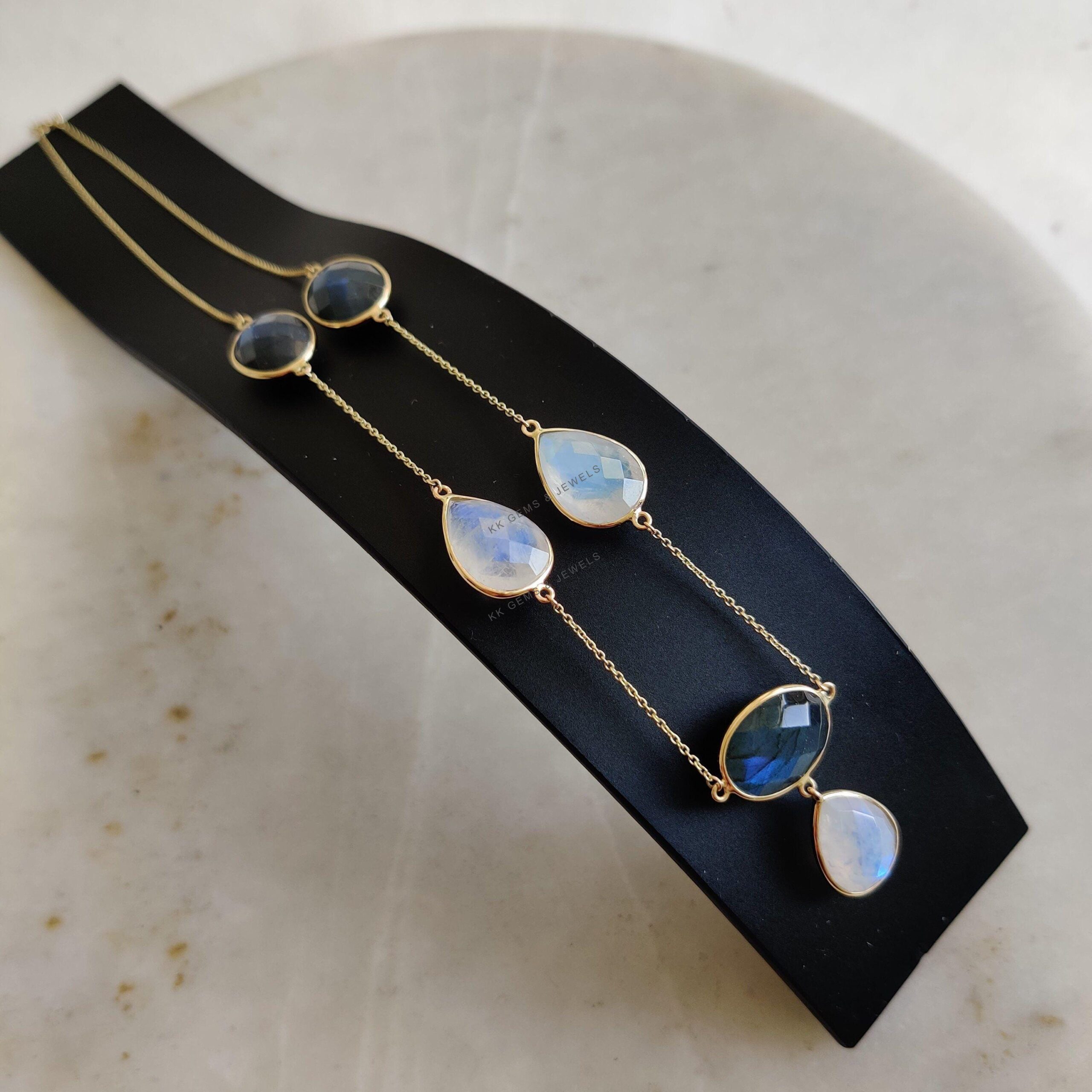 Natural Rainbow Moonstone Labradorite Necklace Set in 14K Solid Gold, June Birthstone