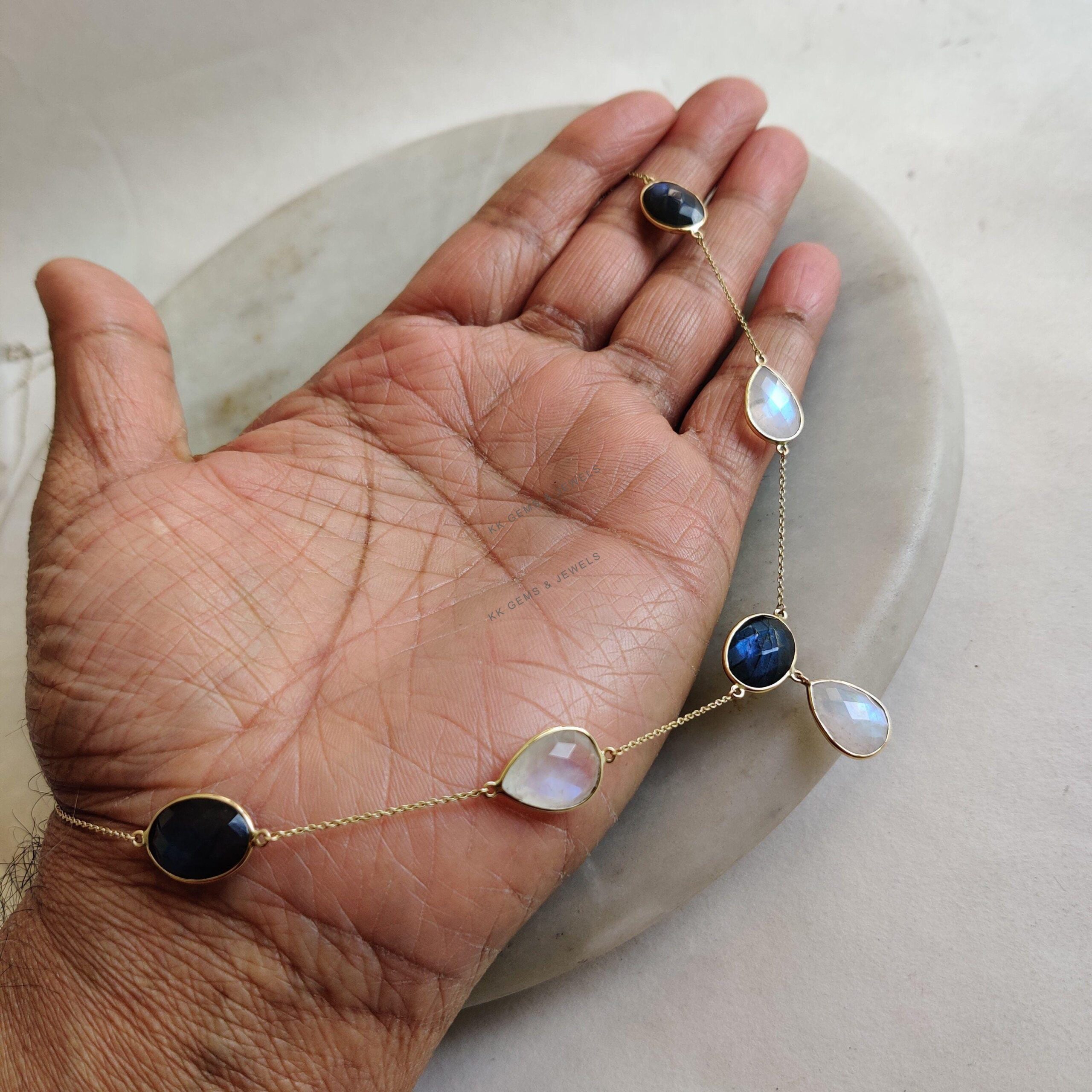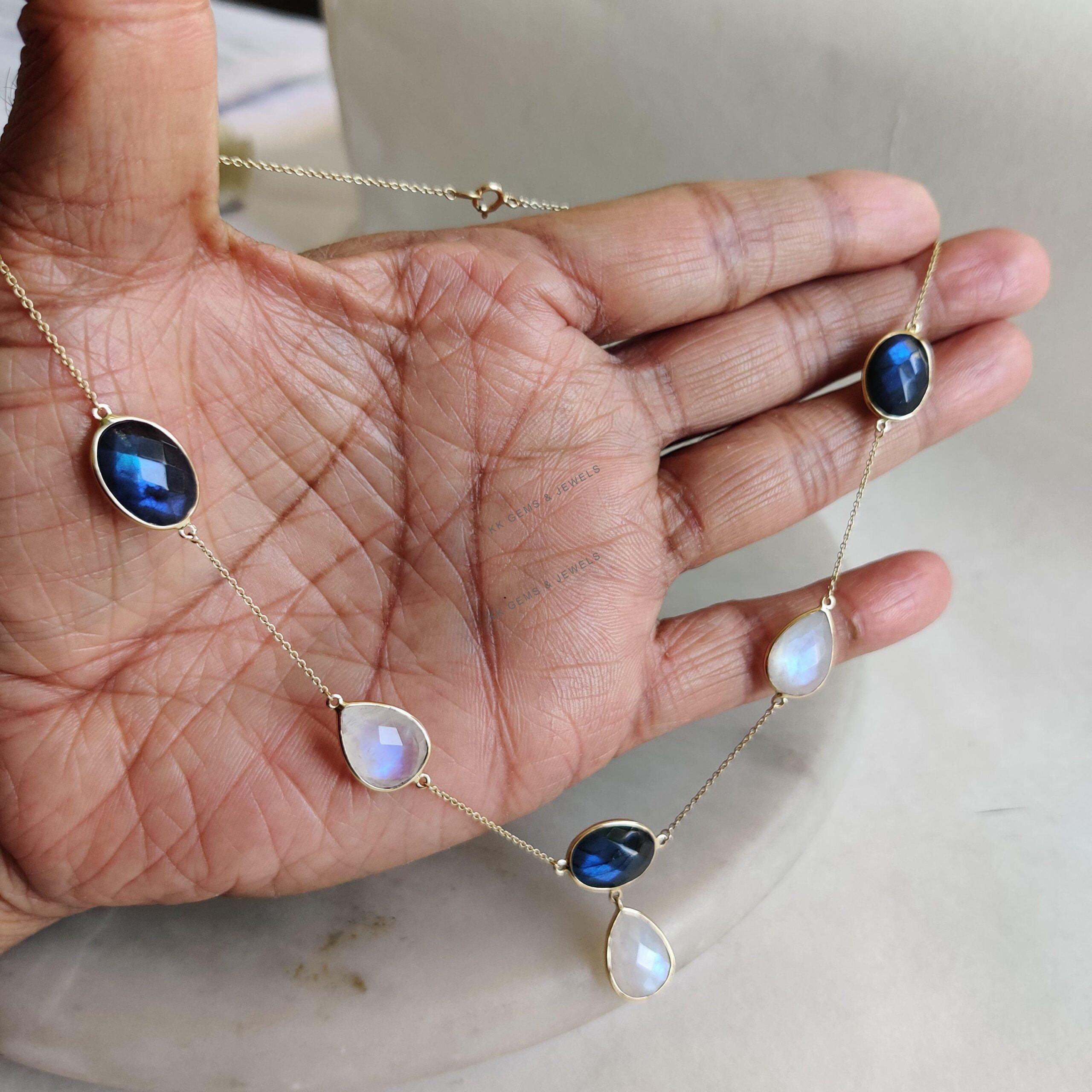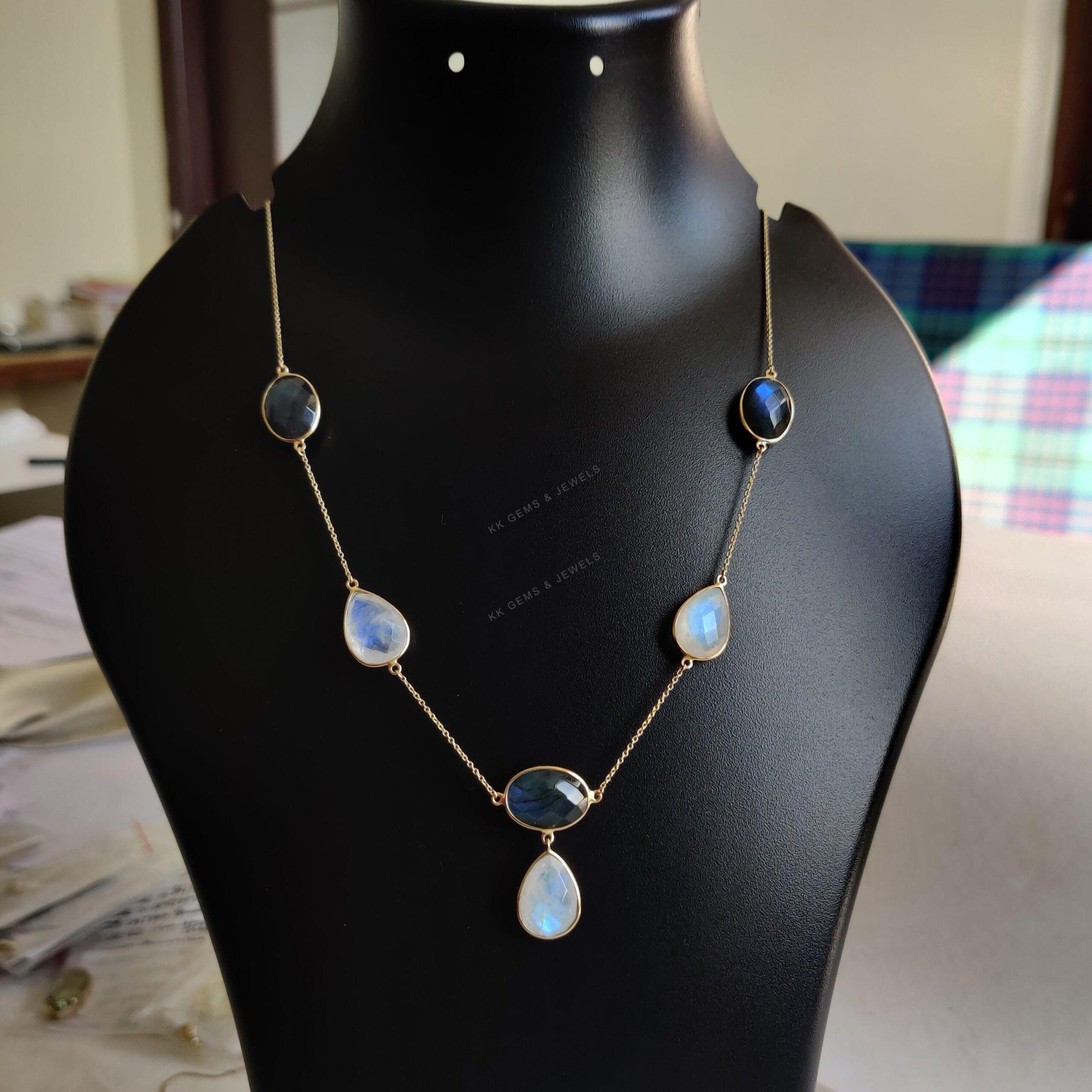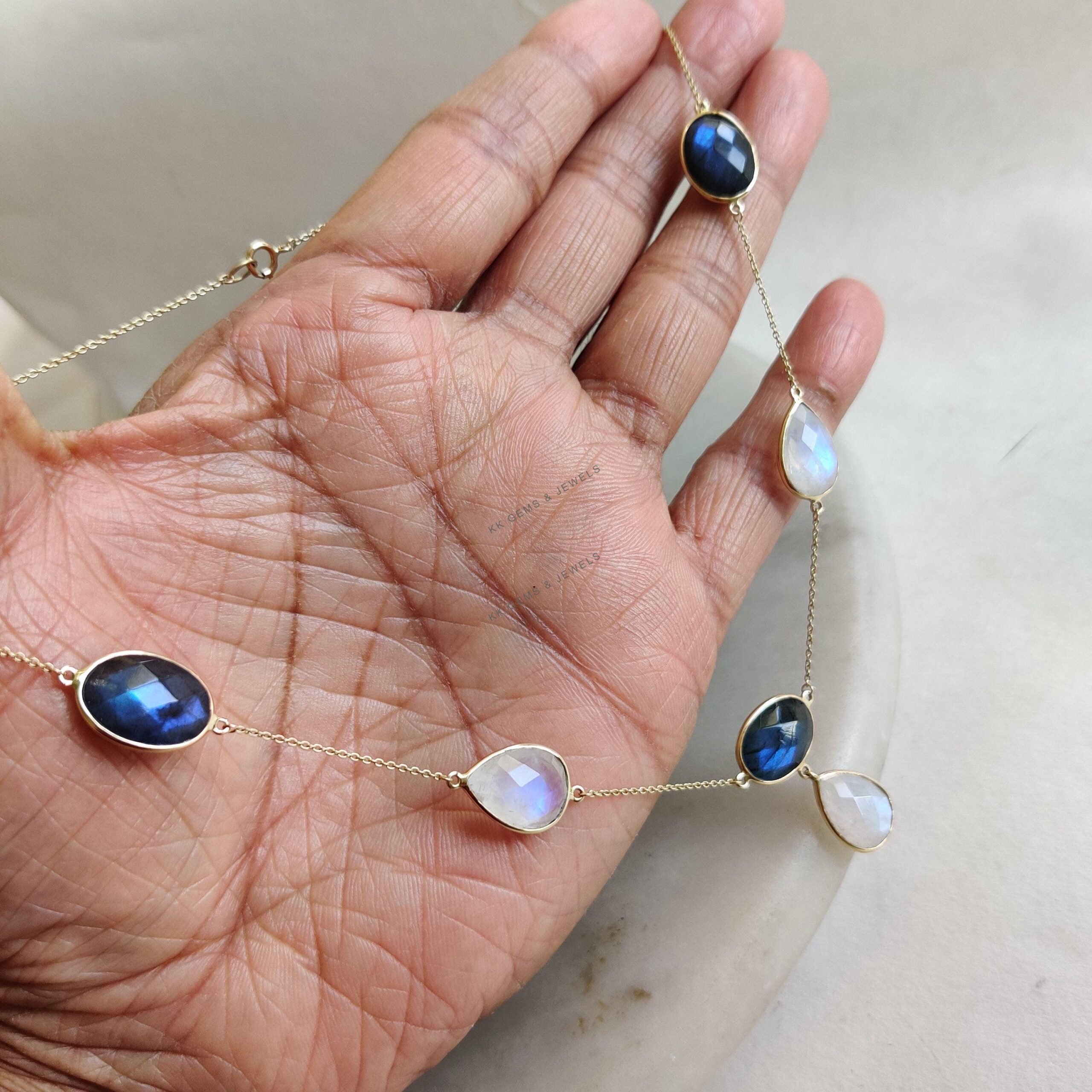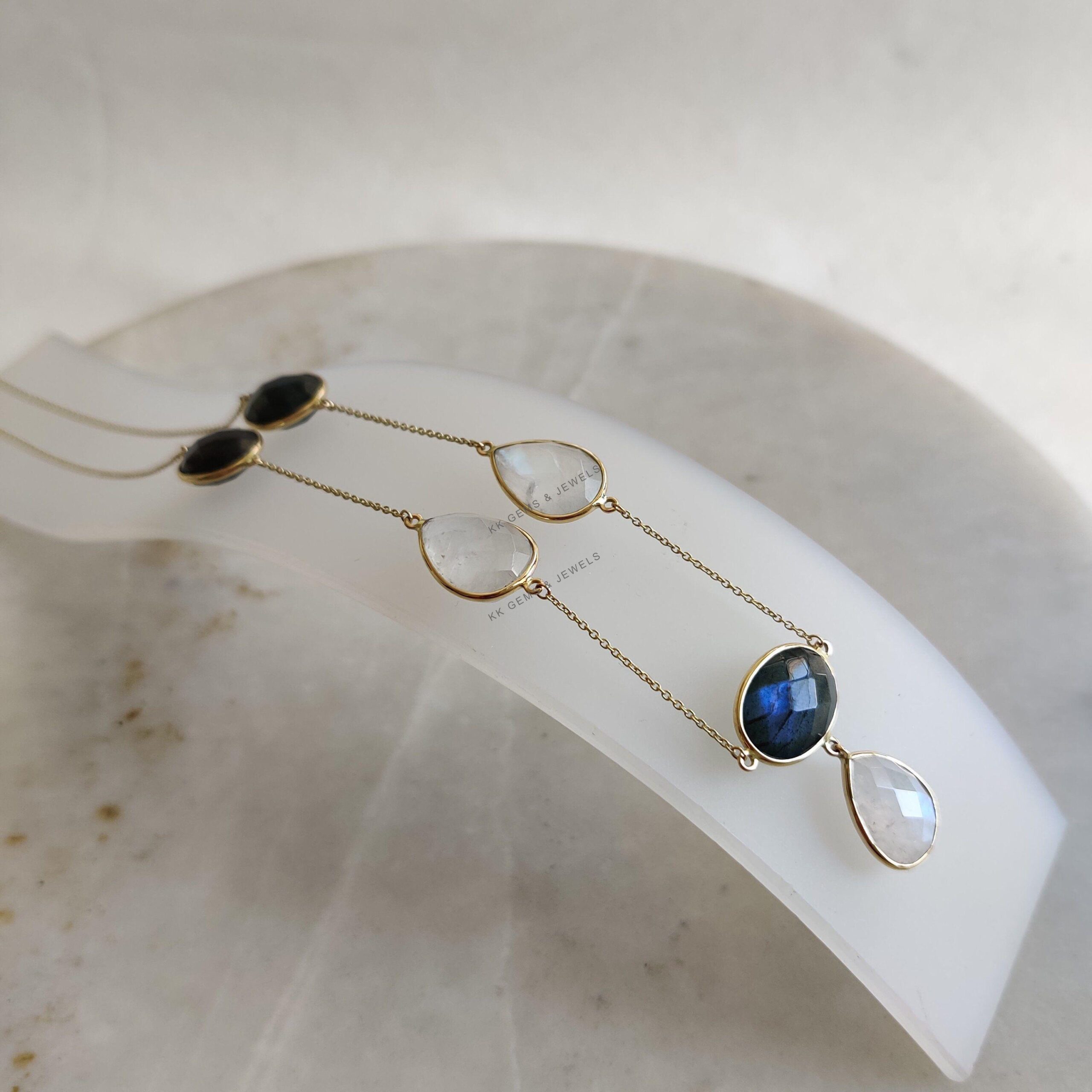 Natural Rainbow Moonstone Labradorite Necklace Set in 14K Solid Gold, June Birthstone
