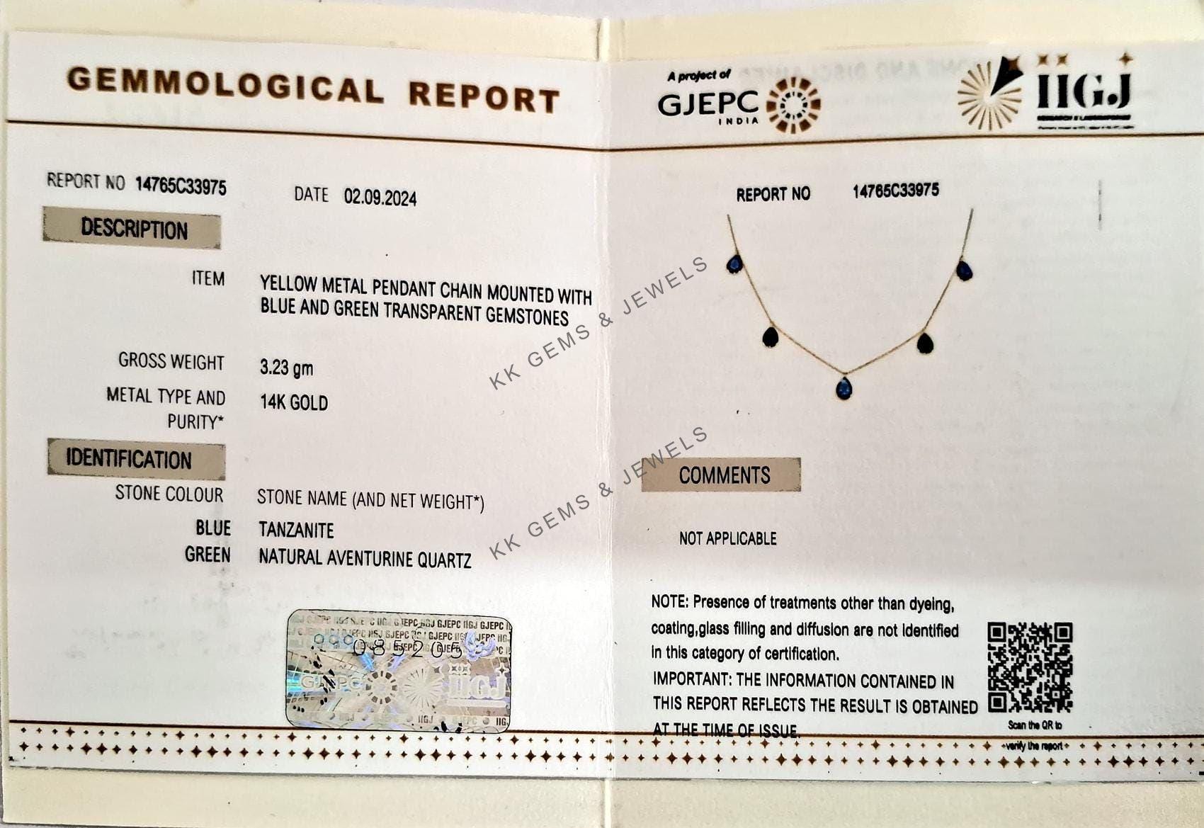 This stunning pendant necklace is set in 14K Solid Yellow Gold with Natural Tanzanite and Green Aventurine with utmost precision. It is an unique gemstone pendant for nearly every occasion and is completely hassle-free jewelry.