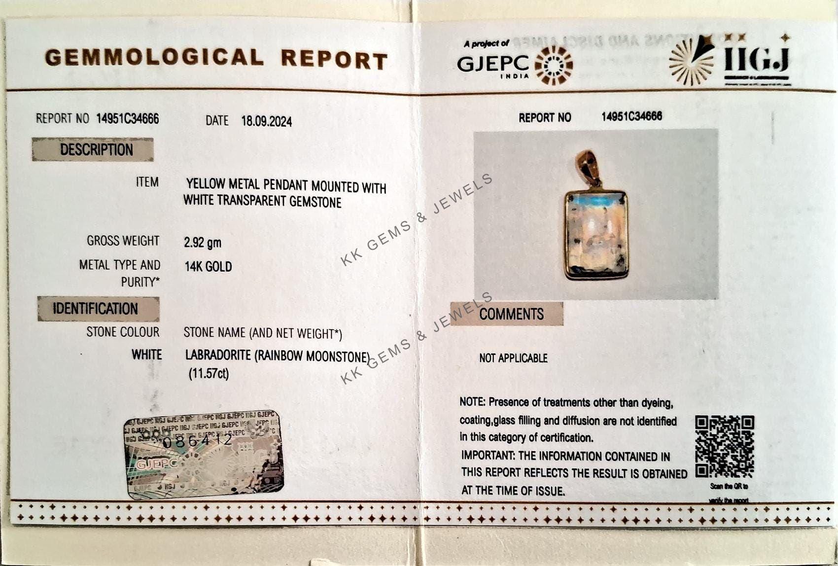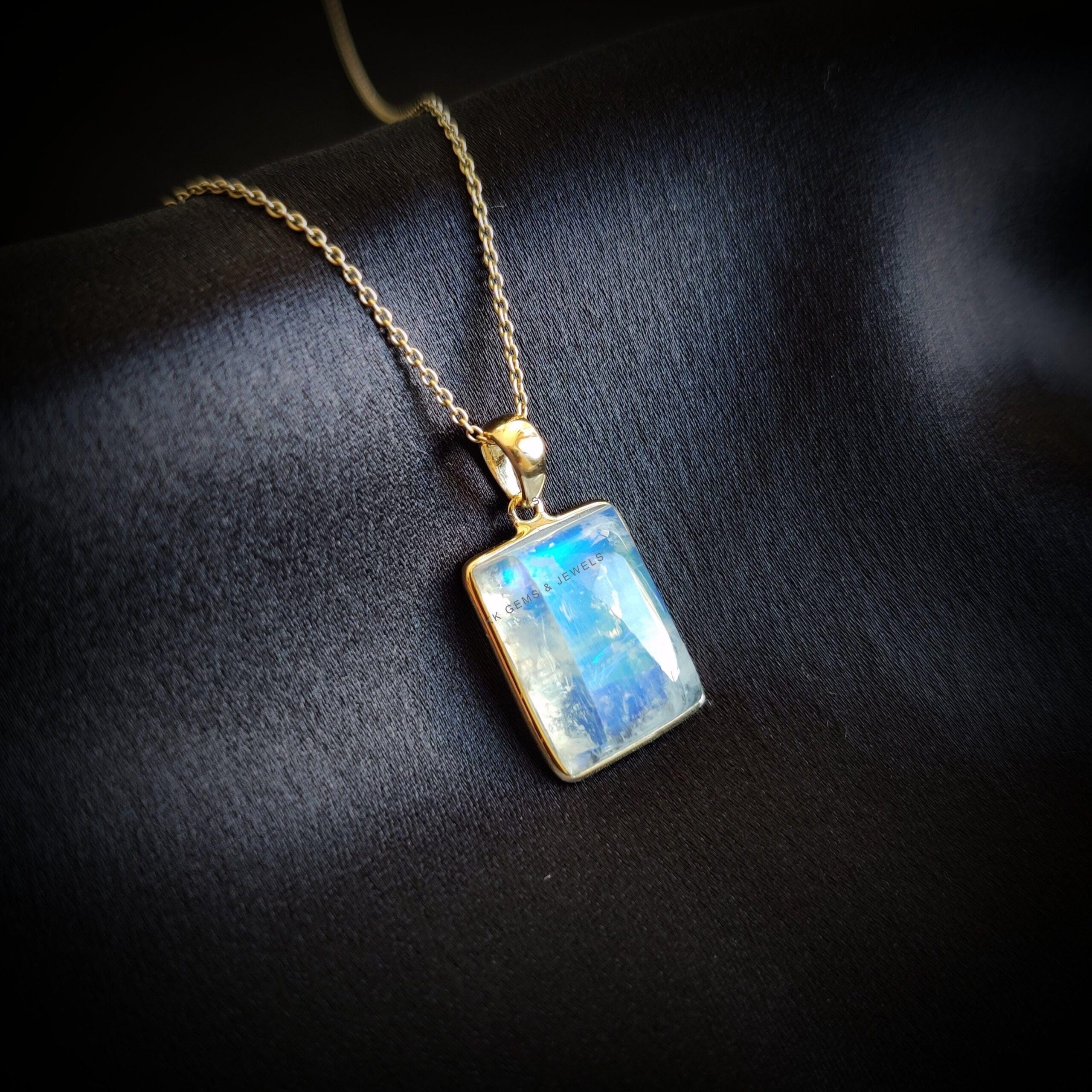 This stunning pendant is set in 14K Solid Yellow Gold with Natural Rainbow Moonstone with utmost precision. It is an unique gemstone pendant for nearly every occasion and is completely hassle-free jewelry.
