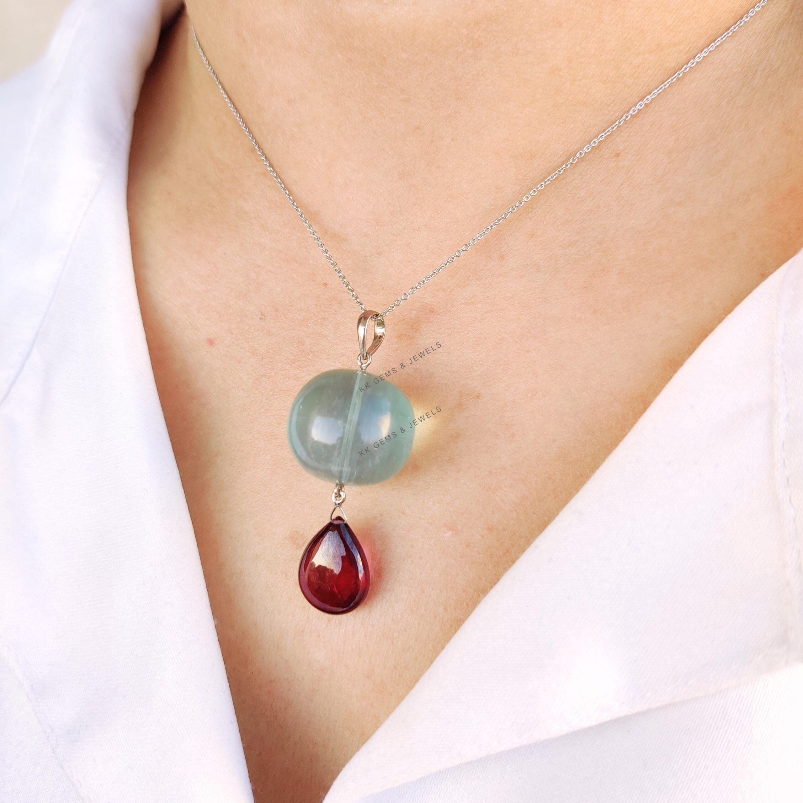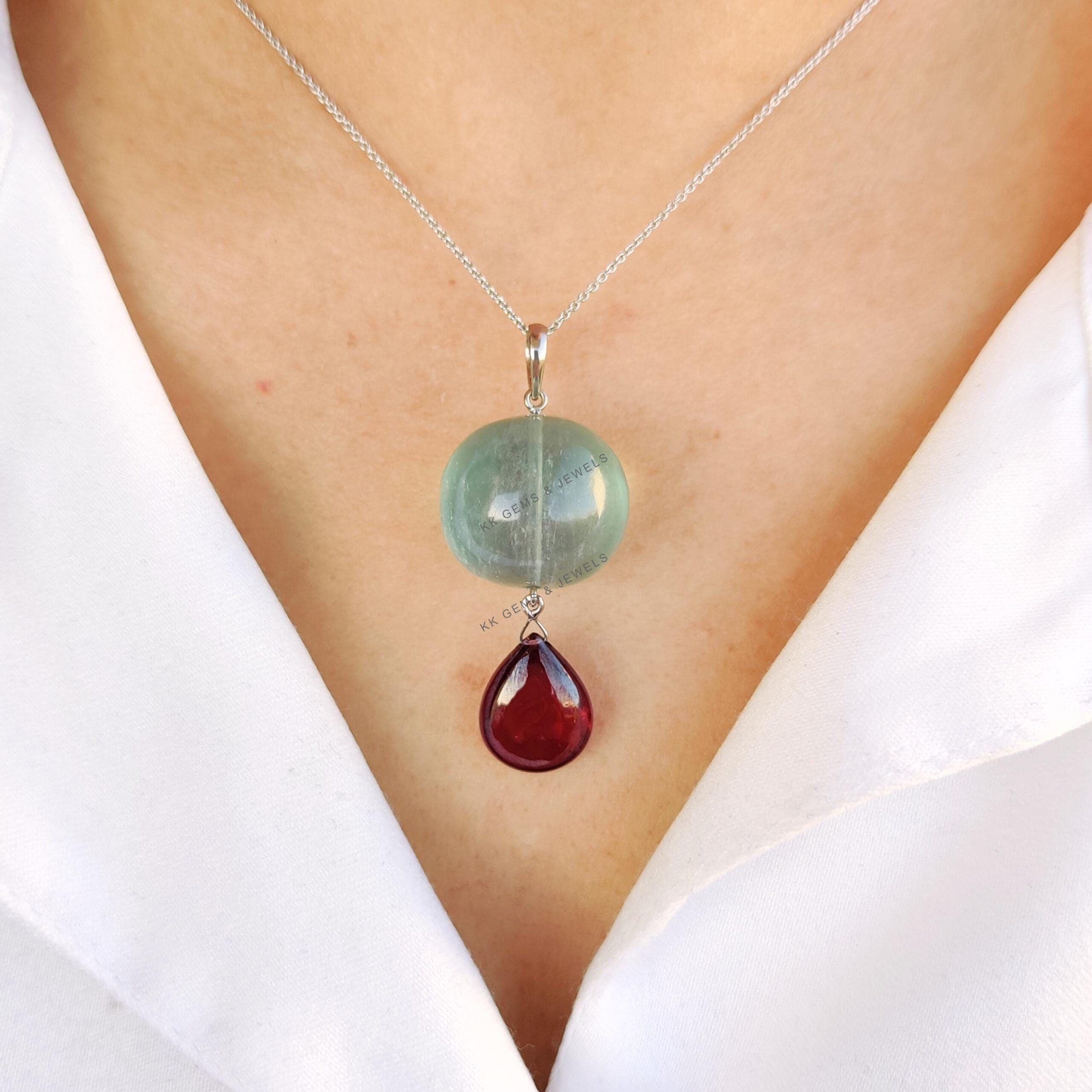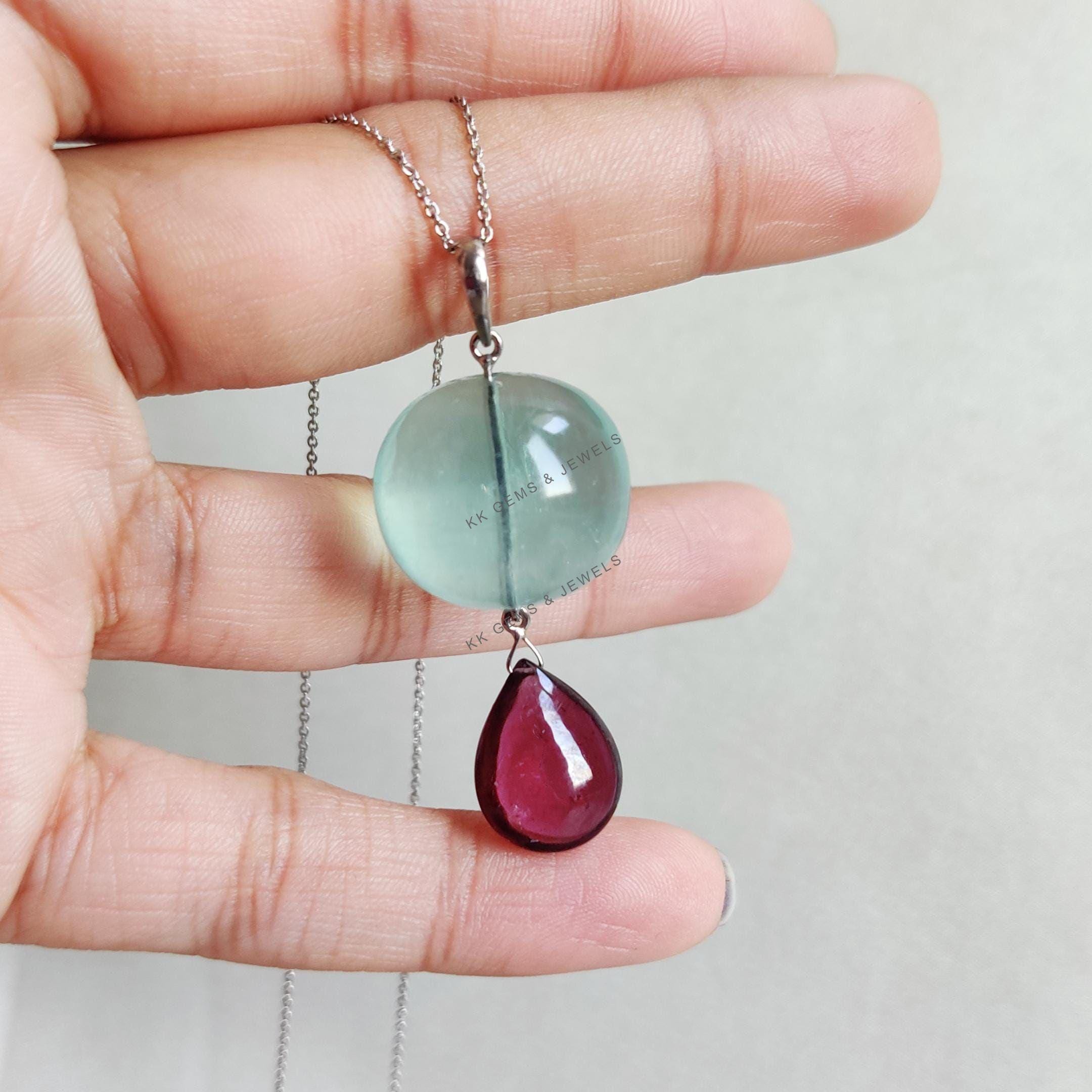 This stunning pendant is set in 14K Solid White Gold with Natural Fluorite & Rhodolite Garnet in utmost precision. It is an unique gemstone pendant for nearly every occasion and is completely hassle-free jewelry.
