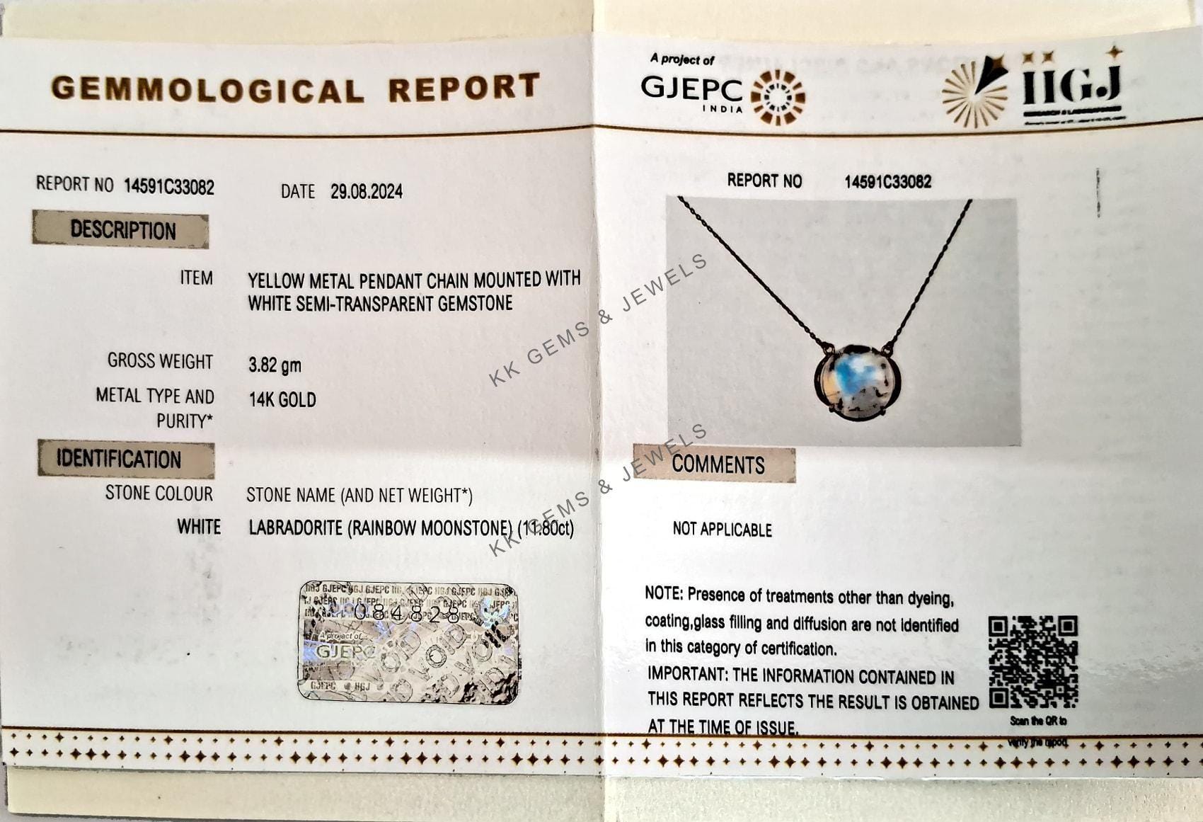 This stunning pendant is set in 14k Solid Yellow Gold with Natural Rainbow Moonstone with utmost precision. It is an unique gemstone pendant for nearly every occasion and is completely hassle-free jewelry.